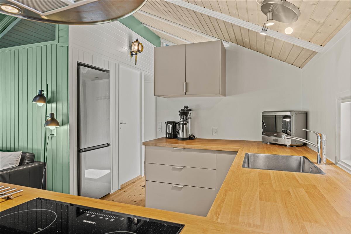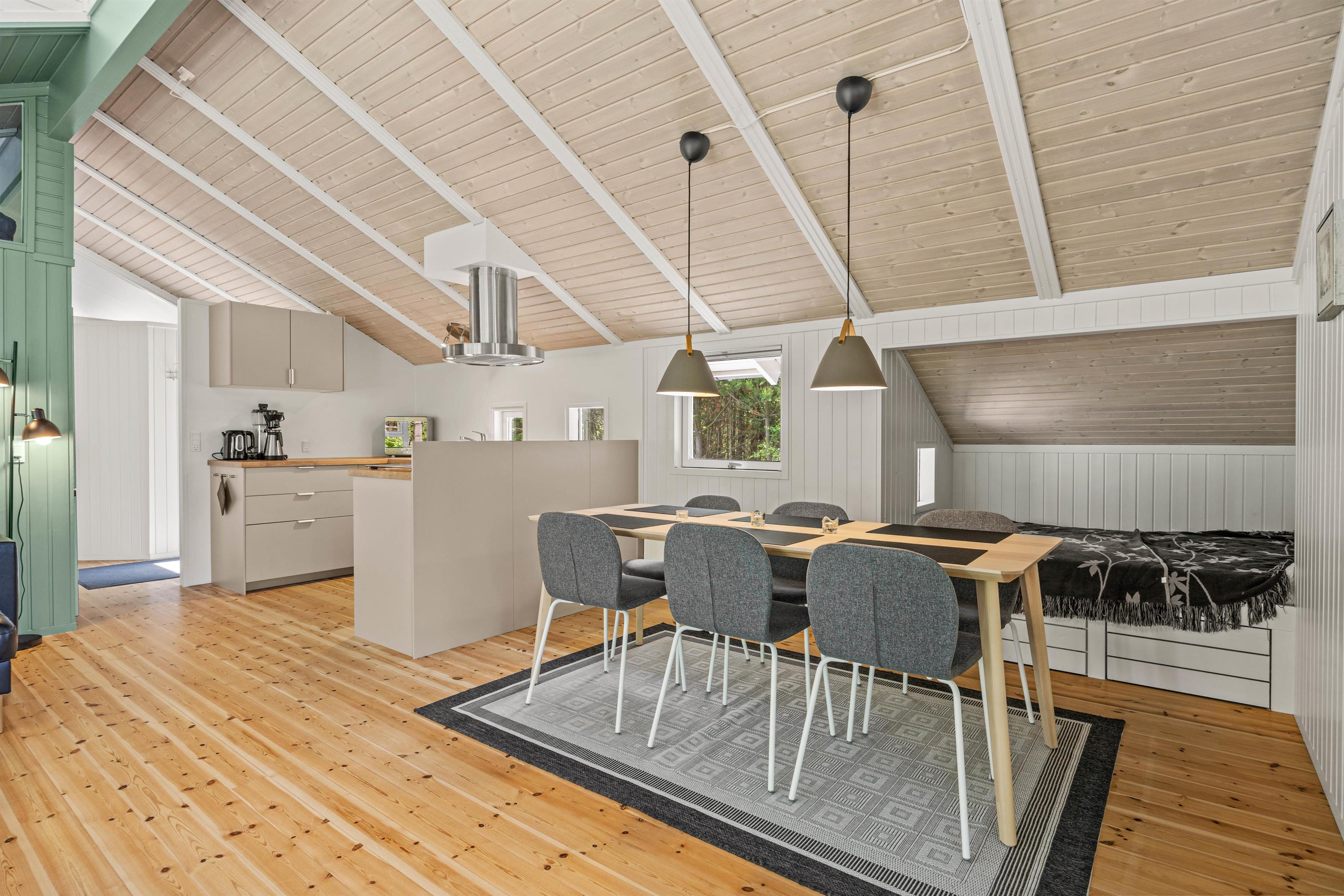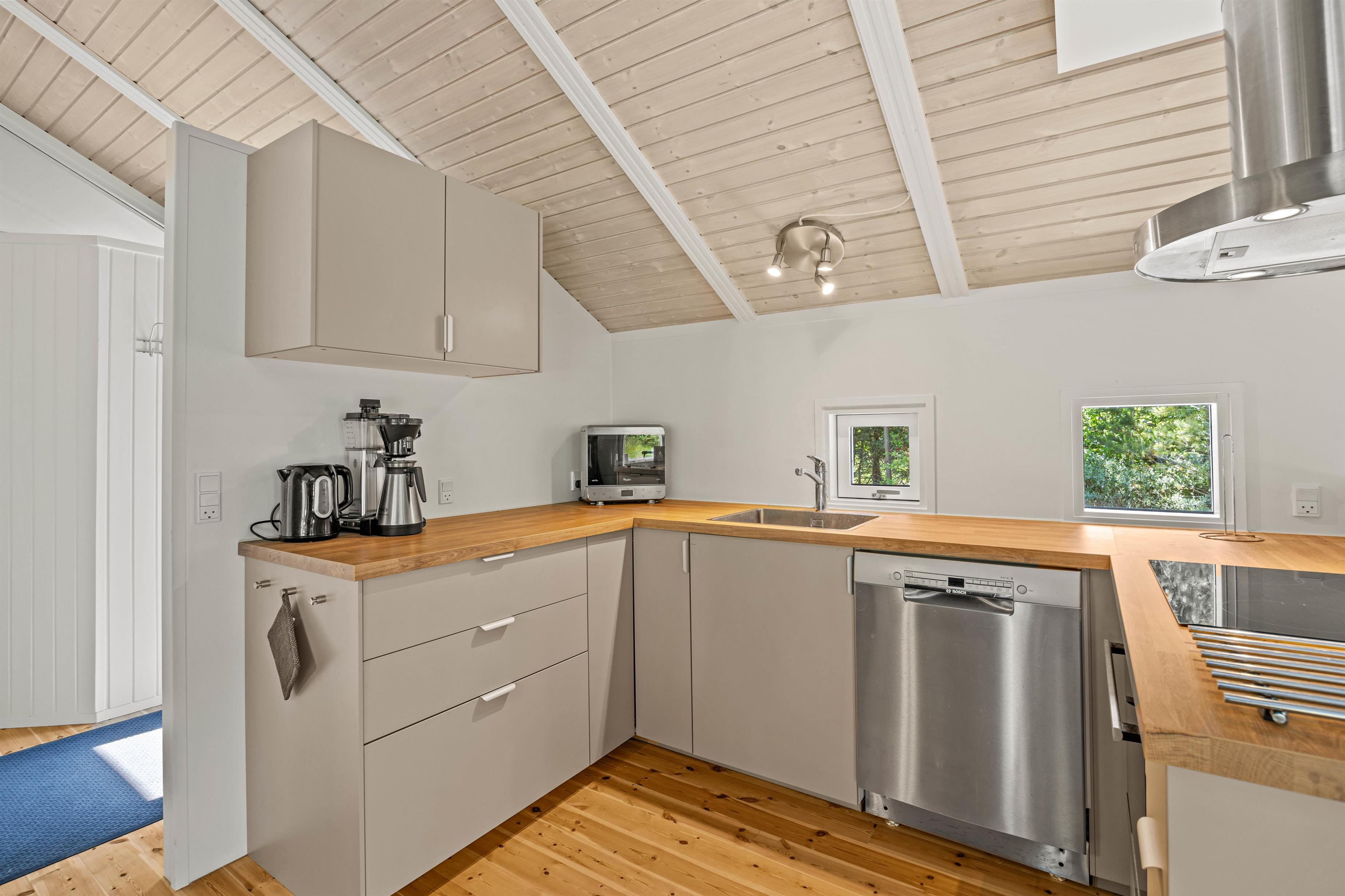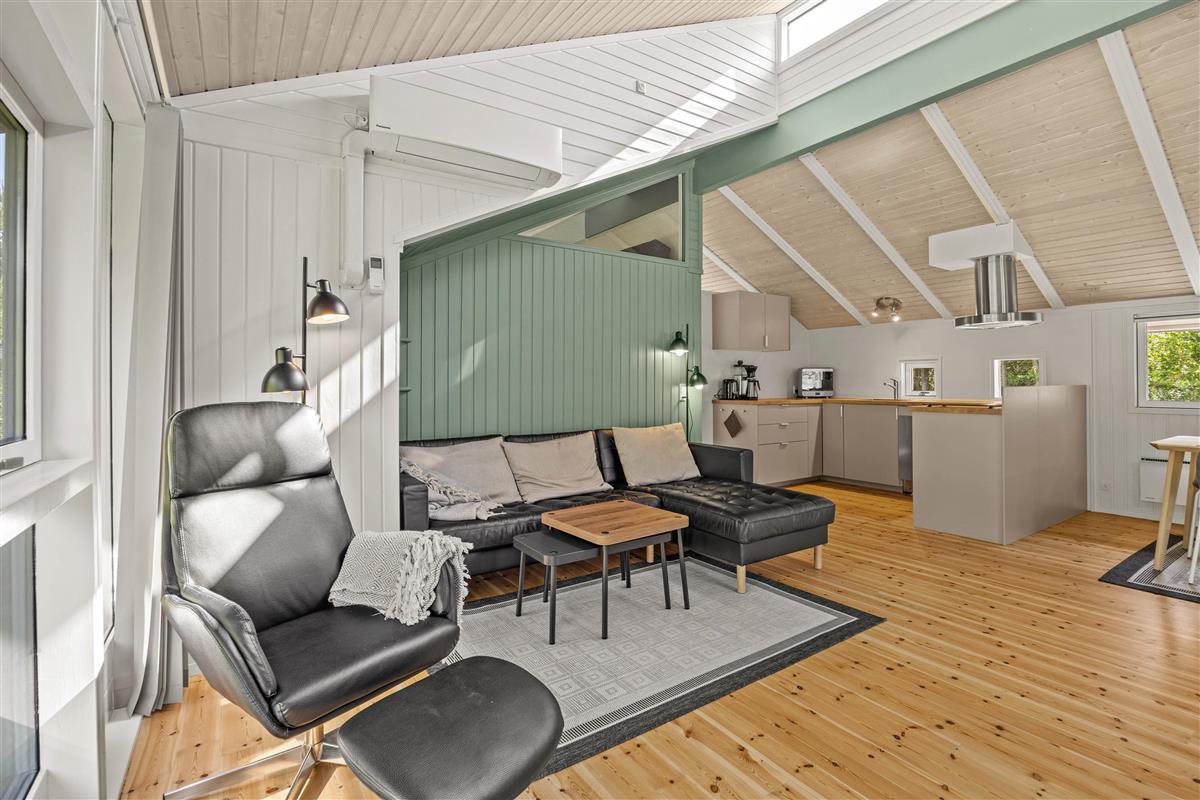 The open-plan living area is ideal for putting your feet up after an adventurous day in nature. The wood-burning stove provides cosy warmth on cooler days, creating a comfortable atmosphere perfect for reading or enjoying a film evening. In the modern kitchen – complete with dishwasher – you can create culinary masterpieces while having more time to enjoy life's pleasures.