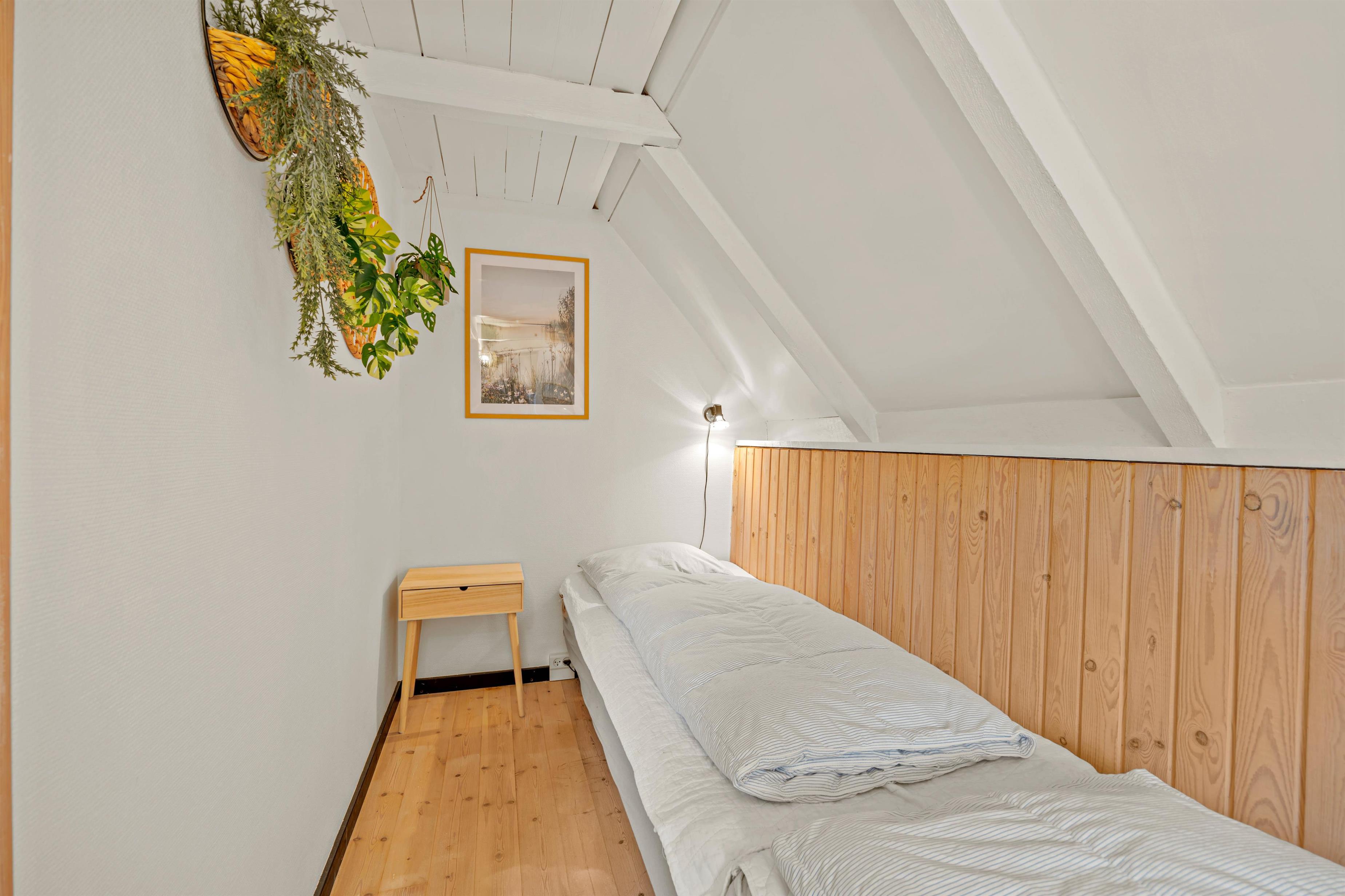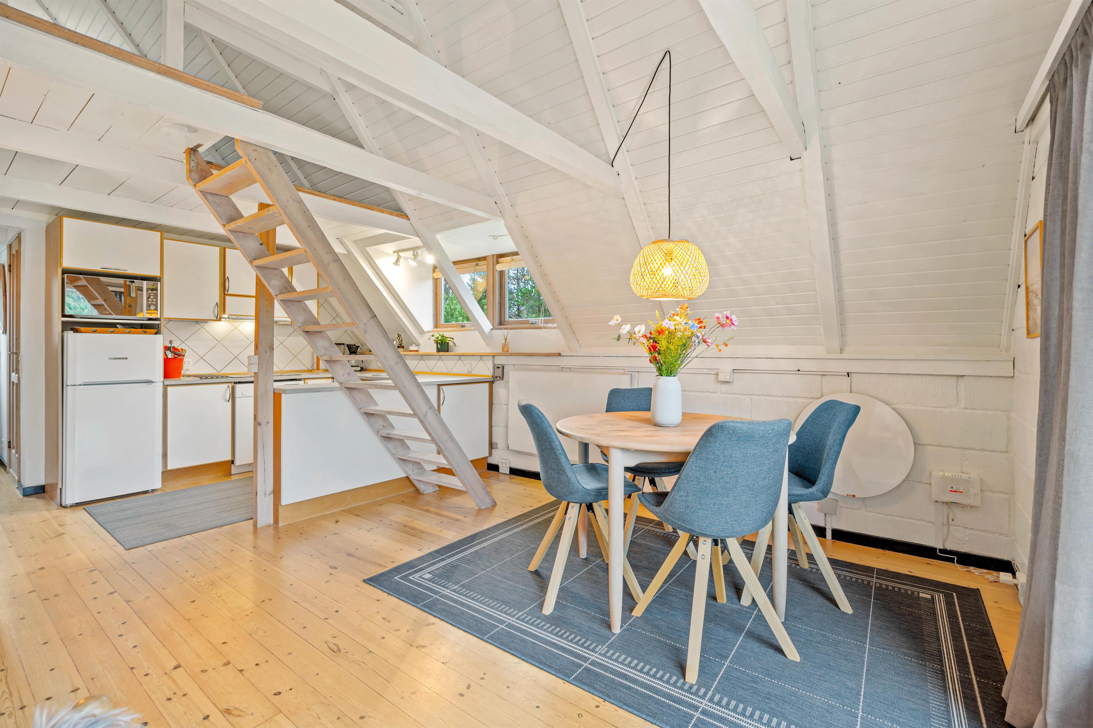 Die offene Küche ist mit einer Spülmaschine ausgestattet und erlaubt euch, leckere Mahlzeiten zuzubereiten. Ein kleines Duschbad mit Fußbodenheizung bietet Zugang zur Sauna. Hier könnt ihr den Alltagsstress hinter euch lassen. Im oberen Stockwerk befindet sich ein offenes Schlafzimmer mit einem Doppelbett, während das Erdgeschoss ein weiteres Schlafzimmer mit 2 Einzelbetten bietet. So könnt ihr euch gut aufteilen.