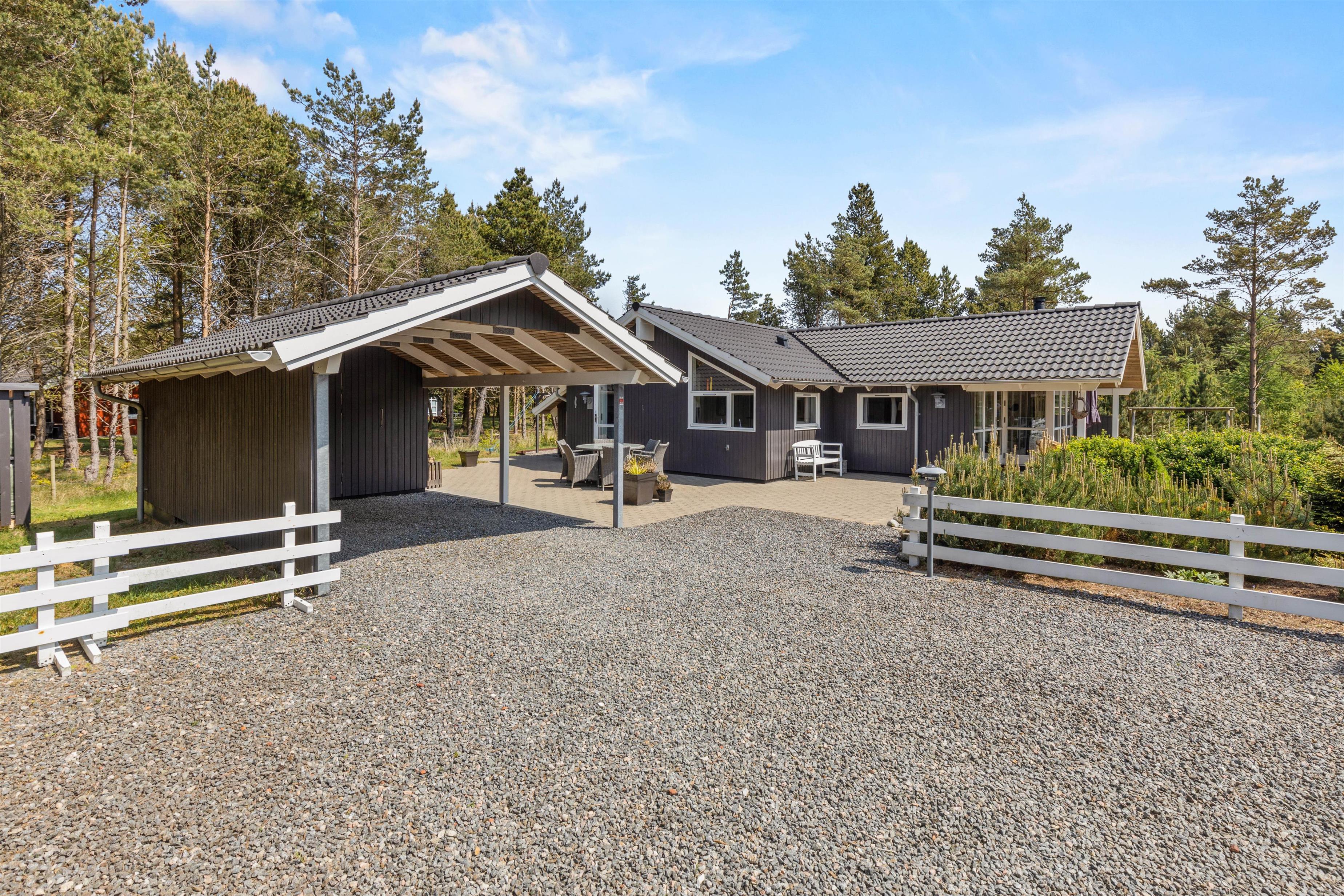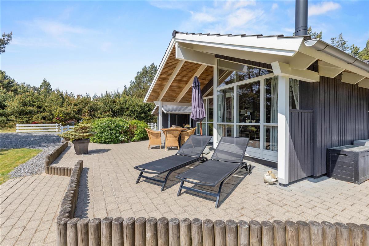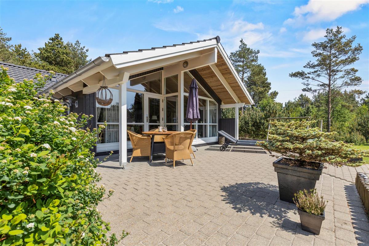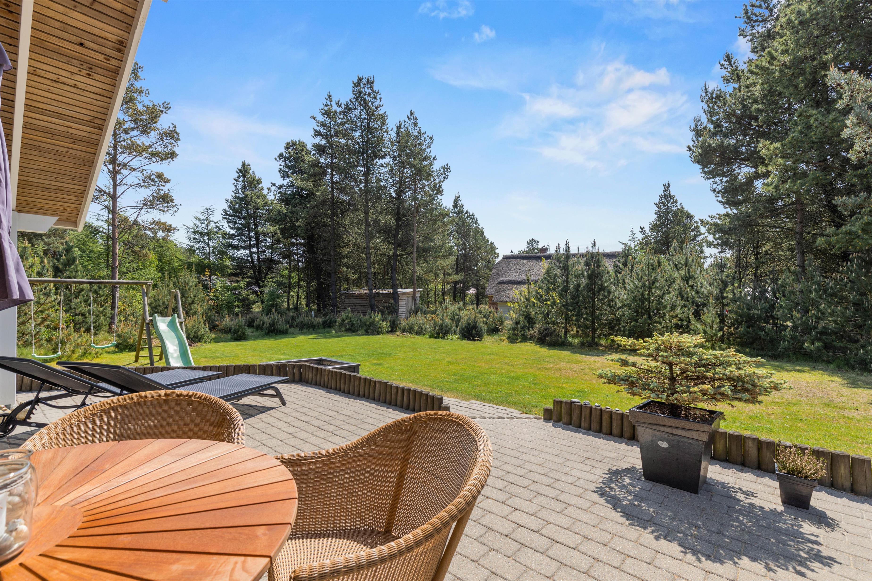 The outdoor area of the holiday home in Houstrup at Guldvangen 42 has everything you need for relaxing and entertaining days outside. Situated on a generous lawn, it offers numerous opportunities for both relaxation and activity. The open terrace is perfect for enjoying breakfast in the morning sun or ending the day with a cosy dinner and a glass of wine.