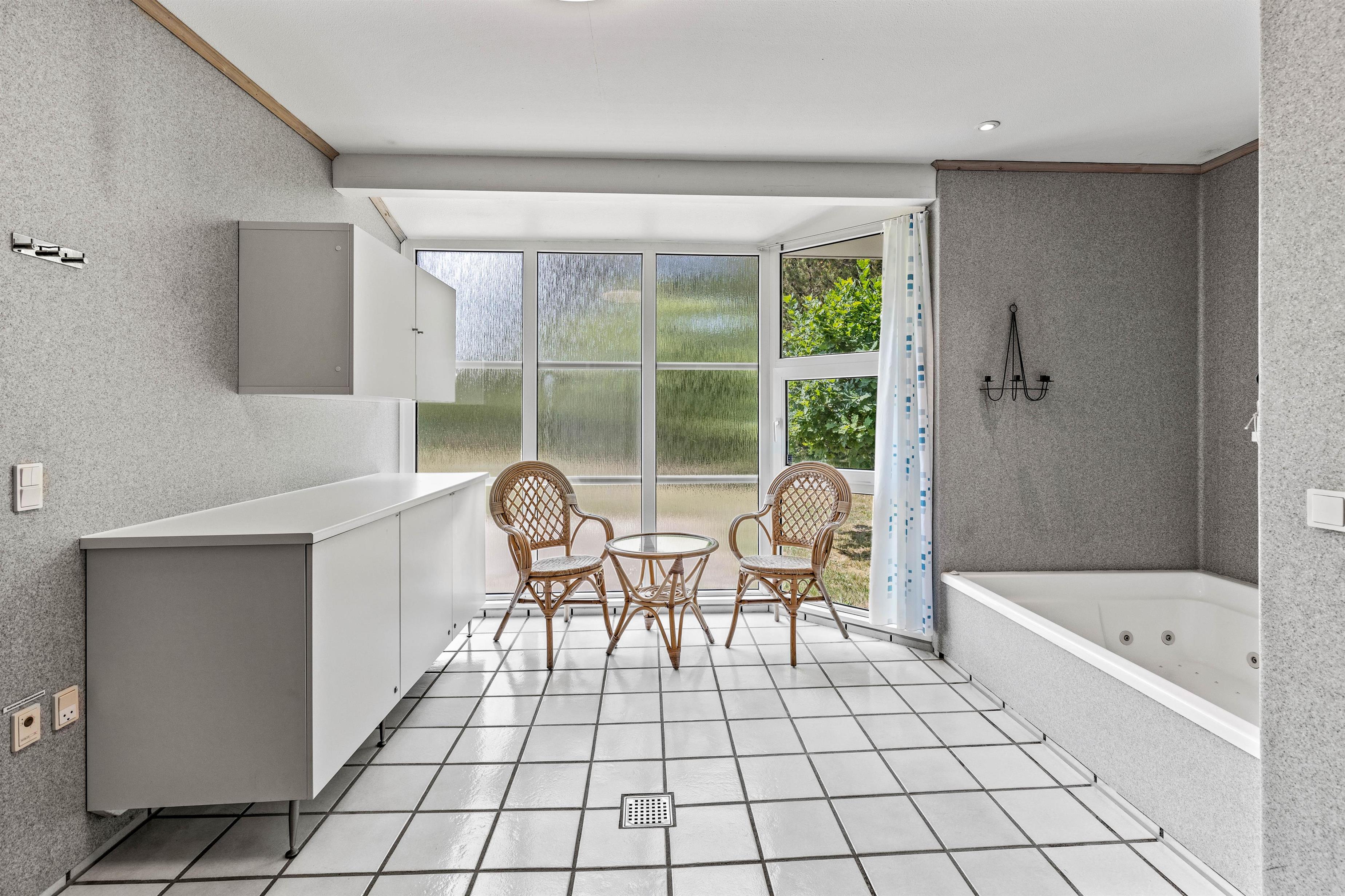 Relaxation is a priority in this Houstrup holiday home. A particular highlight is the private sauna, offering soothing warmth after a long walk on the nearby beach. The outdoor hot tub complements these wellness facilities, providing an ideal spot to wind down in the evening.