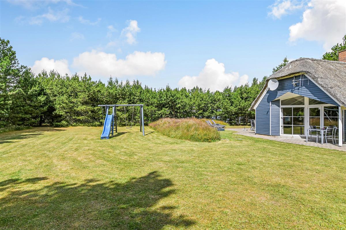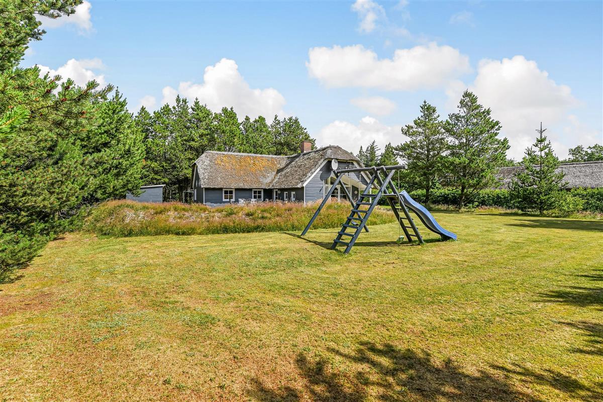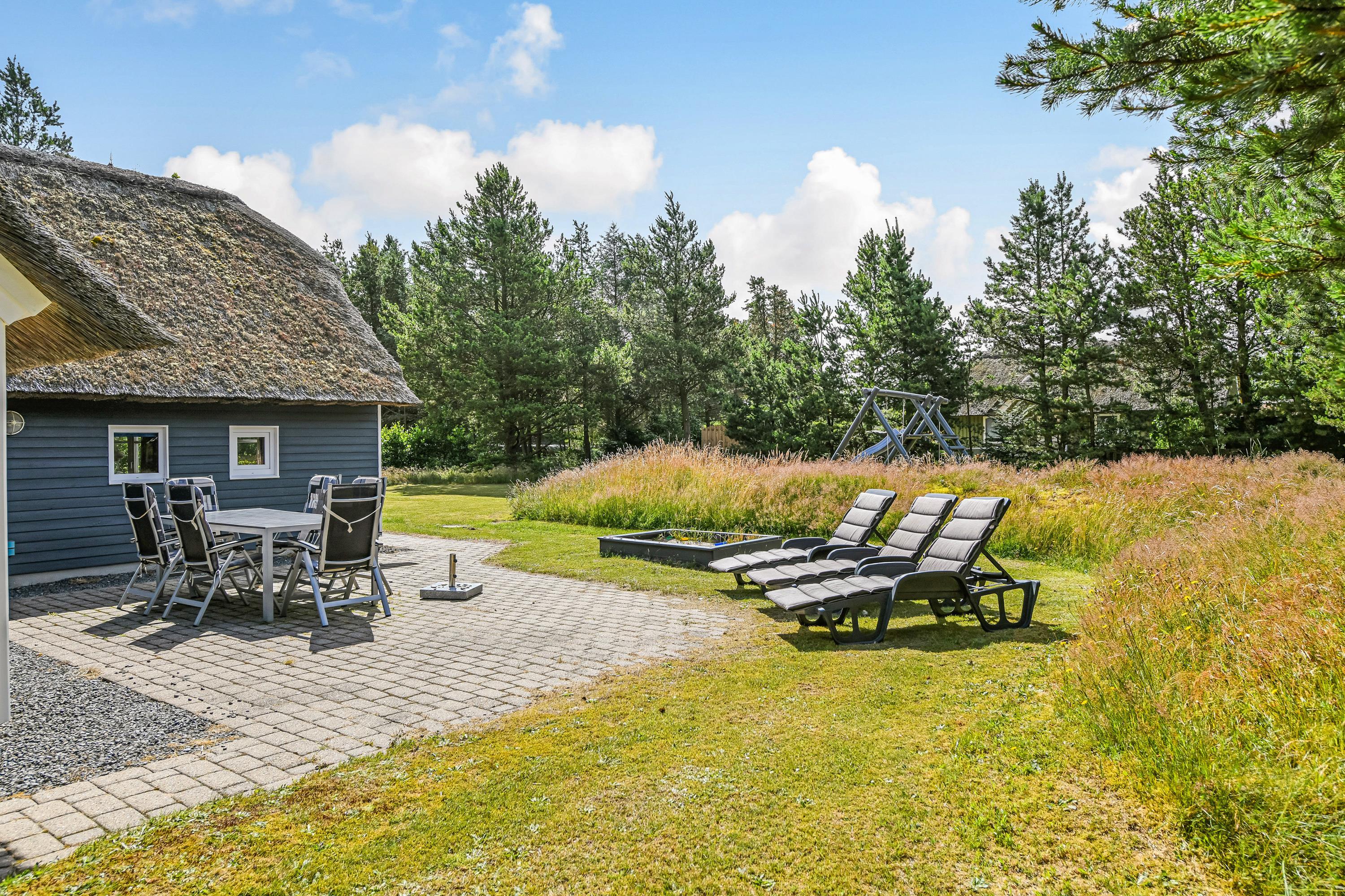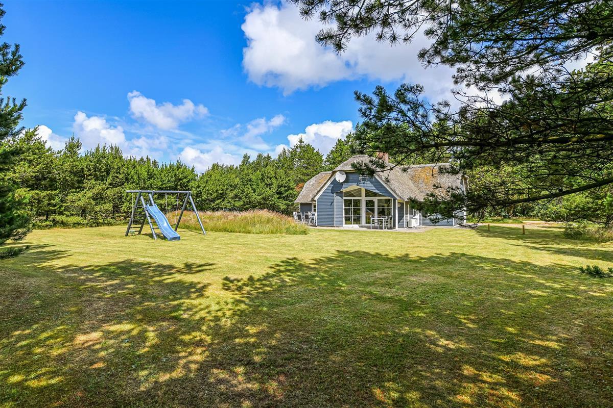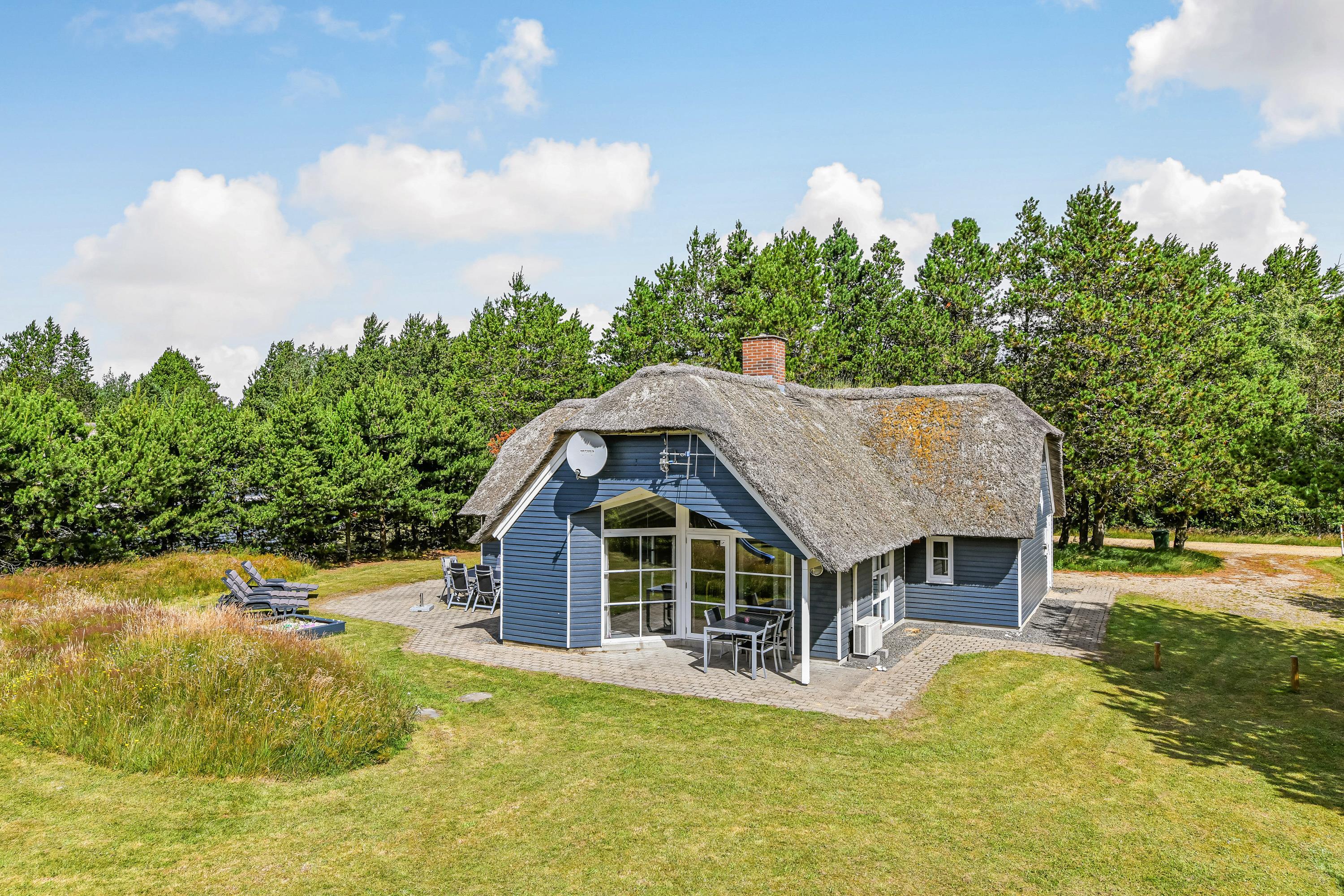 This blue-painted thatched house sits within natural grounds in Houstrup, just metres from the nature reserve and surrounded by pine forests. Around the house, you'll find two furnished terraces where you can soak up the sun and enjoy outdoor dining and barbecues with the whole family. The garden offers plenty of space for children to play, complete with a swing and sandbox.