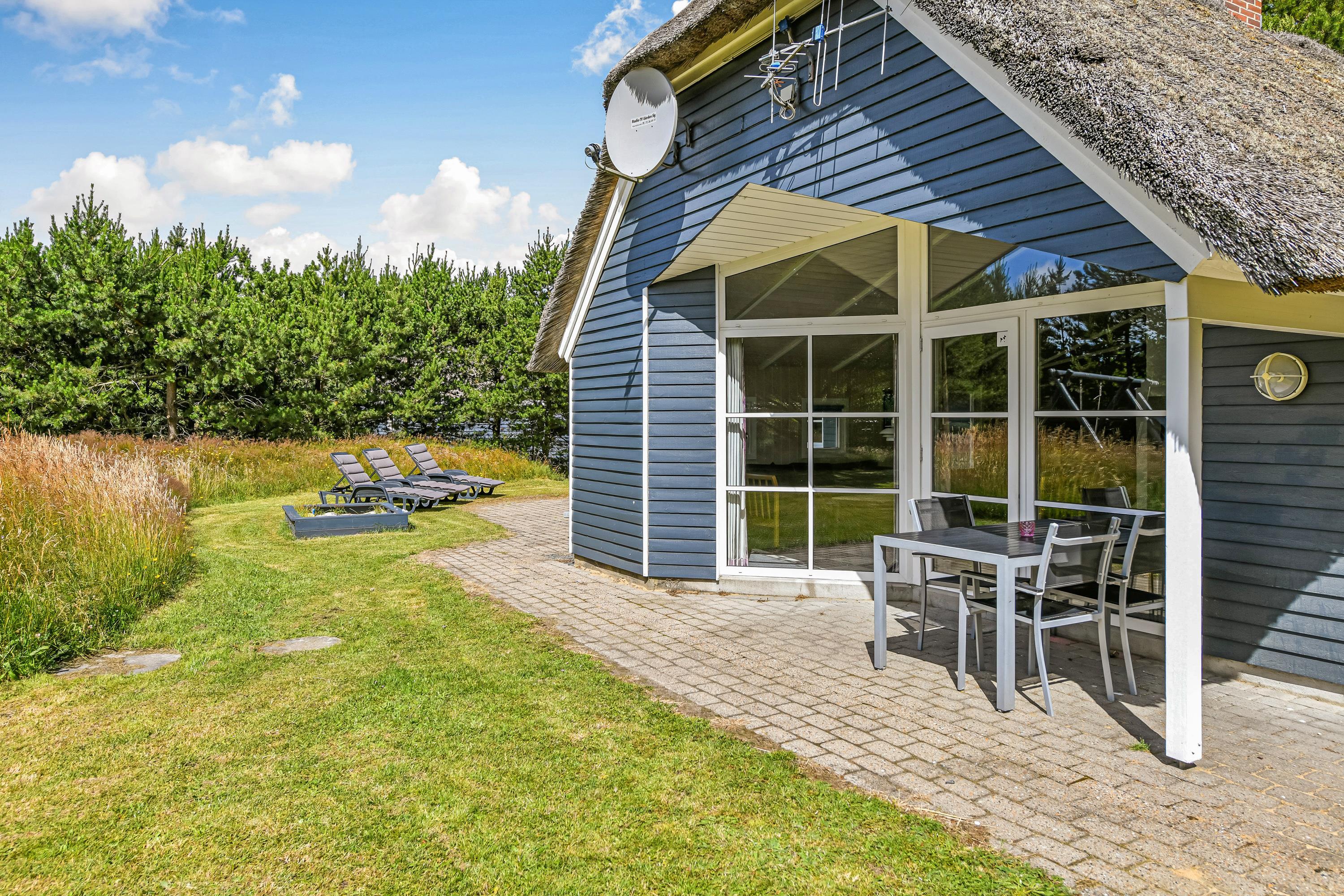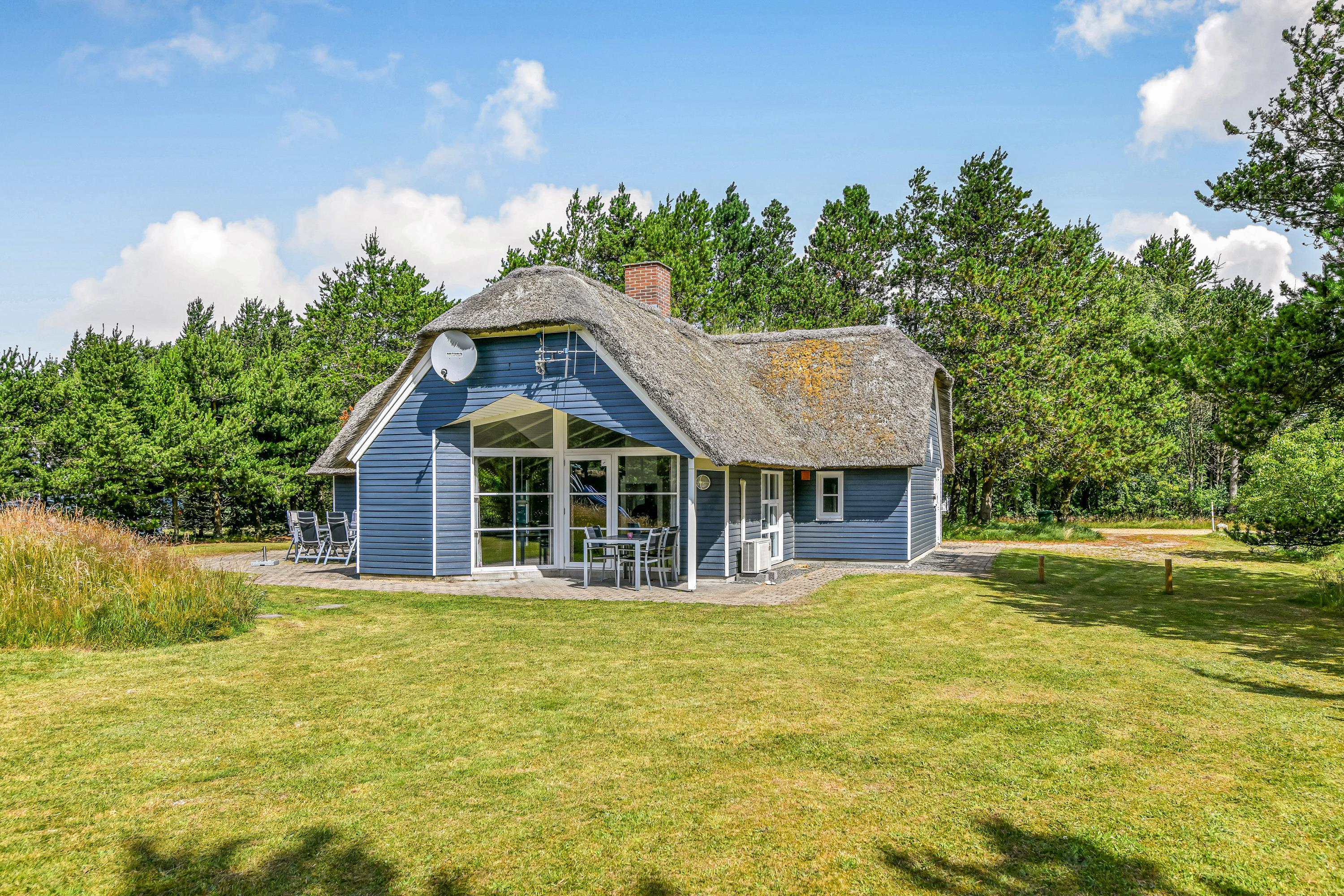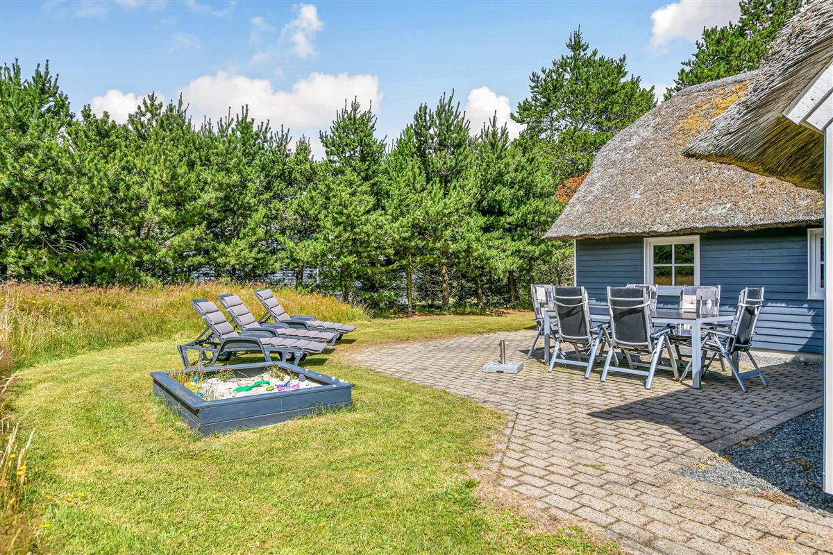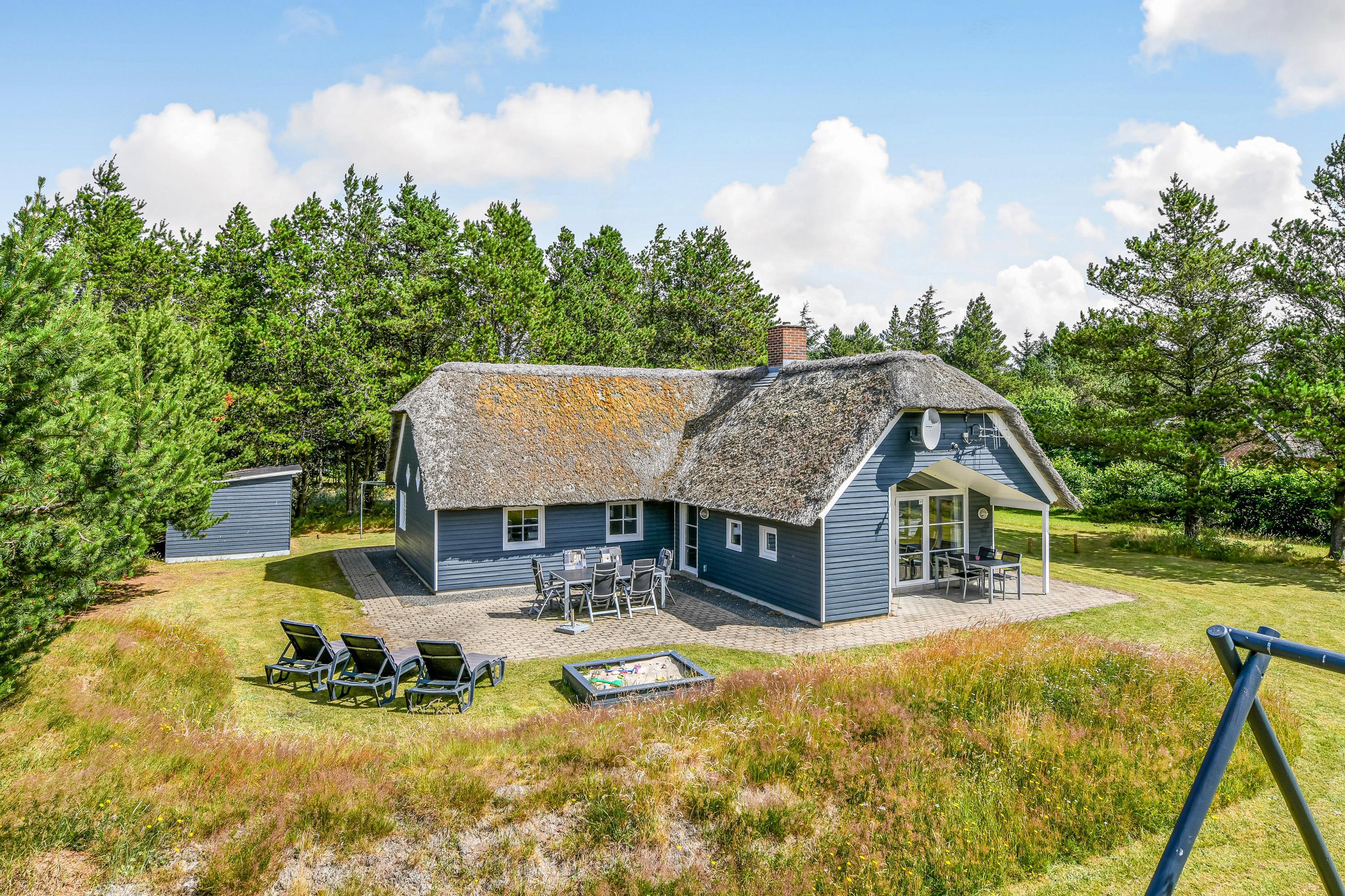 This blue-painted thatched house sits within natural grounds in Houstrup, just metres from the nature reserve and surrounded by pine forests. Around the house, you'll find two furnished terraces where you can soak up the sun and enjoy outdoor dining and barbecues with the whole family. The garden offers plenty of space for children to play, complete with a swing and sandbox.