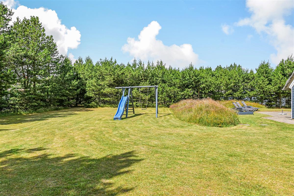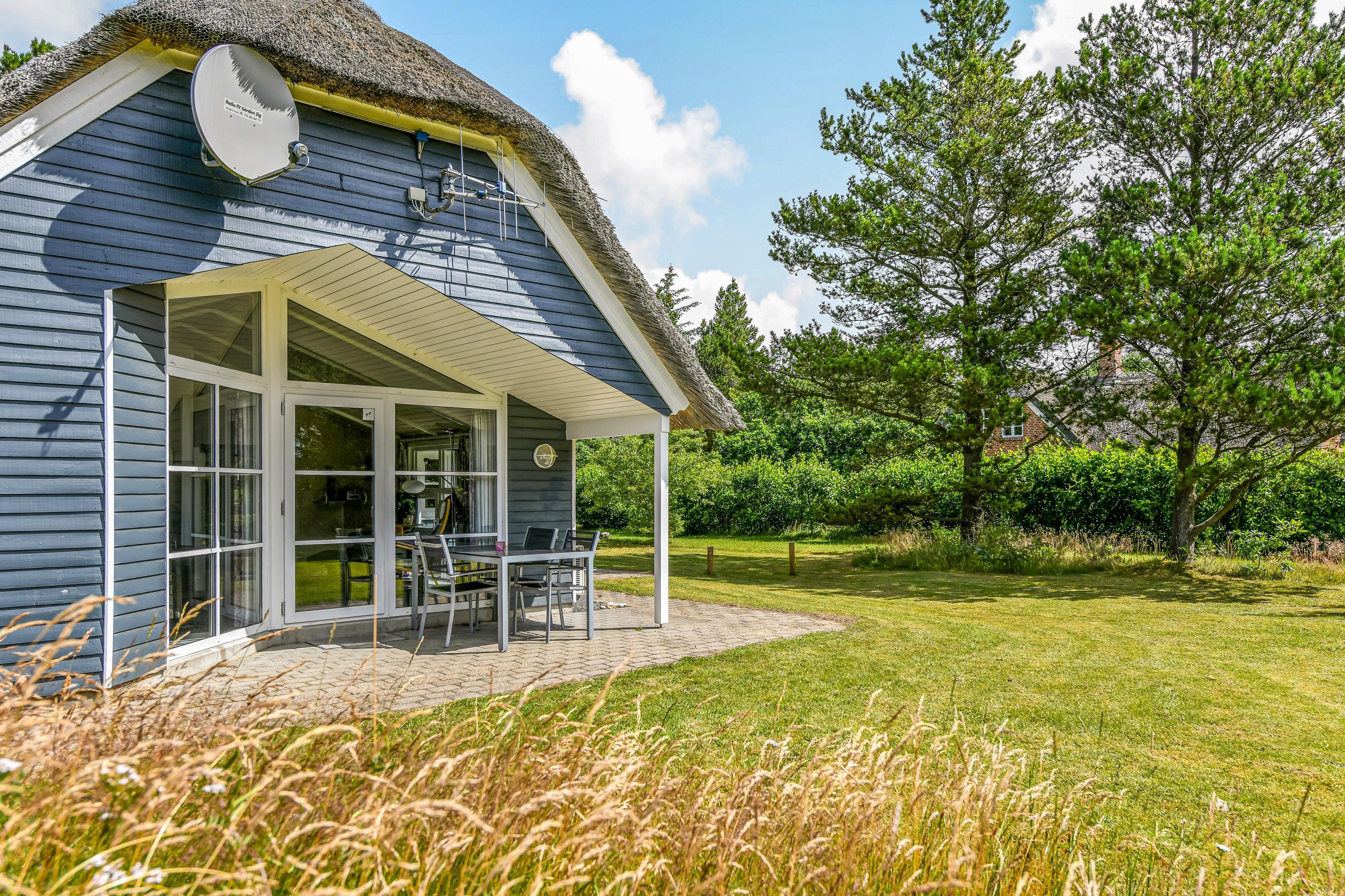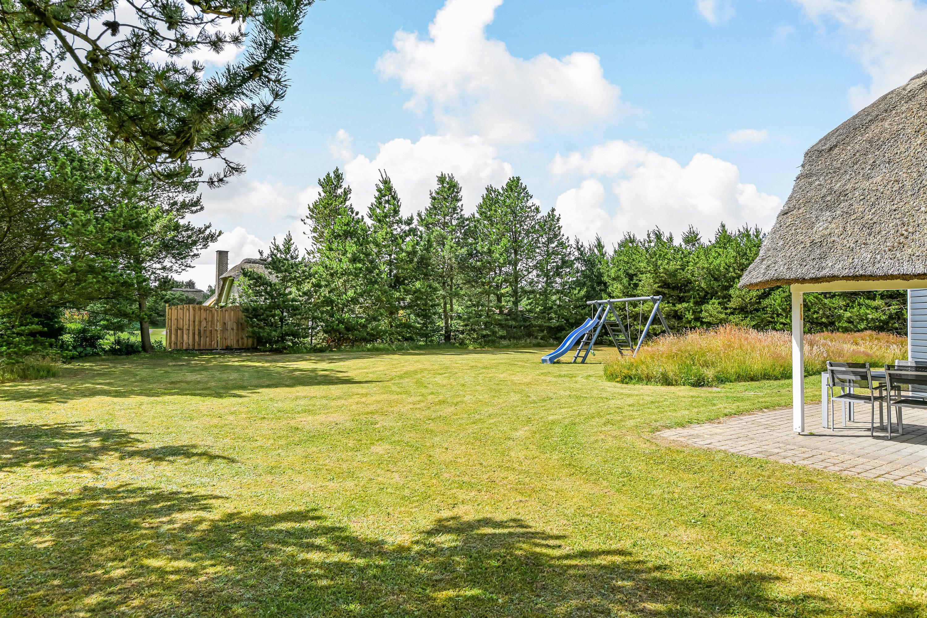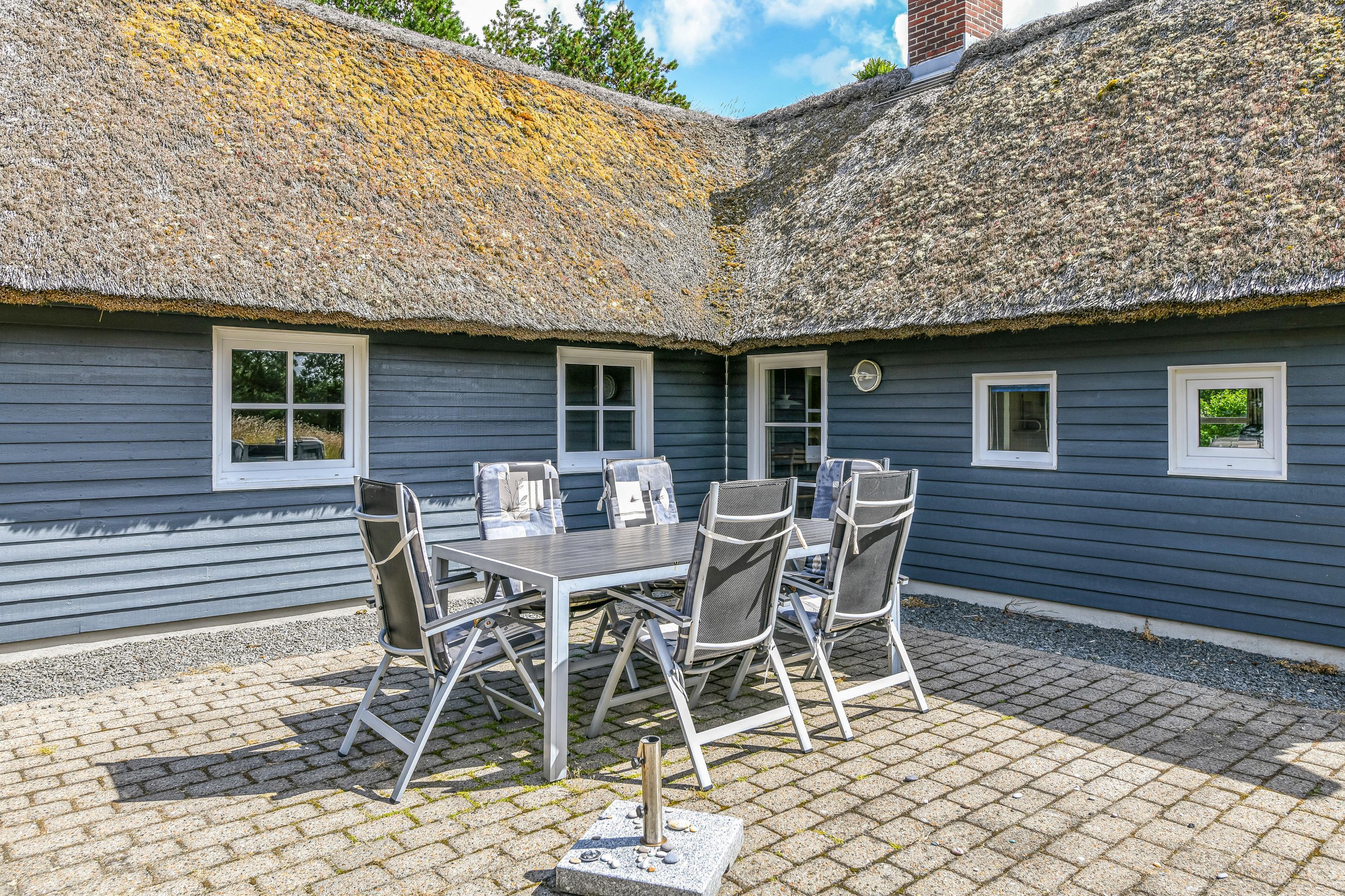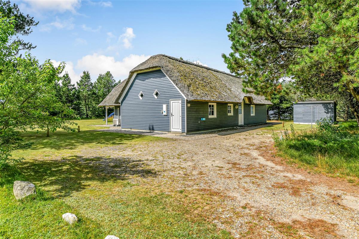 This blue-painted thatched house sits within natural grounds in Houstrup, just metres from the nature reserve and surrounded by pine forests. Around the house, you'll find two furnished terraces where you can soak up the sun and enjoy outdoor dining and barbecues with the whole family. The garden offers plenty of space for children to play, complete with a swing and sandbox.