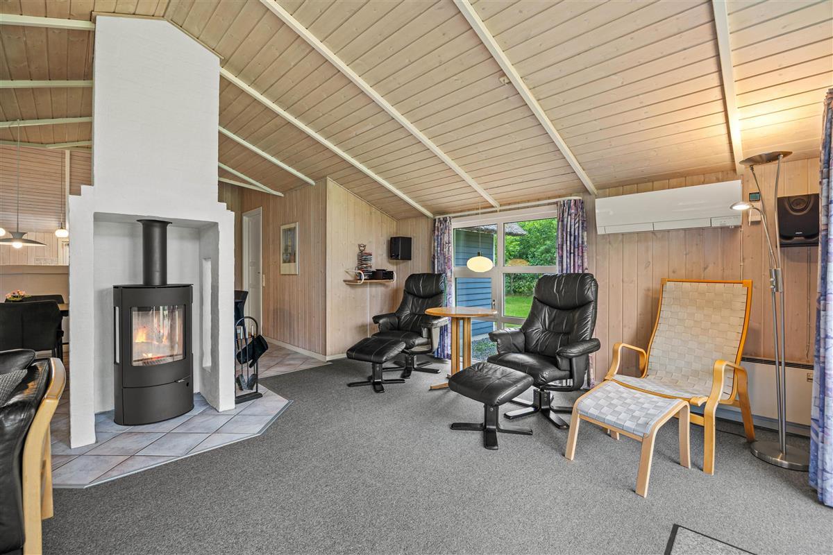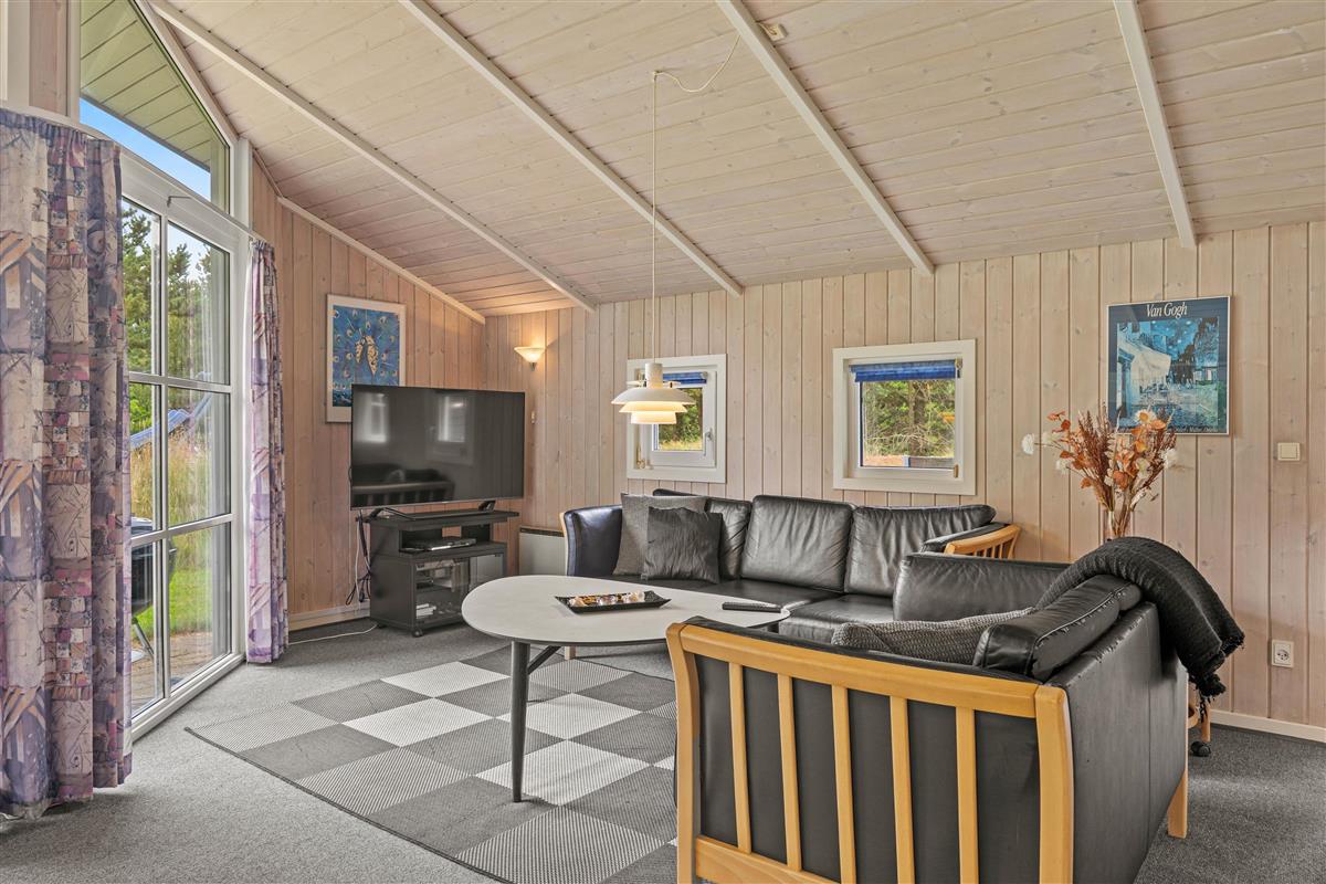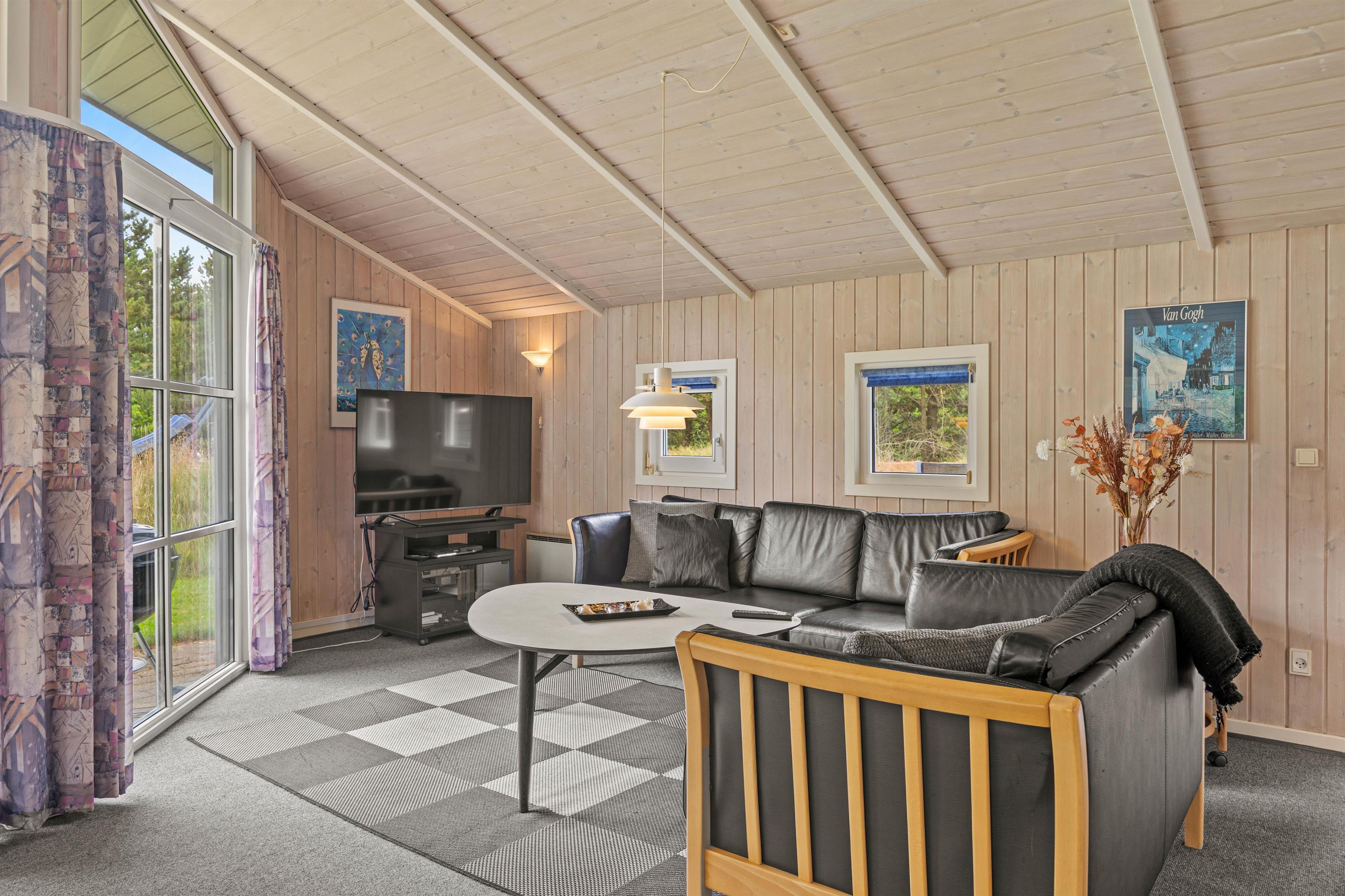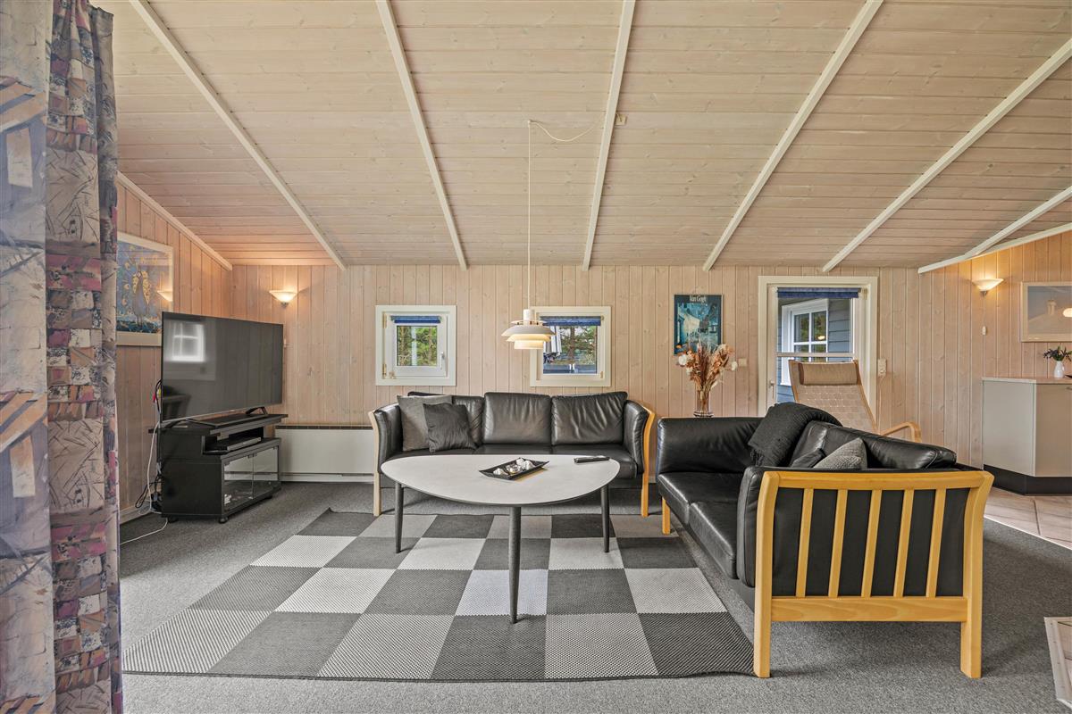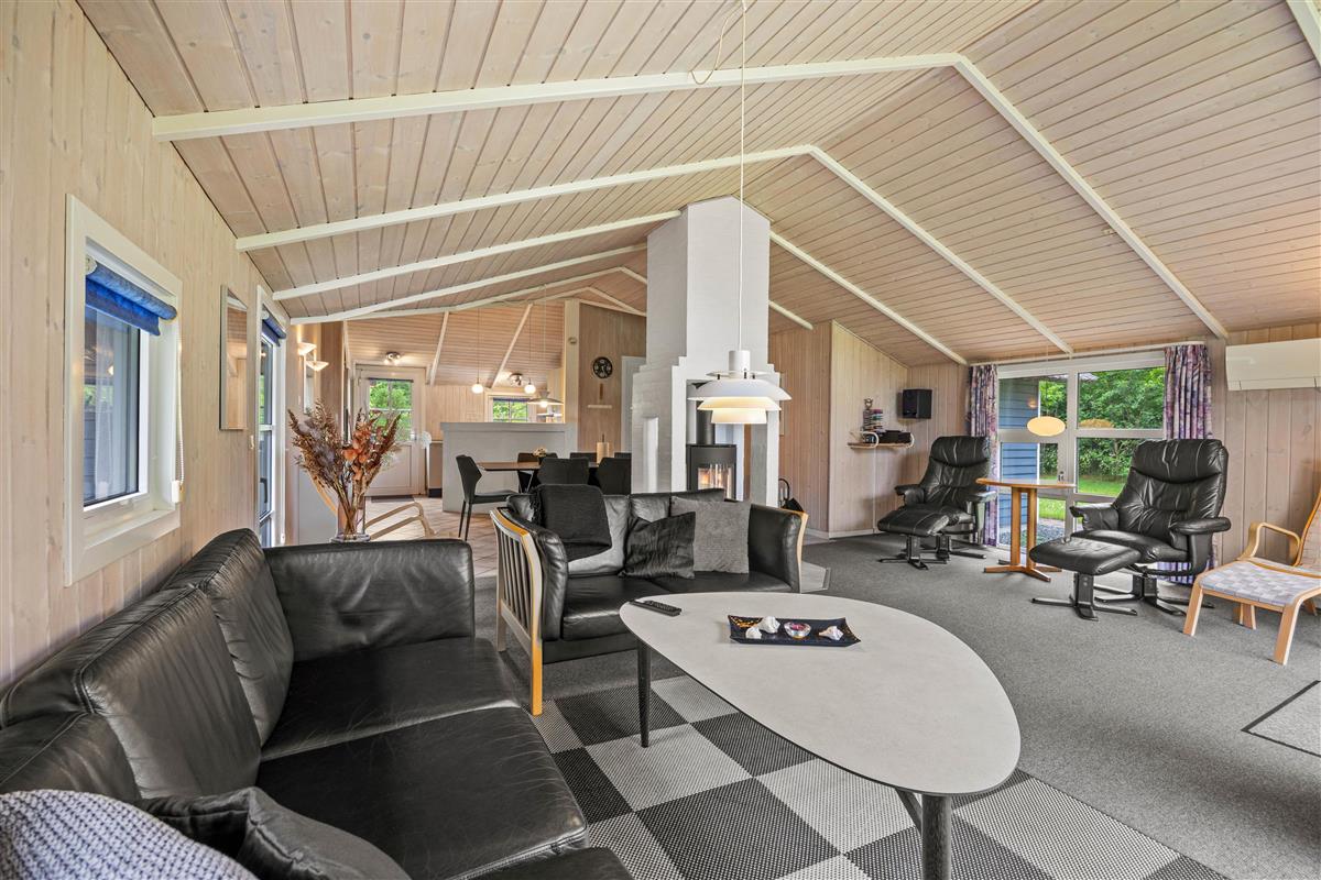 Reading chairs and sofas in the living area provide comfortable spaces for gathering, reading or playing games. Meanwhile, you can enjoy views of the large garden through the window front, which floods the interior with natural light. After a long walk or day at the beach, the hot tub and sauna offer perfect relaxation. The energy-efficient heat pump ensures the interior stays comfortably warm even on cooler days.