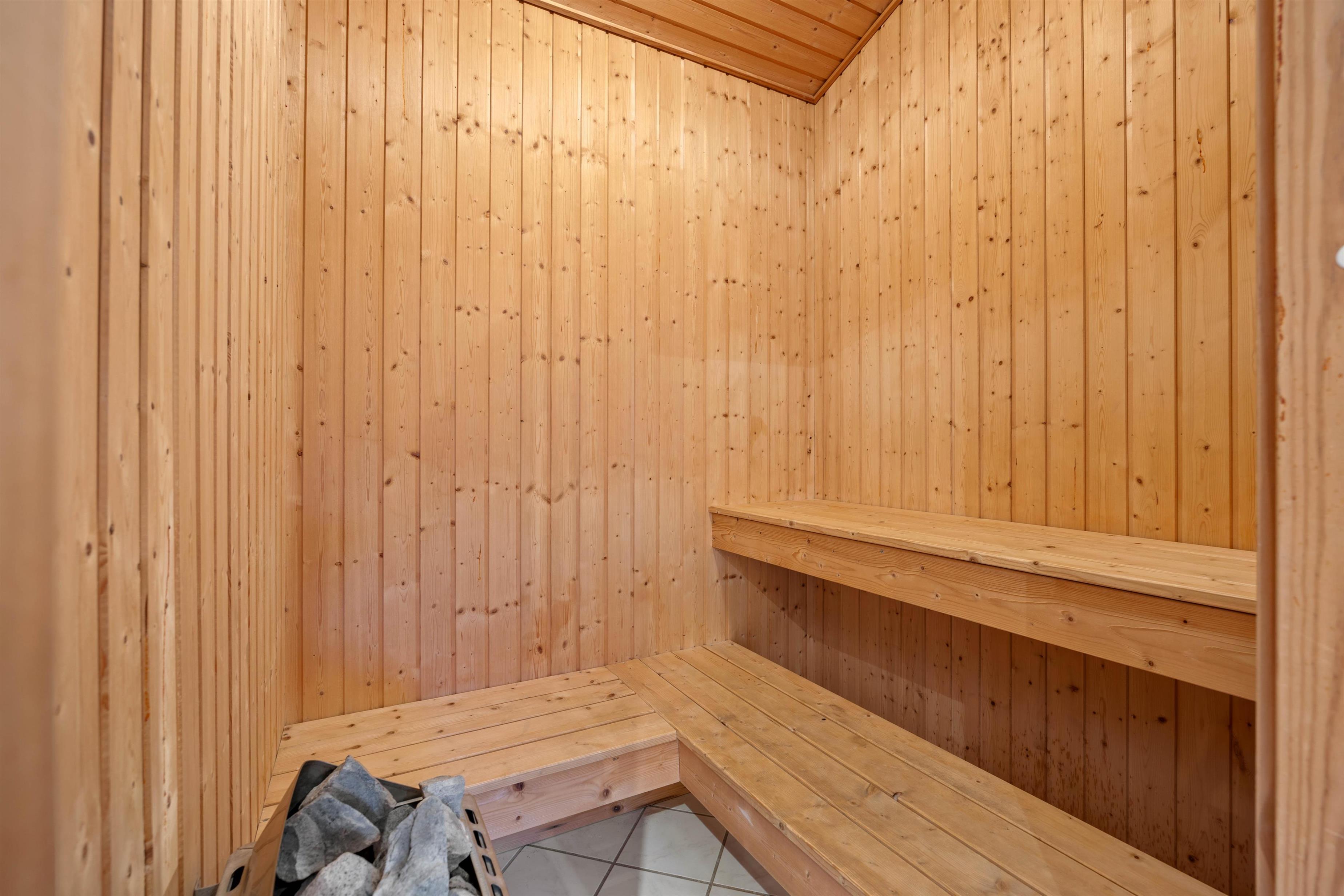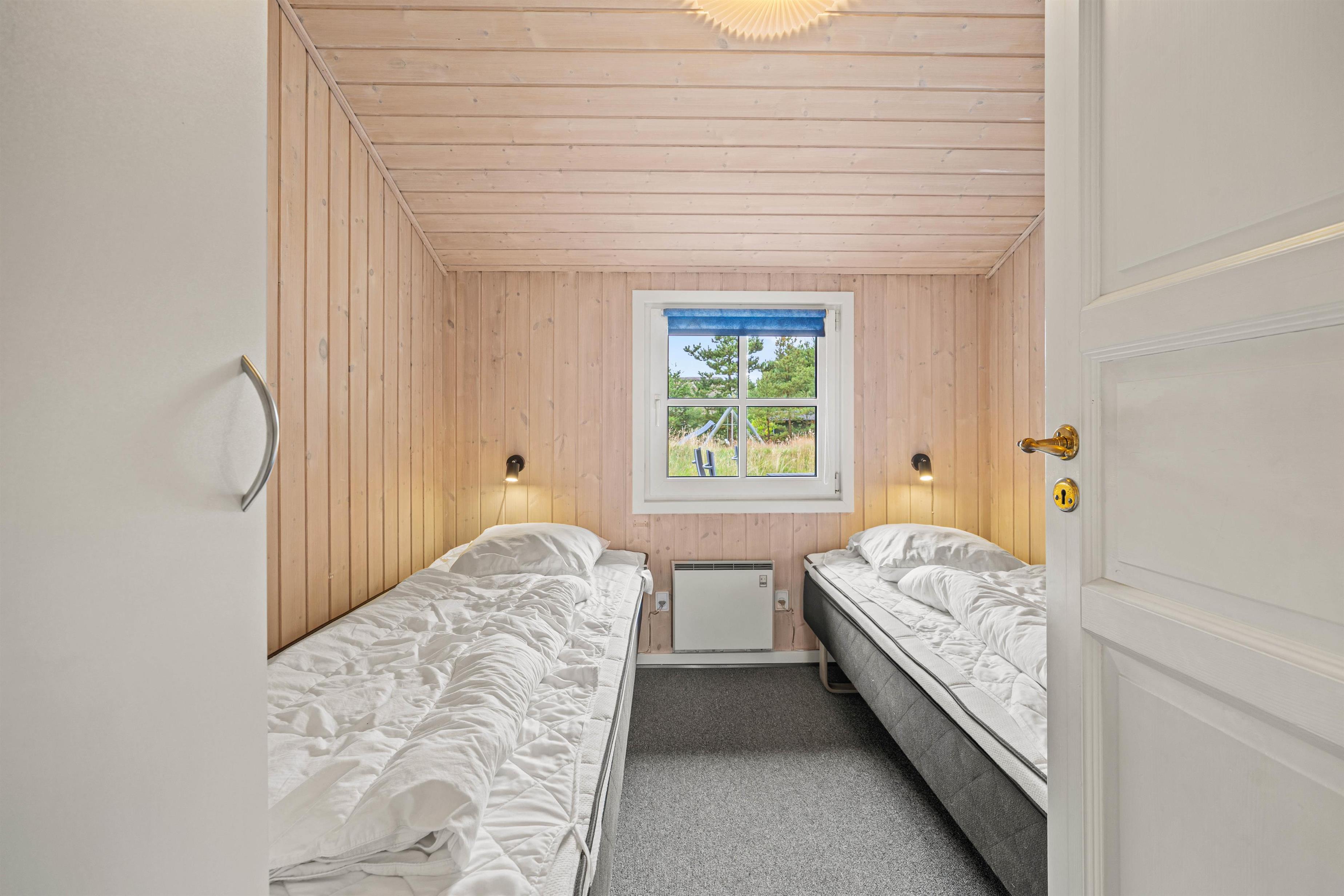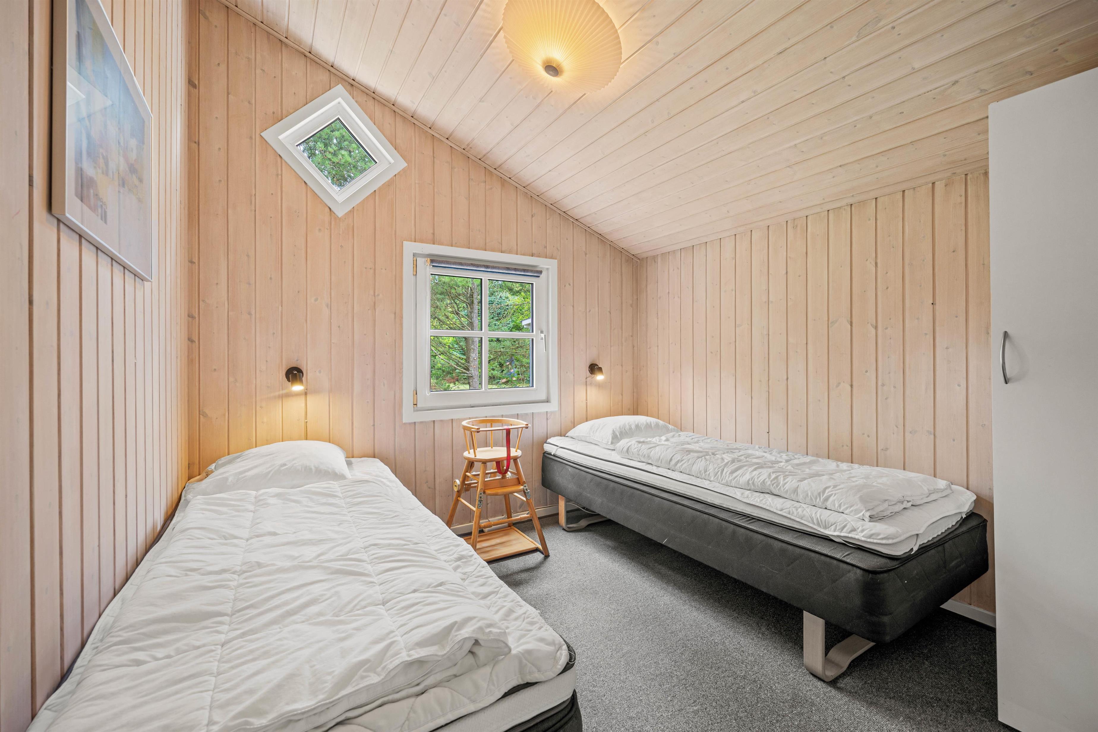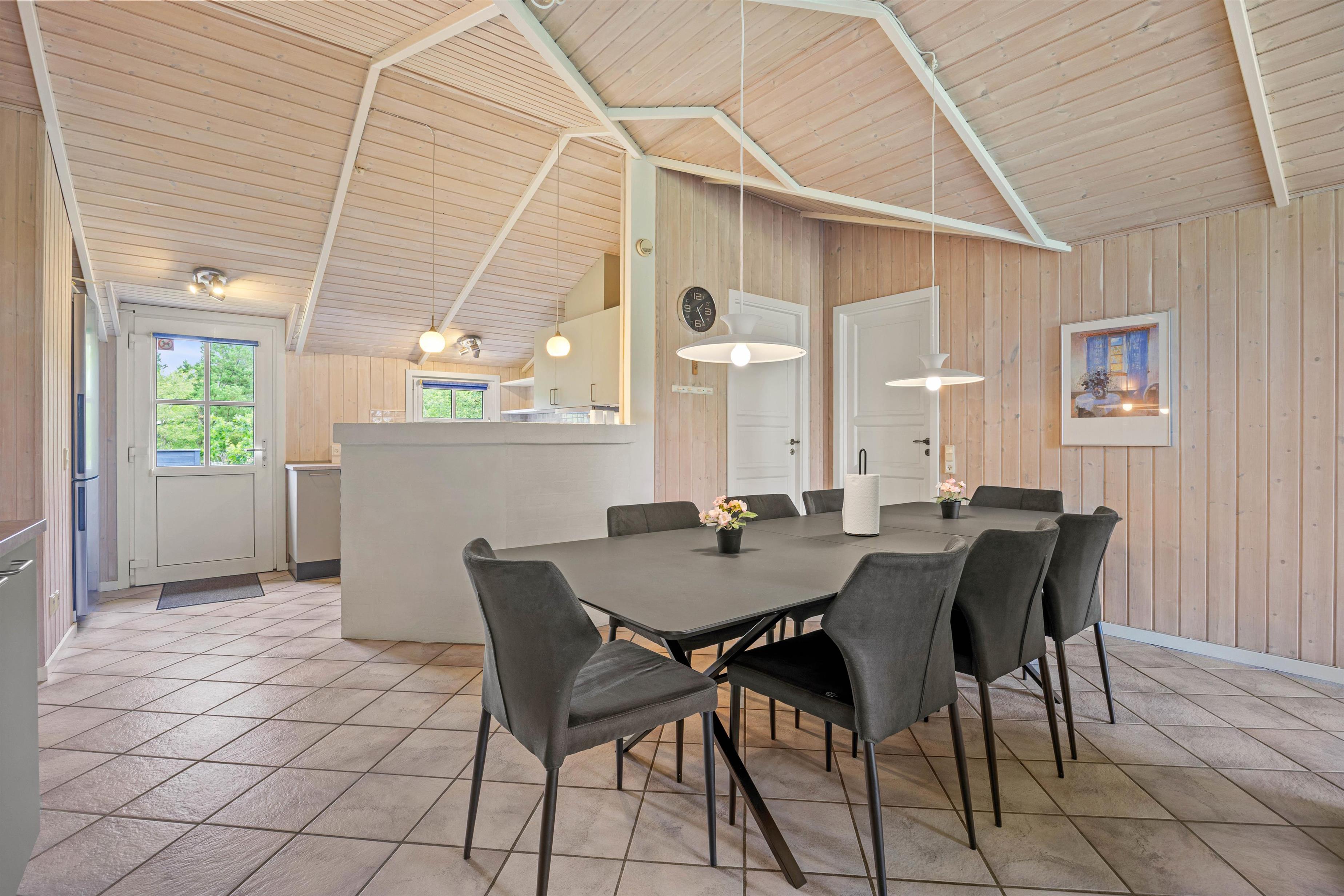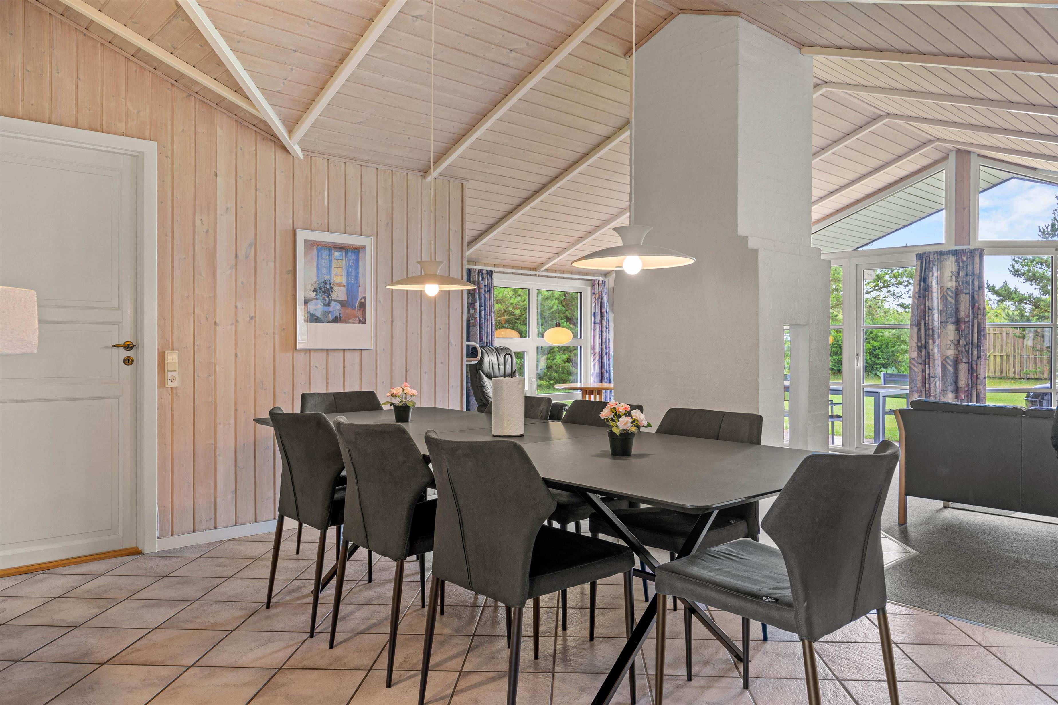 Reading chairs and sofas in the living area provide comfortable spaces for gathering, reading or playing games. Meanwhile, you can enjoy views of the large garden through the window front, which floods the interior with natural light. After a long walk or day at the beach, the hot tub and sauna offer perfect relaxation. The energy-efficient heat pump ensures the interior stays comfortably warm even on cooler days.