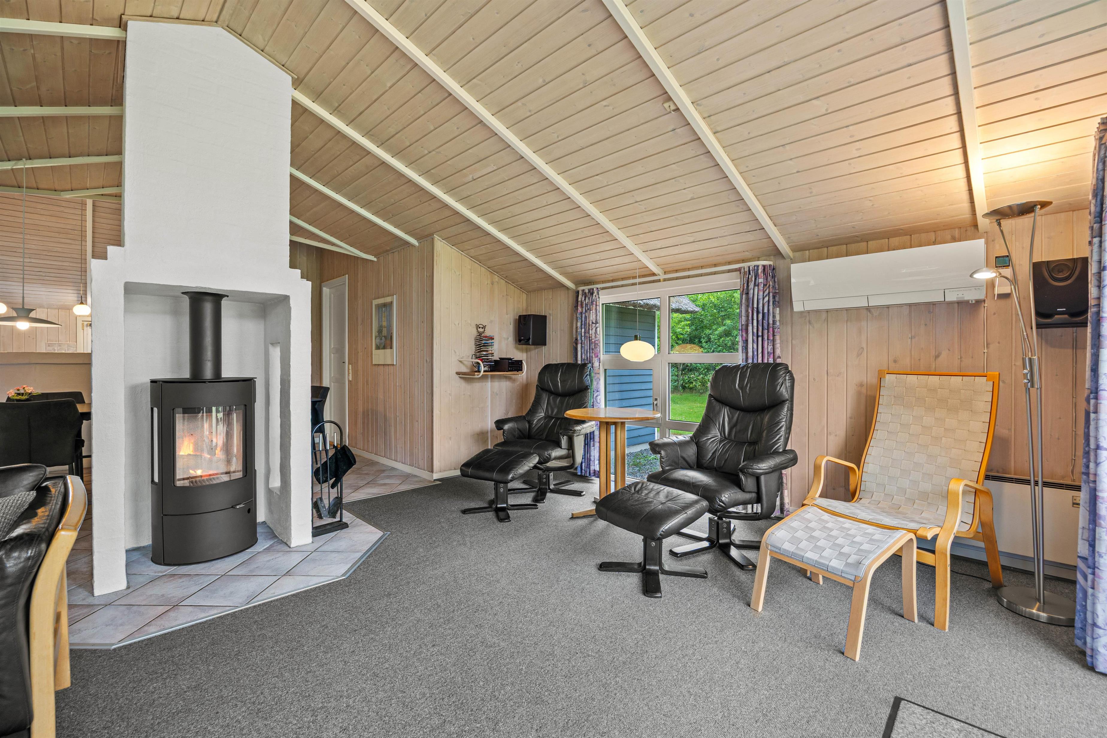 Wooden house charm and wood-burning stove create a restful holiday atmosphere