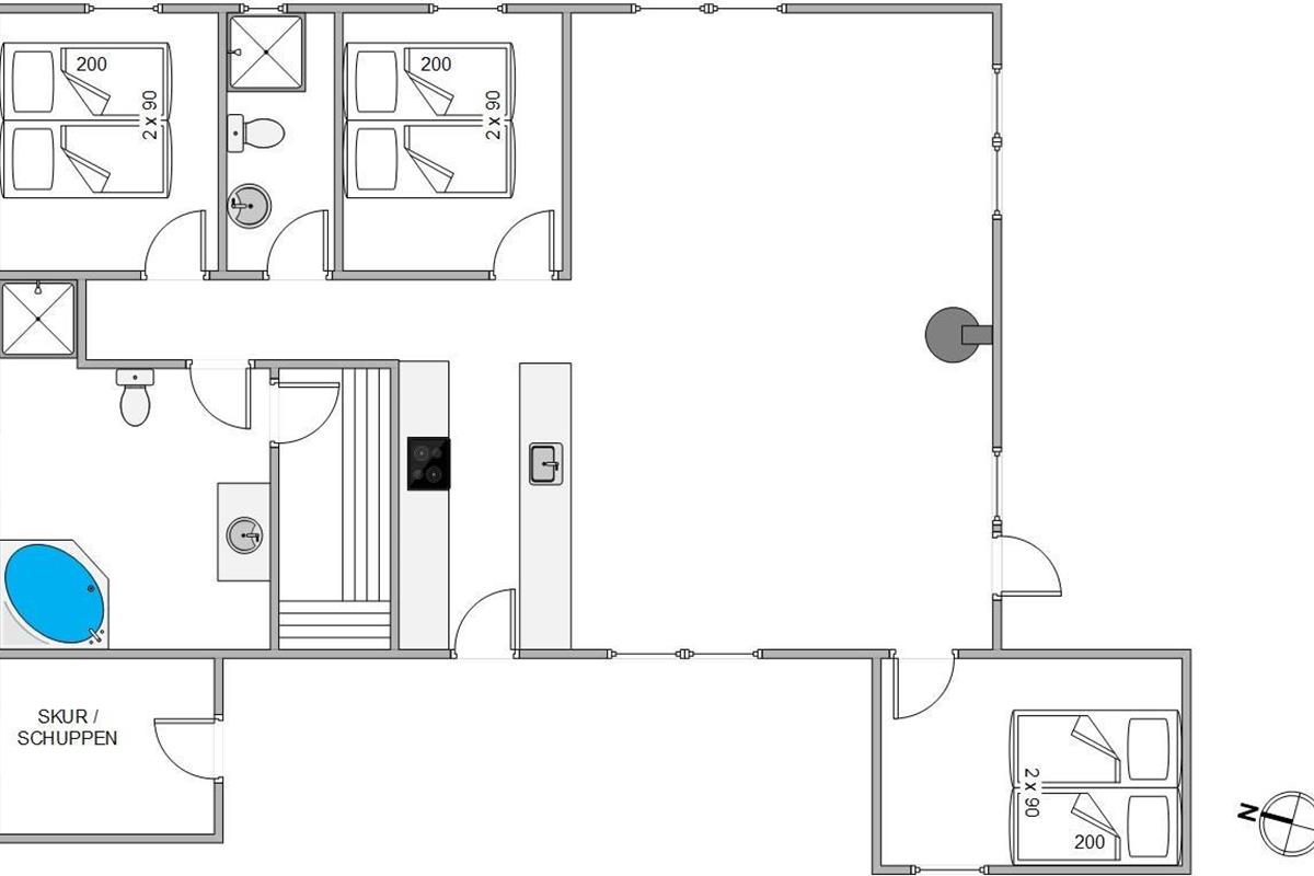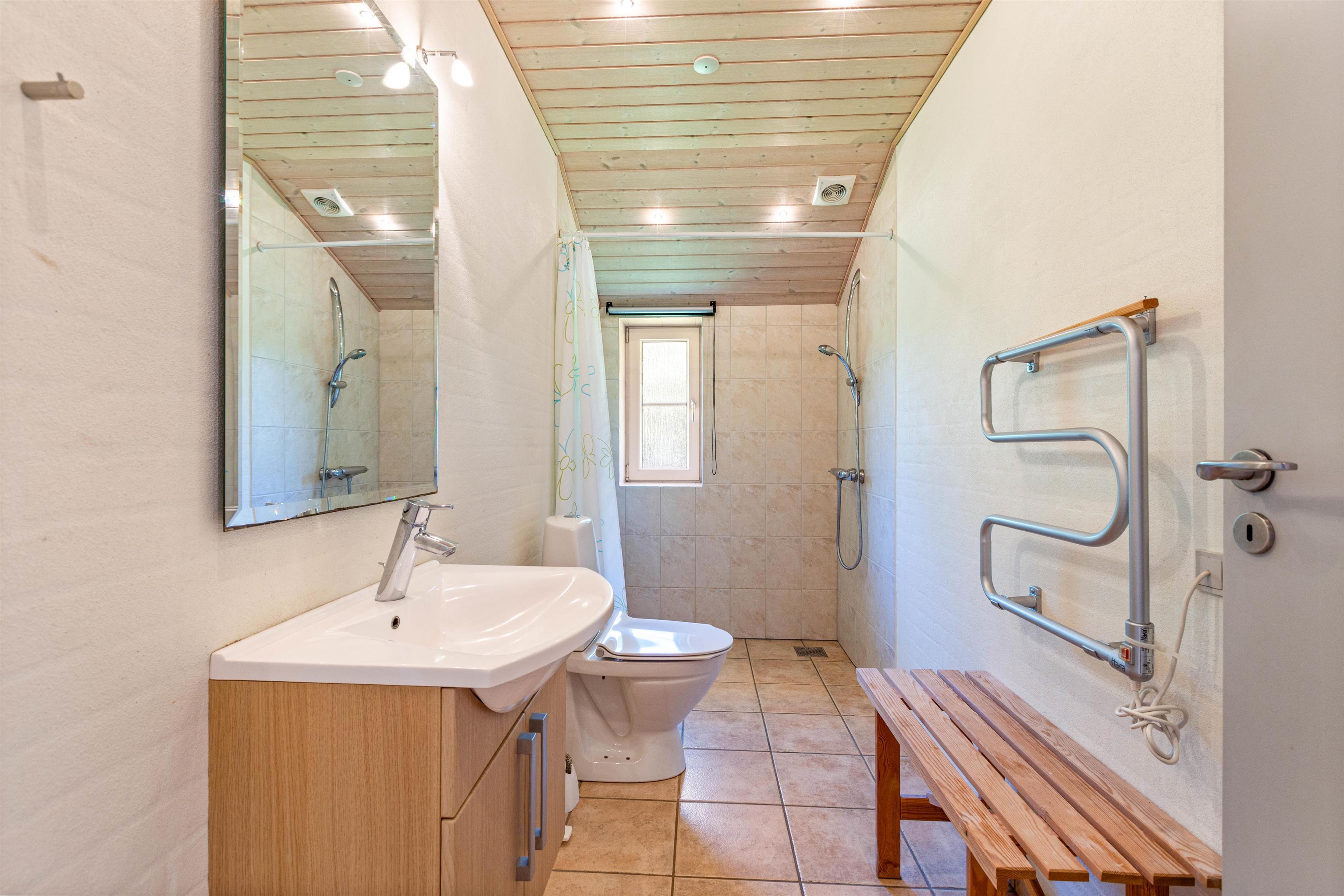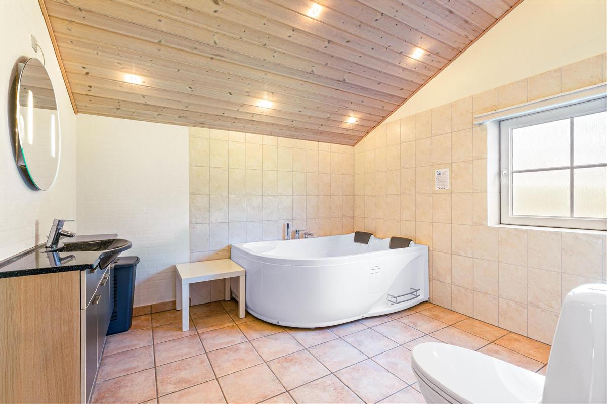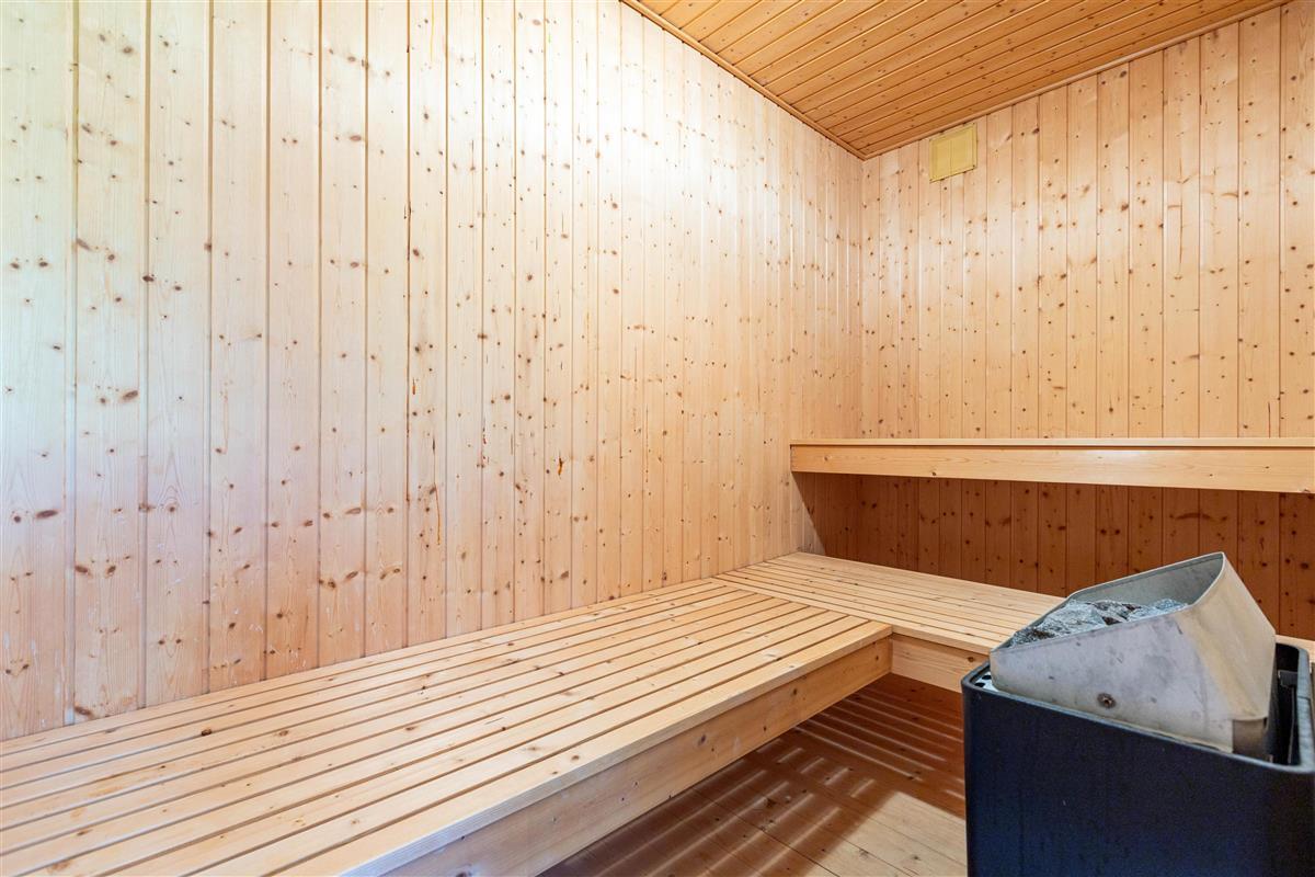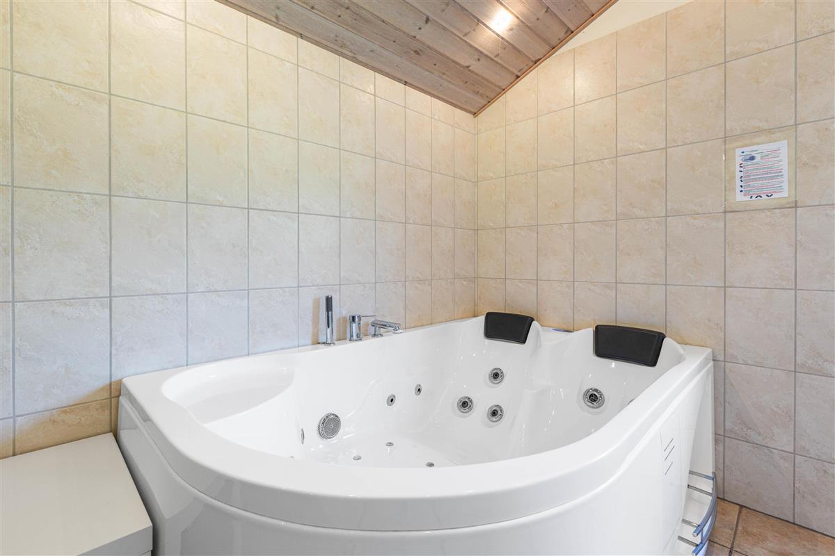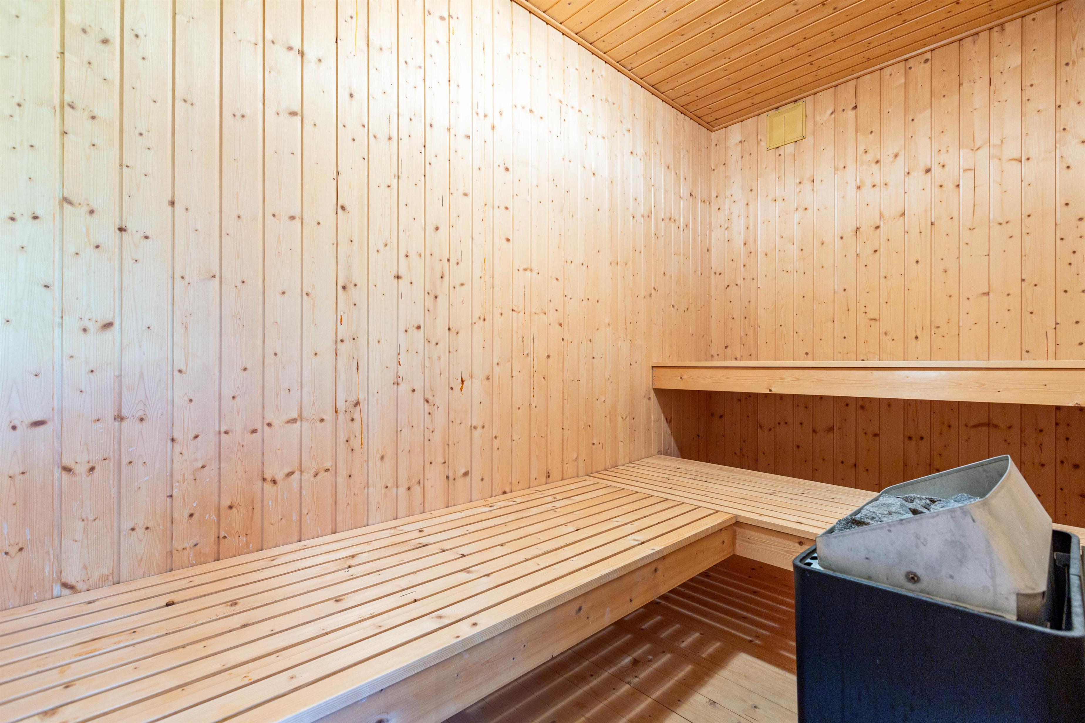 The spacious bathroom features both a sauna and whirlpool, perfect for unwinding after an exciting day in the fresh air. These facilities, combined with the wood-burning stove, provide year-round comfort and cosiness, ensuring a truly relaxing holiday experience.