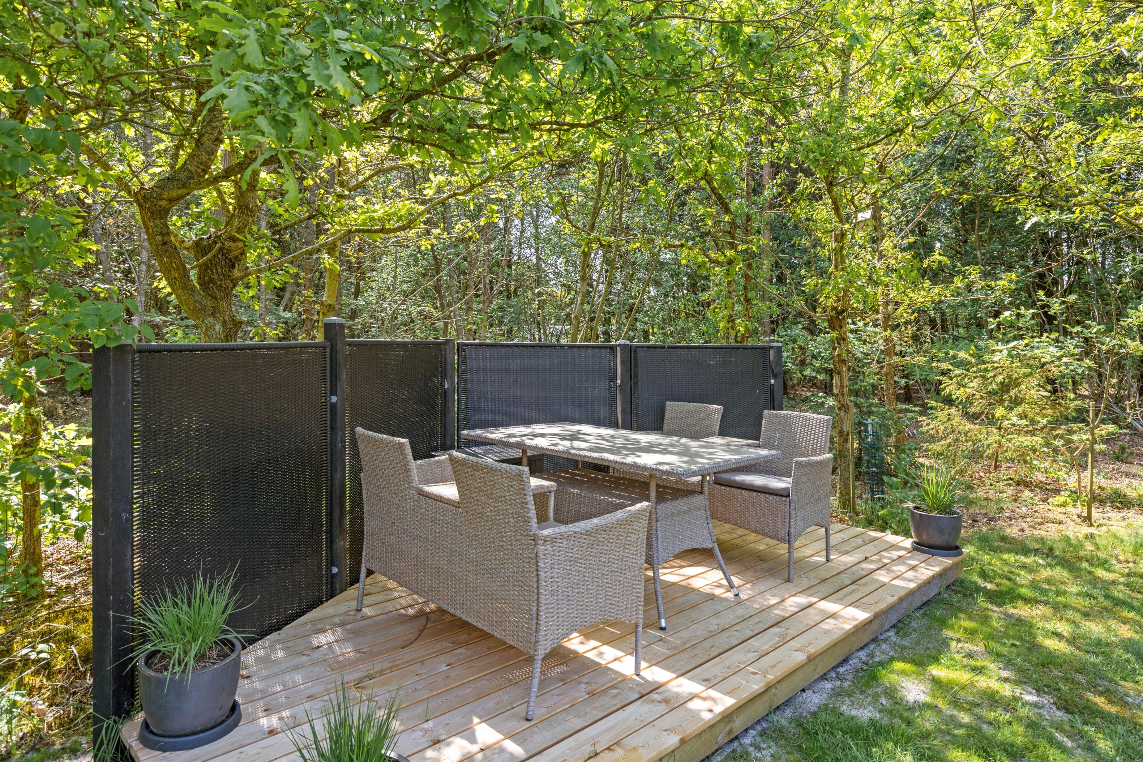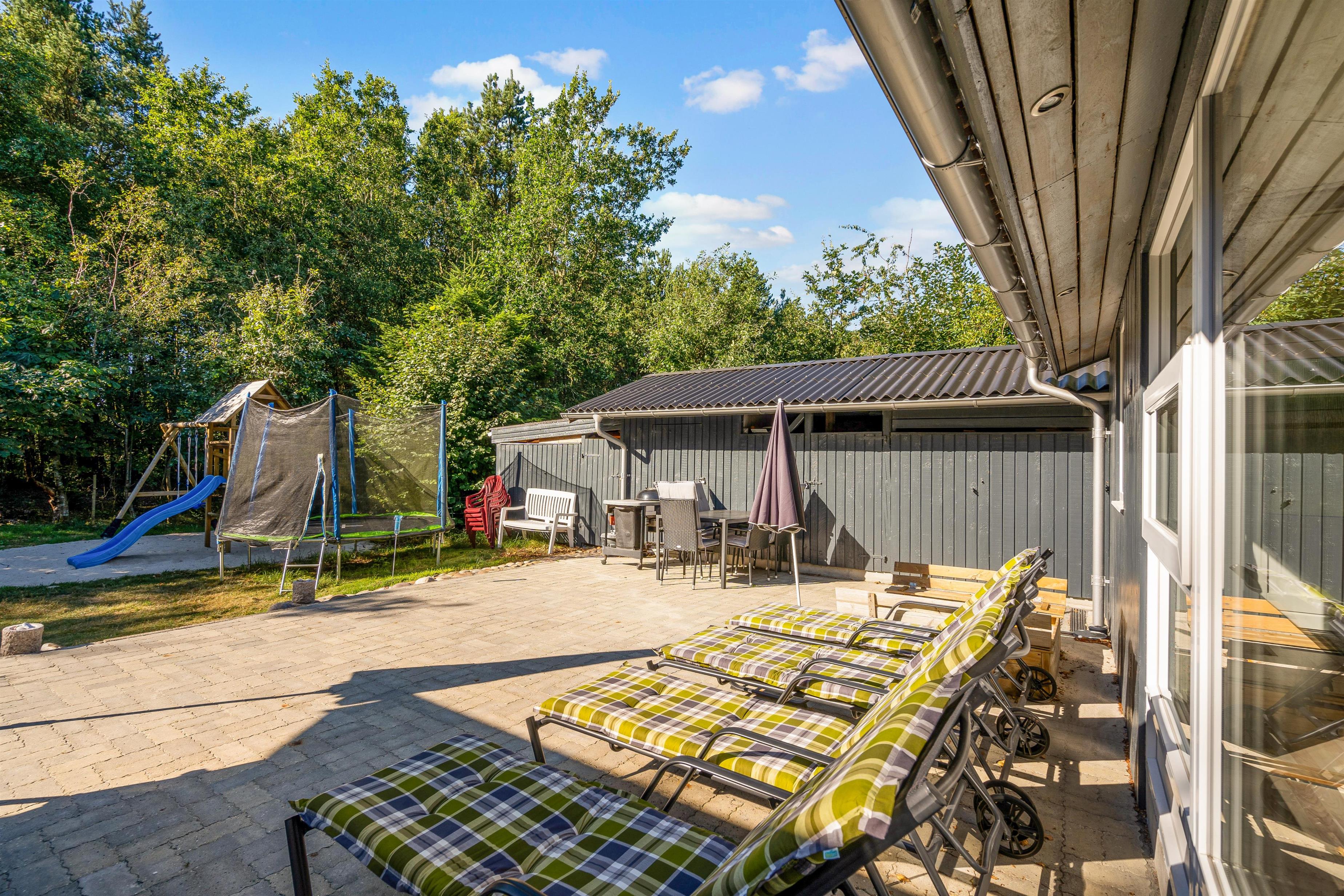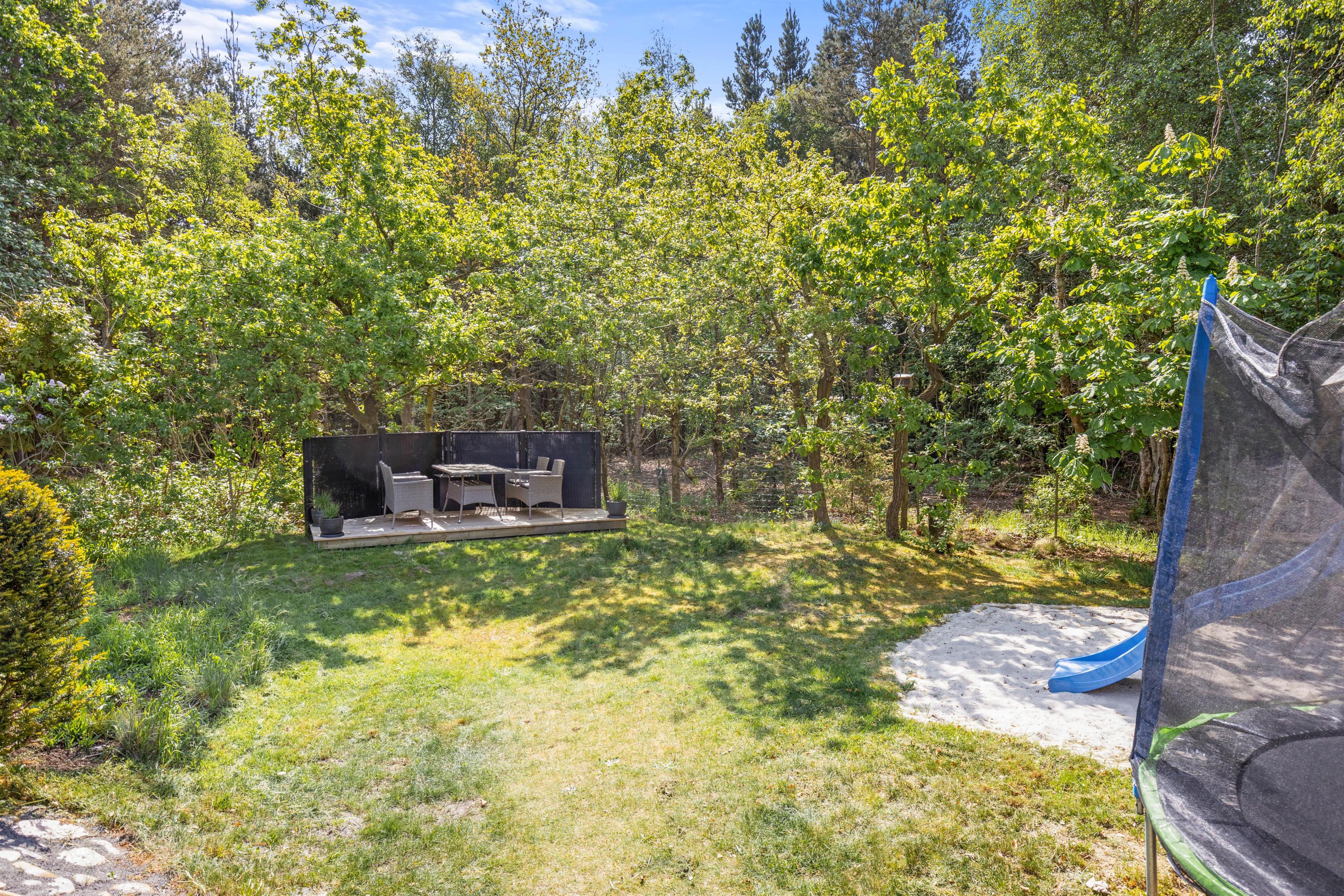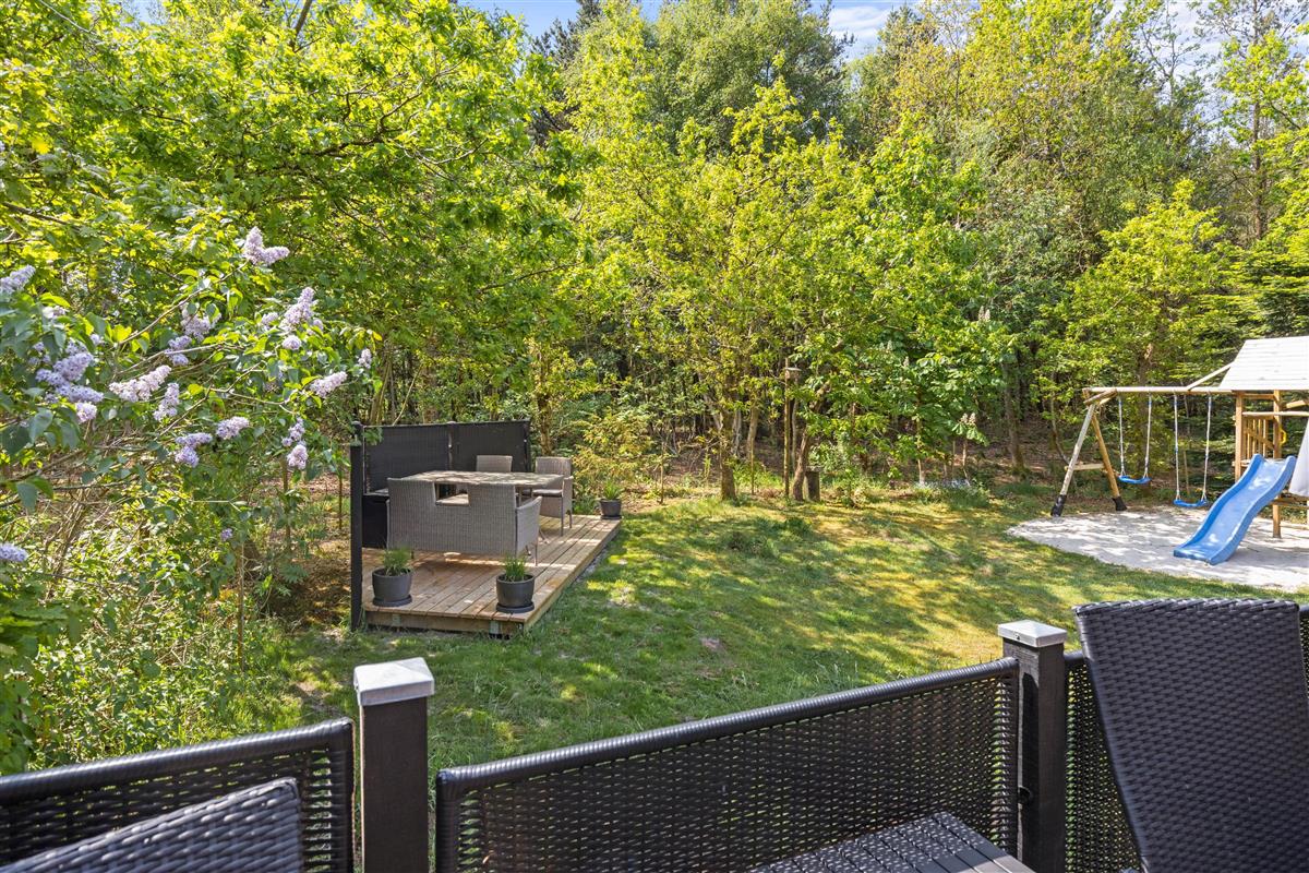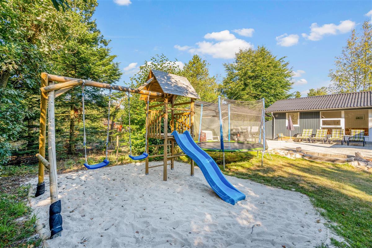 The holiday home enjoys lovely views over green spaces. The living room opens directly onto a beautiful covered terrace, perfect for relaxed barbecue evenings. The large terrace also offers plenty of space for lounging on sun beds. Children will love the outdoor play area, complete with trampoline, sandpit and a play tower with swing and slide - perfect for the whole family.