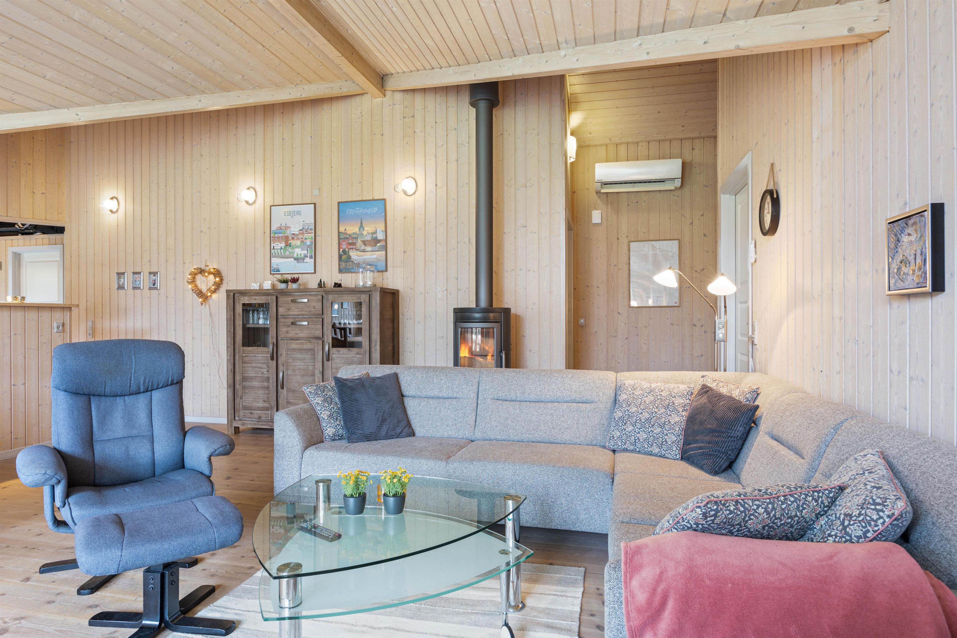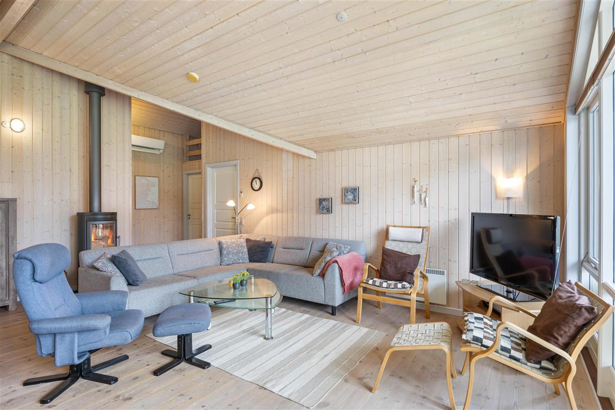 The living room welcomes you with an inviting atmosphere perfect for relaxation. A wood-burning stove provides cosy warmth while large windows flood the room with natural light, and comfortable seating invites you to unwind and spend time with family and friends. The modern kitchen is equipped with everything a cooking enthusiast could desire. A dishwasher makes cleaning up easier, and the open-plan layout allows you to stay connected with others, making cooking together a pleasure.