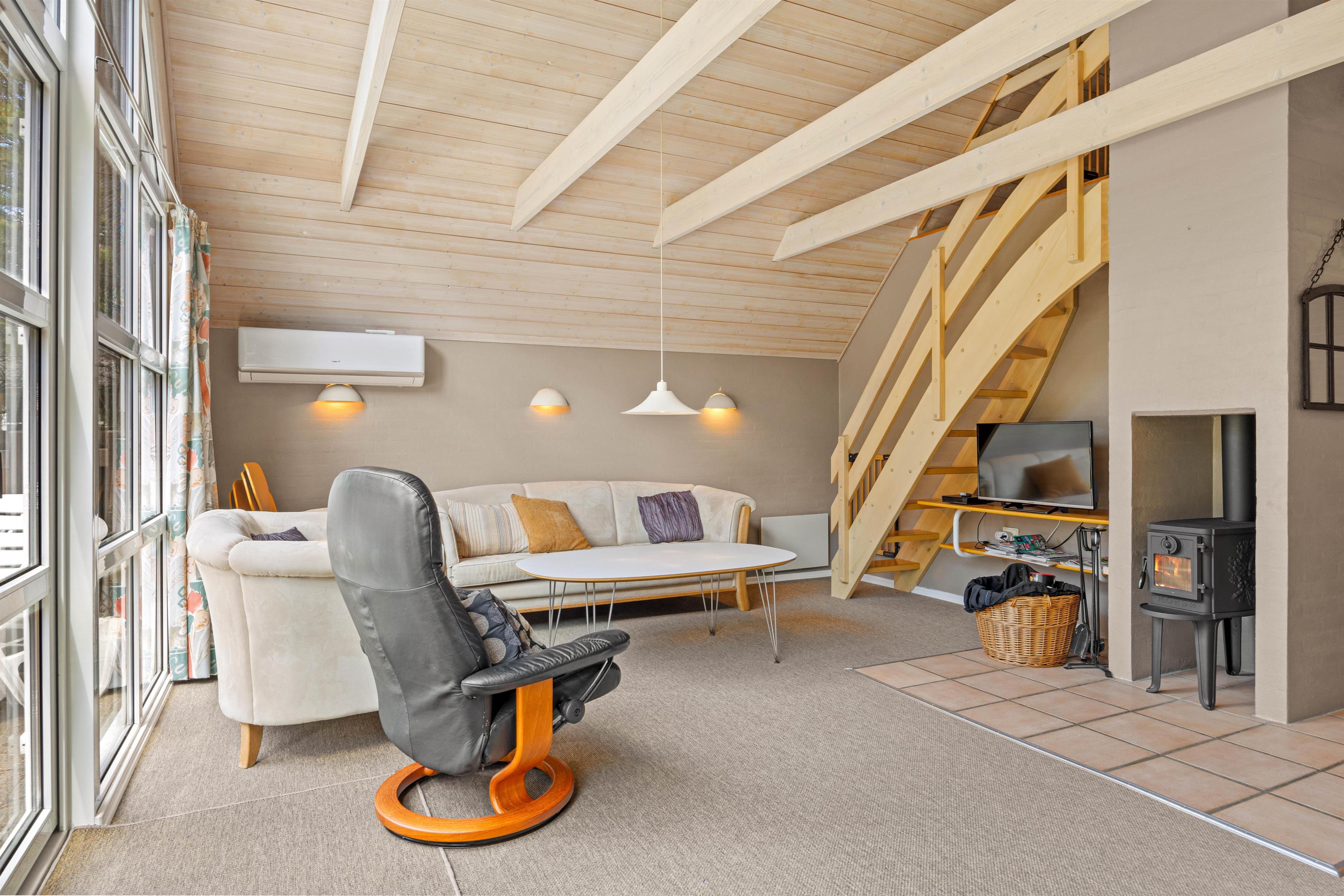 Der Innenbereich des Ferienhauses lädt zum Wohlfühlen ein. Im geräumigen Wohnbereich erwartet euch ein Kaminofen, der an kühleren Abenden für wohlige Wärme und eine schöne Atmosphäre sorgt. Für Unterhaltung ist durch einen Fernseher und einen Bluetooth-Lautsprecher gesorgt. Eine hohe Decke mit offenen Dachbalken und bequeme Sitzmöbel laden zum Verweilen ein.
