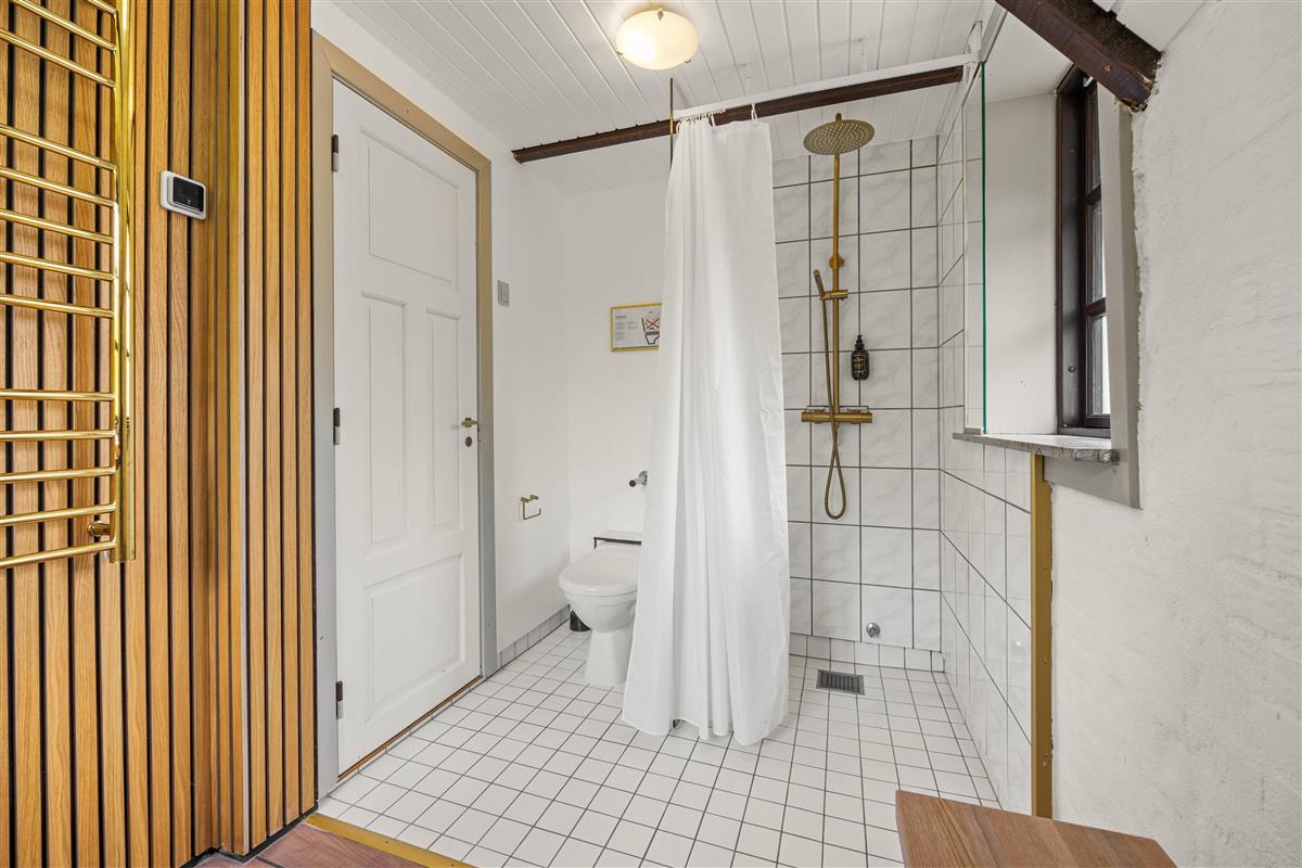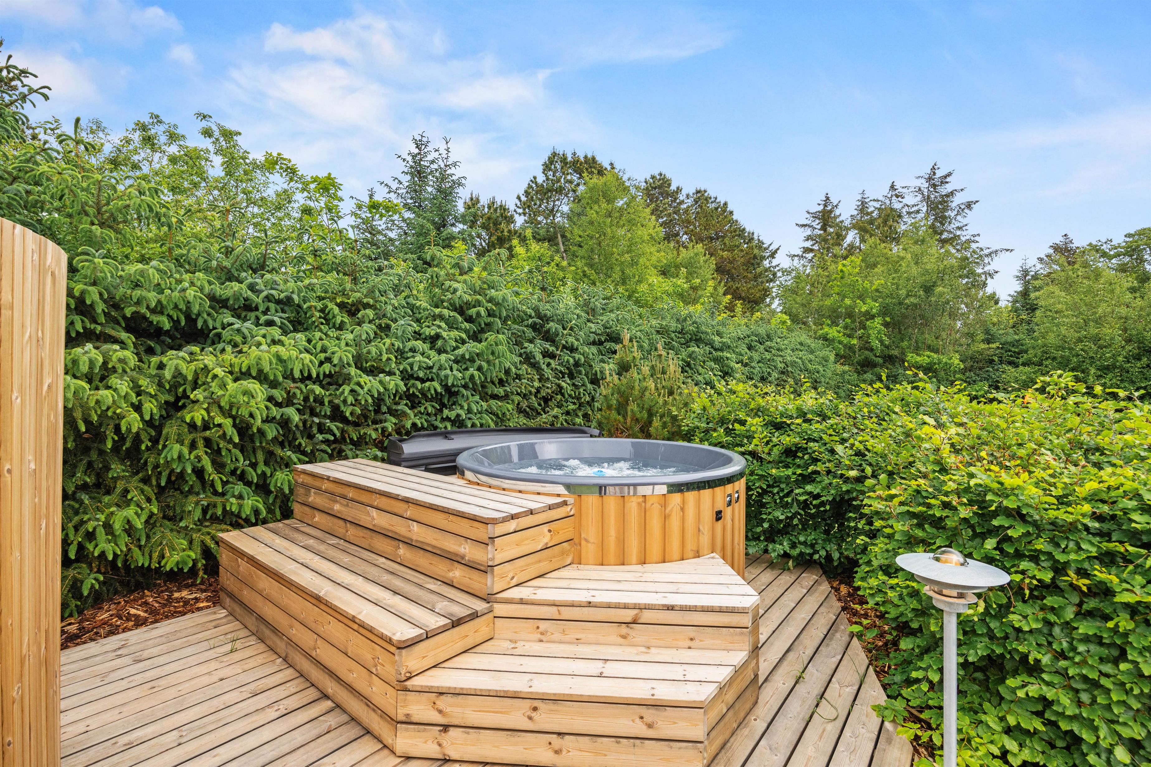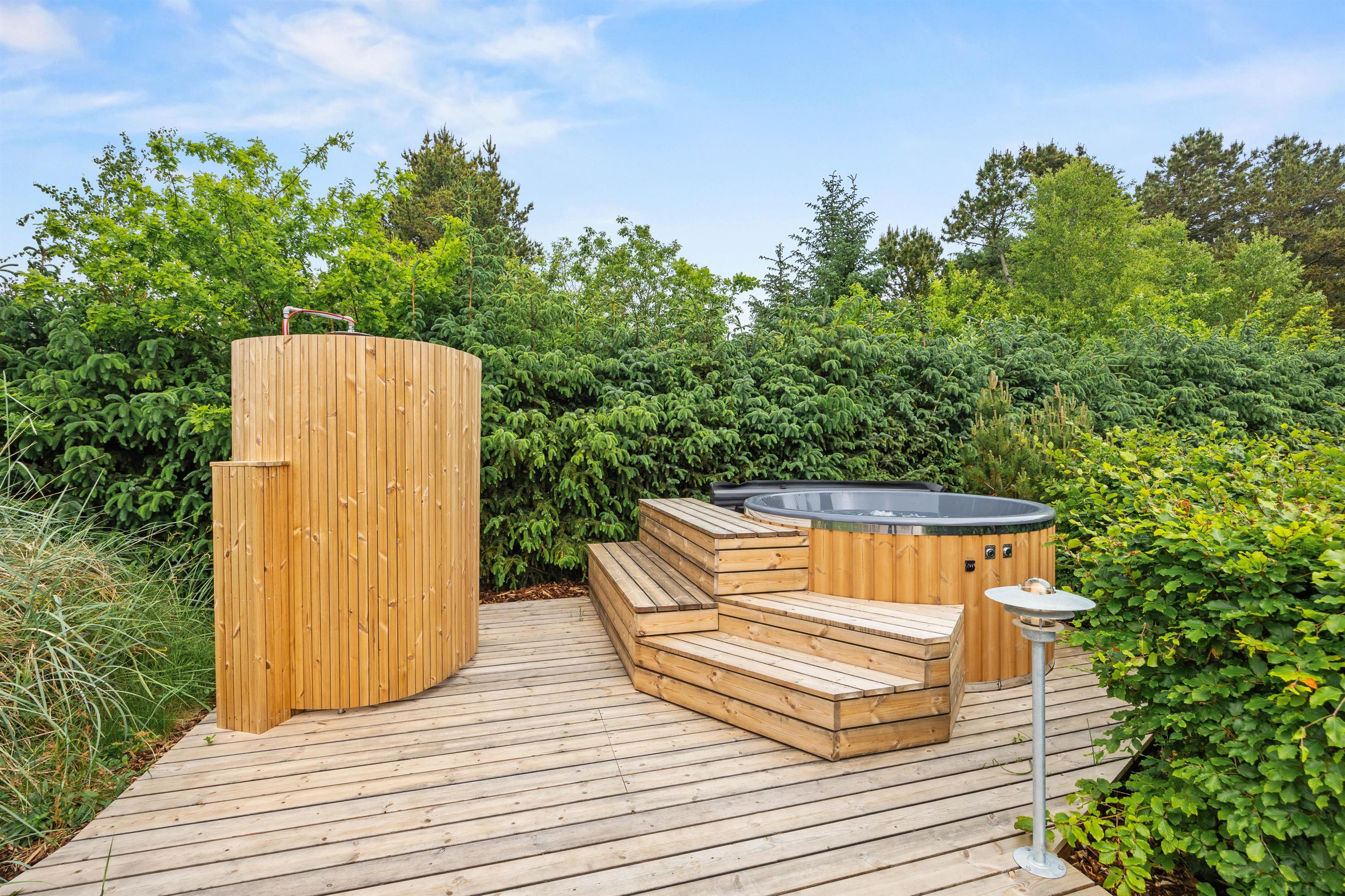 The beautiful stone terrace features comfortable garden furniture and sun loungers, perfect for relaxation. Enjoy your afternoon coffee outdoors with a slice of Danish cake while soaking up the sunshine and peaceful atmosphere. There's also a barbecue available for delicious alfresco dining. If you want to relax some more, you can enjoy the bubbles in the wilderness bath or take a nice shower outdoor.