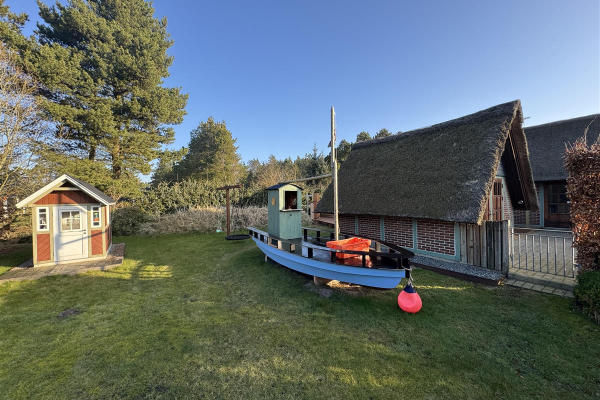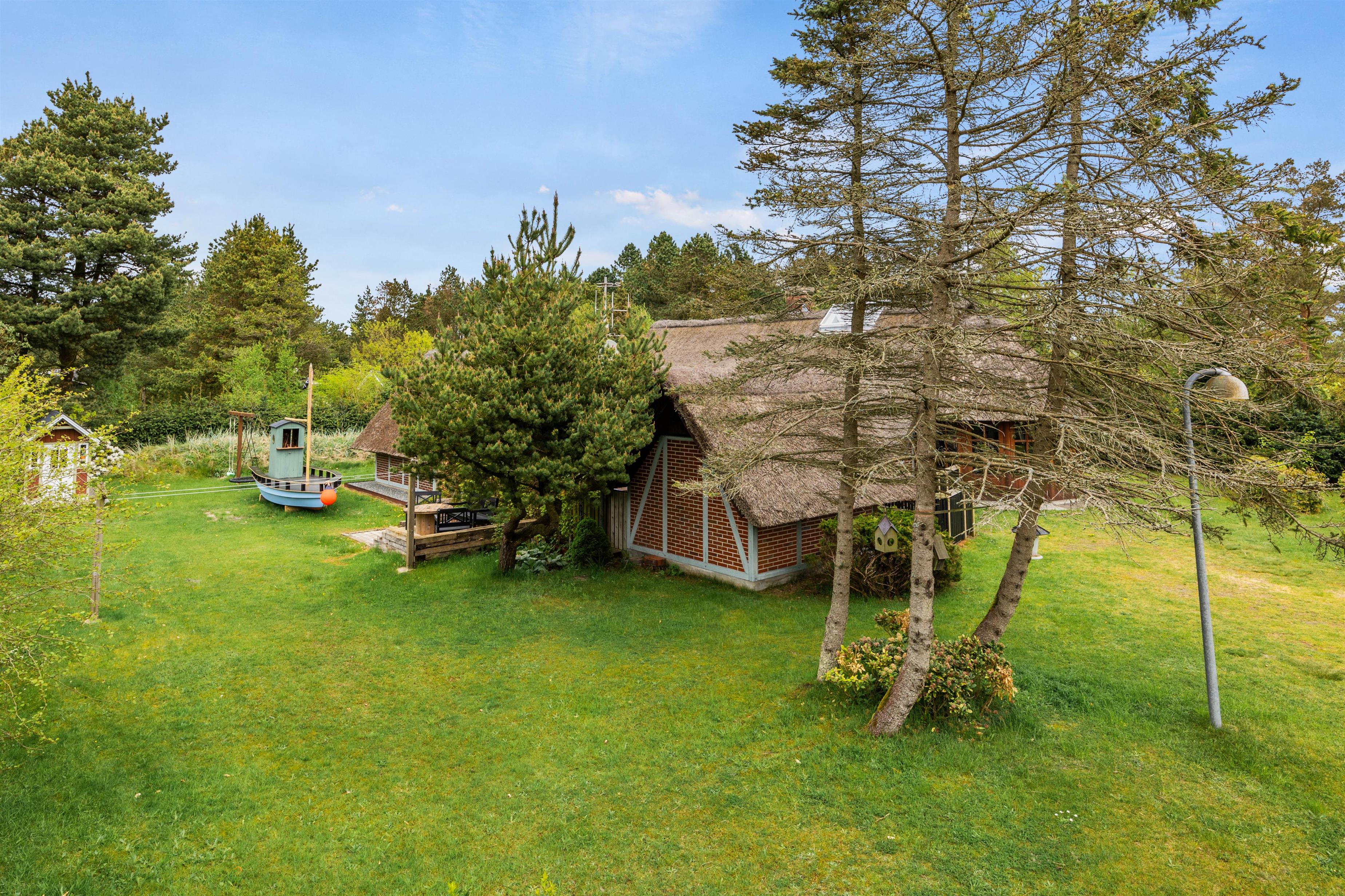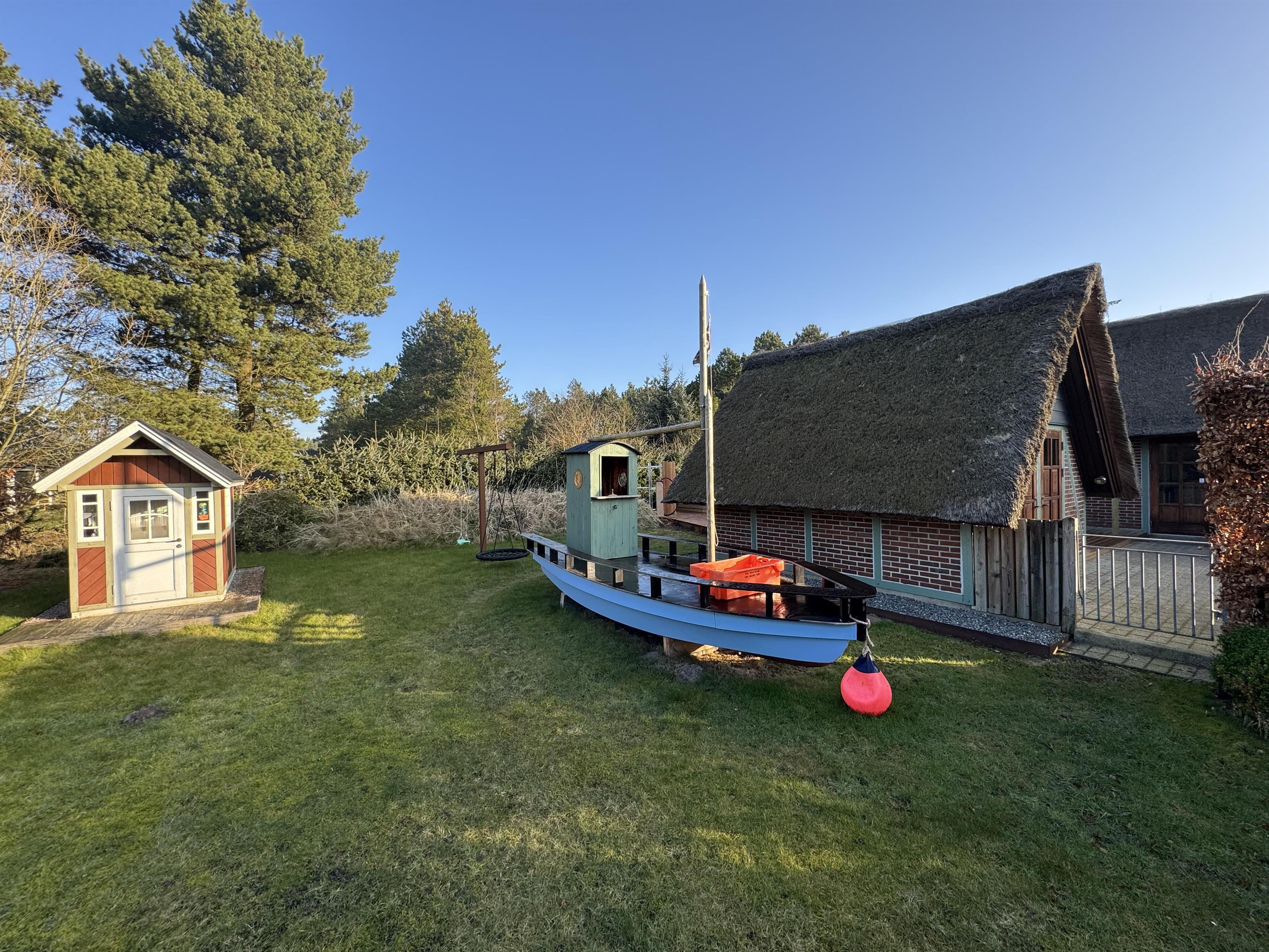 This comfortable thatched cottage sits on a generous 2,949-square-metre plot with lawns perfect for football or a game of Viking chess (Kubb). Children will love the pirate ship with sandbox, swing set, and playhouse.