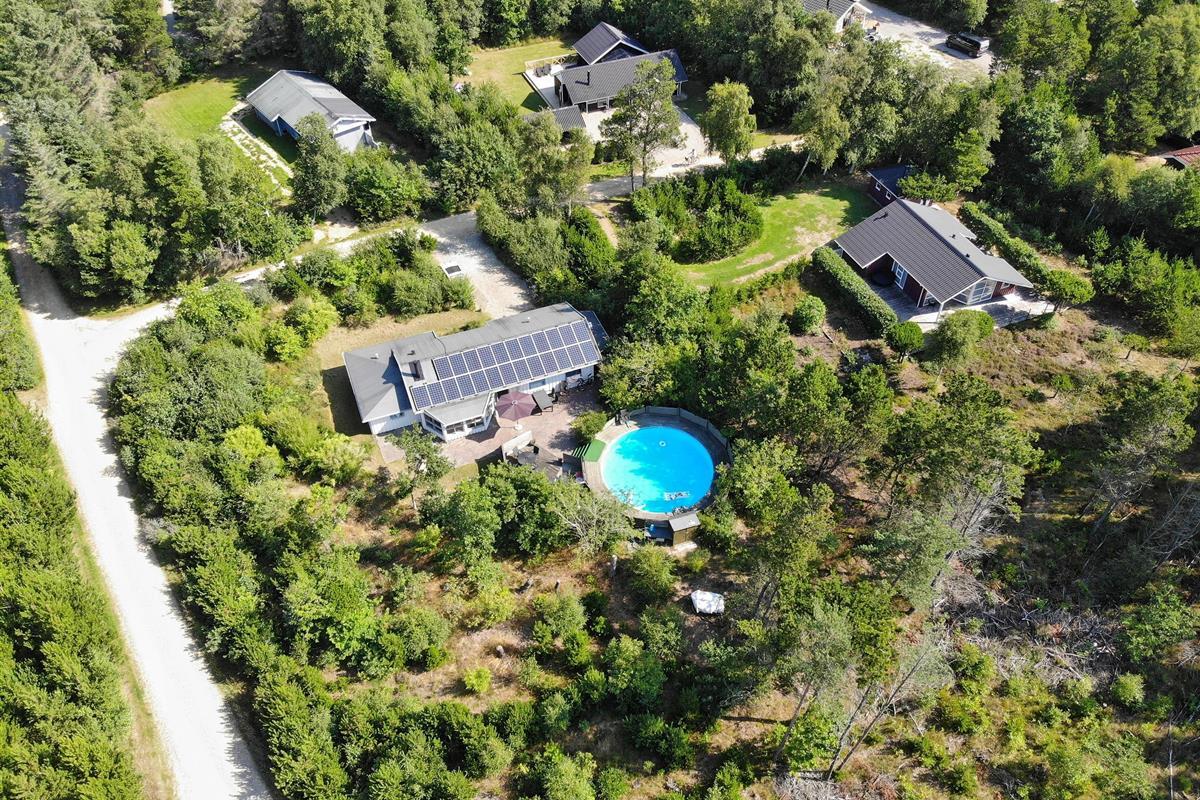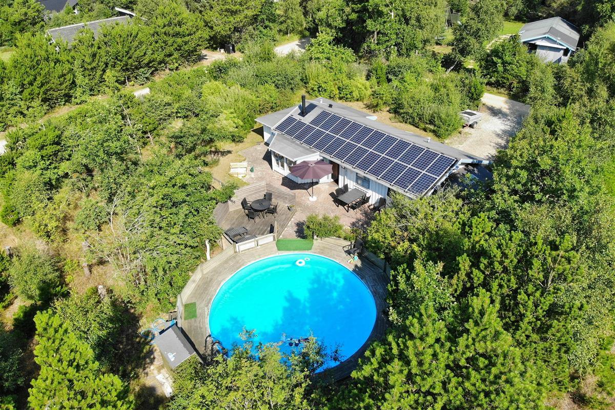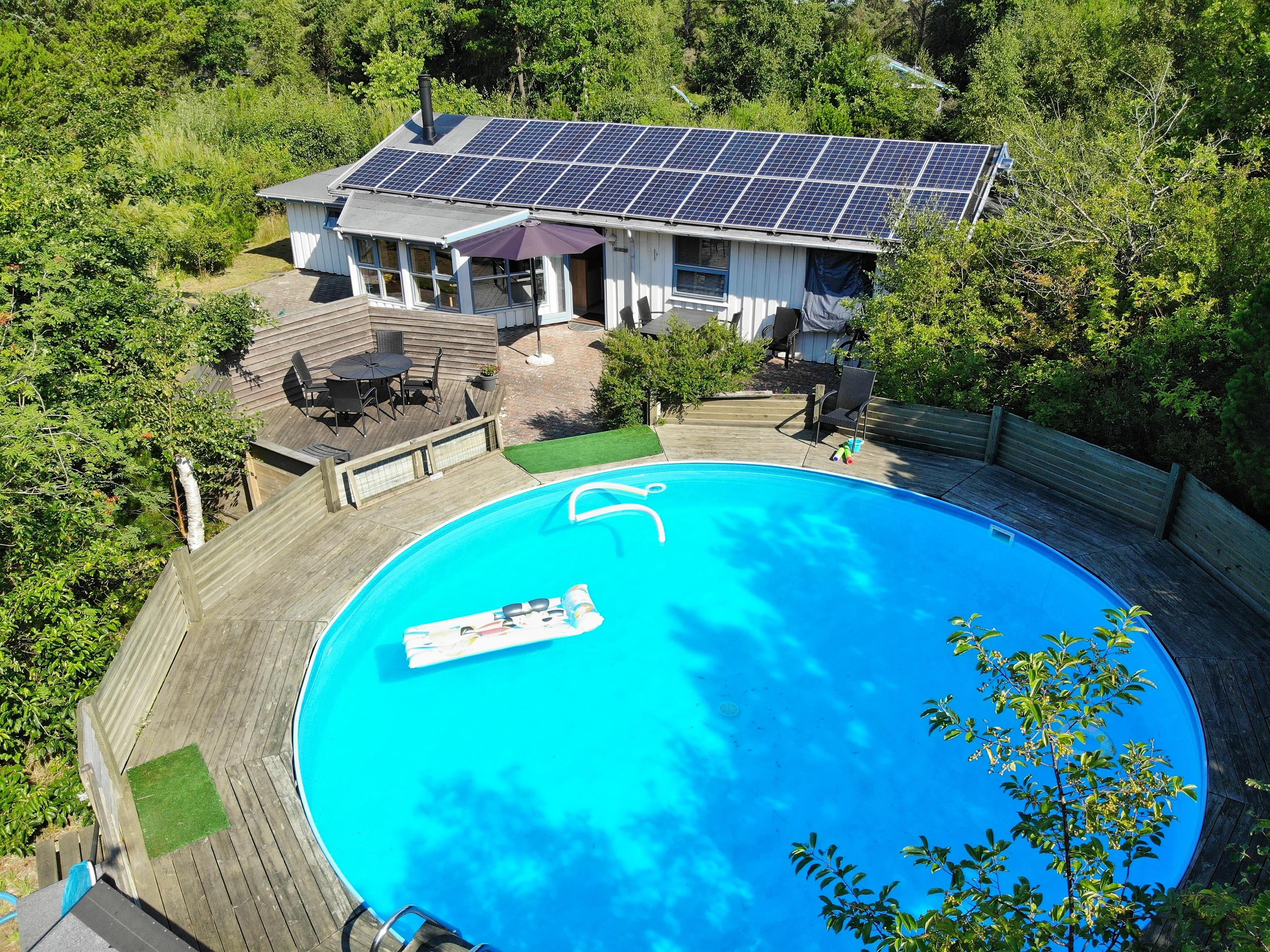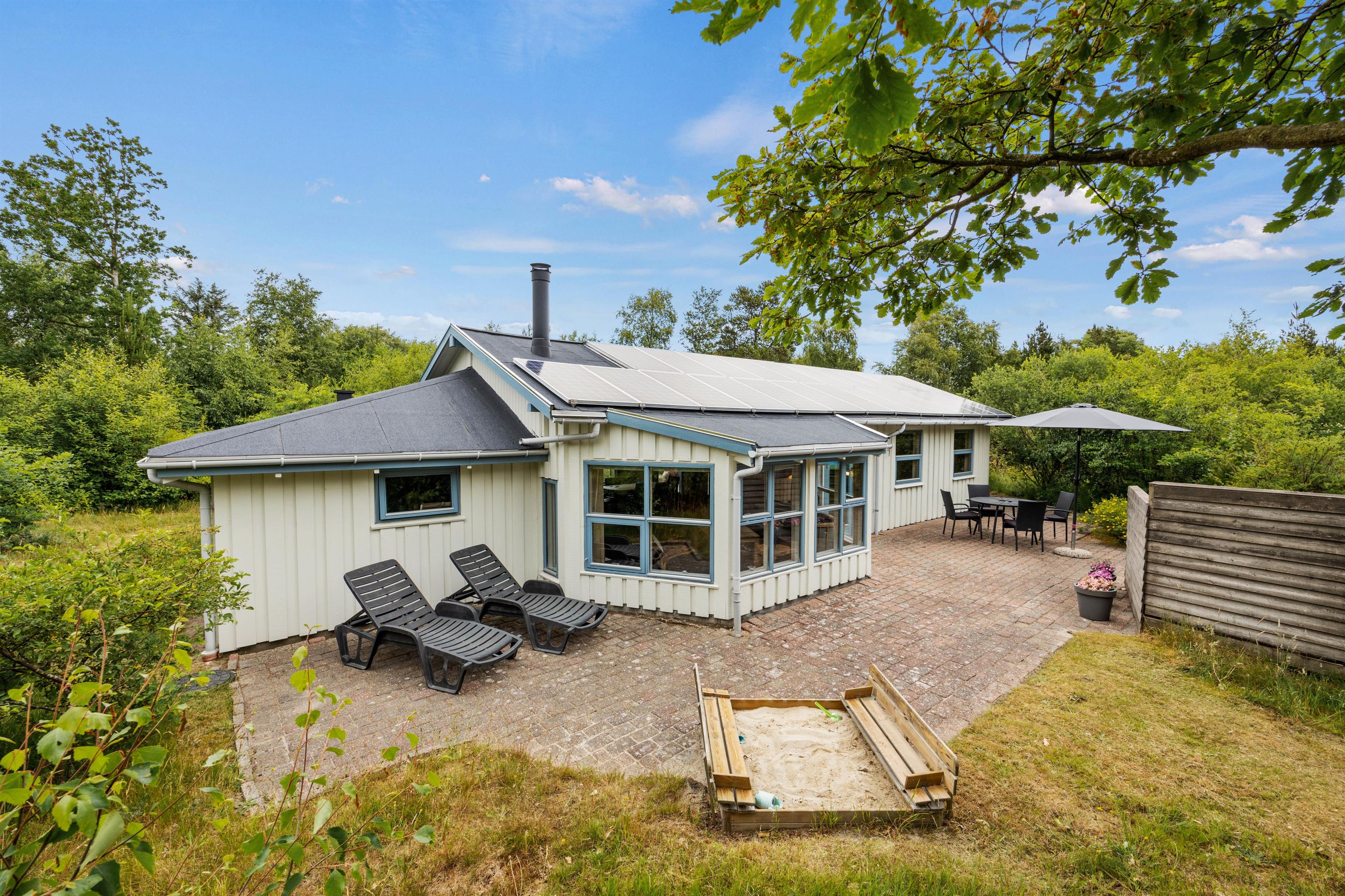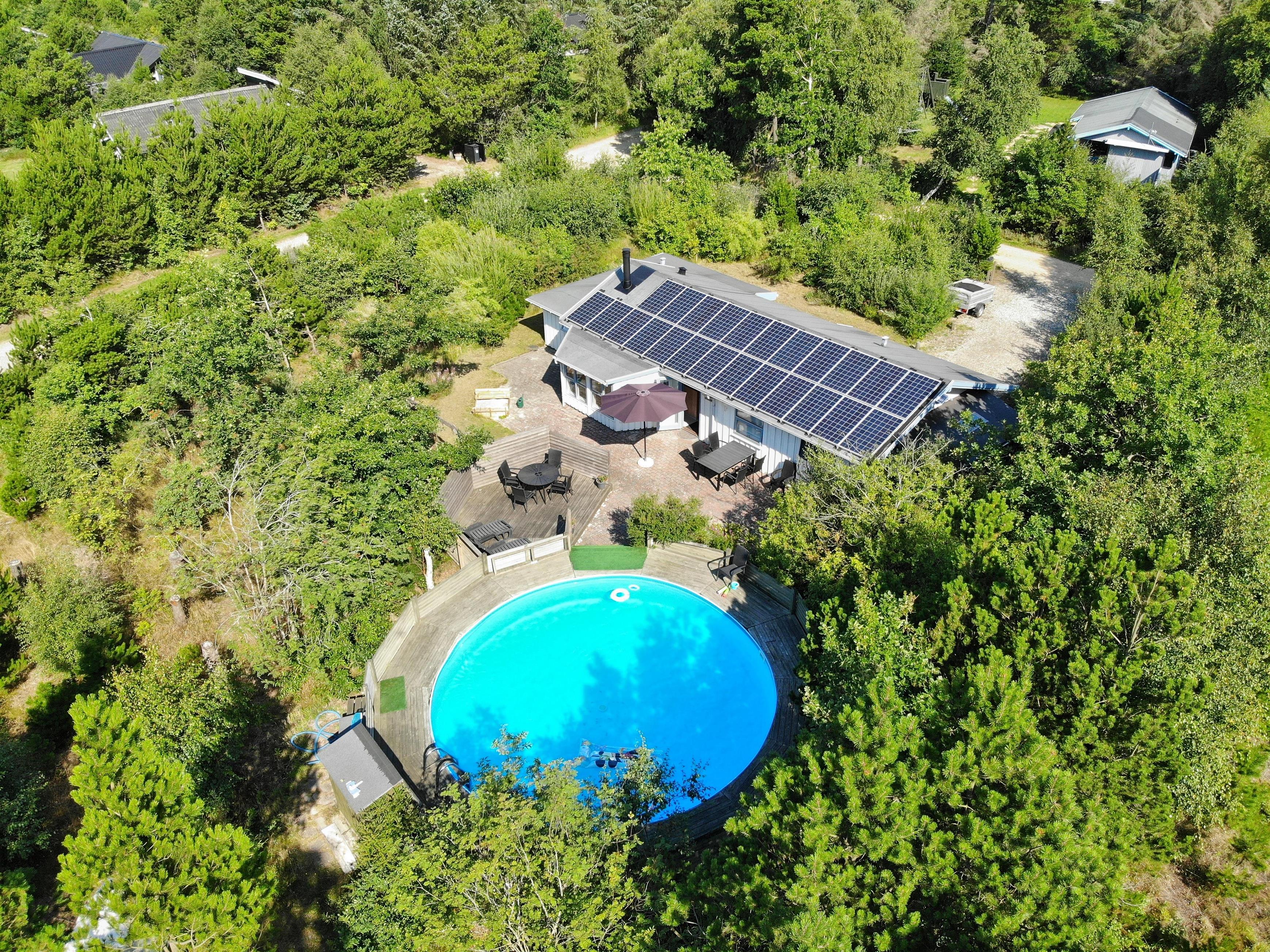 Surrounded by trees and hiking trails, you'll find this cosy holiday home at Nørrevang 200. The holiday home with its outdoor swimming pool enjoys a wonderful location. There's space for the whole family, including the family dog.