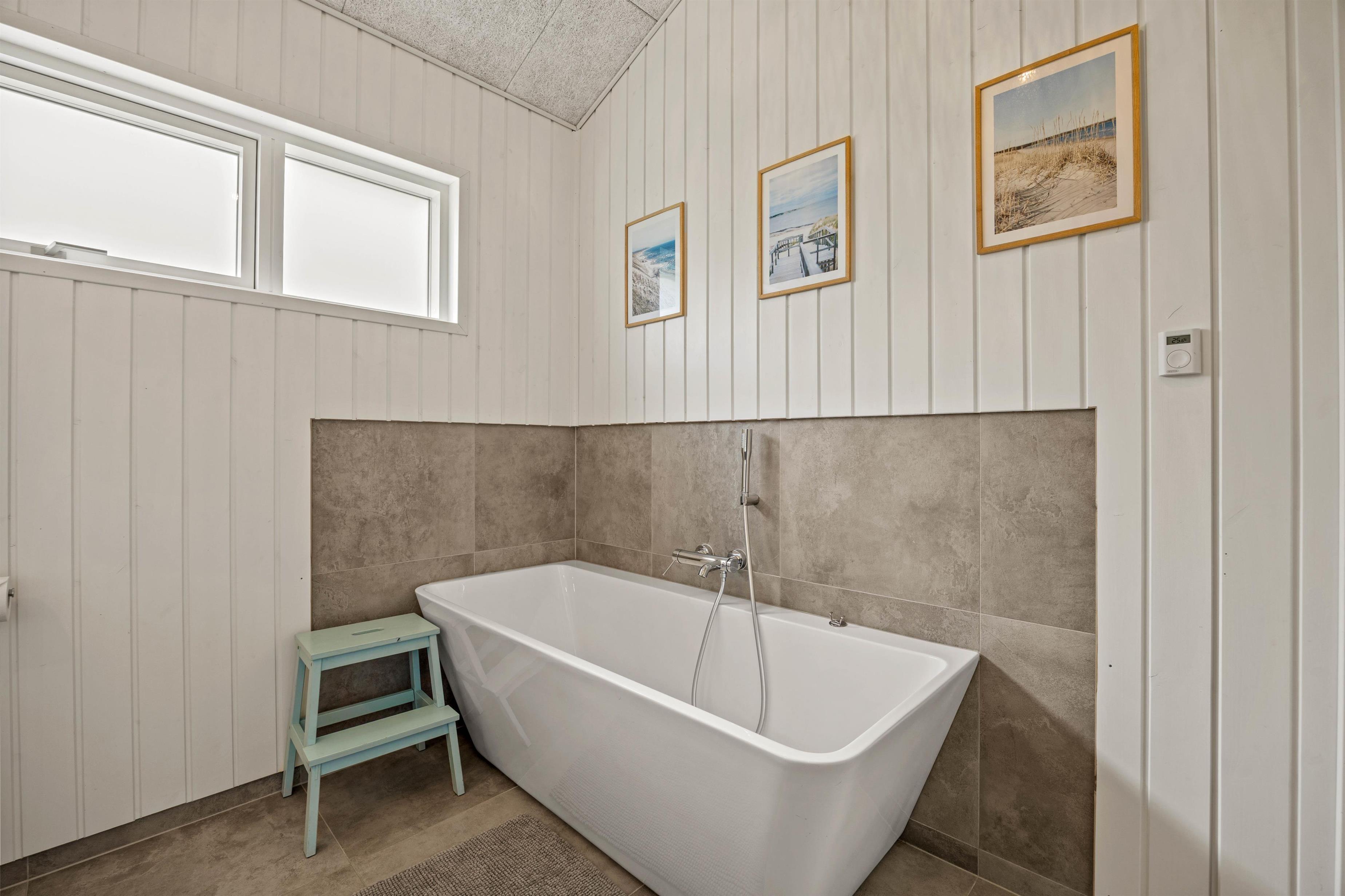This splendid house features high ceilings and plenty of space for cosy relaxation. The energy-efficient air-to-air heat pump provides comfortable ambient temperatures through underfloor heating, while the three bedrooms are furnished with double beds, and the mezzanine sleeping area will particularly appeal to older children. One bathroom features a bath where you can unwind after a long walk to the sea, or where little ones can enjoy their bedtime bath.