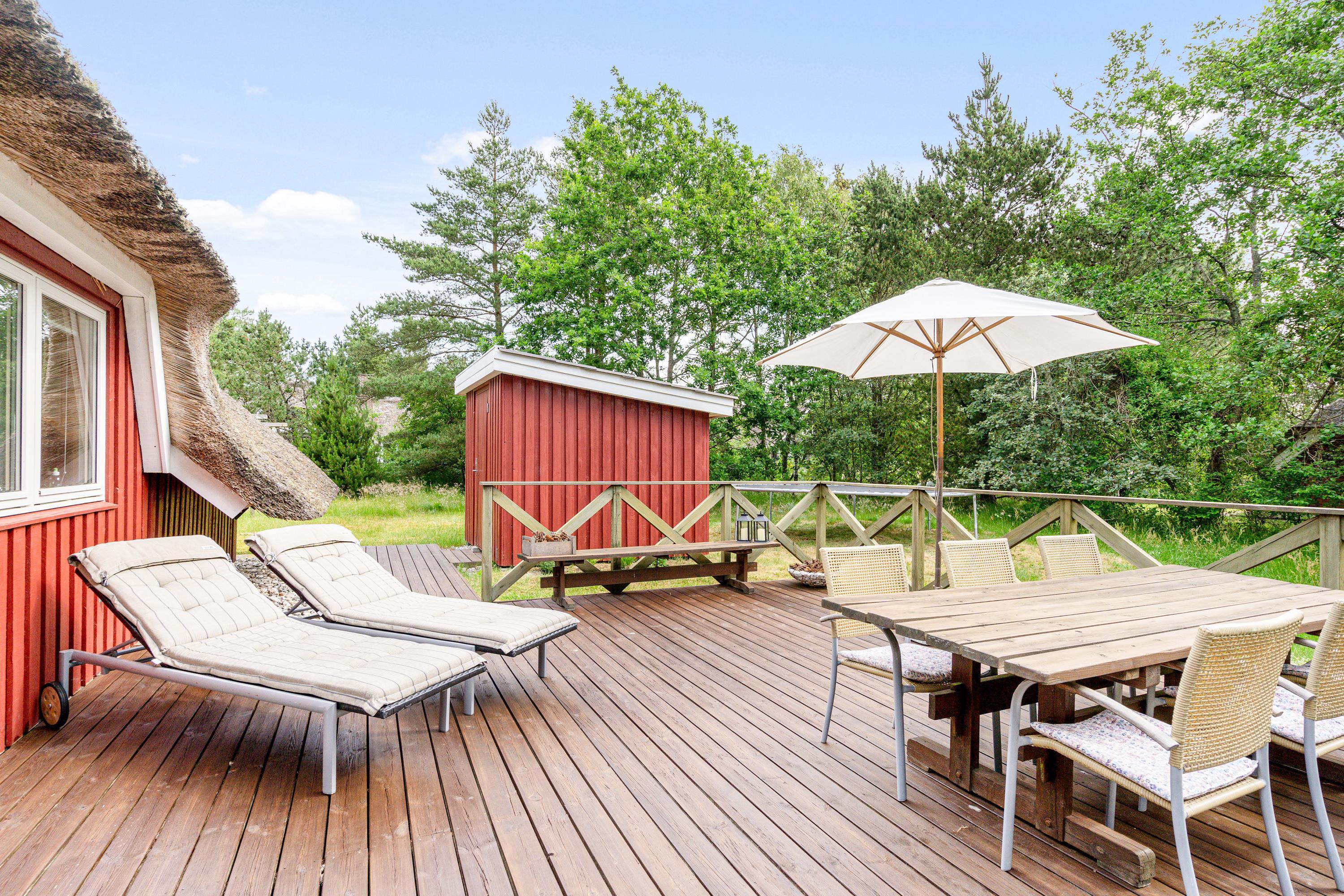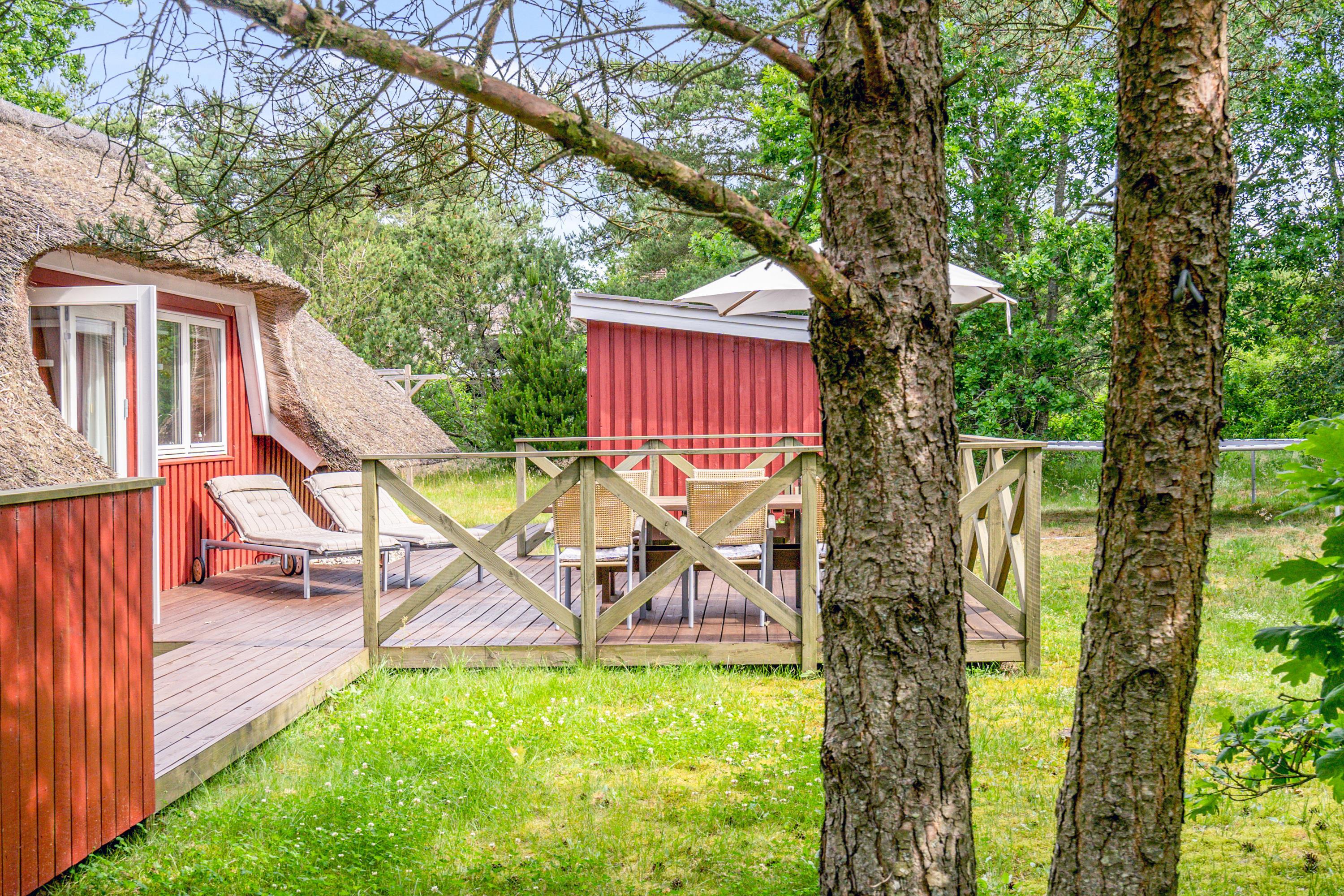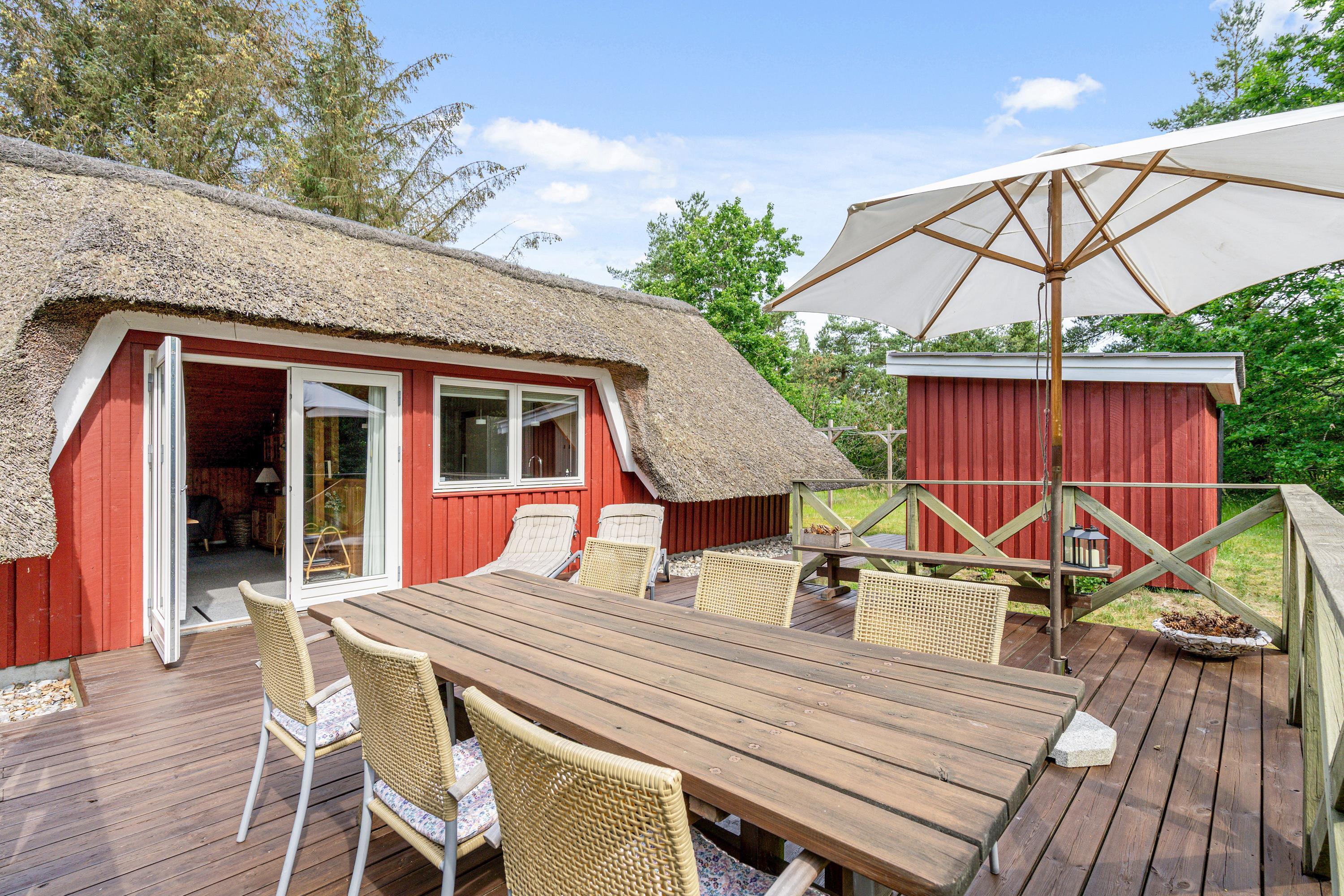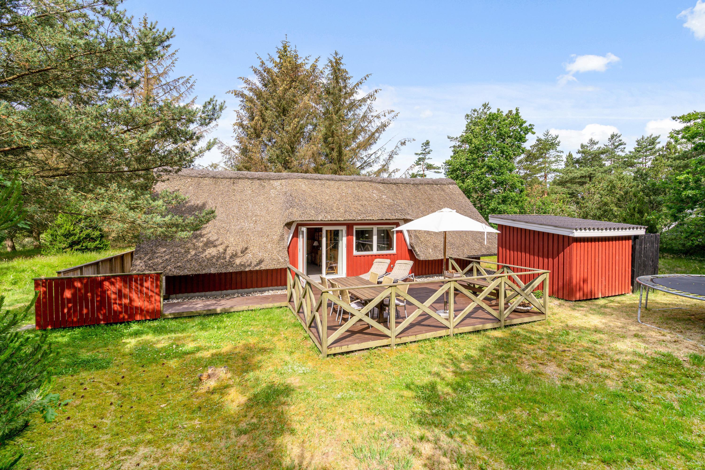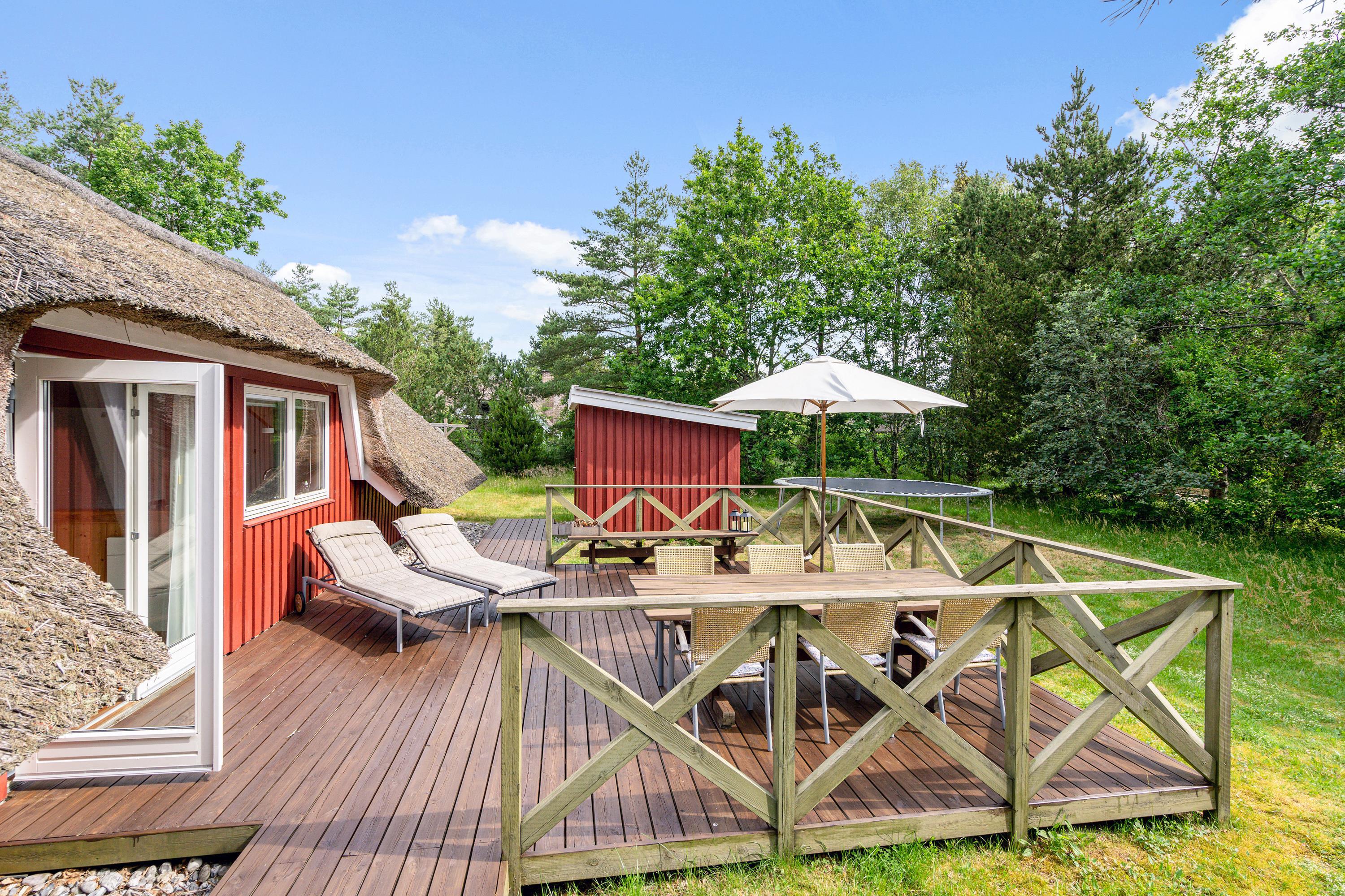 True holiday home atmosphere - this wonderfully cosy holiday cottage sits on a beautiful natural plot sheltered by trees, perfect for those seeking relaxation in picturesque surroundings. This charming thatched cottage, accommodating 4 people, features beautiful terraces, an outdoor shower, a trampoline and energy-efficient heating - making it ideal for family enjoyment both indoors and out. The highlight is the wood-fired hot tub, where you can unwind in warm water under the open sky.