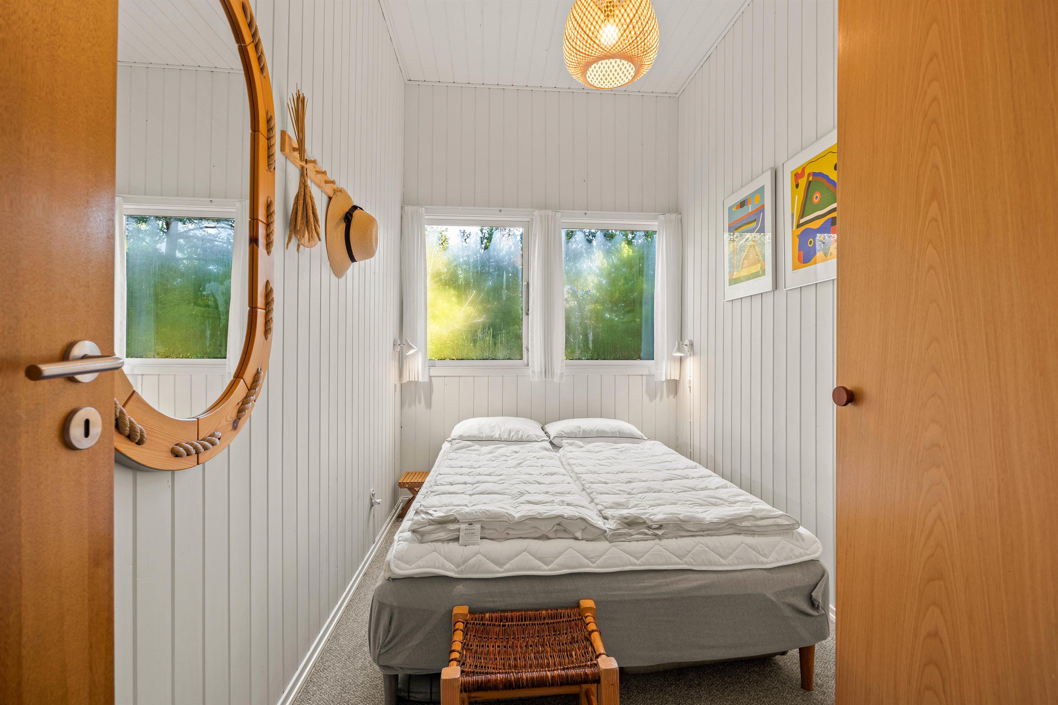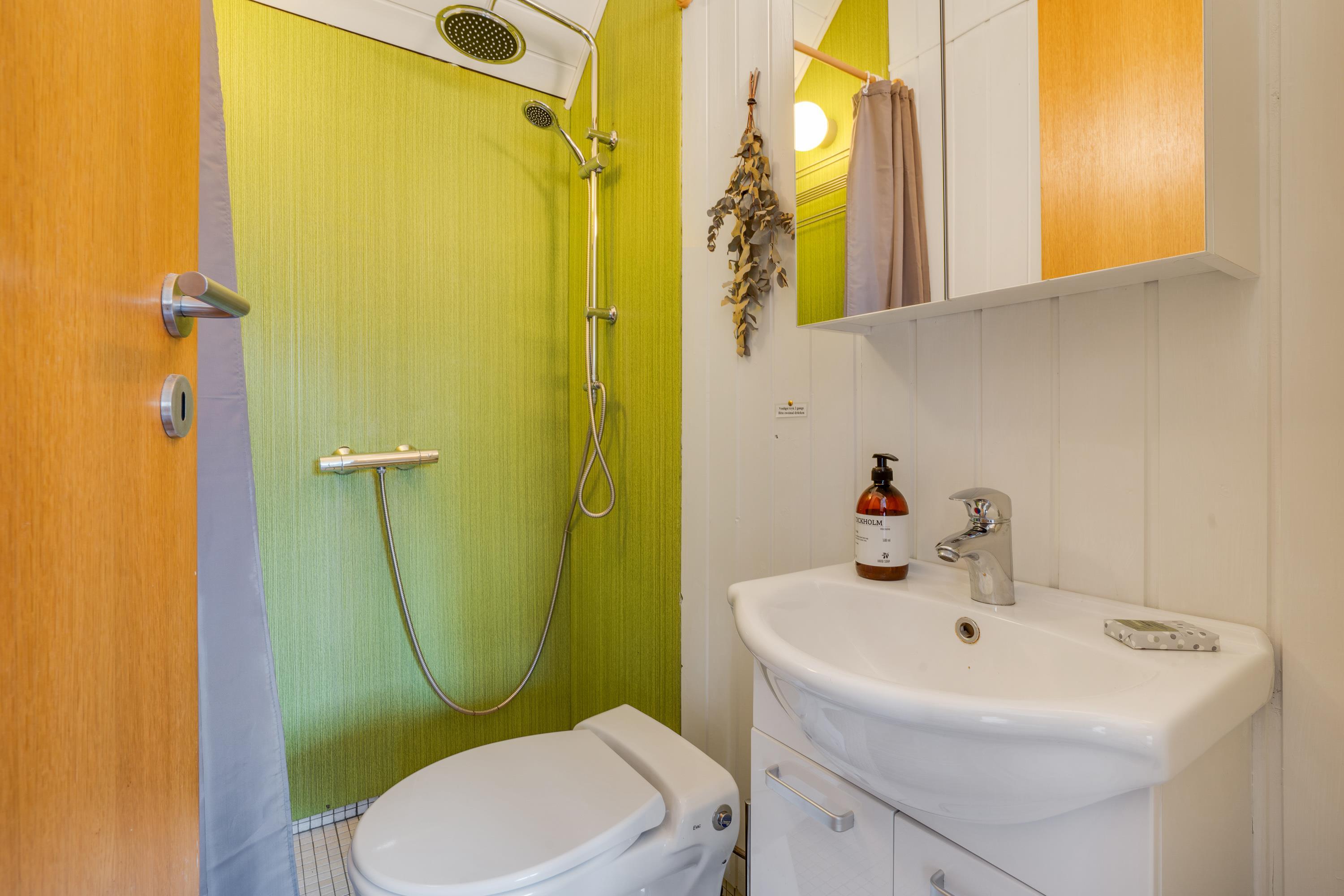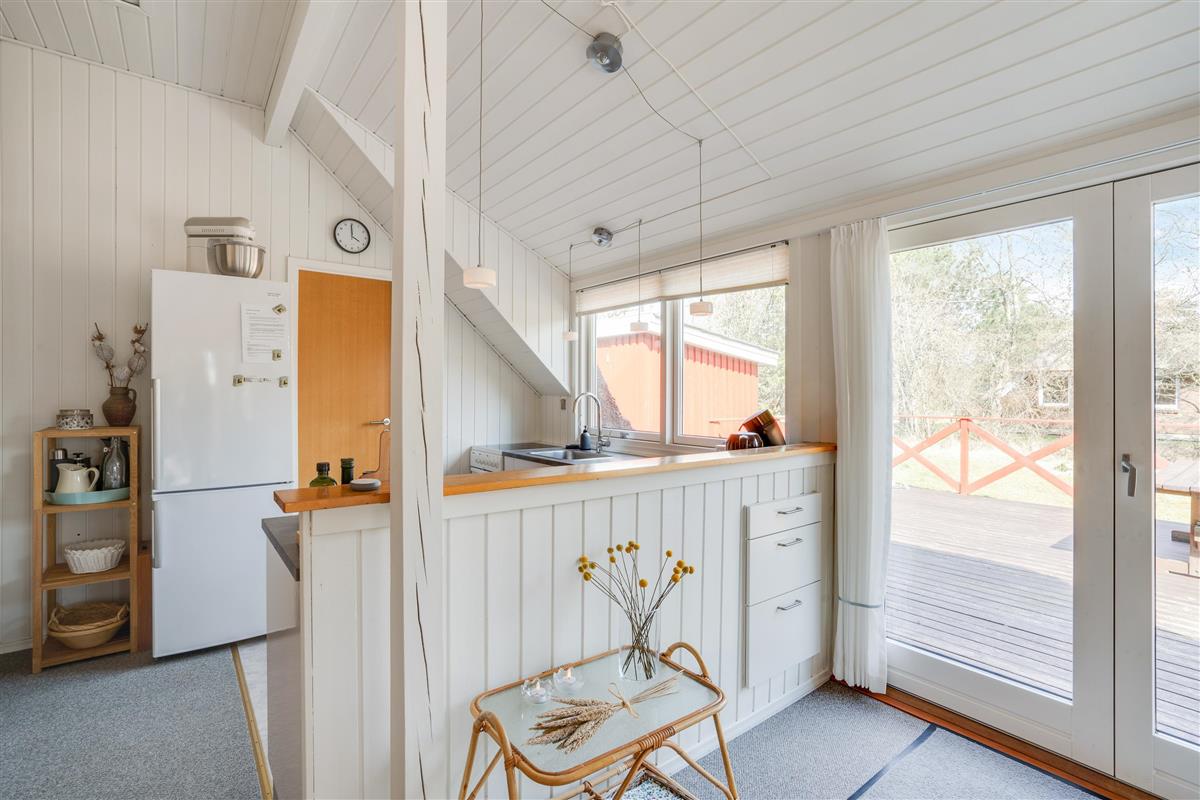 Rustic wooden features and a welcoming white kitchen with dishwasher create a delightfully cosy atmosphere in this small red cottage. Here you'll find everything needed for a relaxing holiday with your small family: 2 bedrooms - one with a small double bed (4ft 6in) and another with 2 single beds - bathroom with shower, and a lovely living room with dining area and sofa corner. The kitchen offers lovely views over the grounds, allowing you to watch the children playing on the trampoline or running about on the lawn.