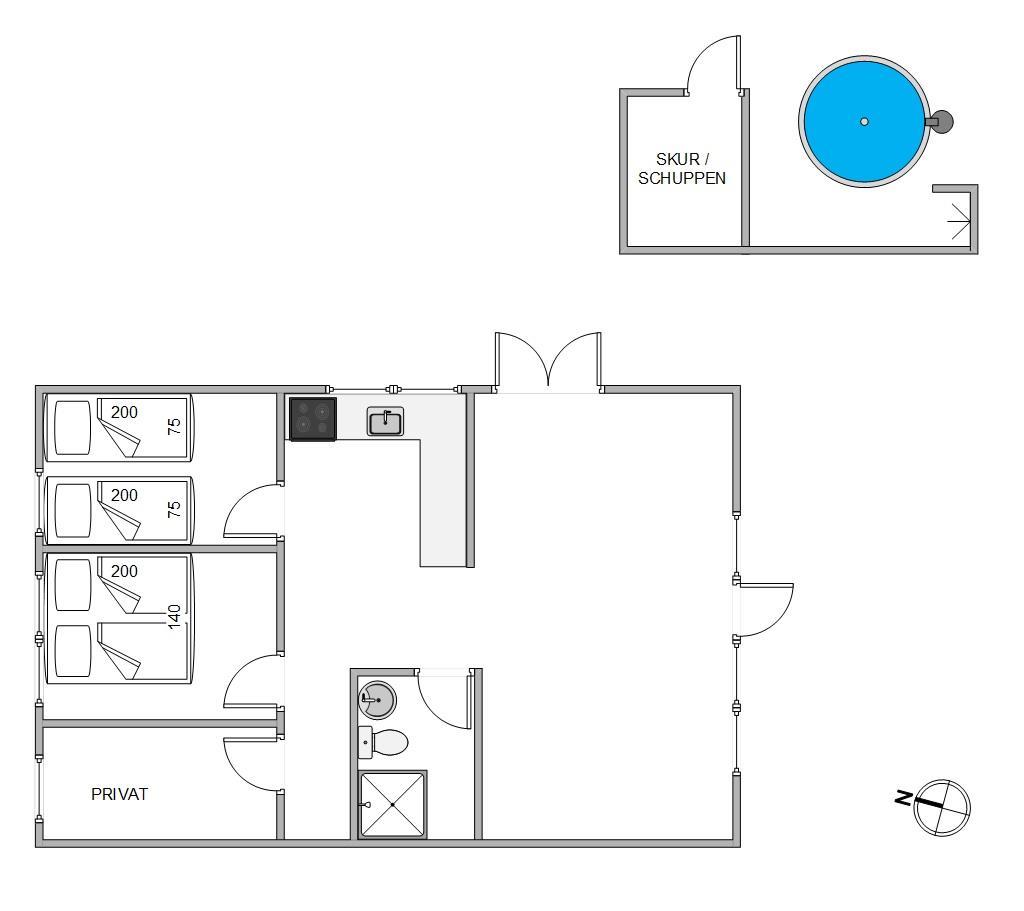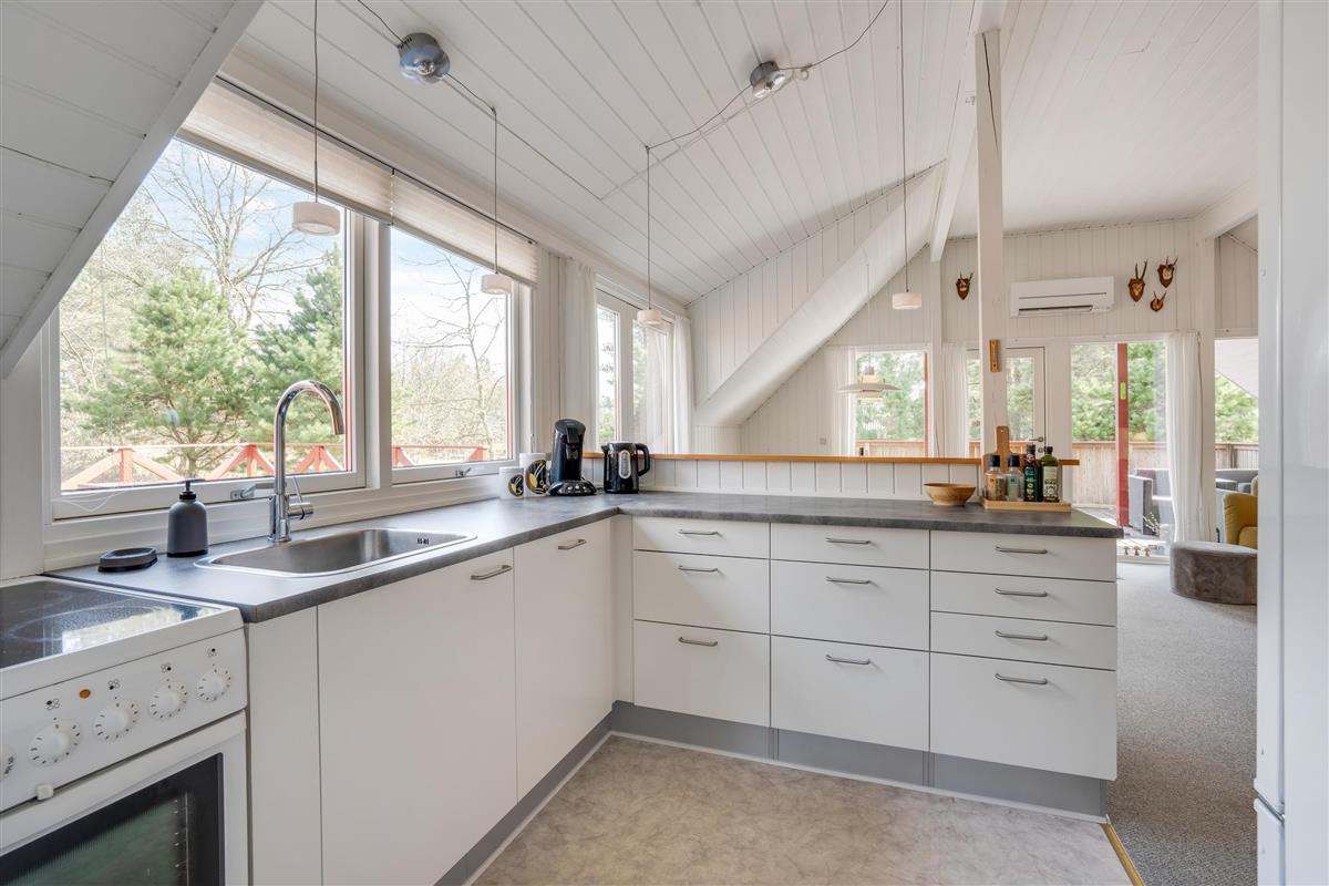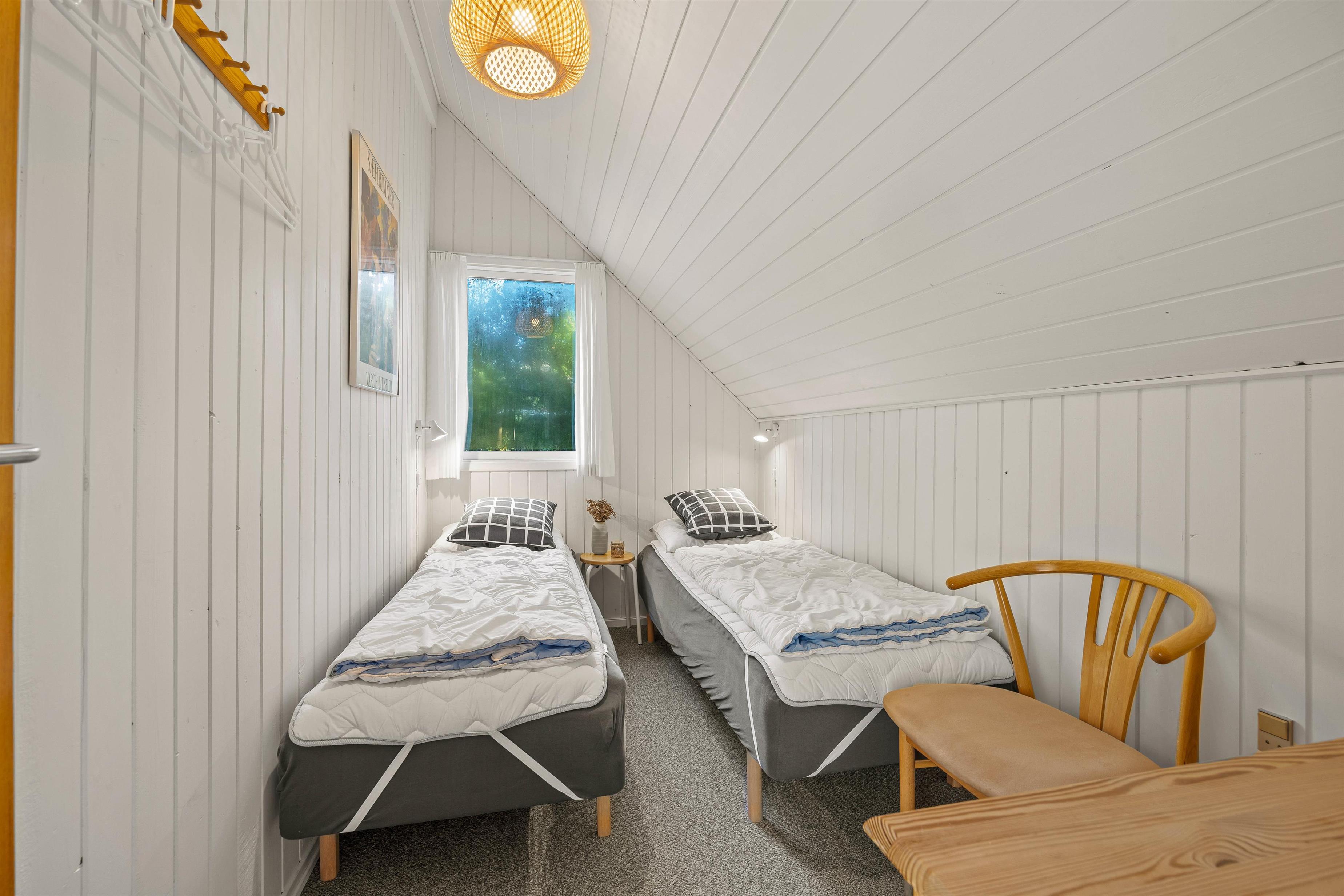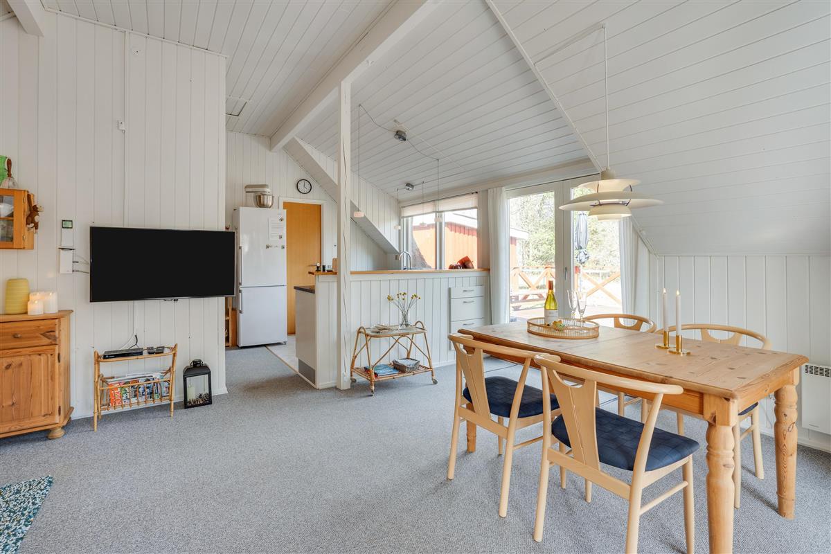 Rustic wooden features and a welcoming white kitchen with dishwasher create a delightfully cosy atmosphere in this small red cottage. Here you'll find everything needed for a relaxing holiday with your small family: 2 bedrooms - one with a small double bed (4ft 6in) and another with 2 single beds - bathroom with shower, and a lovely living room with dining area and sofa corner. The kitchen offers lovely views over the grounds, allowing you to watch the children playing on the trampoline or running about on the lawn.