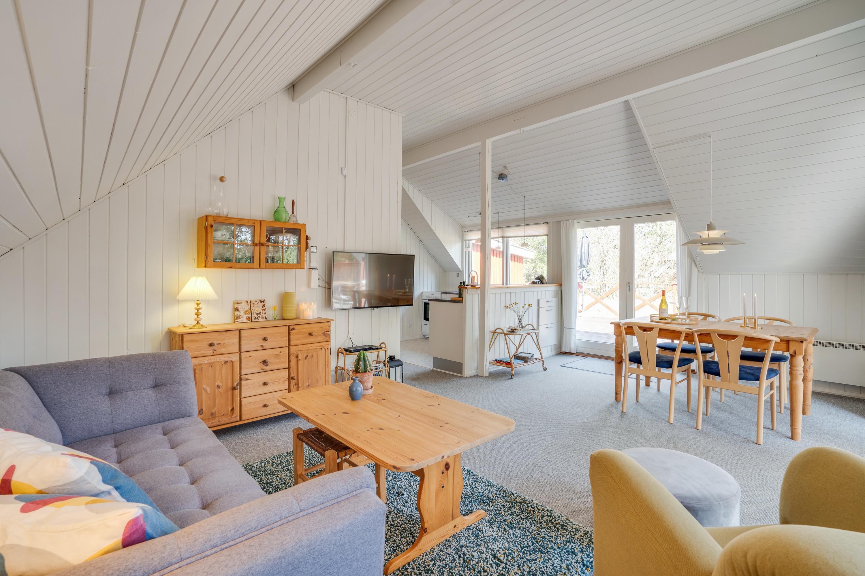 The living room provides direct access to the cottage's beautiful terraces. One side features a partially covered and sheltered terrace, allowing outdoor enjoyment nearly year-round. As the sun moves around the house, you can follow it by moving the sun loungers to the large open terrace. A barbecue is also provided for preparing delicious evening meals.