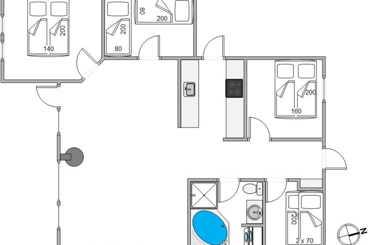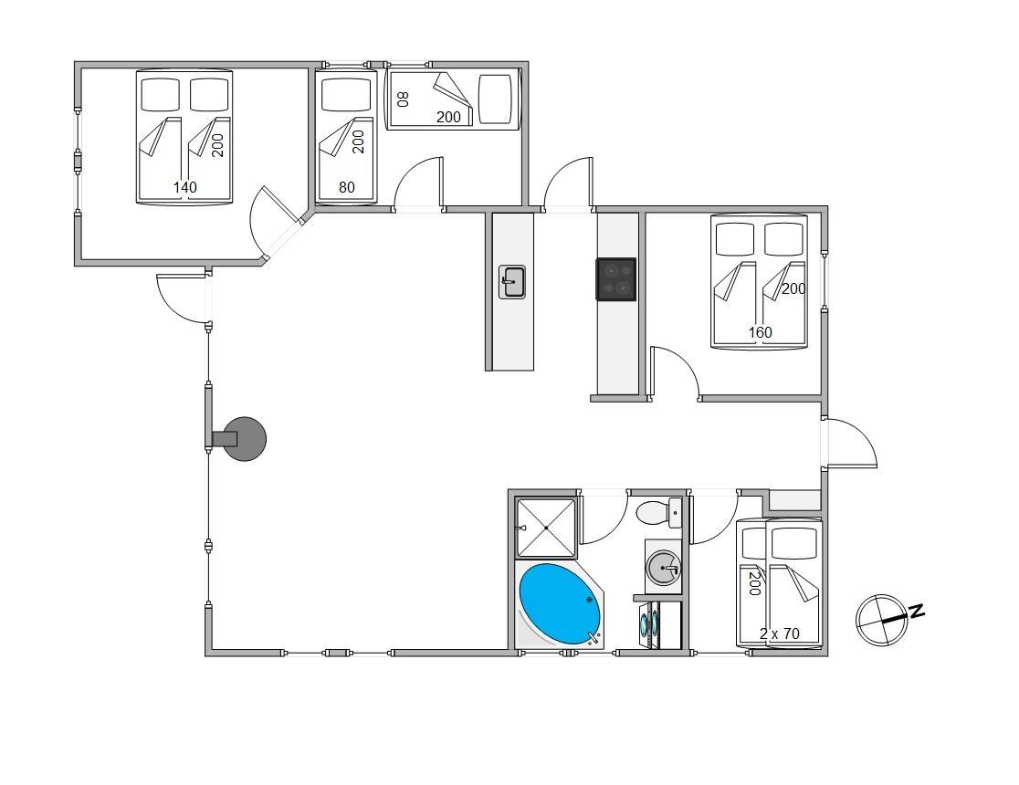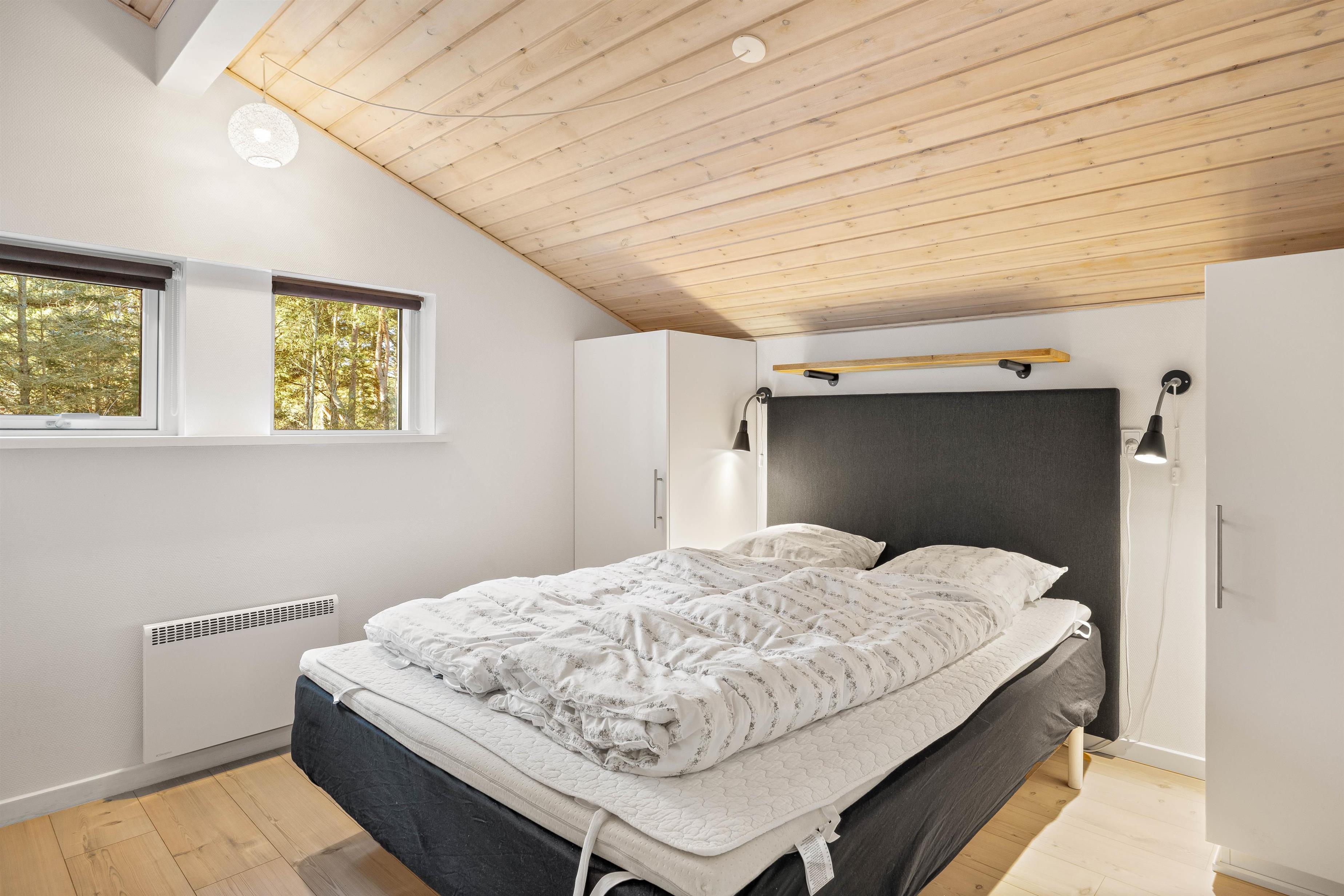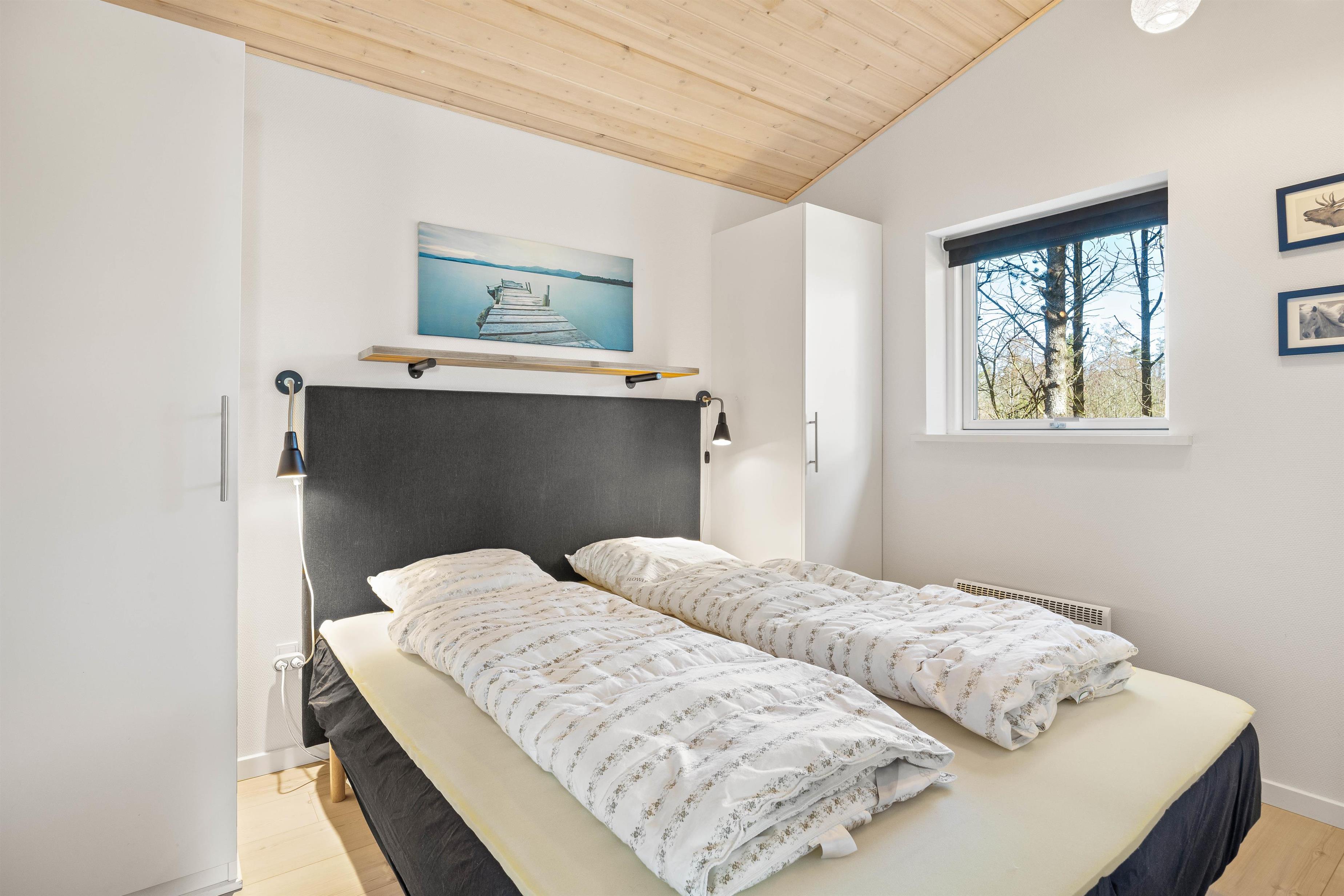 The holiday home features 4 bedrooms. The sleeping arrangements include 2 double beds, 2 single beds, and 1 bunk bed, offering plenty of space and flexibility for up to 8 people. Each room provides a peaceful retreat for rest and relaxation. The bathroom is modern and features underfloor heating for added comfort. A particular highlight is the hot tub, perfect for unwinding and rejuvenating after a long day outdoors.