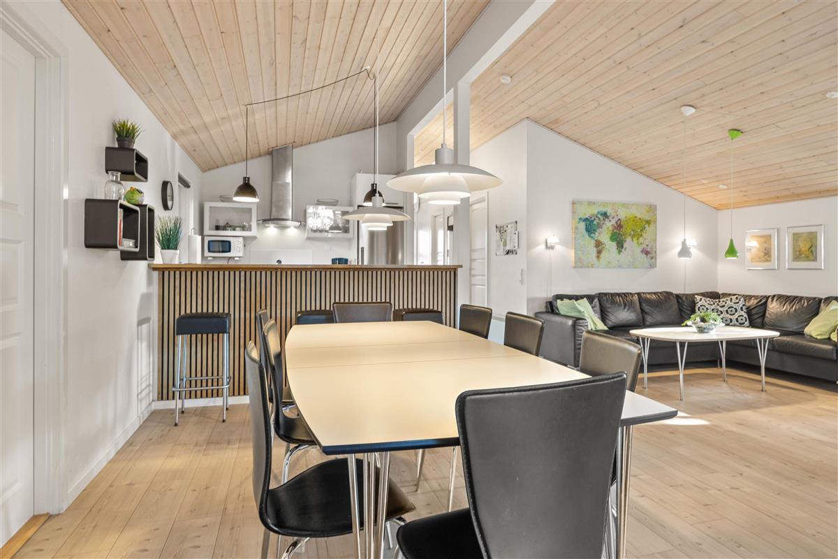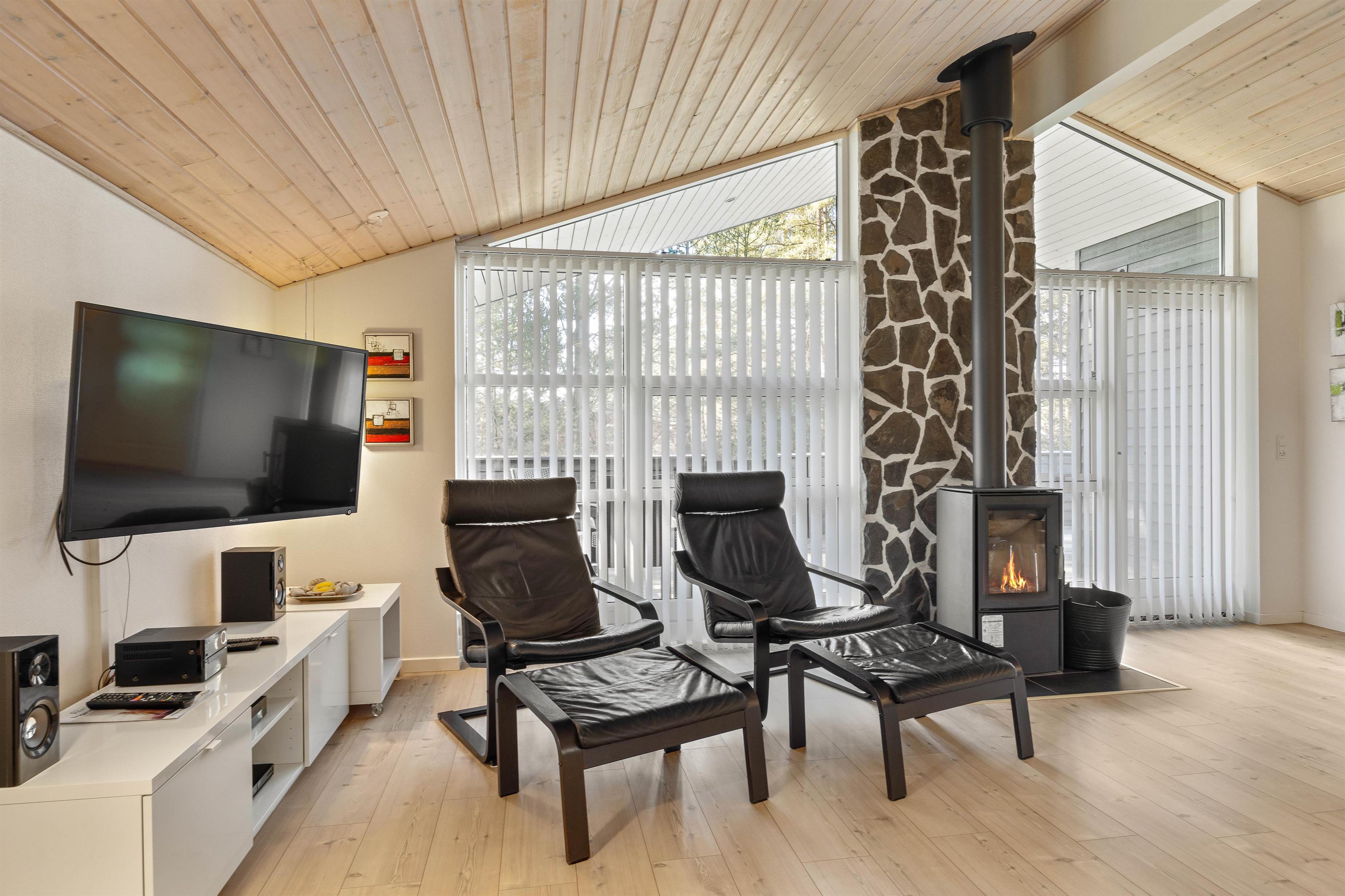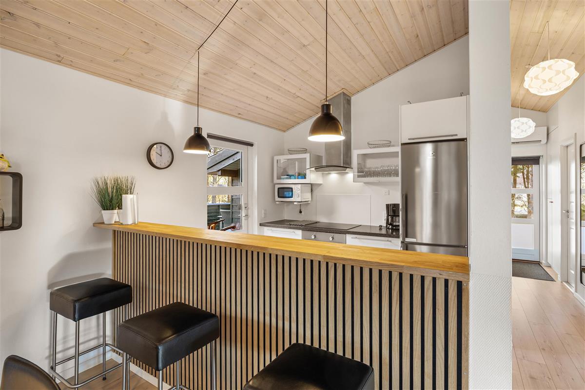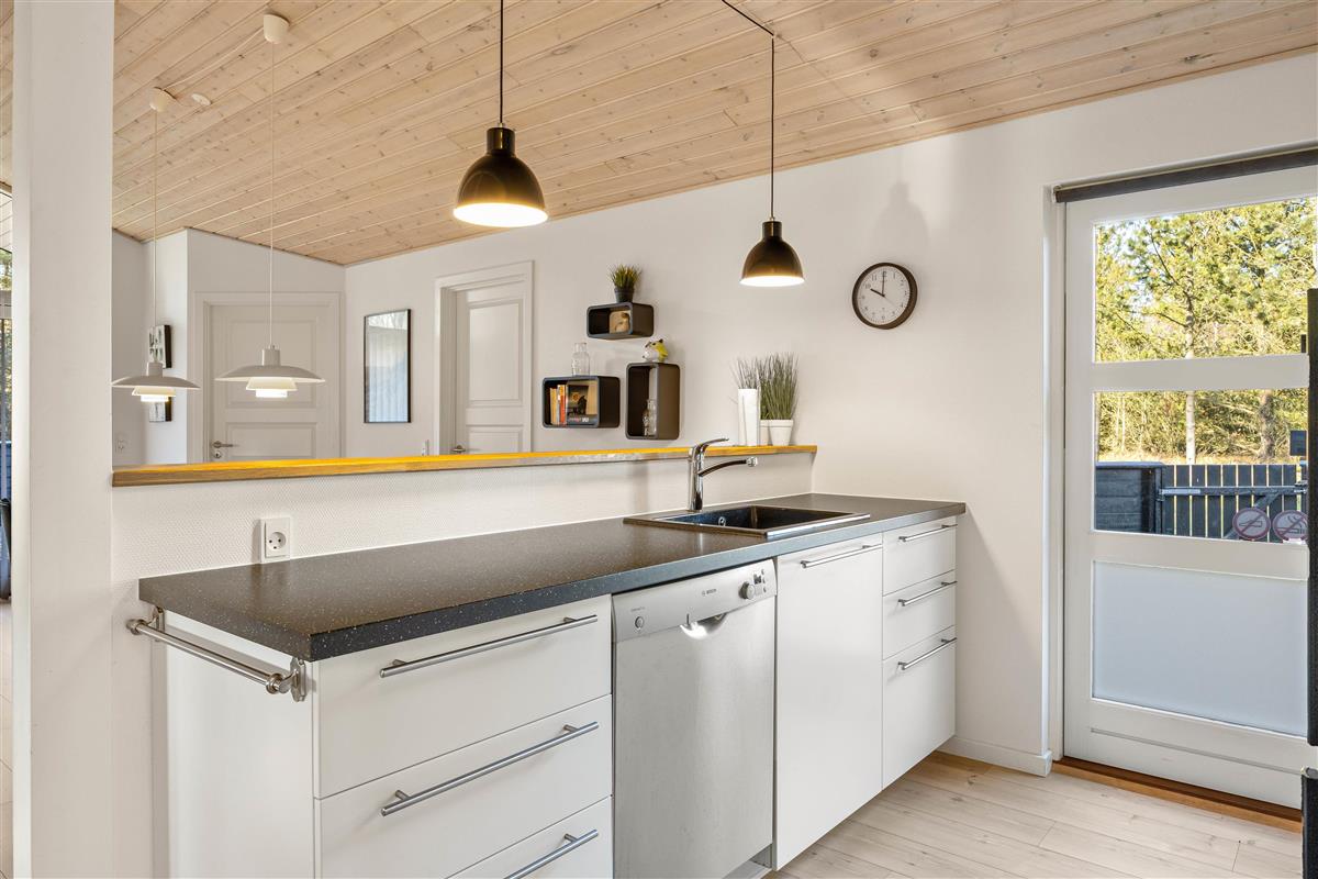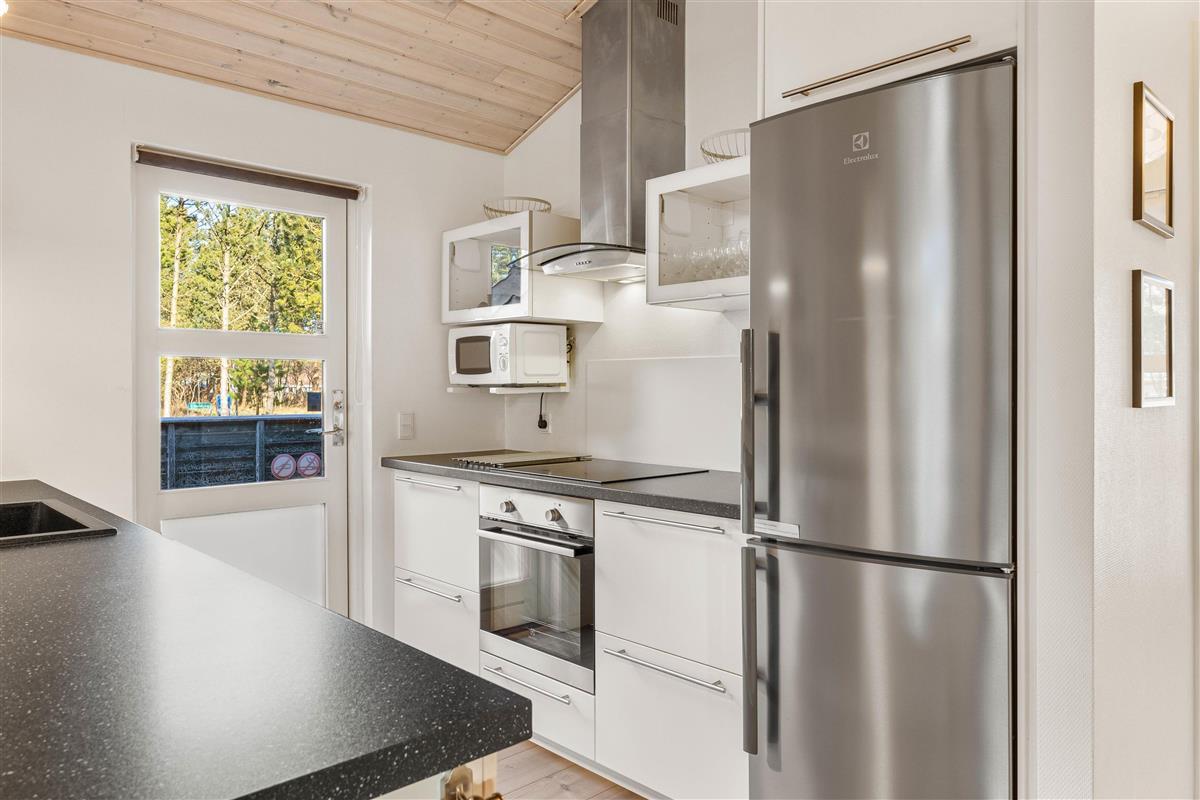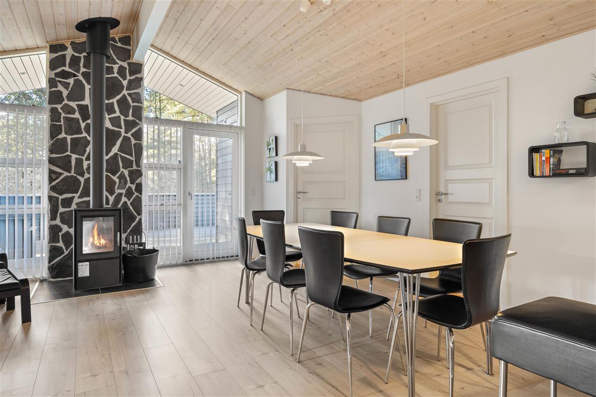 The living area is the heart of the holiday home, characterised by a cosy atmosphere enhanced by the crackling wood-burning stove. Here you can unwind after an eventful day, play games together, or simply enjoy the peace and quiet. Thanks to the generous windows, the room is flooded with natural light and offers wonderful views of the surrounding landscape. The modern, well-equipped kitchen leaves nothing to be desired. It comes with all necessary appliances, including a dishwasher, providing all the home comforts you need. The kitchen opens onto a dining area, perfect for sociable cooking and dining.