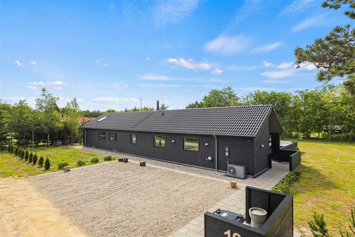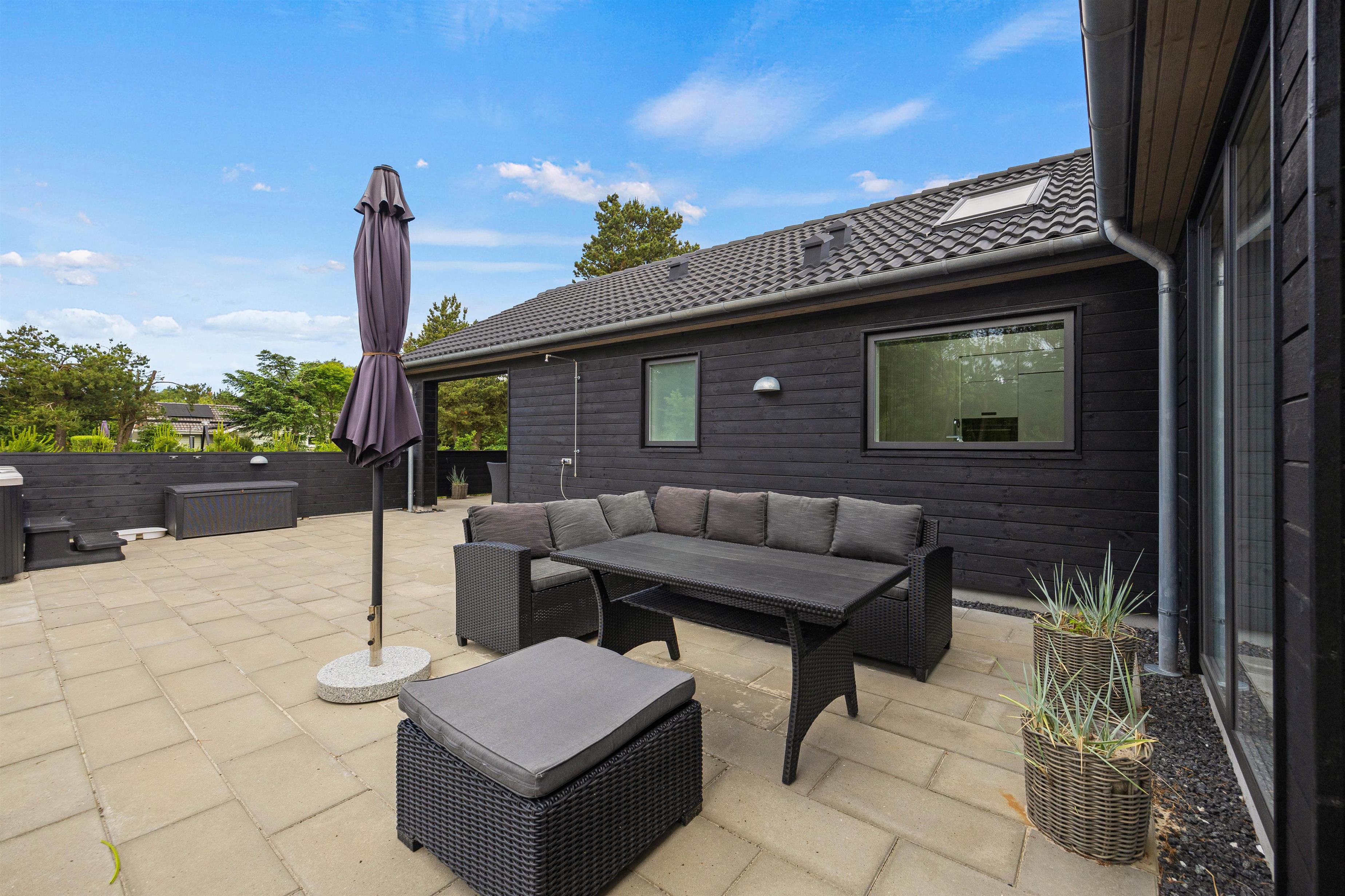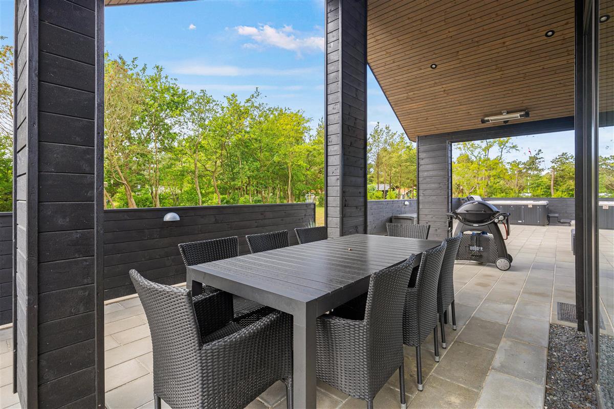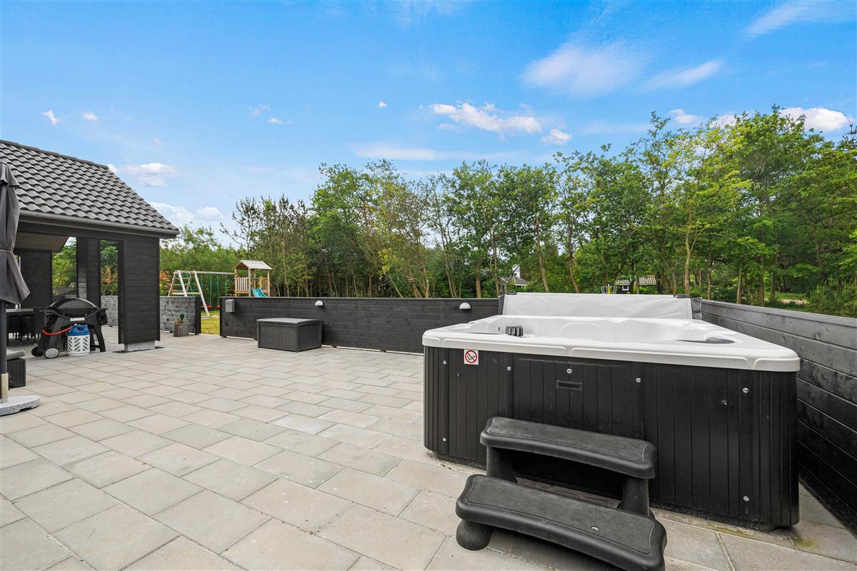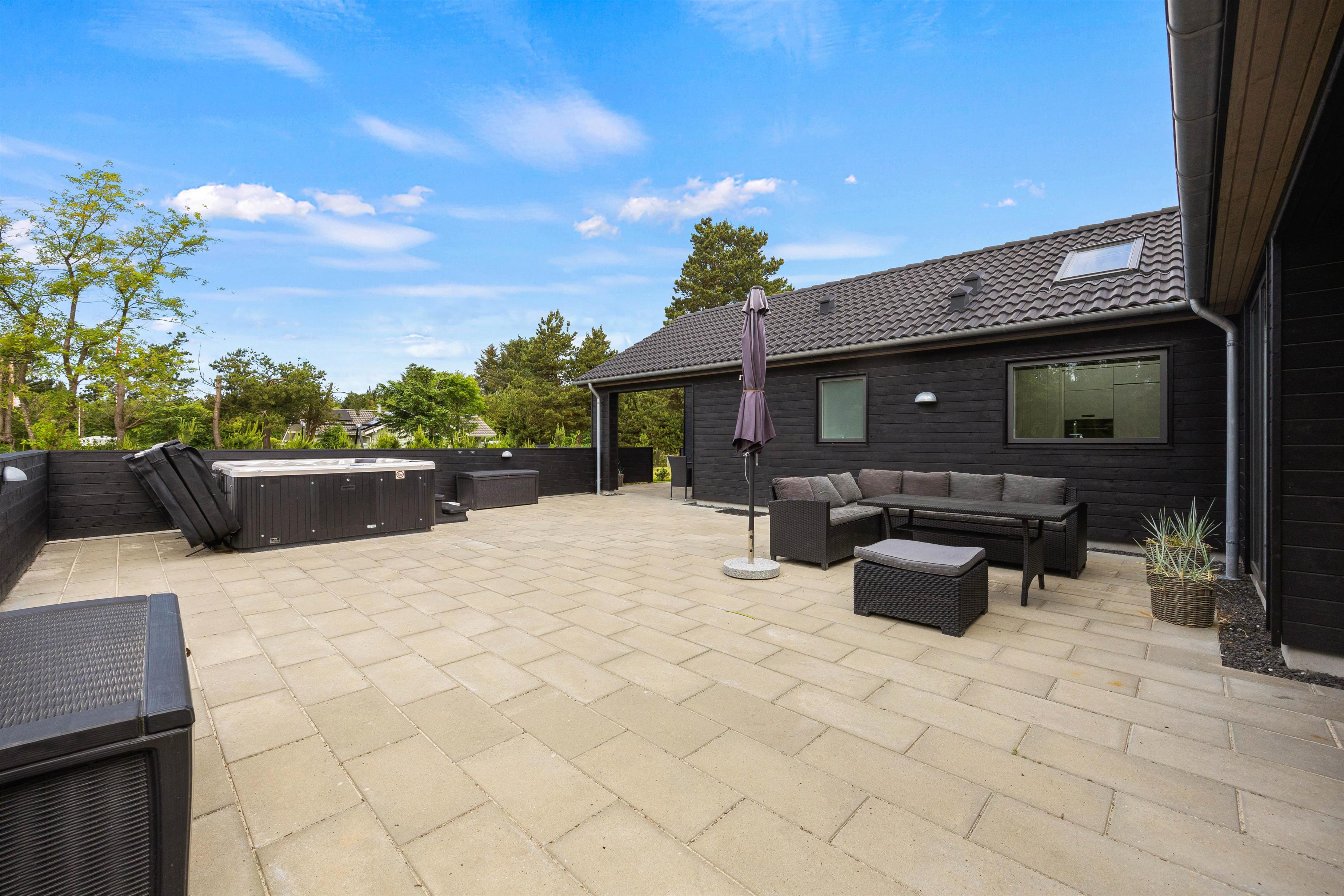 Large terrace with outdoor hot tub and shower at Skovvang 19