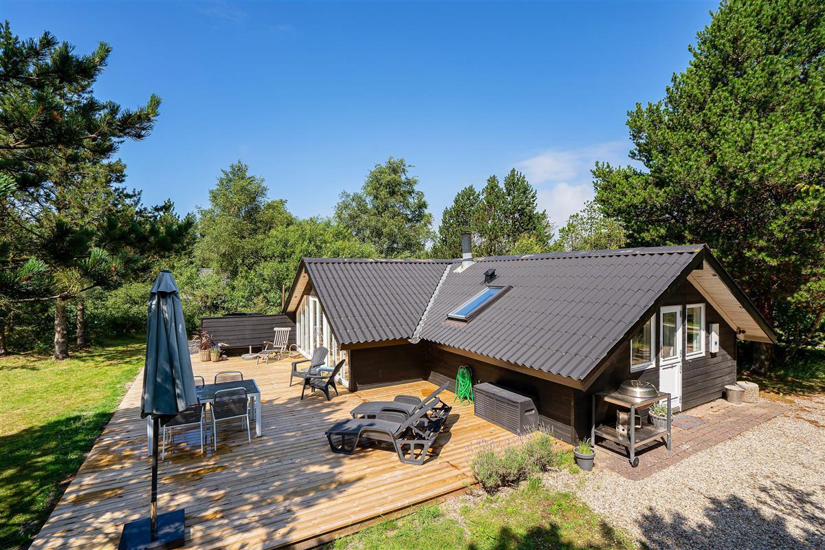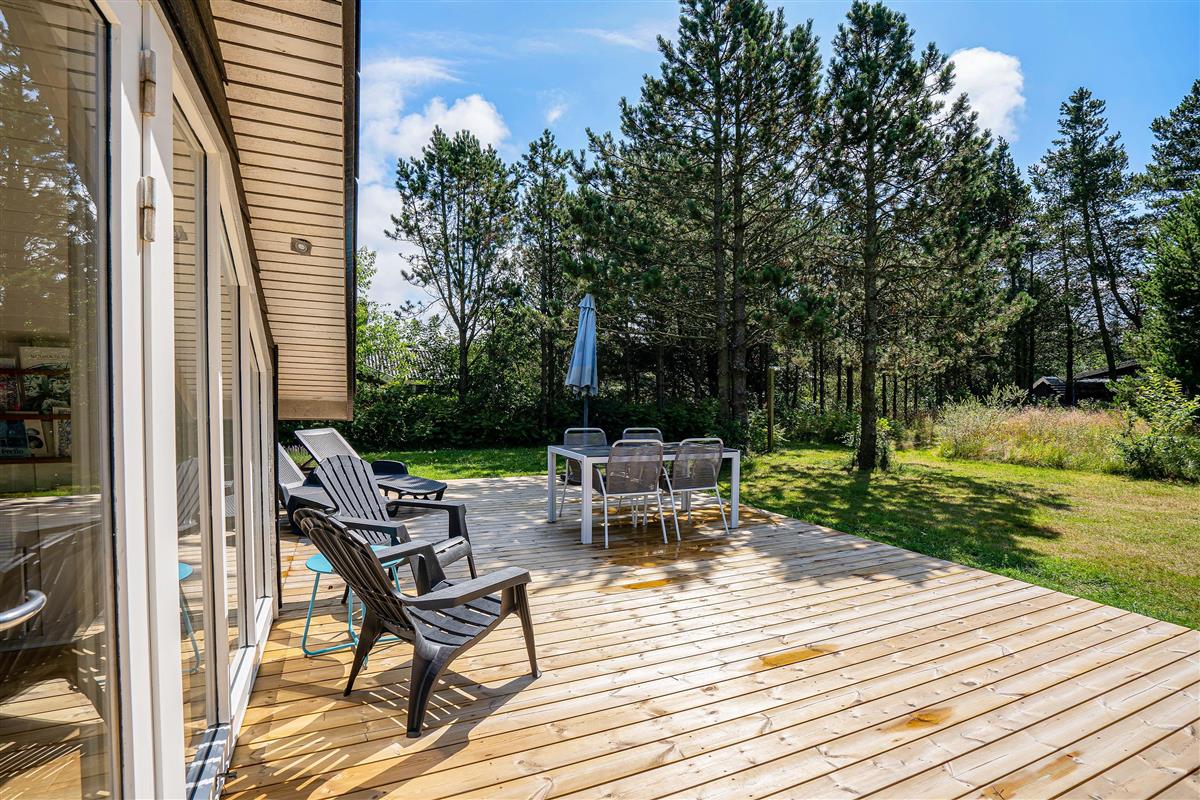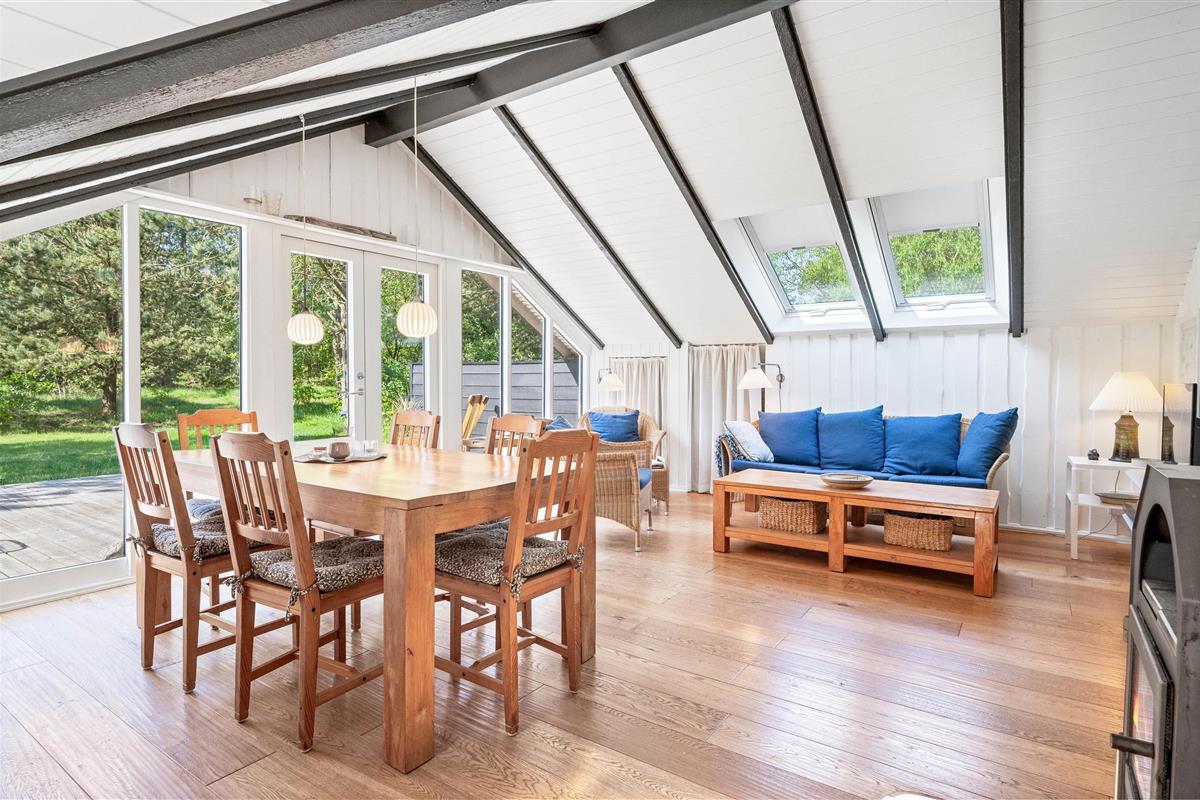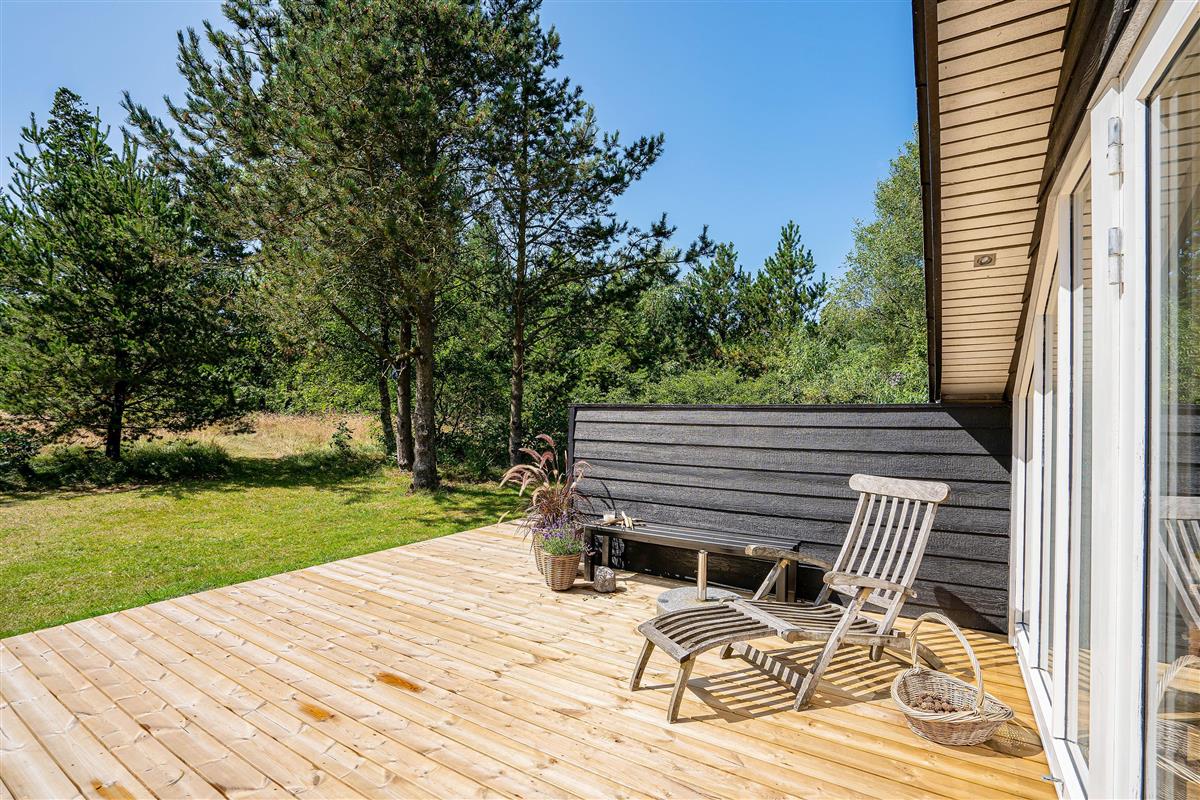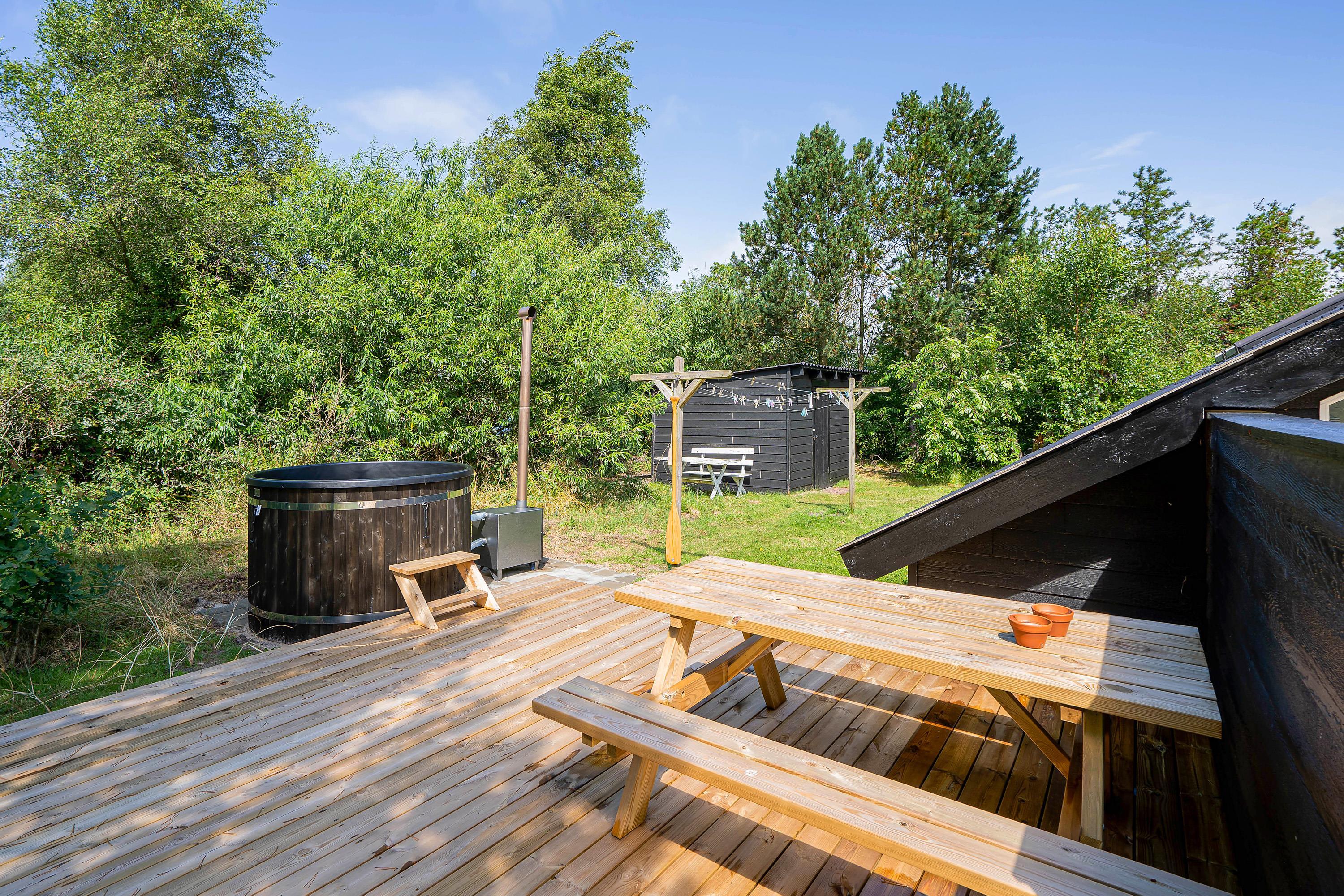 On this beautiful home's splendid terrace, you can fully enjoy the Danish summer. Relax on one of the comfortable sun loungers or listen to birdsong in the surrounding trees from any of the many cosy seating areas. The tall trees surrounding the beautiful meadow plot provide privacy and shelter from the sometimes harsh westerly winds. The highlight is undoubtedly the wood-fired hot tub, offering a delightful outdoor wellness experience!
