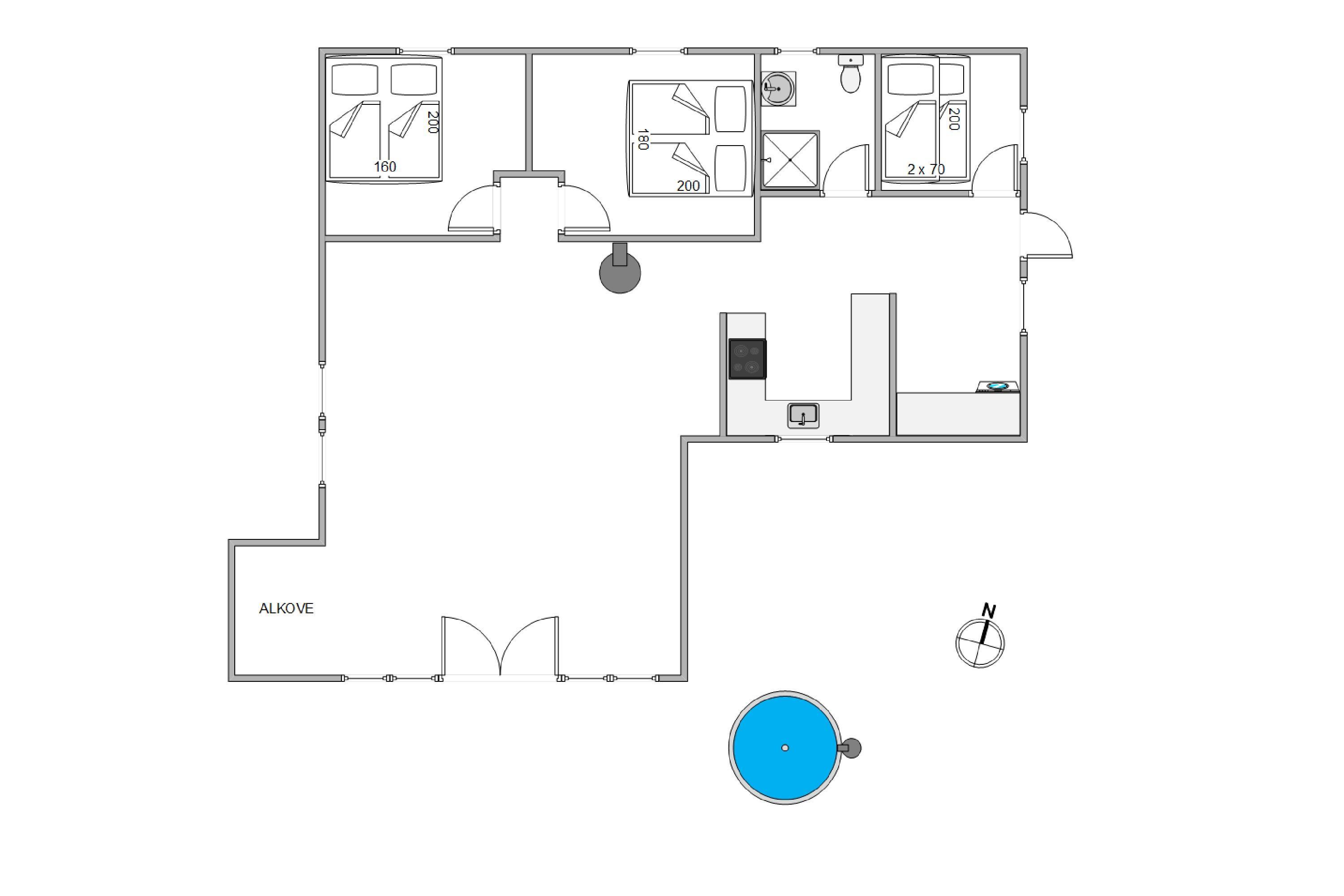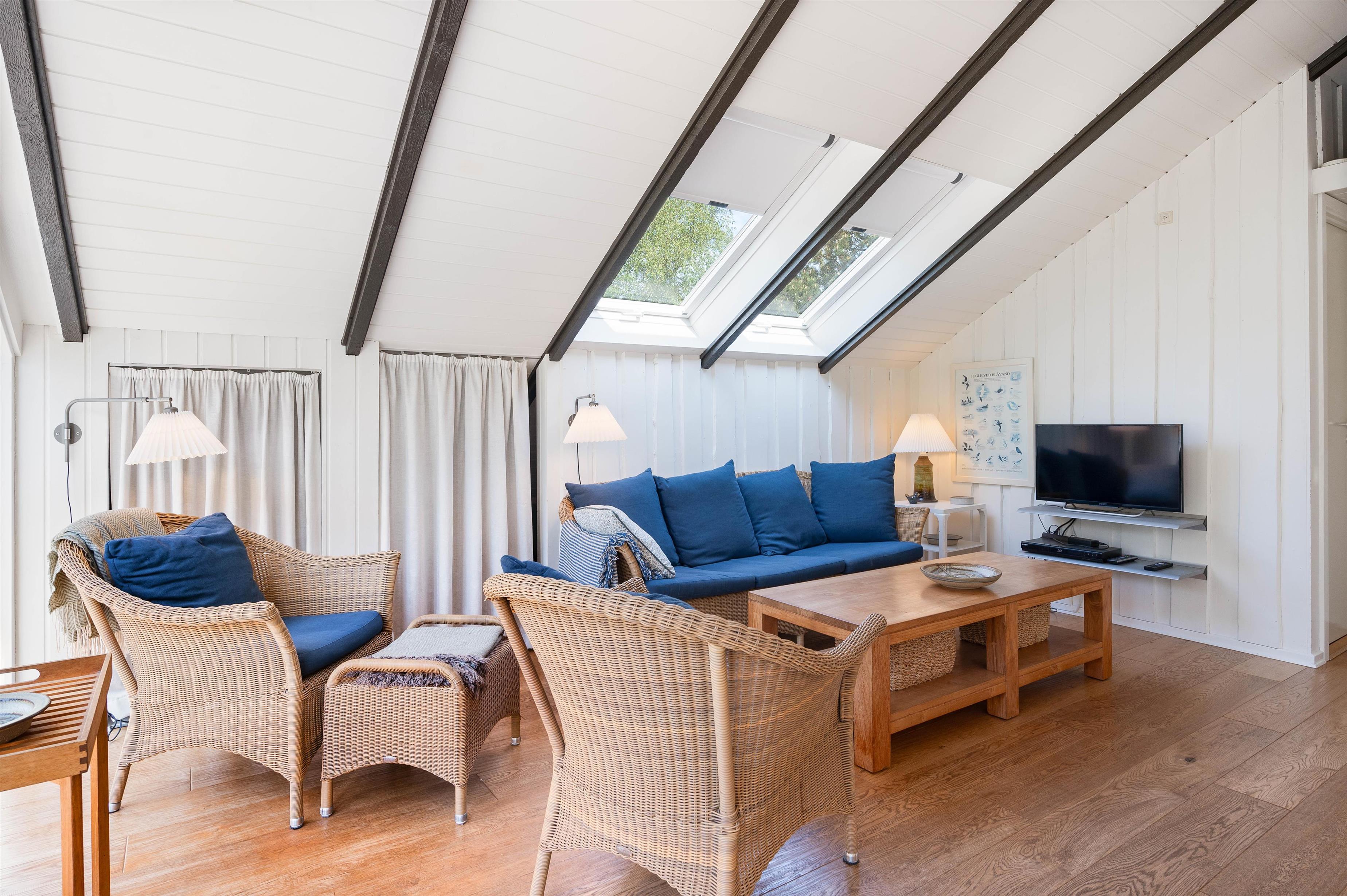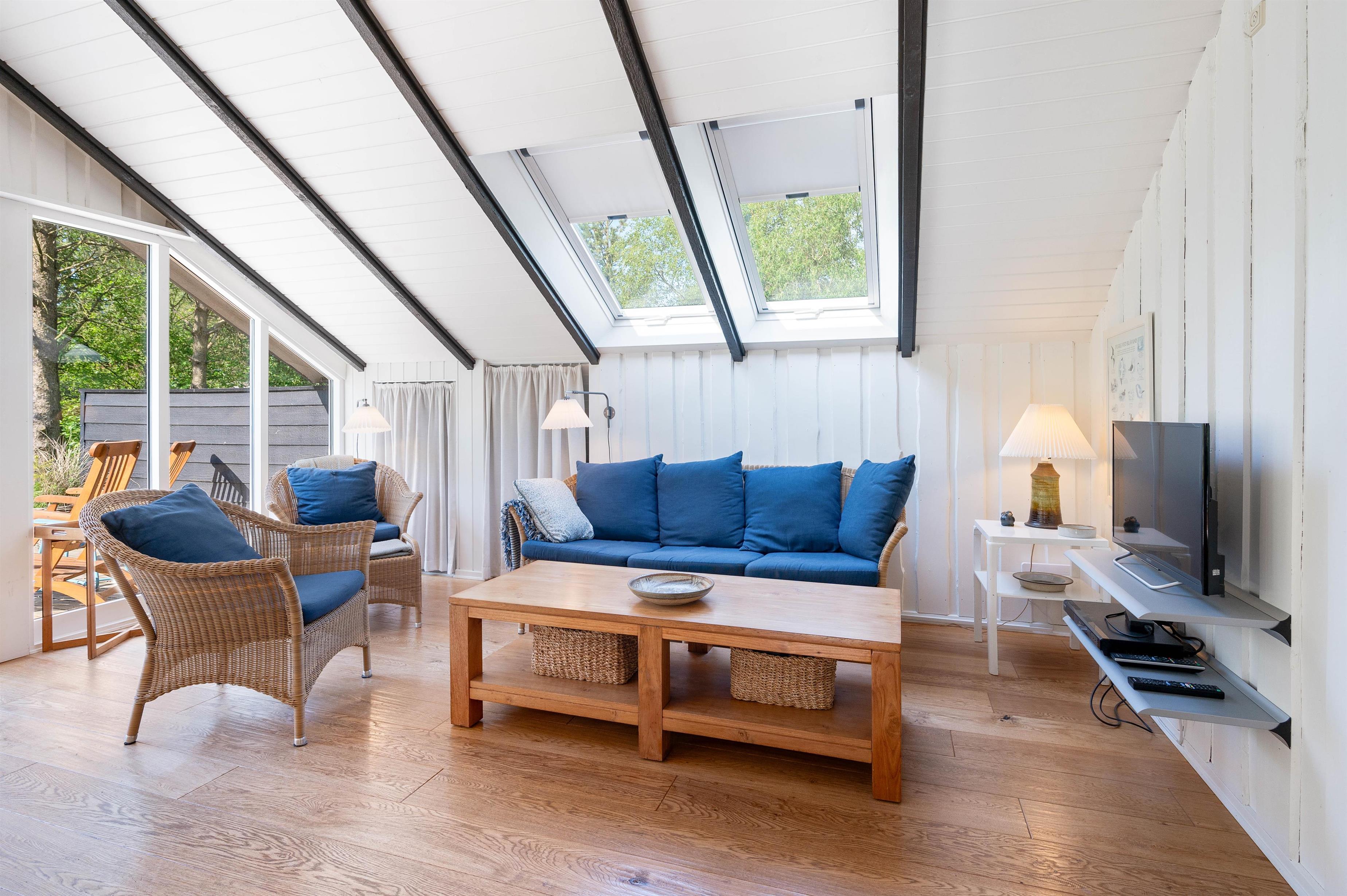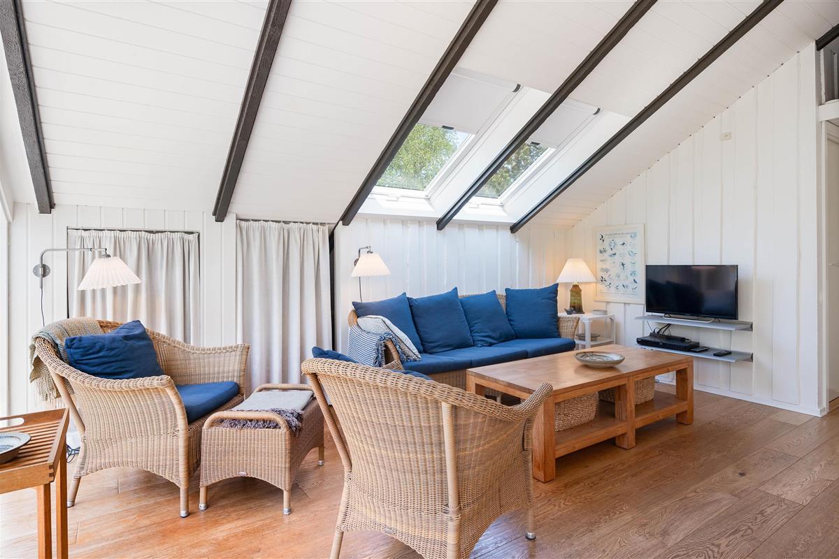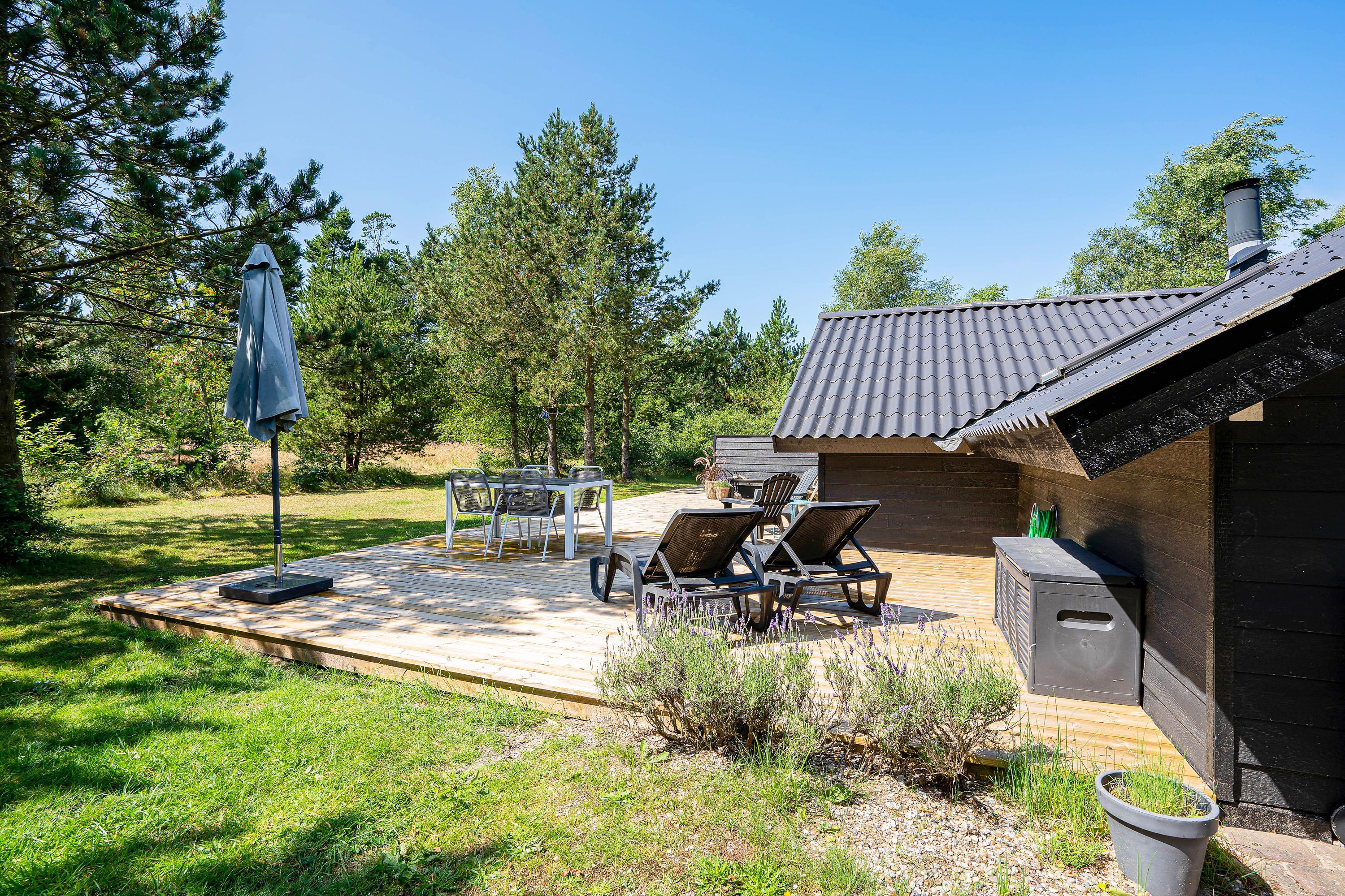 On this beautiful home's splendid terrace, you can fully enjoy the Danish summer. Relax on one of the comfortable sun loungers or listen to birdsong in the surrounding trees from any of the many cosy seating areas. The tall trees surrounding the beautiful meadow plot provide privacy and shelter from the sometimes harsh westerly winds. The highlight is undoubtedly the wood-fired hot tub, offering a delightful outdoor wellness experience!