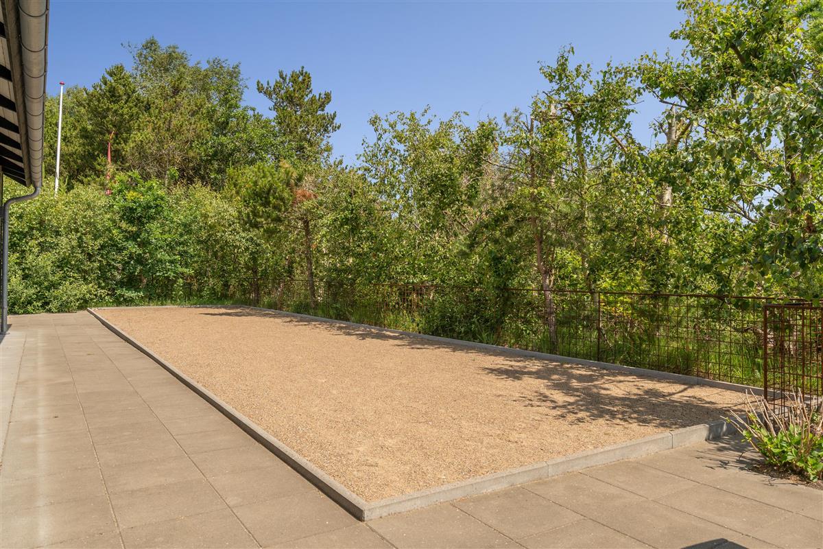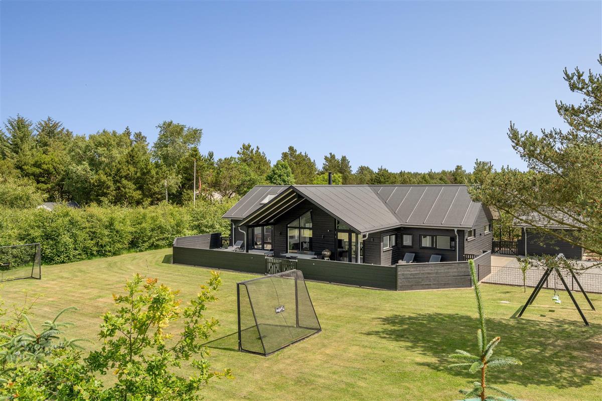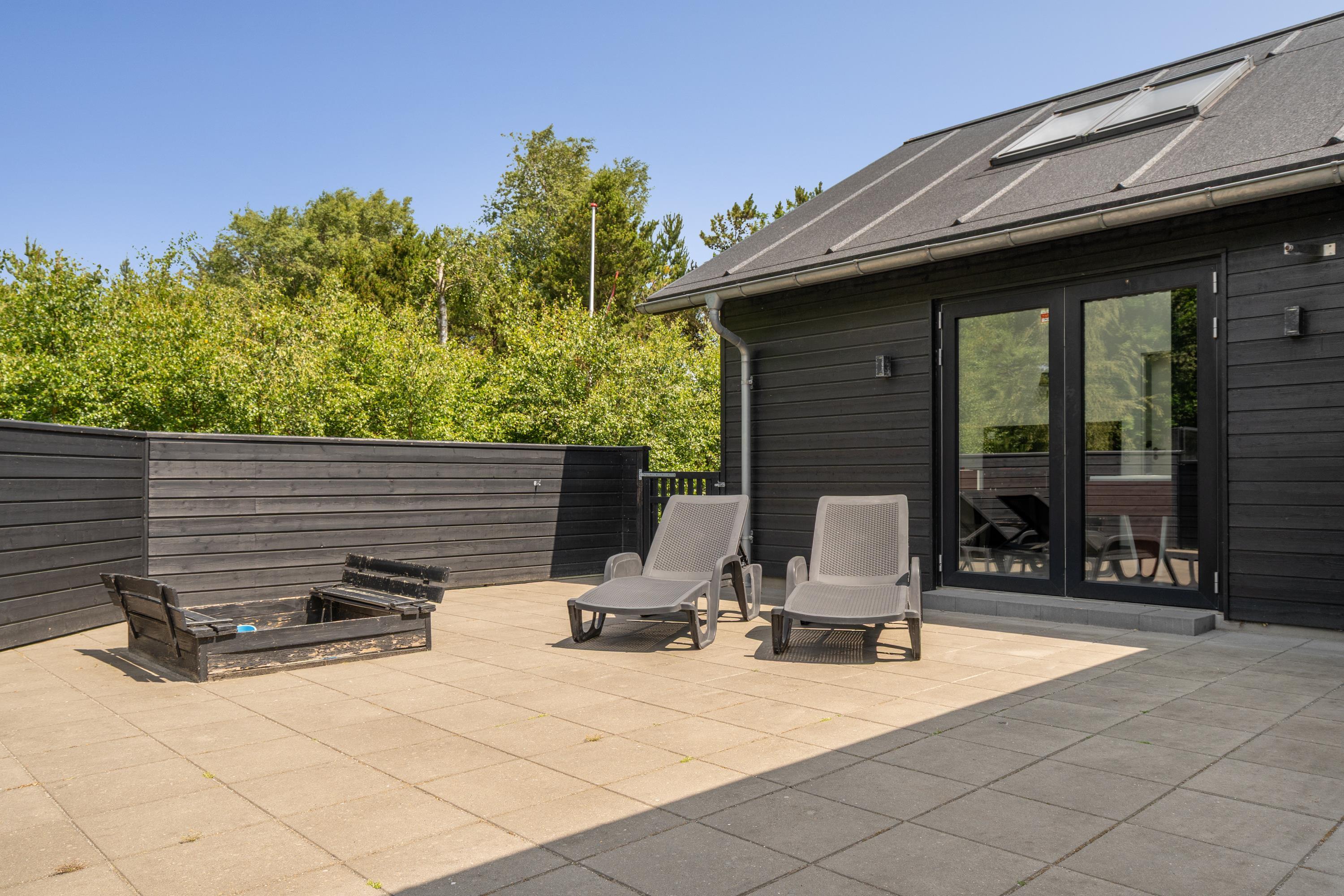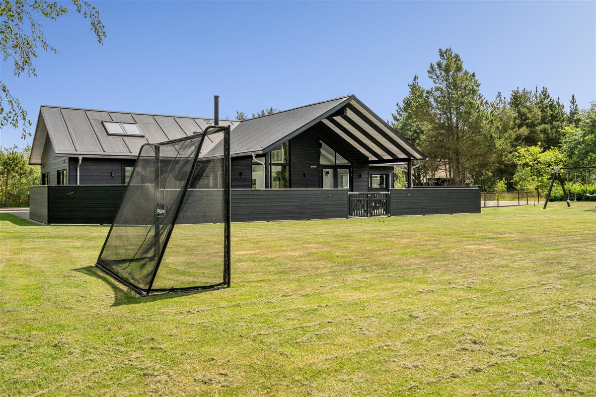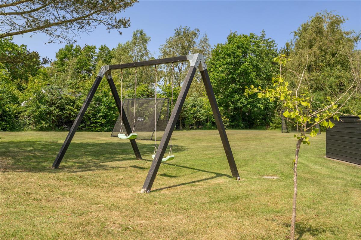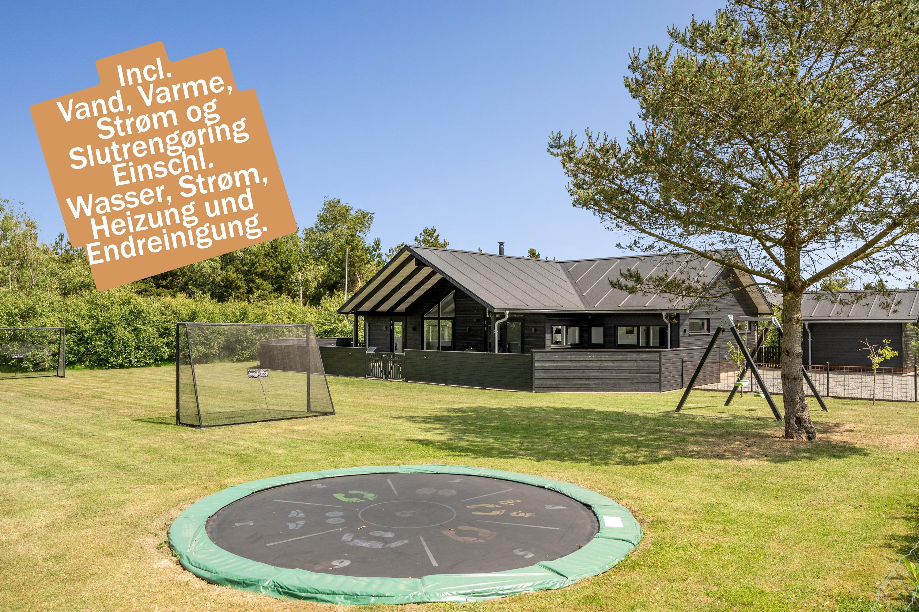 Die große eingezäunte Terrasse von etwa 70 m² hat drei Ausgänge, was es ermöglicht, Kinder und Hunde sicher zu halten. Ein Teil der Terrasse (ca. 20 m²) ist überdacht und trägt dazu bei, die Sommersaison zu verlängern. Auf dem schönen Grundstück gibt es ein Fußballtor, eine Sandkiste, eine Petanque-Bahn, Schaukeln und ein Trampolin, die zum Spielen und Aktivsein einladen. Das Haus wird ausschließlich an Familien und nicht an Gruppen vermietet. Es gibt auch einen separaten und abschließbaren Schuppen für die Mieter mit einem zusätzlichen Kühlschrank. Dieses Haus ist wirklich durchdacht! Freier Eintritt zum Schwimm & Play. Kostenloser Zugang zum Golf in Outrup sowie Speedwayrennen ebenfalls in Outrup.