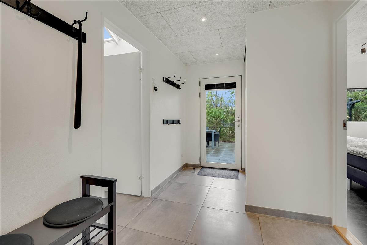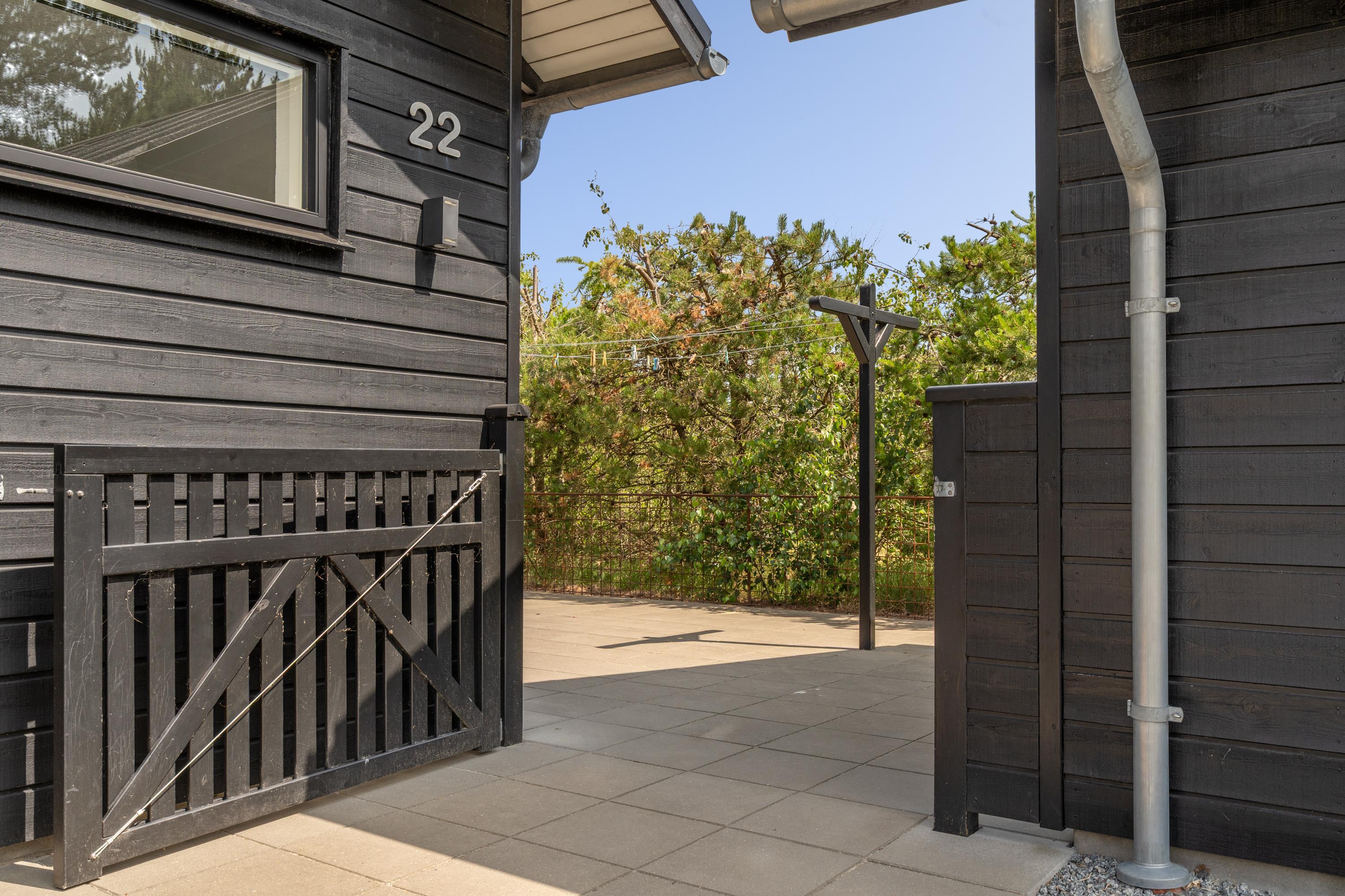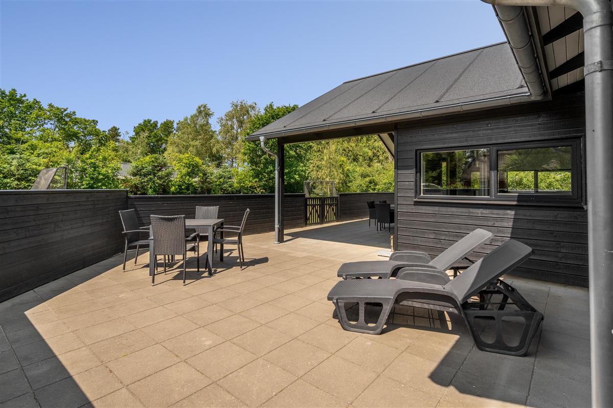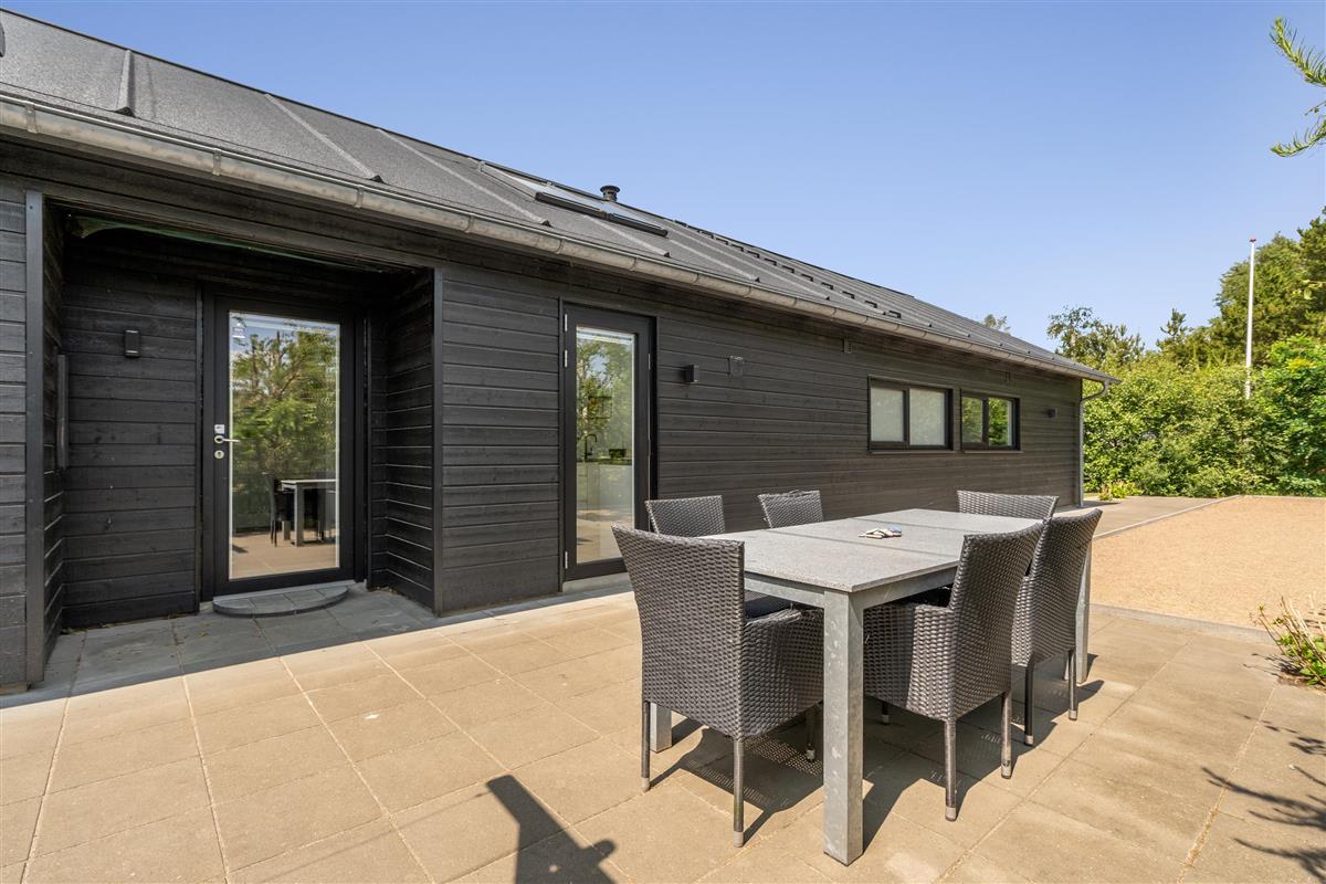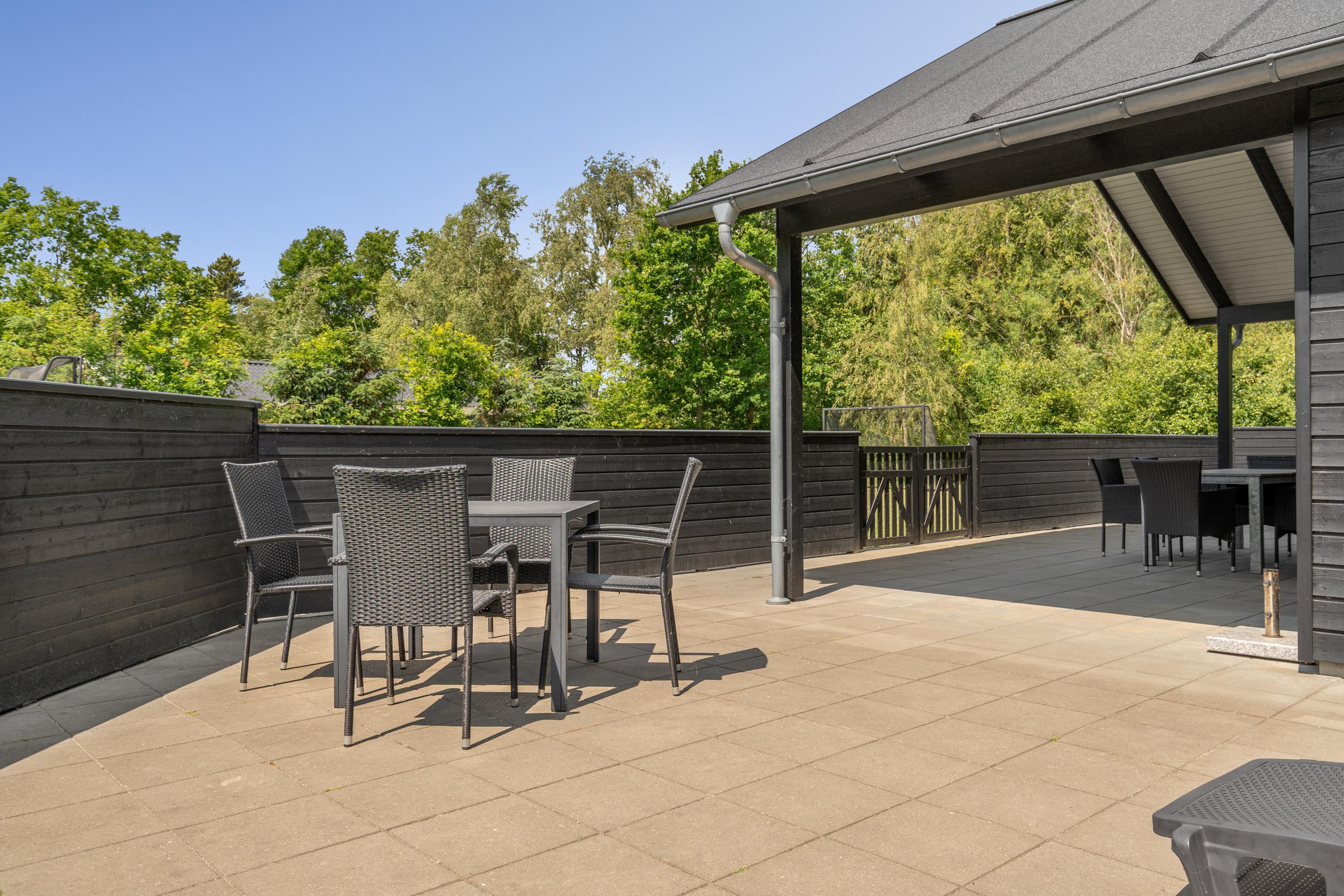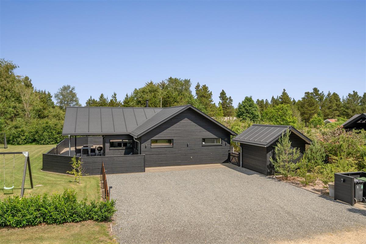 Die große eingezäunte Terrasse von etwa 70 m² hat drei Ausgänge, was es ermöglicht, Kinder und Hunde sicher zu halten. Ein Teil der Terrasse (ca. 20 m²) ist überdacht und trägt dazu bei, die Sommersaison zu verlängern. Auf dem schönen Grundstück gibt es ein Fußballtor, eine Sandkiste, eine Petanque-Bahn, Schaukeln und ein Trampolin, die zum Spielen und Aktivsein einladen. Das Haus wird ausschließlich an Familien und nicht an Gruppen vermietet. Es gibt auch einen separaten und abschließbaren Schuppen für die Mieter mit einem zusätzlichen Kühlschrank. Dieses Haus ist wirklich durchdacht! Freier Eintritt zum Schwimm & Play. Kostenloser Zugang zum Golf in Outrup sowie Speedwayrennen ebenfalls in Outrup.