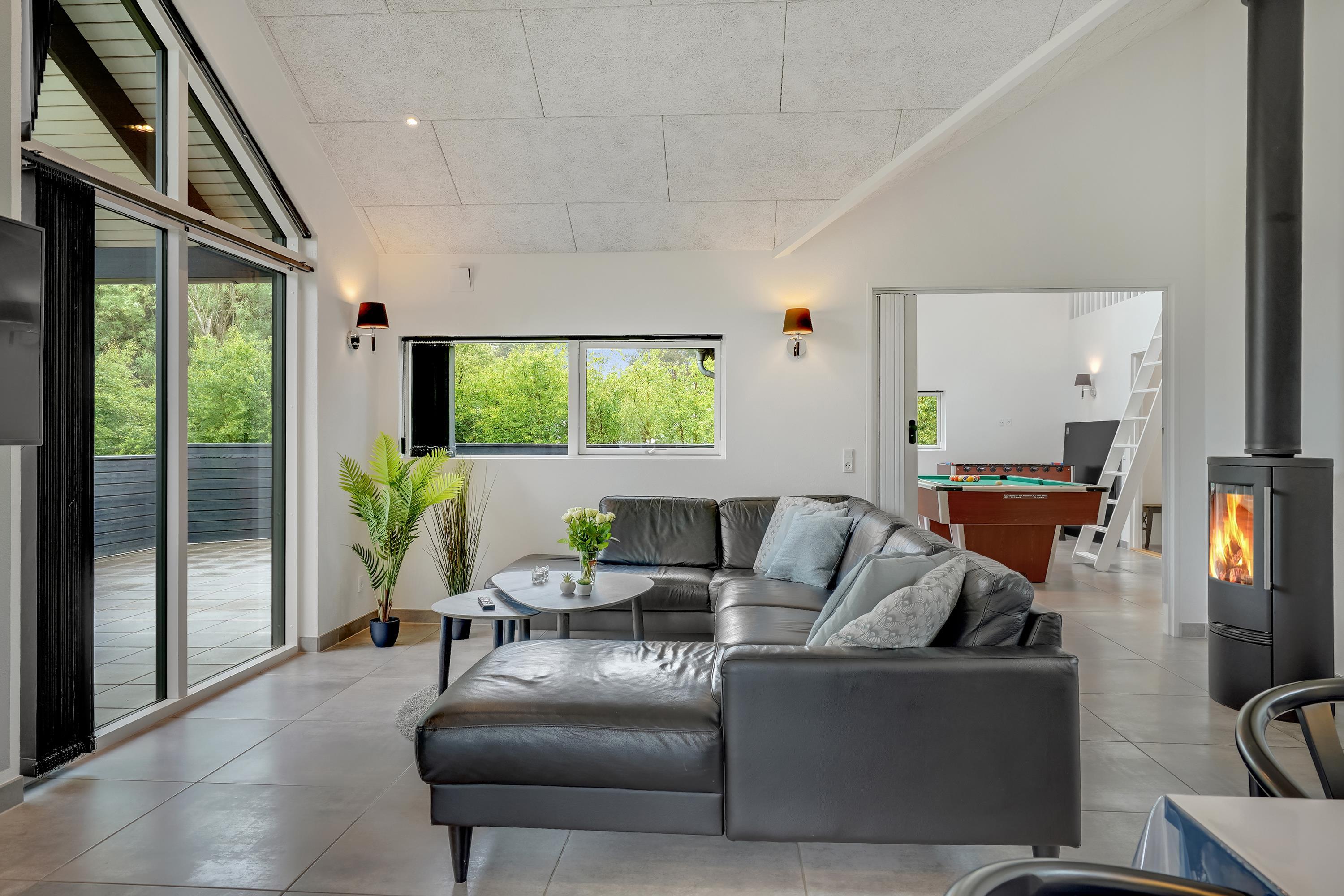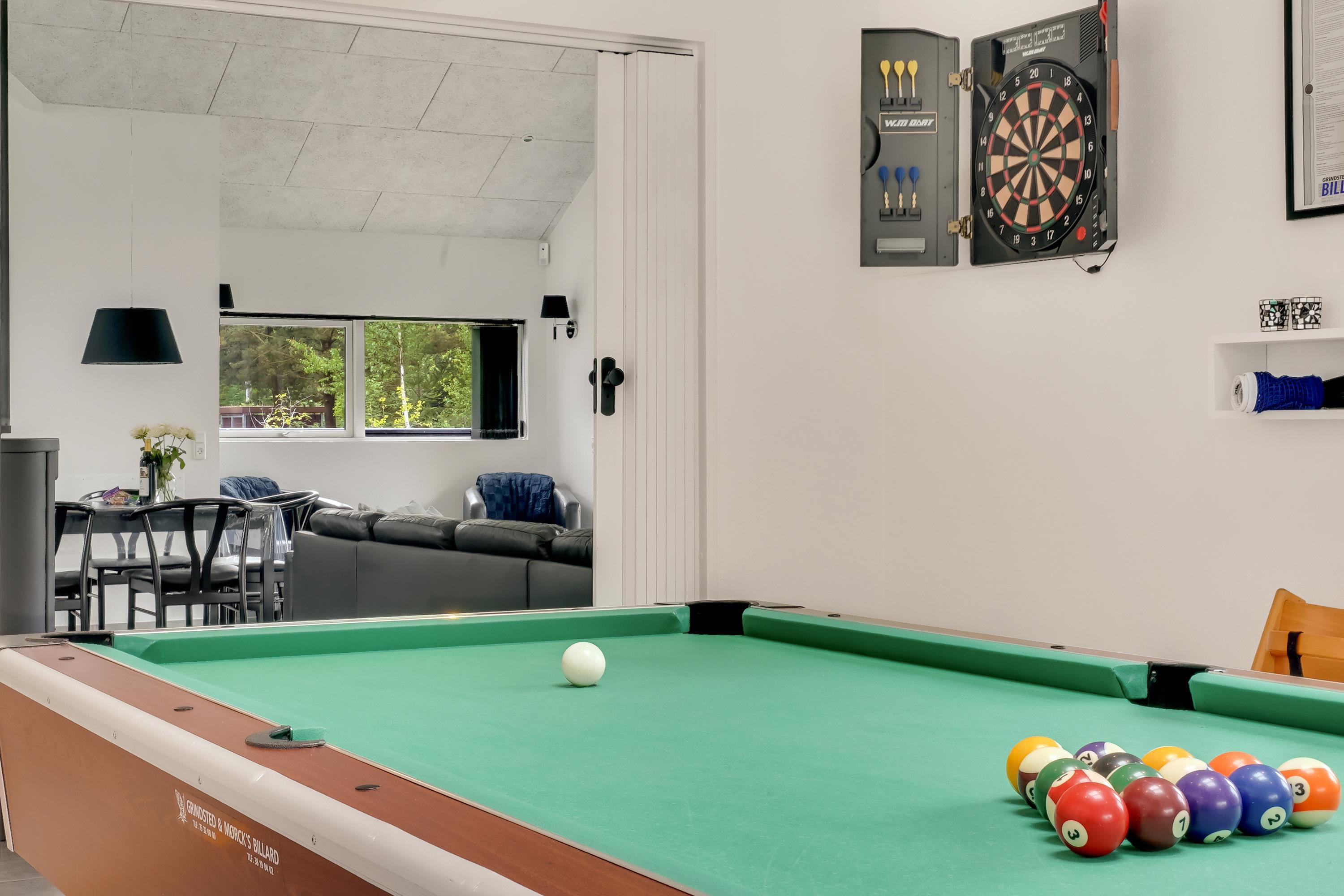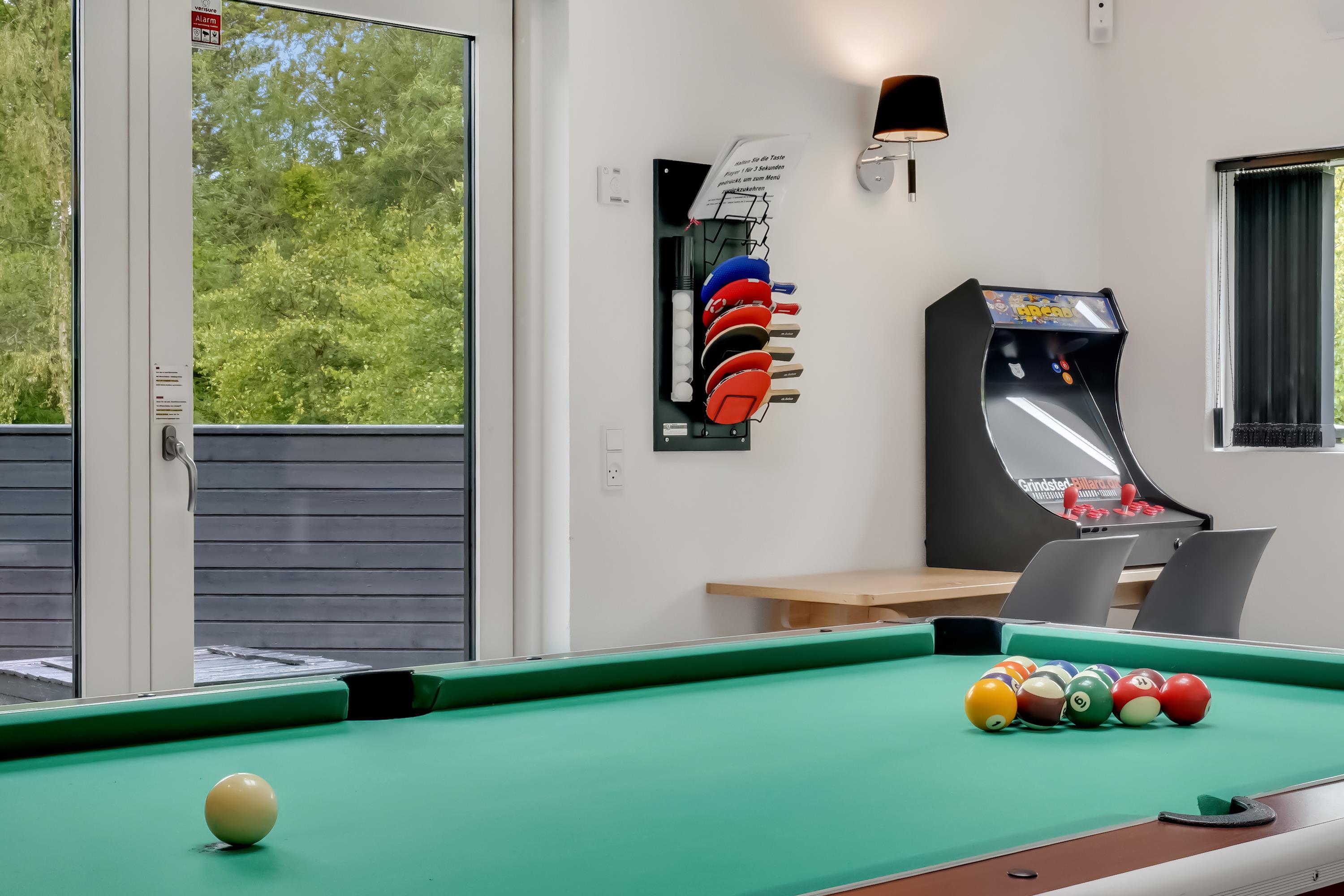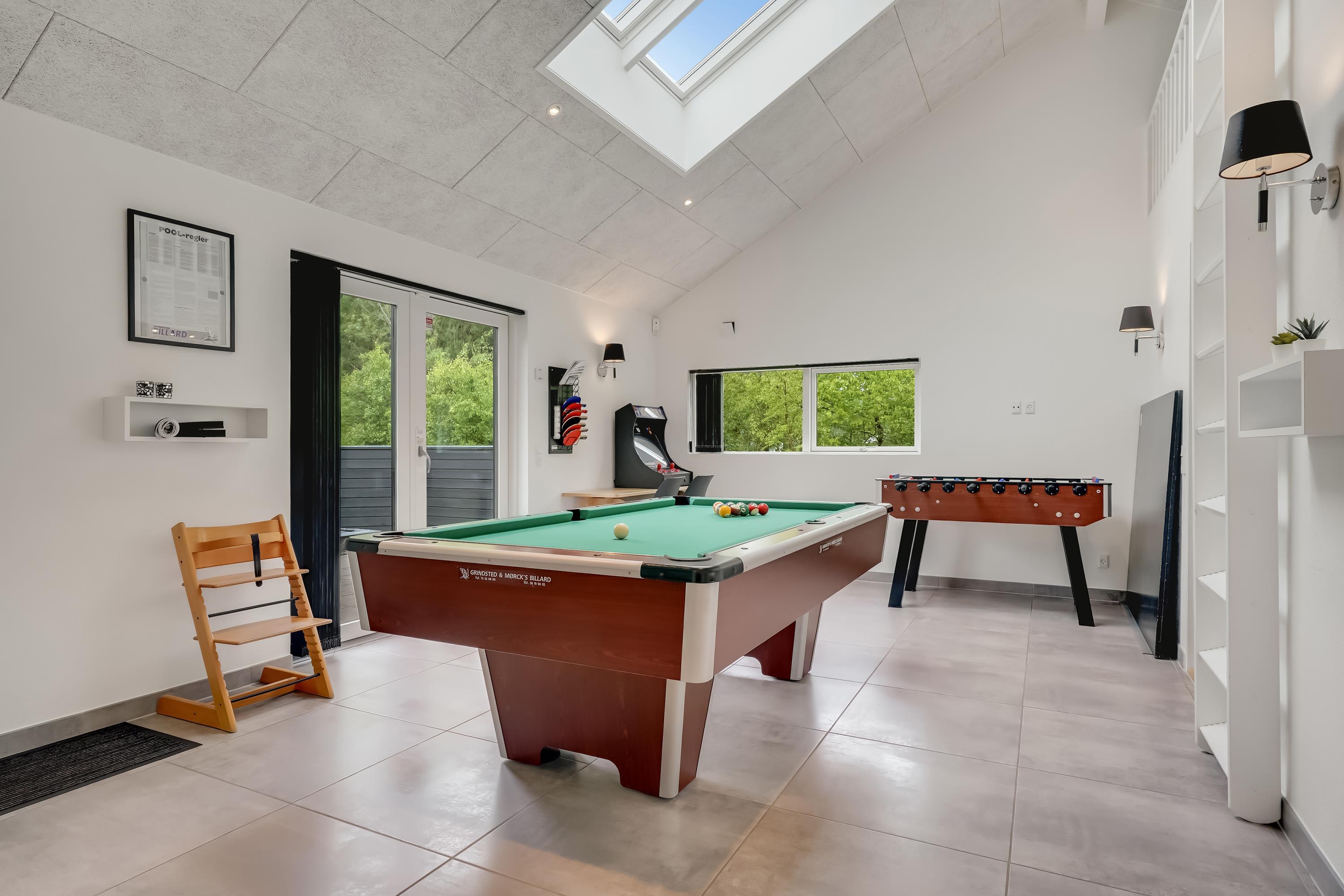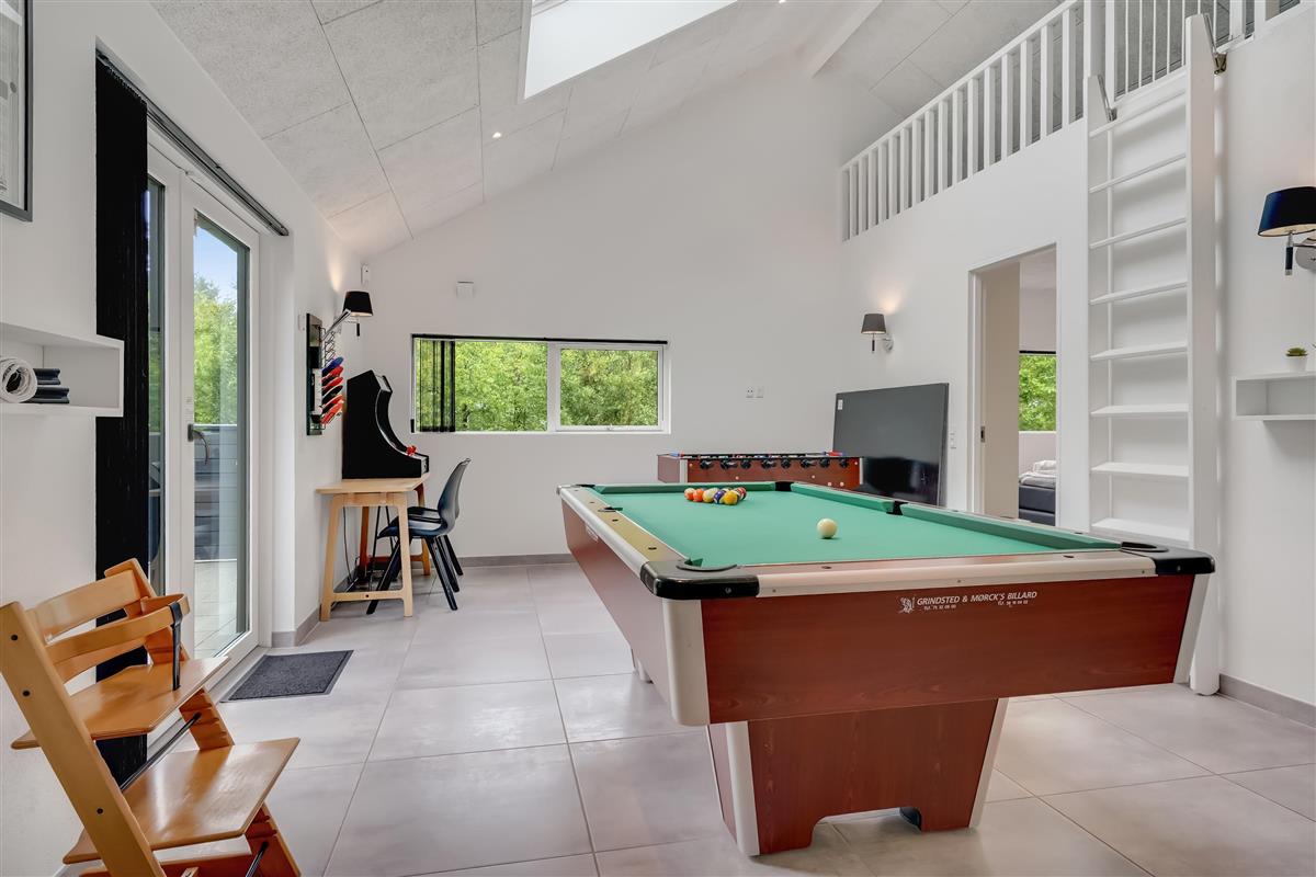 DAS HAUS WIRD MIT KOSTENLOSER NUTZUNG, BETTWÄSCHE UND HANDTÜCHERN BEI ANKUNFT SOWIE PFLICHTREINIGUNG VERMIETET.Aktivitätshaus mit Einrichtungen wie Billard, Tischfußball, Tischtennis, Spielautomaten und Darts, gelegen auf einem eingezäunten Grundstück in Hedevang 22. Dieses neuere Qualitätsgebäude befindet sich in einem vollständig entwickelten Ferienhausgebiet. Es verfügt über einen SEPARATEN AKTIVITÄTSRAUM, in dem die ganze Familie gemeinsam Spaß haben und entspannen kann. Mit seinen 150 m² bietet das Haus viel Platz für zwei Familien. Es gibt zwei Bereiche, jeweils mit zwei Schlafzimmern und einem Badezimmer. Darüber hinaus gibt es Wellness-Einrichtungen mit einem Spa und einer Infrarotsauna, und das große Badezimmer hat zwei Duschen. Wickeltisch für die Kleinsten.