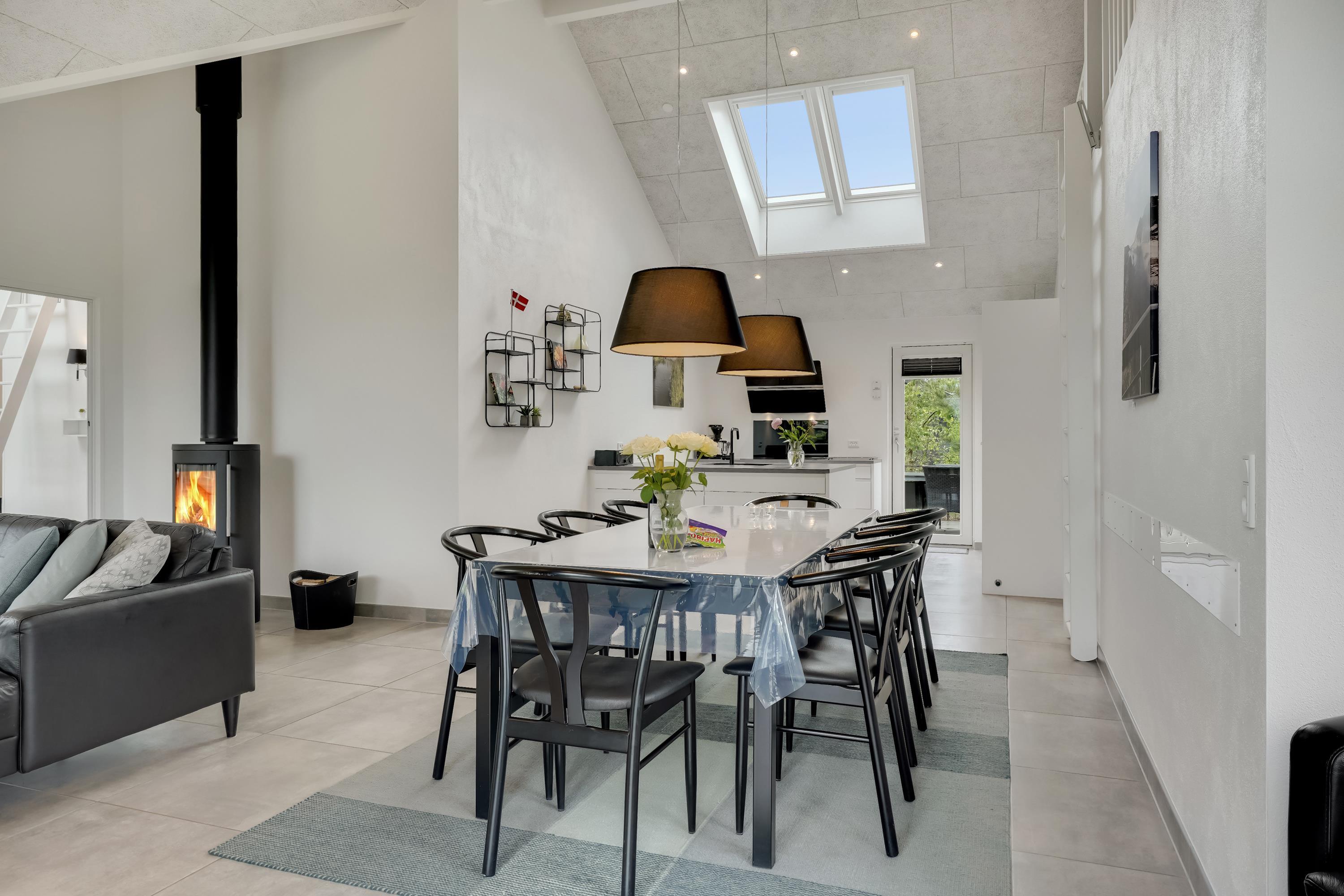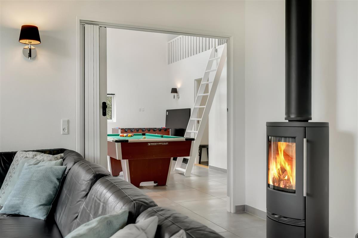 Die Küche ist geräumig und kombiniert mit einem Essbereich sowie einem Wohnzimmer, das sowohl einen Kamin als auch eine Wärmepumpe hat, was ein angenehmes Raumklima und niedrigere Energiekosten gewährleistet. Im Wohnzimmer gibt es einen CD/DVD-Player.