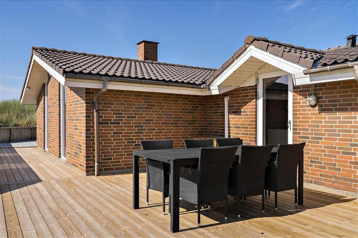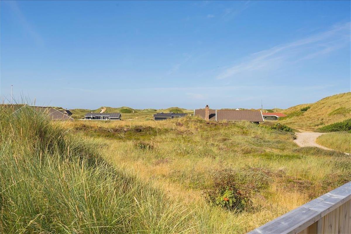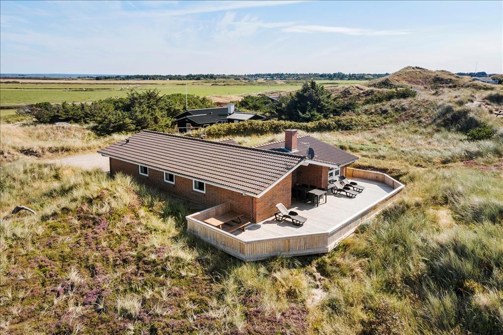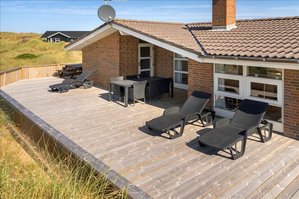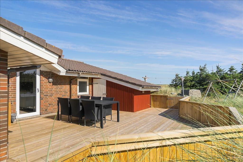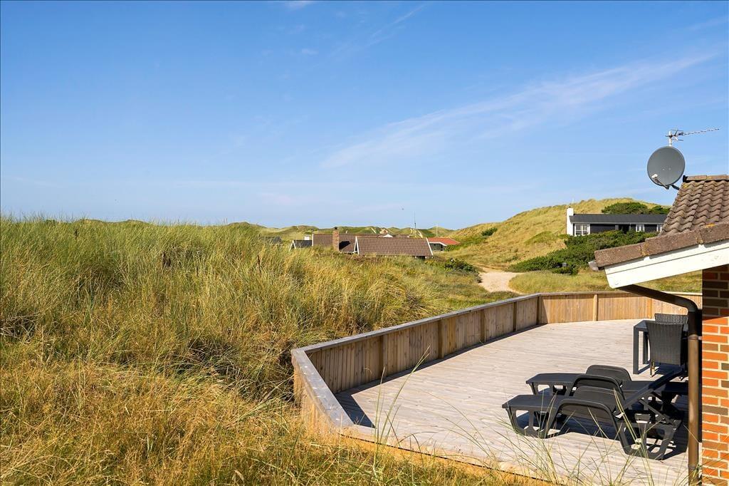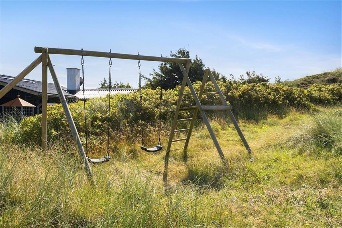 Auch draußen ist viel Platz vorhanden, denn um das Haus herum erstreckt sich eine 100 m² große, geschlossene Terrasse. Ein kleiner Teil ist überdacht, der Rest ist offen gestaltet, damit Sie die Sonne oder einen schönen Abend unter dem Sternenhimmel genießen können. Für die Kinder gibt es Schaukeln. Vom hügeligen Dünengrundstück aus hat man eine schöne Aussicht über die geschwungene Landschaft und den Stadil Fjord.