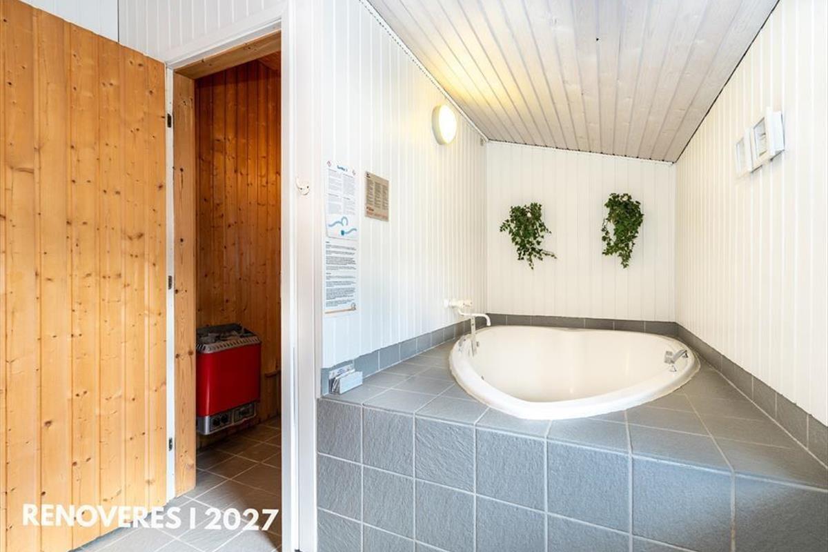 Das Haus hat eine Wohnfläche von 120 m² und ist mit vier Schlafzimmern, einem Badezimmer und einer Gästetoilette für acht Personen eingerichtet. Wohnzimmer und Küche sind miteinander verbunden, sdass man auch beim Kartoffelschälen nicht auf gemütliche Gespräche und Geselligkeit verzichten muss. Die gut ausgestattete Küche verfügt über einen Geschirrspüler, sodass man nach dem Essen nur schnell abräumen muss und sich dann auf den Sofas neben dem Kaminofen entspannen kann. Entspannende Momente gibt es auch im Badezimmer, wo Sie in den Whirlpool eintauchen oder sich zwischen den Saunagängen unter der Dusche abkühlen können. Das Ferienhaus ist mit allem erdenklichen Komfort ausgestattet, darunter eine Waschmaschine und ein Trockner, eine energiesparende Wärmepumpe und eine gute Wi-Fi-Verbindung.