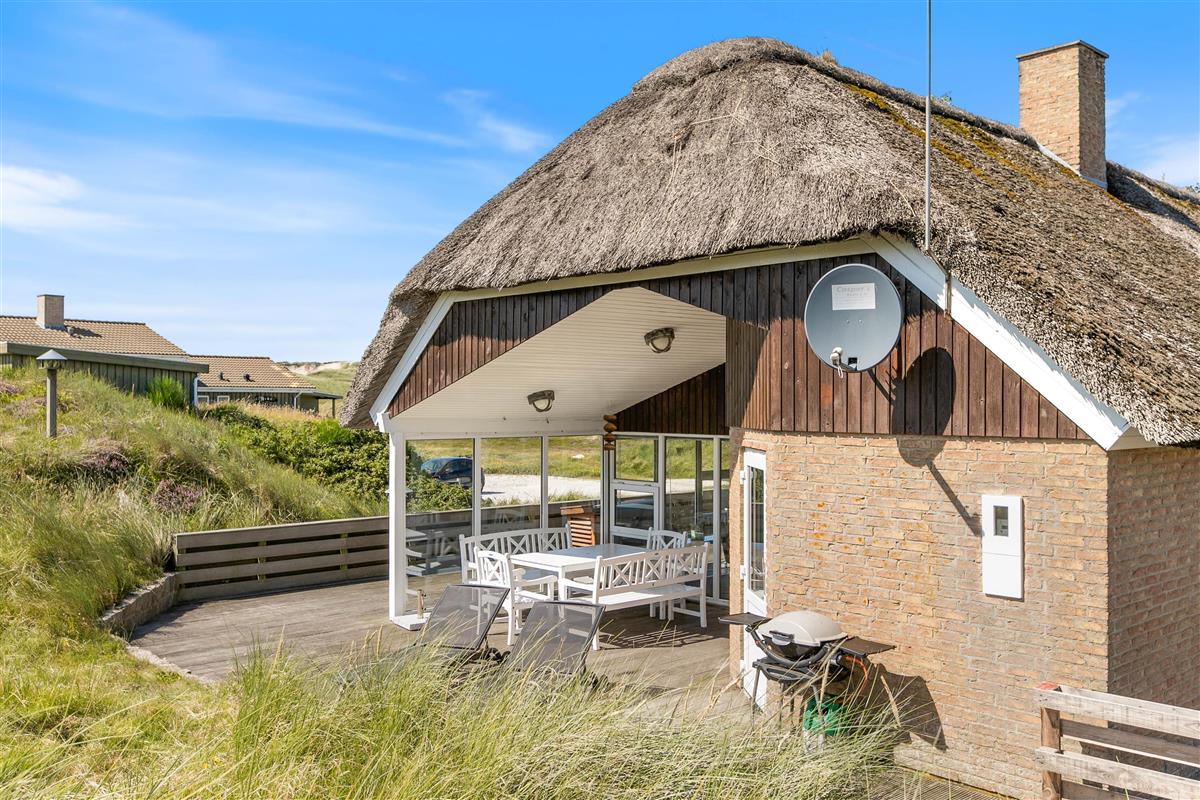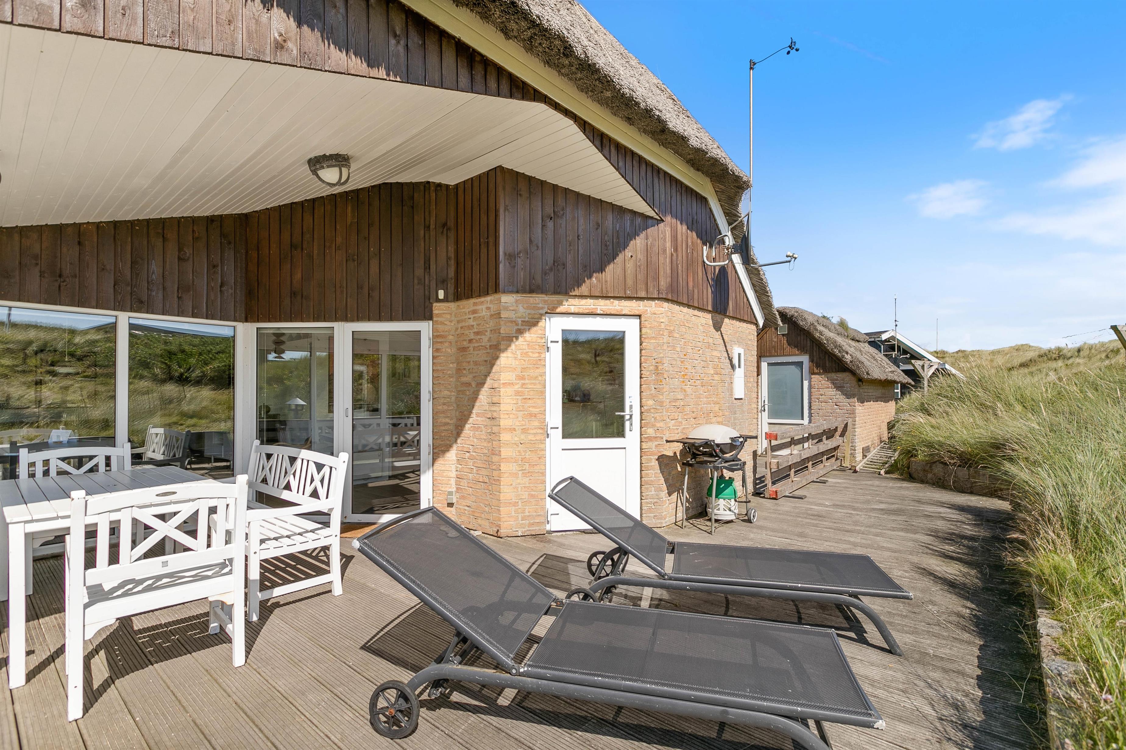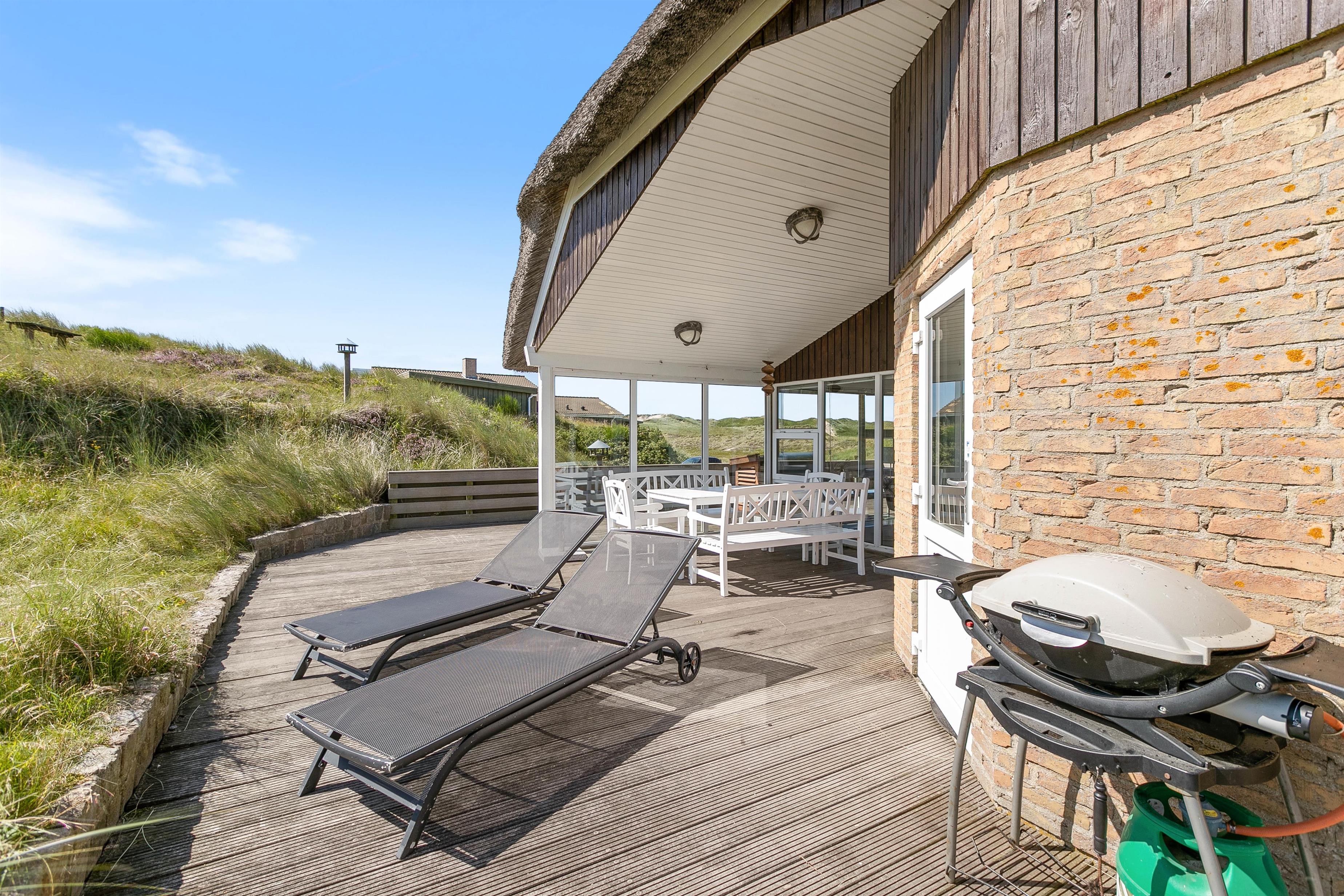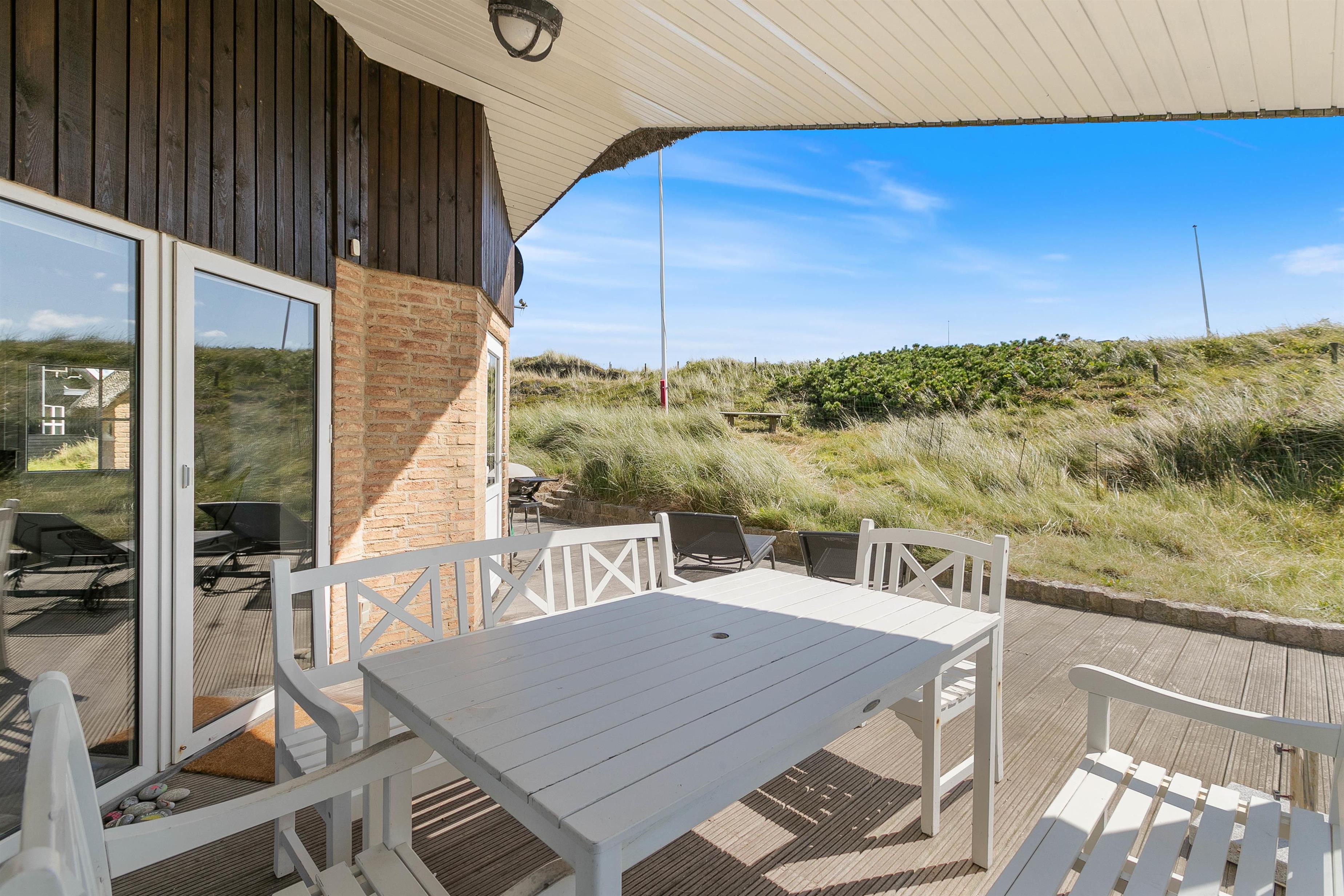 The living room opens onto a partially covered terrace furnished with comfortable garden furniture. The view over the surrounding dune landscape is simply fantastic. While sunbathing, you can hear the sound of the sea and watch snow-white seagulls against the deep blue sky. A warm summer's day is best concluded with a relaxing barbecue as the sun sets behind the dunes, painting the sky red, while your dog curls up beside you, perhaps still dreaming of chasing seagulls.