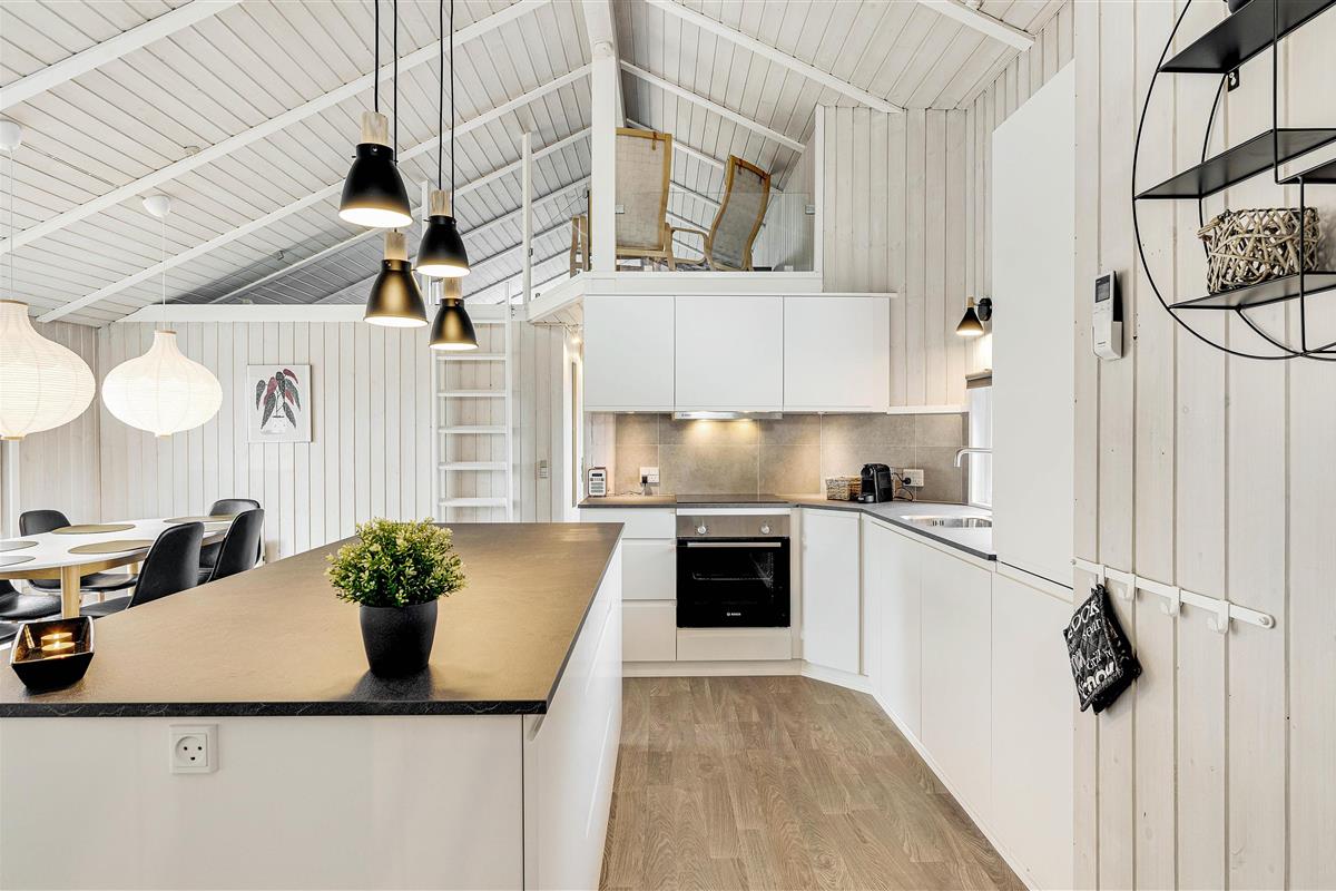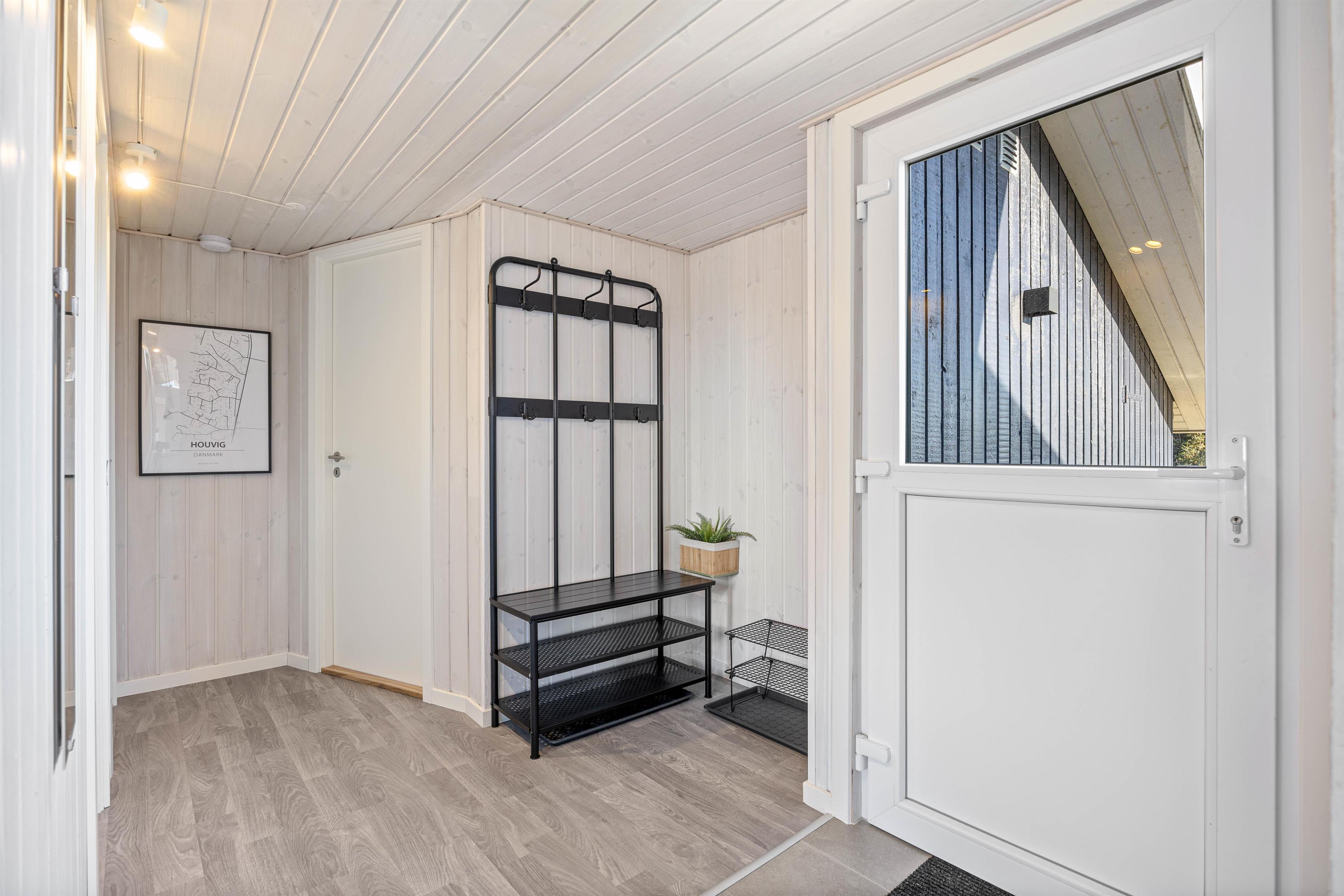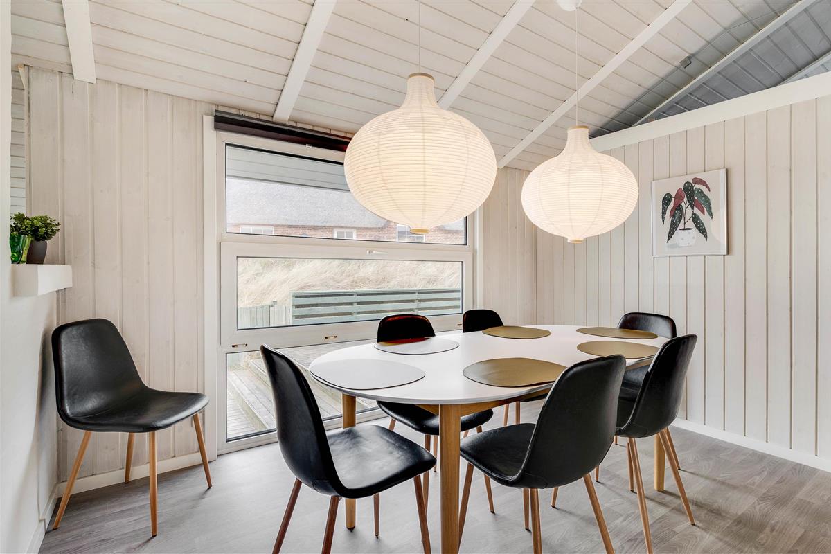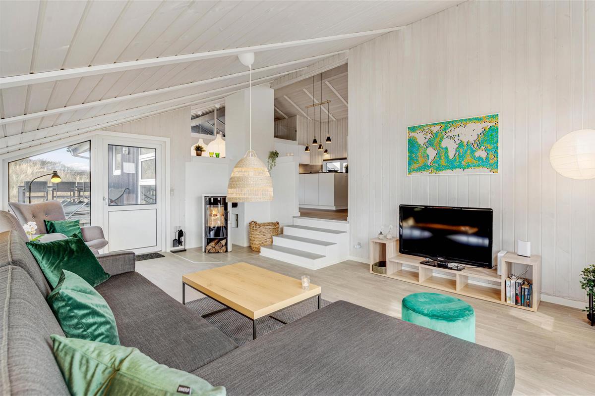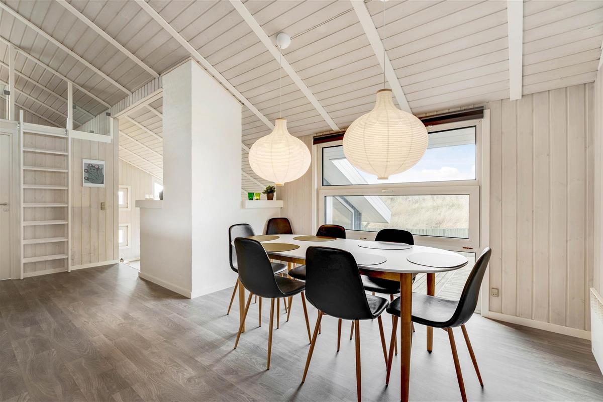 Located at Mågedalen 97 in the Houvig holiday region, this holiday home charms with its classic style. Wood-panelled walls extending to the roof create an authentic holiday atmosphere. The spacious dining area with integrated kitchen will be one of the home's focal points. The well-equipped kitchen is perfect for preparing delicious meals together, while the dining table offers an ideal spot for evening games or planning your holiday activities.