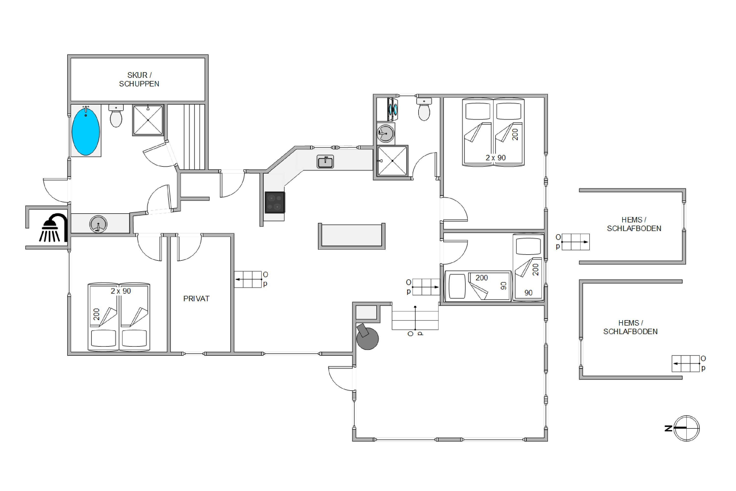 The 110-square-metre holiday home offers three bedrooms: two with double beds and one with twin beds. A special highlight for younger guests are the sleeping lofts, accessible by ladder from the kitchen, providing excellent private retreats.