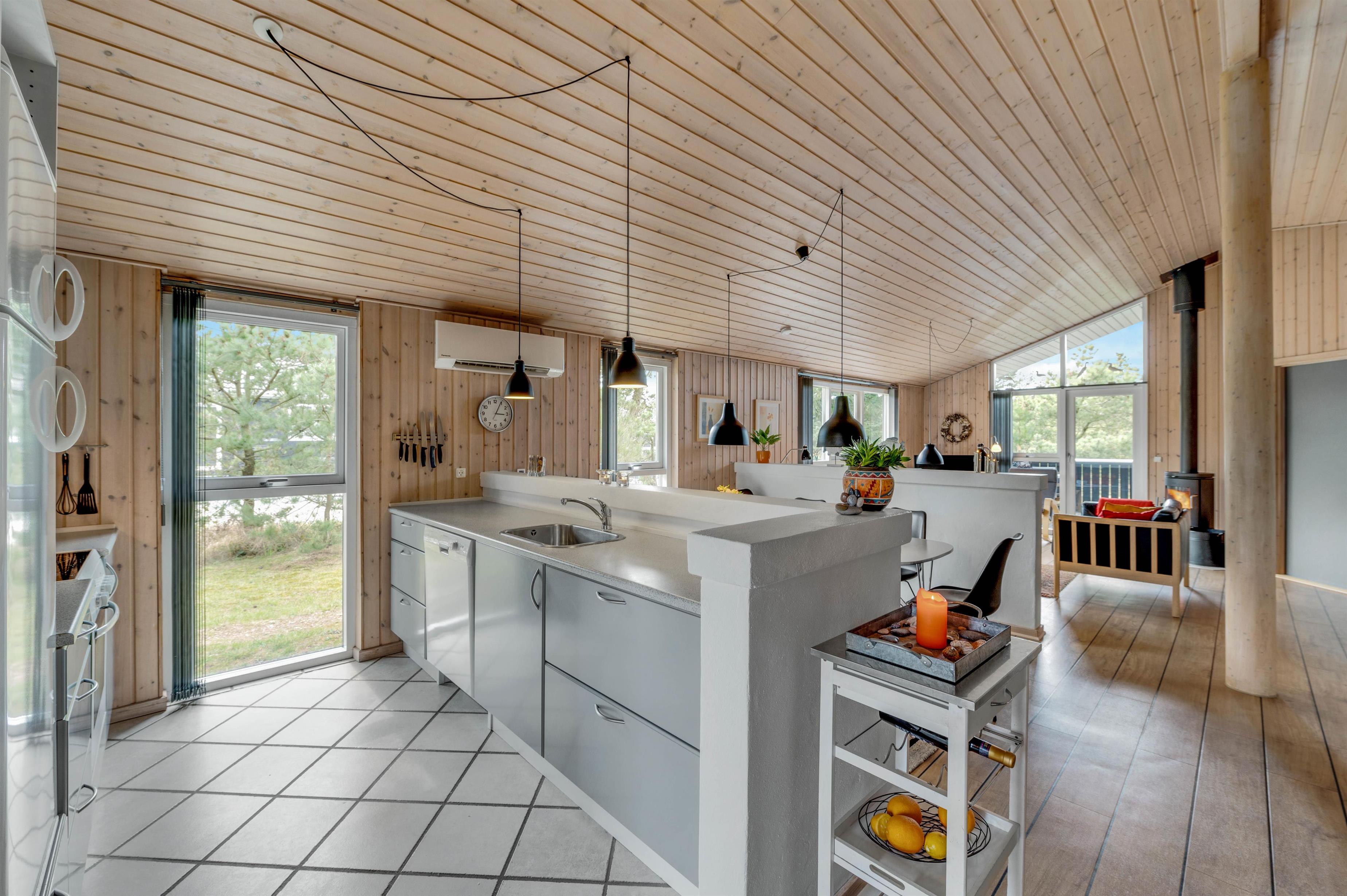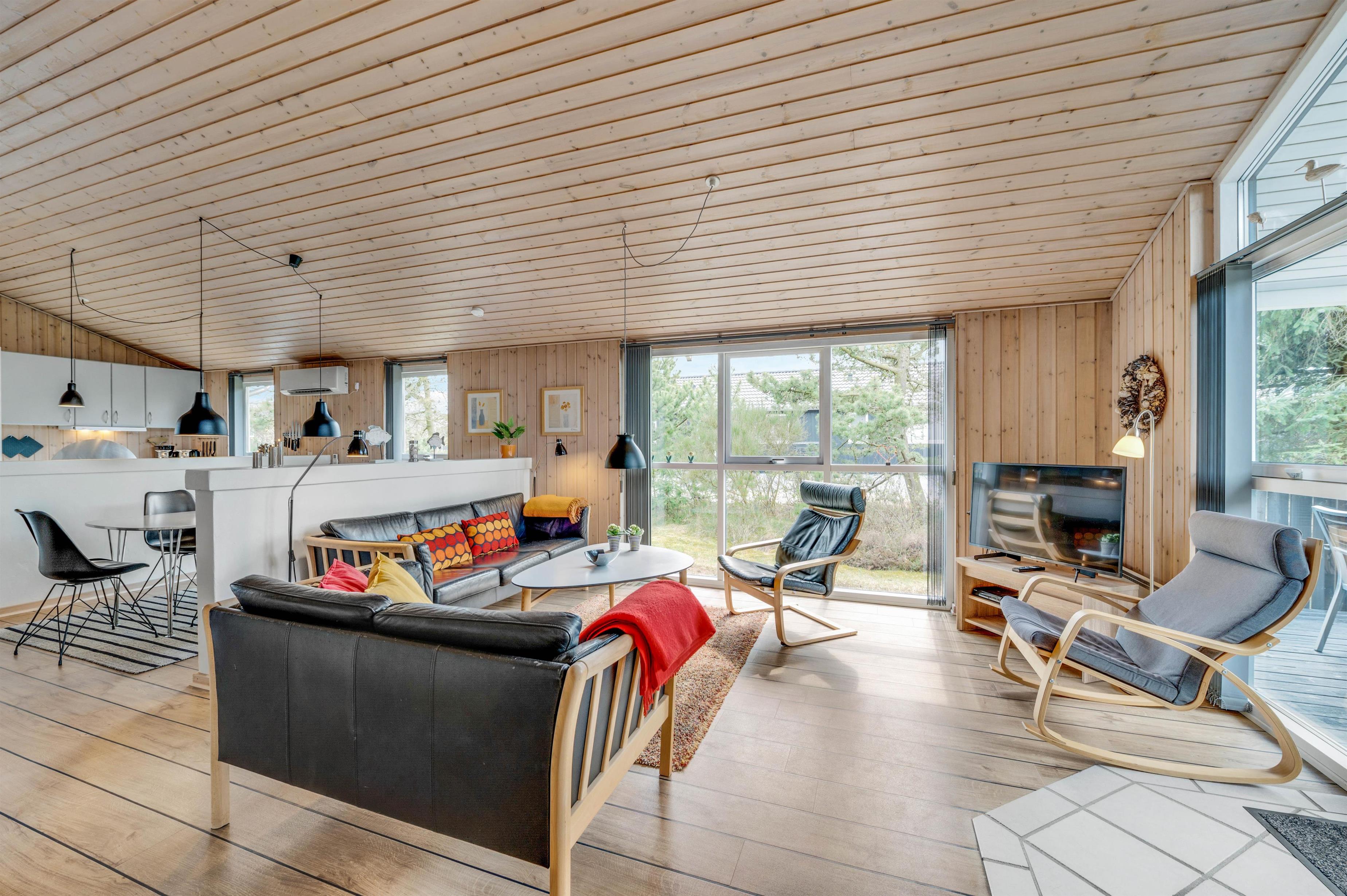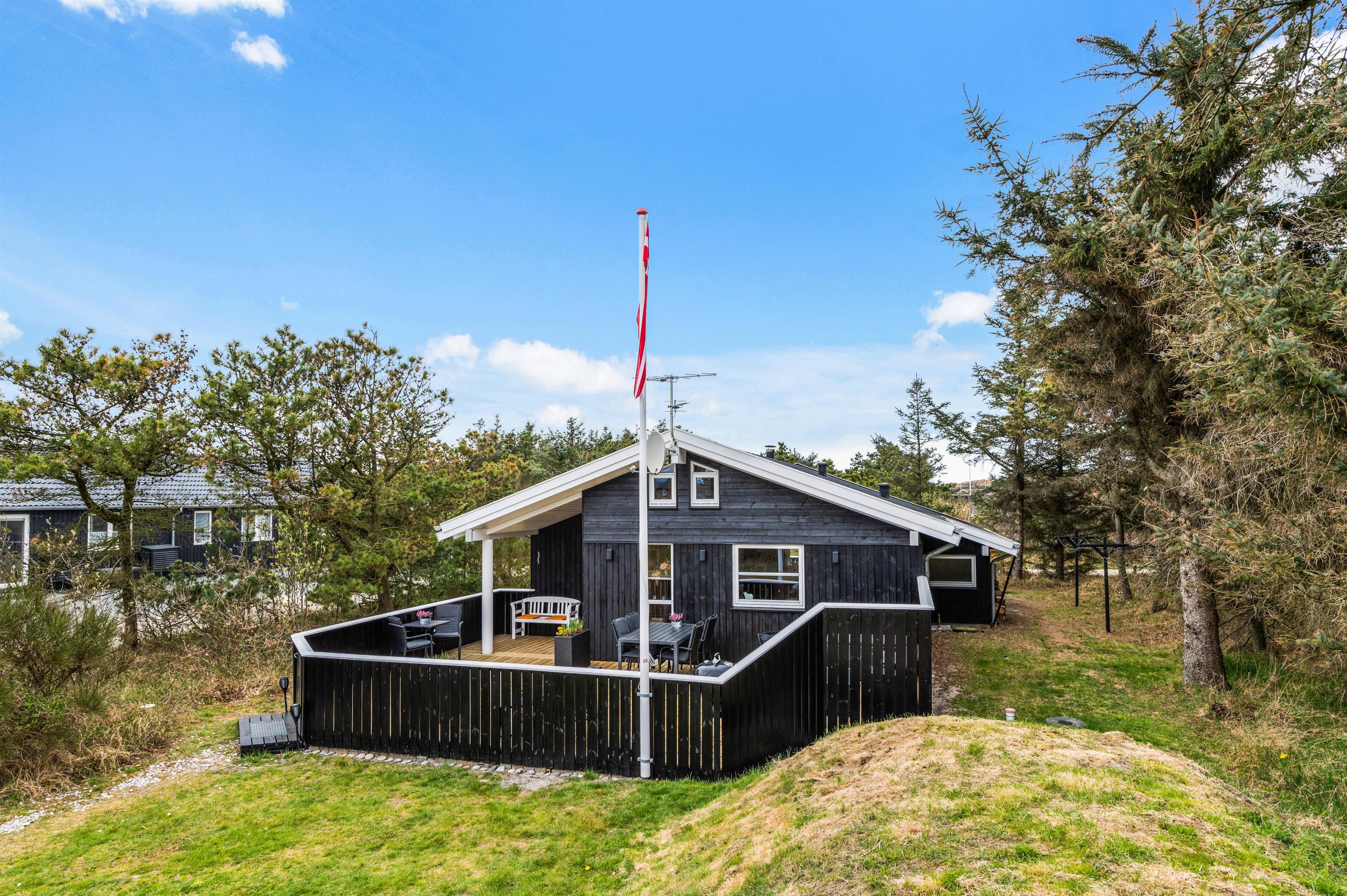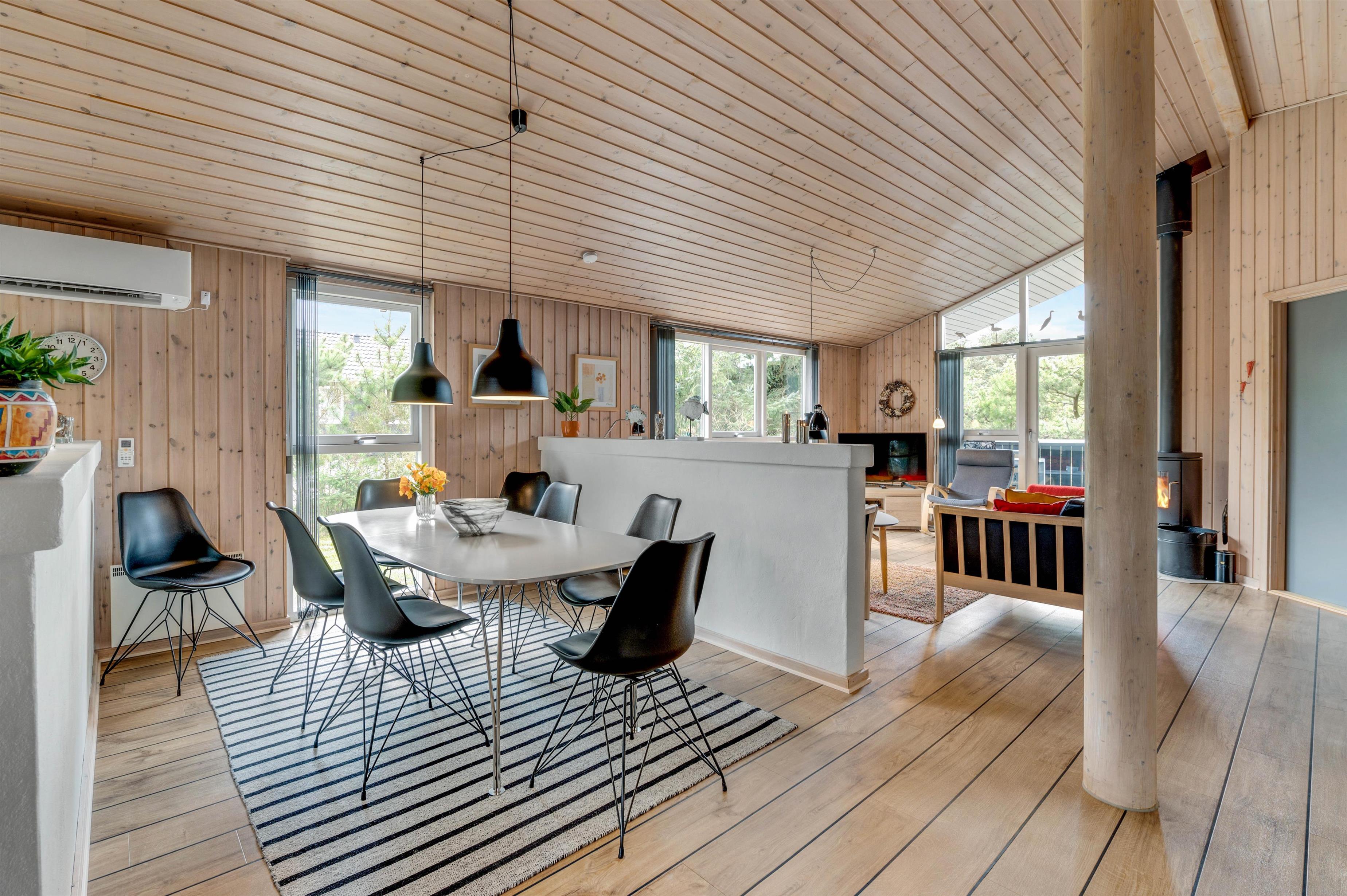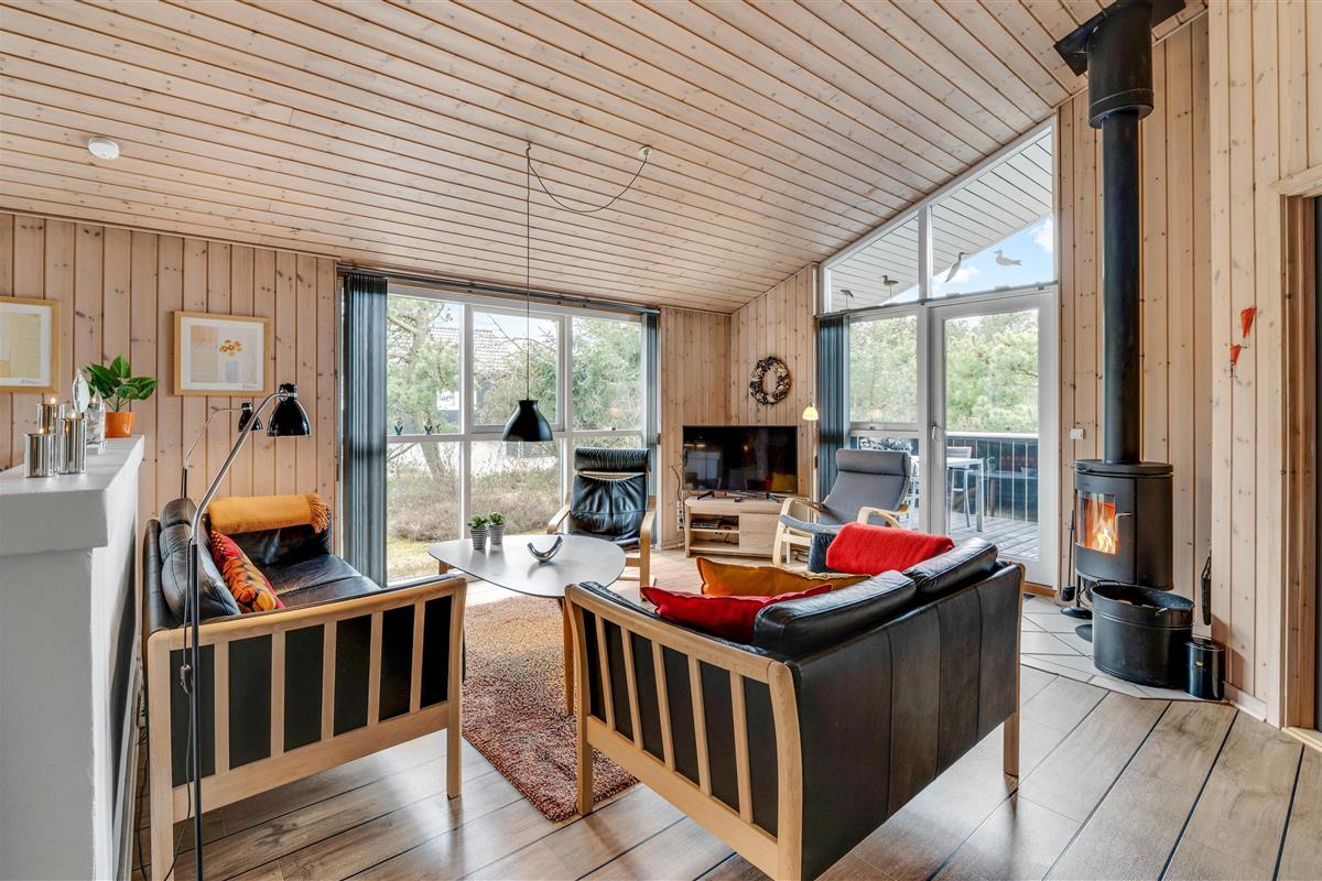 This holiday home is situated on a peaceful natural plot in Houvig, close to the North Sea. The house is surrounded by trees, offering privacy while relaxing on the fenced terrace. On cooler days, the wood-burning stove provides a cosy gathering point for the whole family.