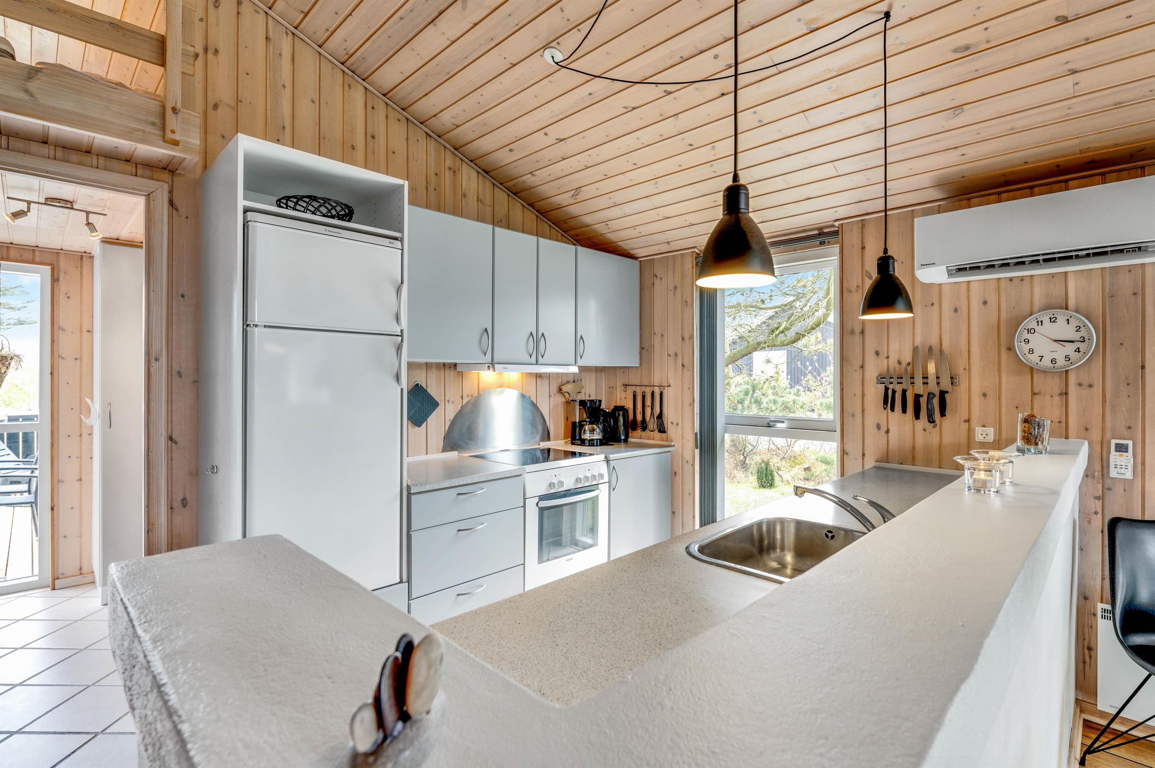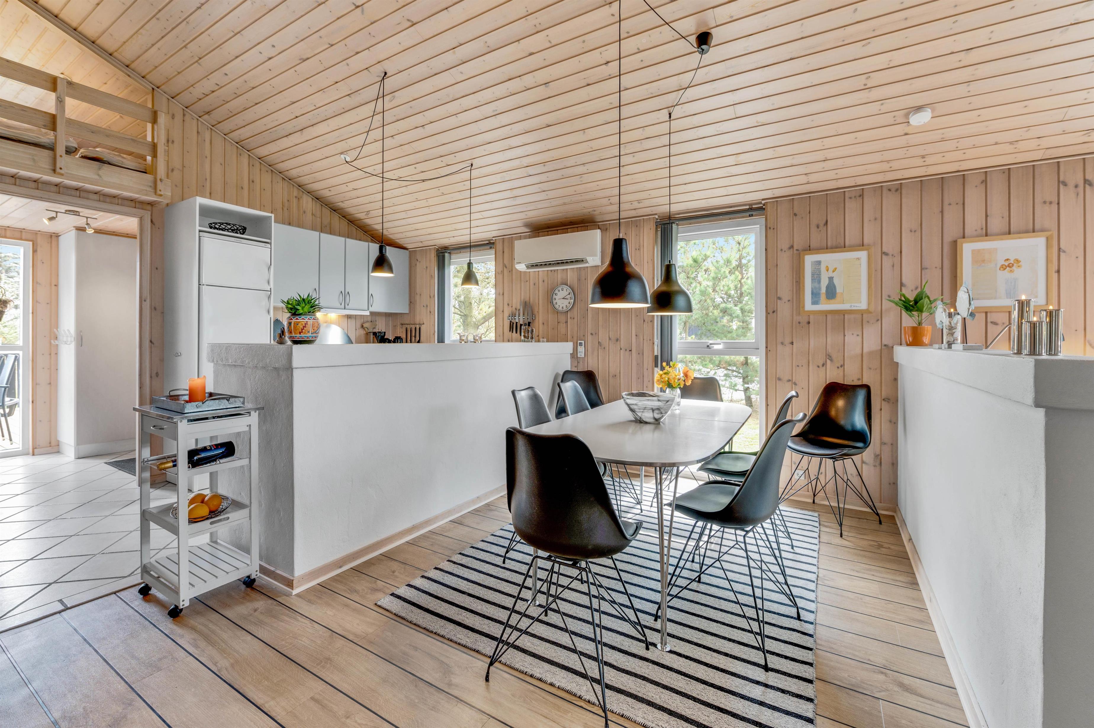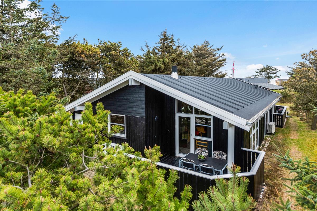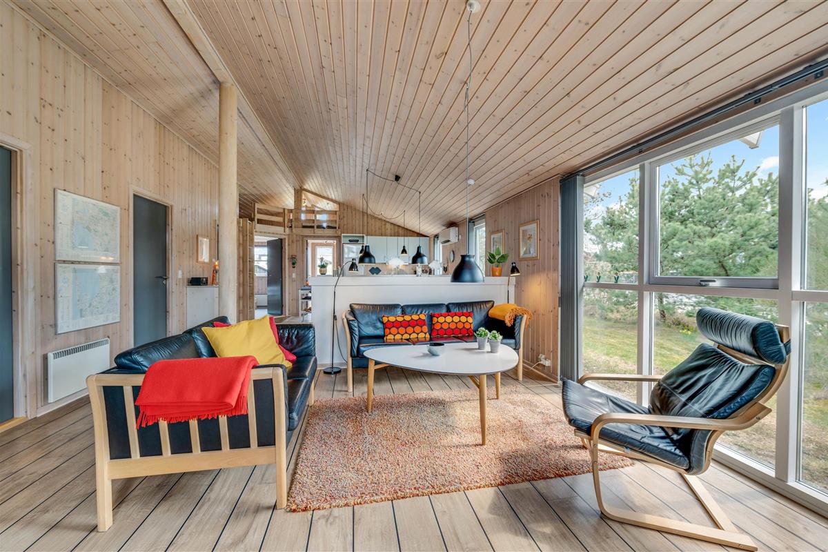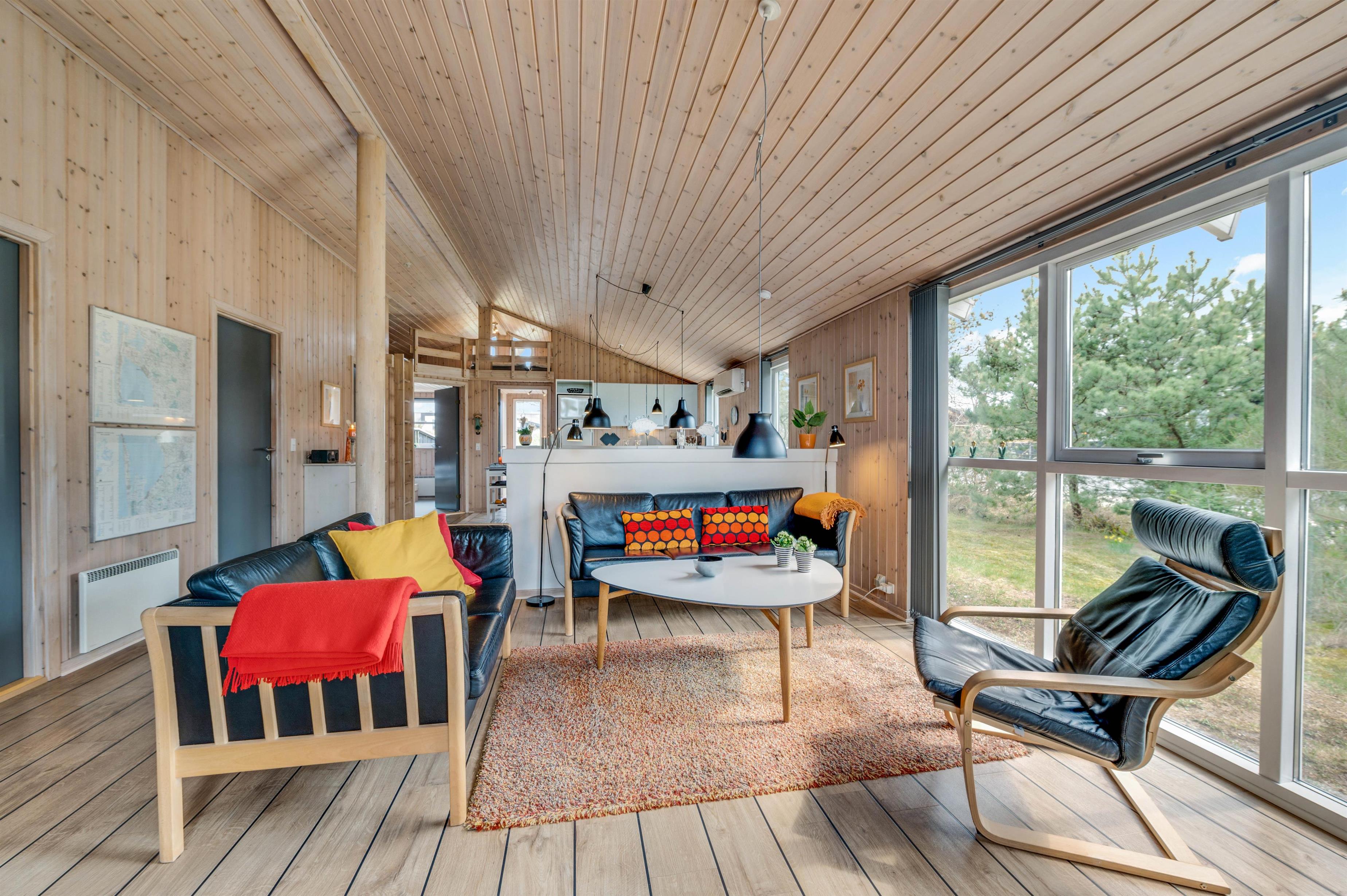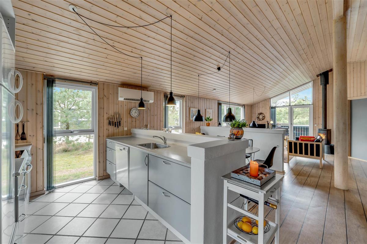 This holiday home is situated on a peaceful natural plot in Houvig, close to the North Sea. The house is surrounded by trees, offering privacy while relaxing on the fenced terrace. On cooler days, the wood-burning stove provides a cosy gathering point for the whole family.