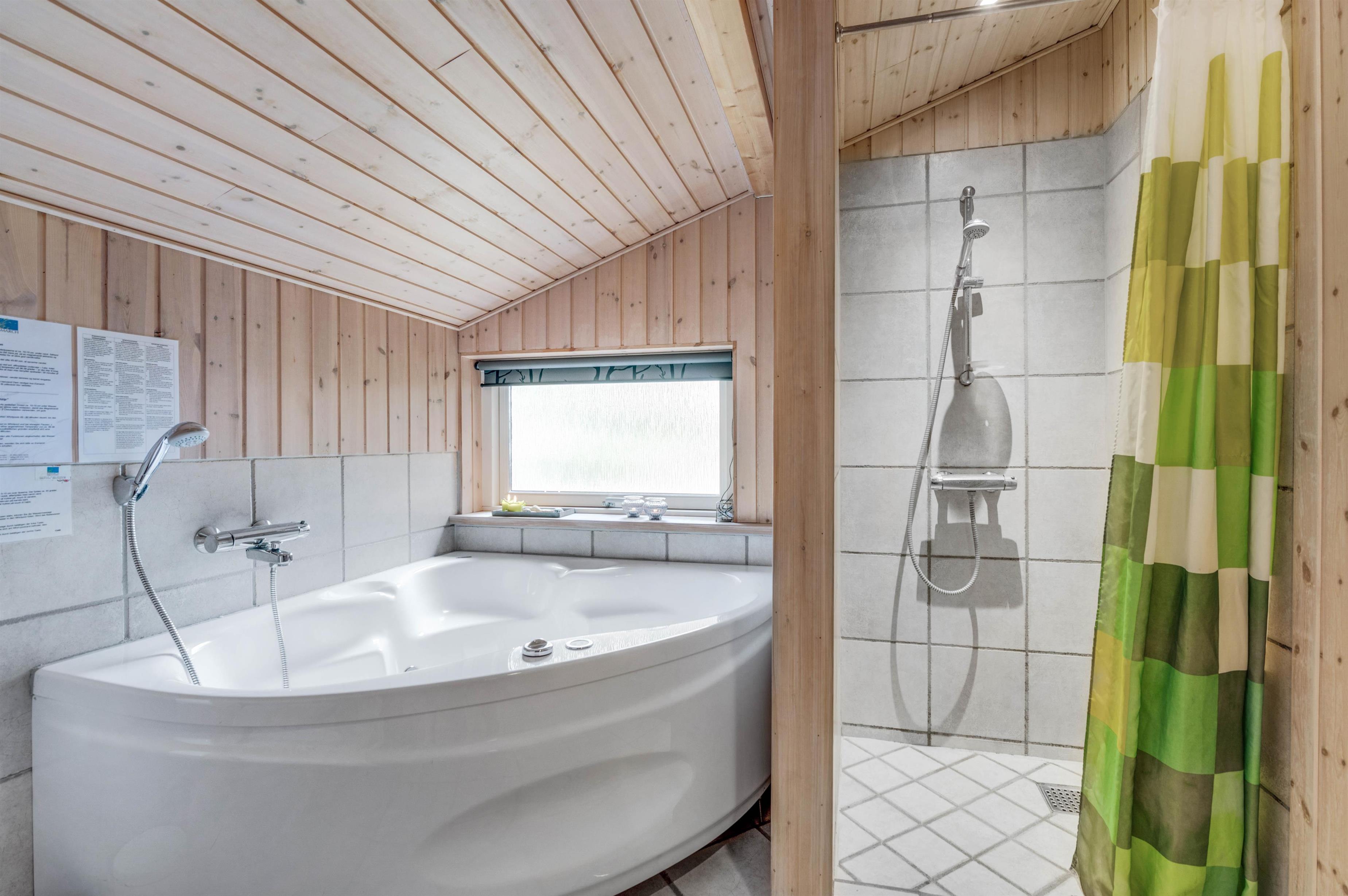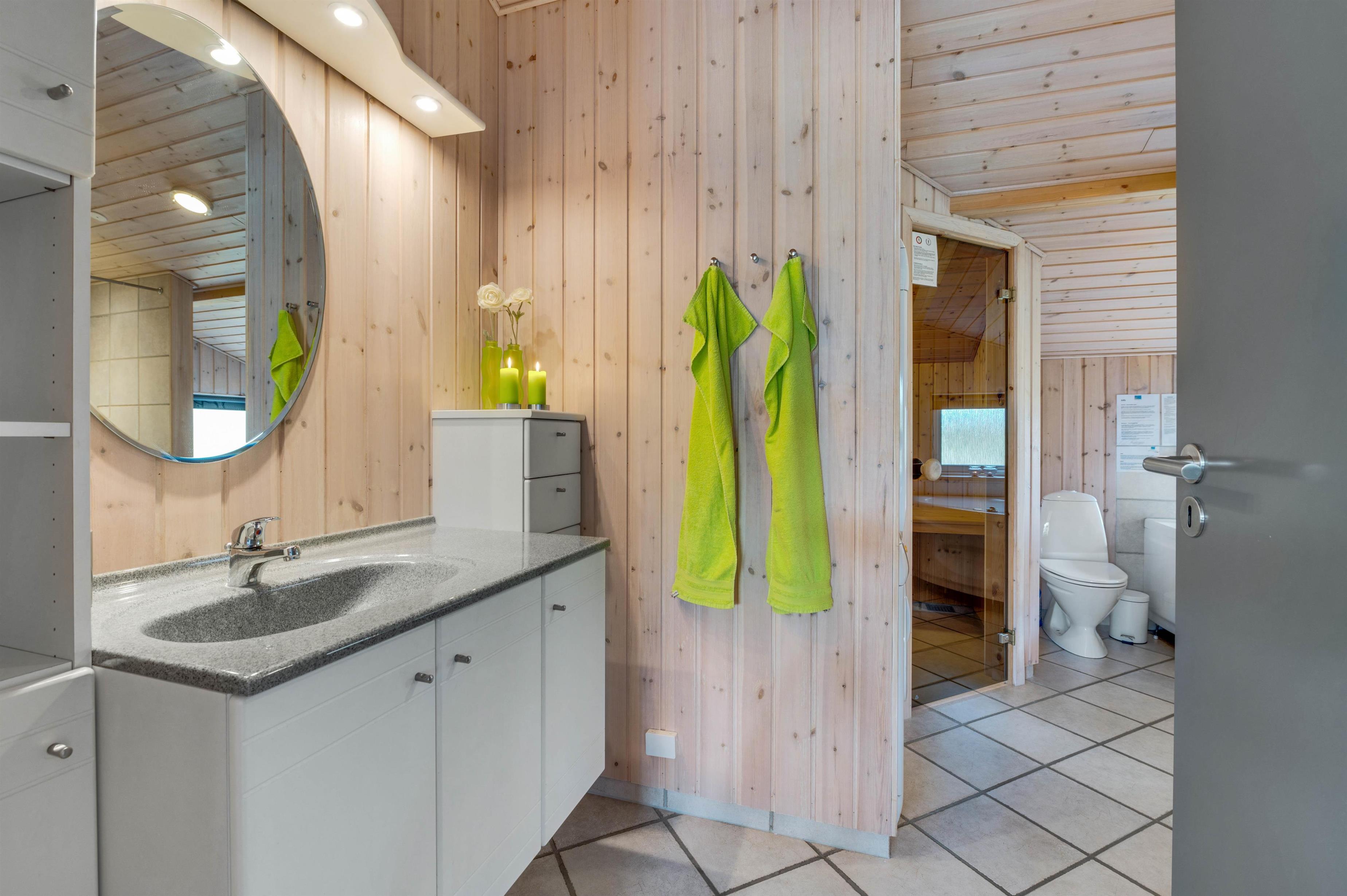 One of the bathrooms features a small wellness area with a corner whirlpool and sauna.