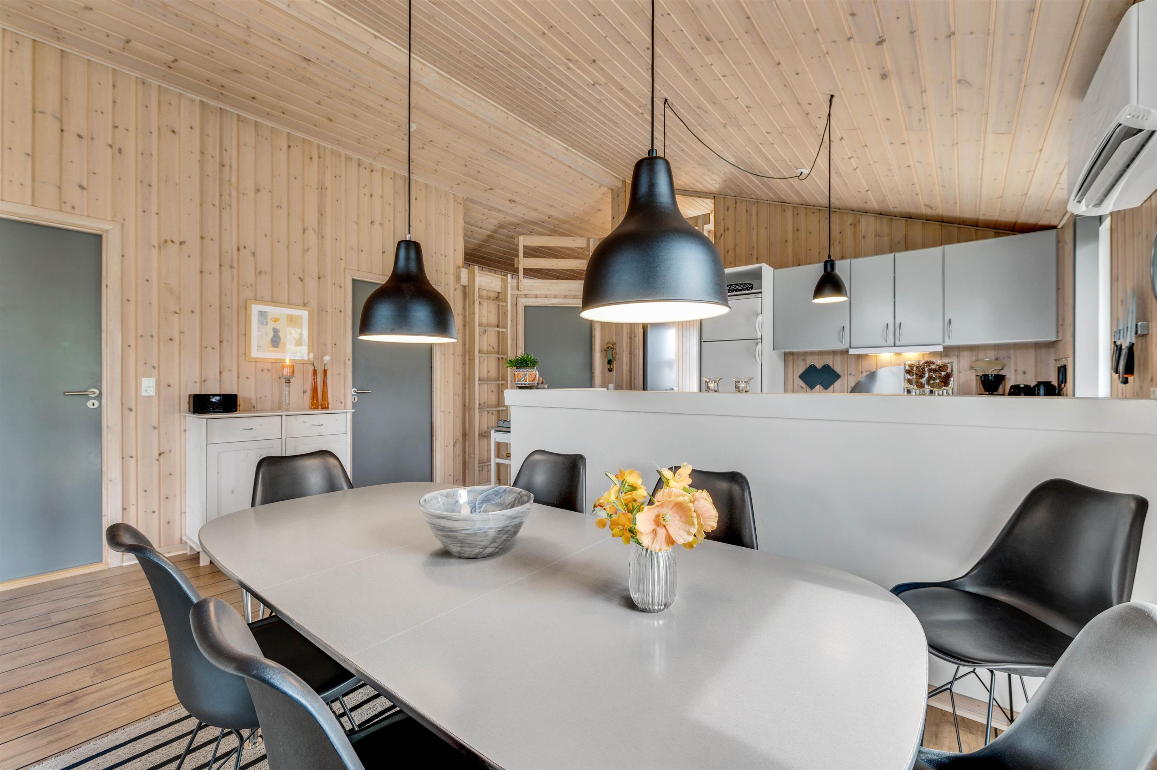 The holiday home's wood-burning stove, accessible from both the living area and kitchen, provides warmth on chilly days. Make yourself comfortable with a good book by the fire or play games with the children while the flames crackle cosily in the stove.