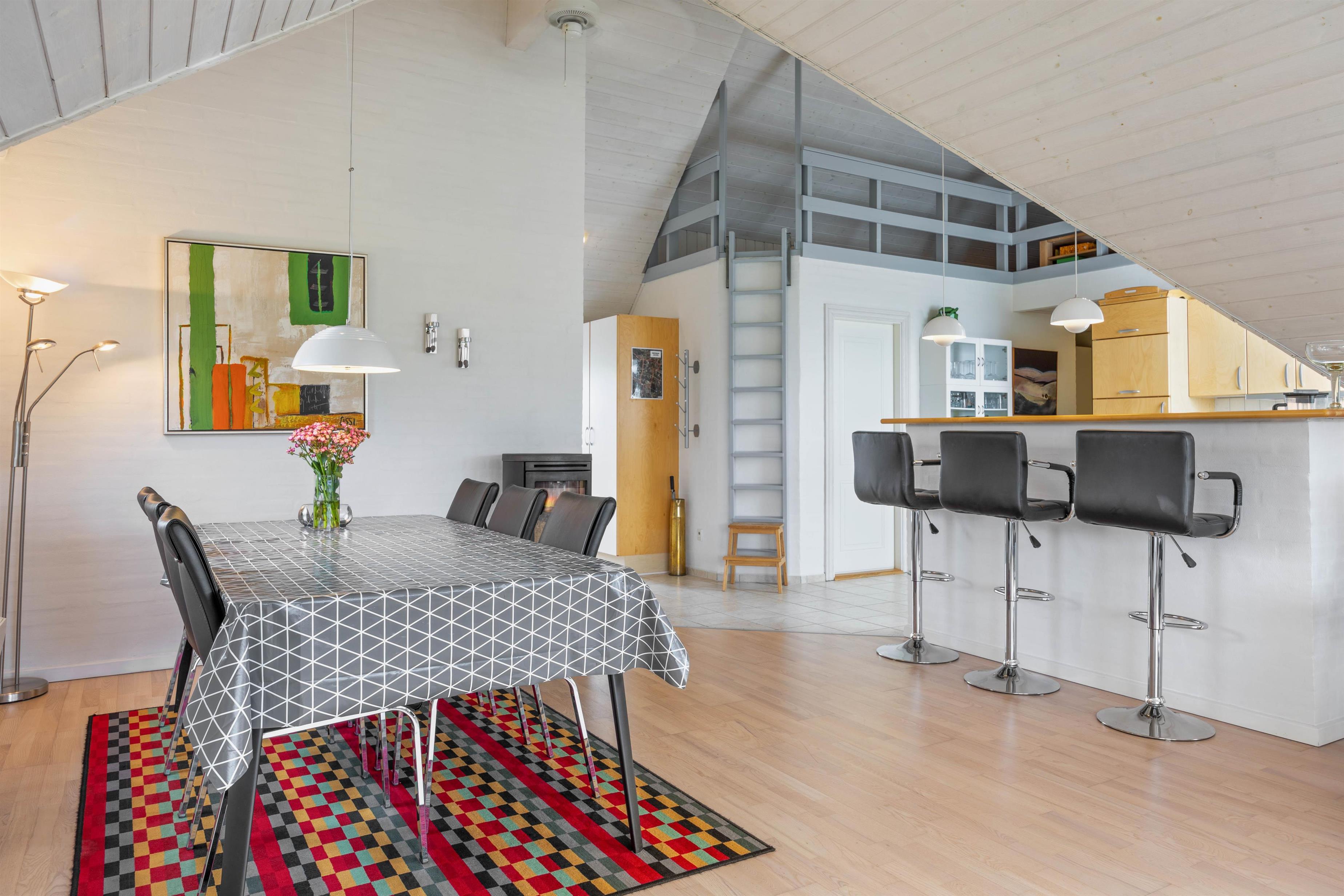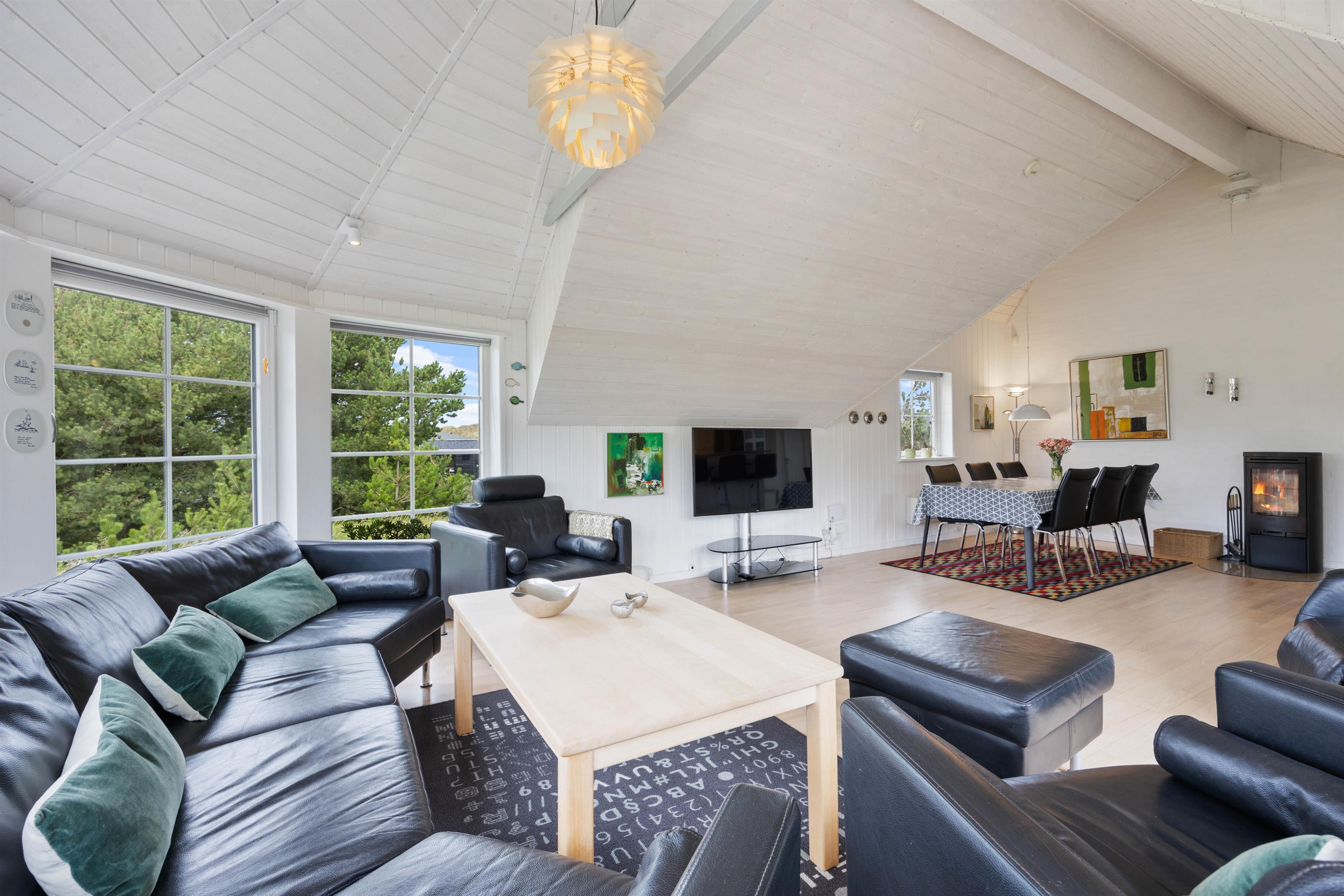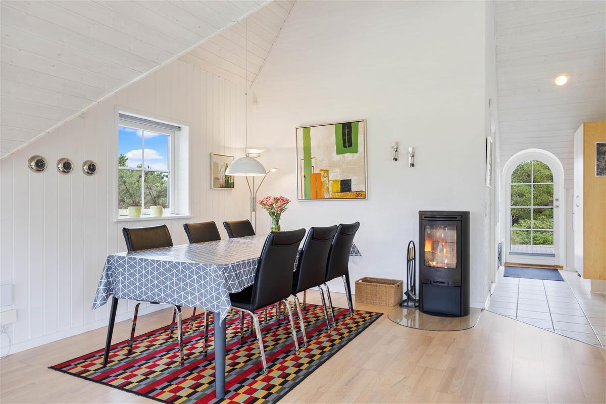 On cooler evenings, light up the wood-burning stove for an extra cosy atmosphere. Whether you're gathering around the dining table to plan the next day's activities or enjoying an exciting card game, there's plenty of space. An energy-efficient air-to-air heat pump has been installed to maintain a pleasant and consistent temperature throughout the living area.