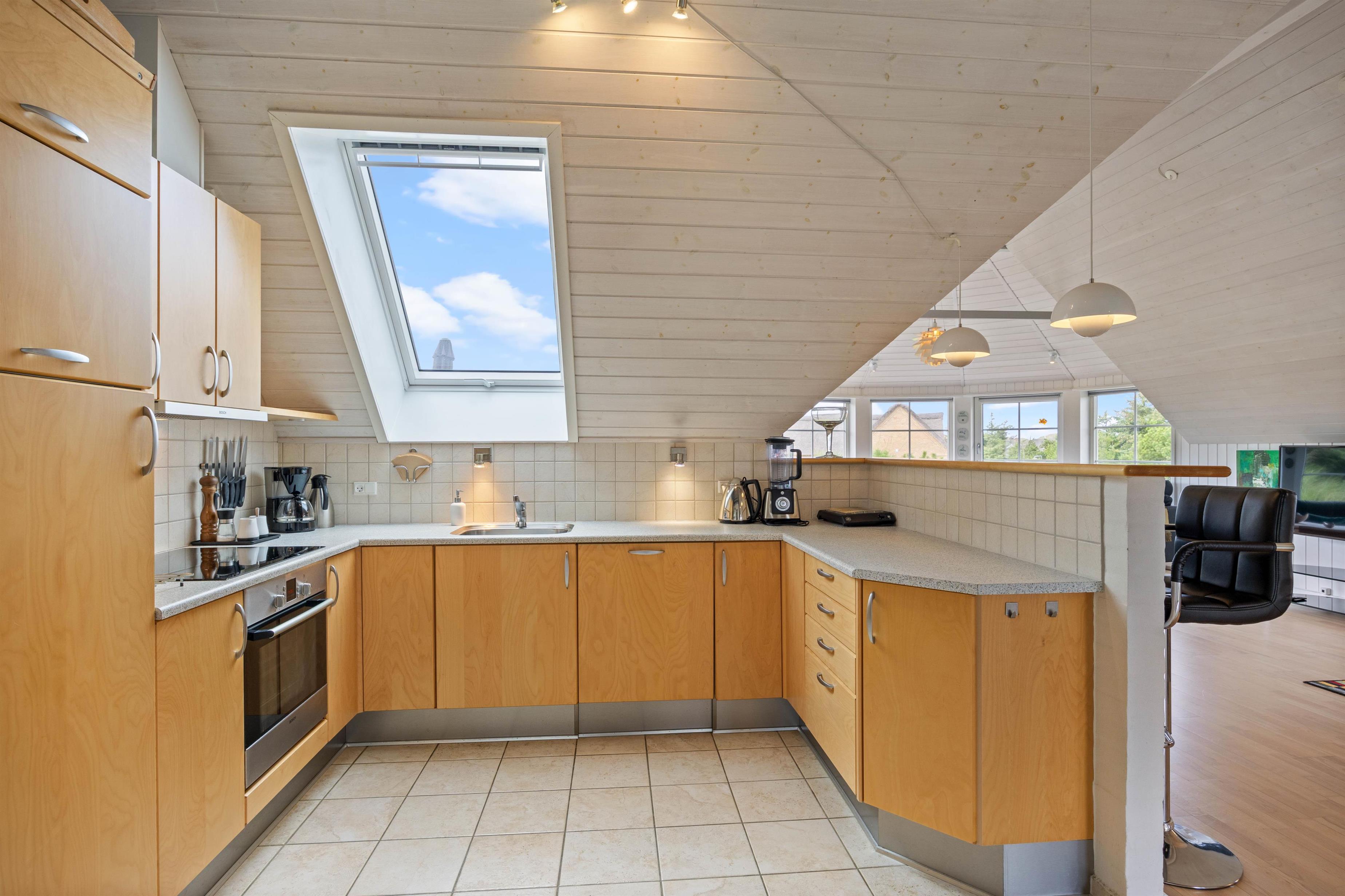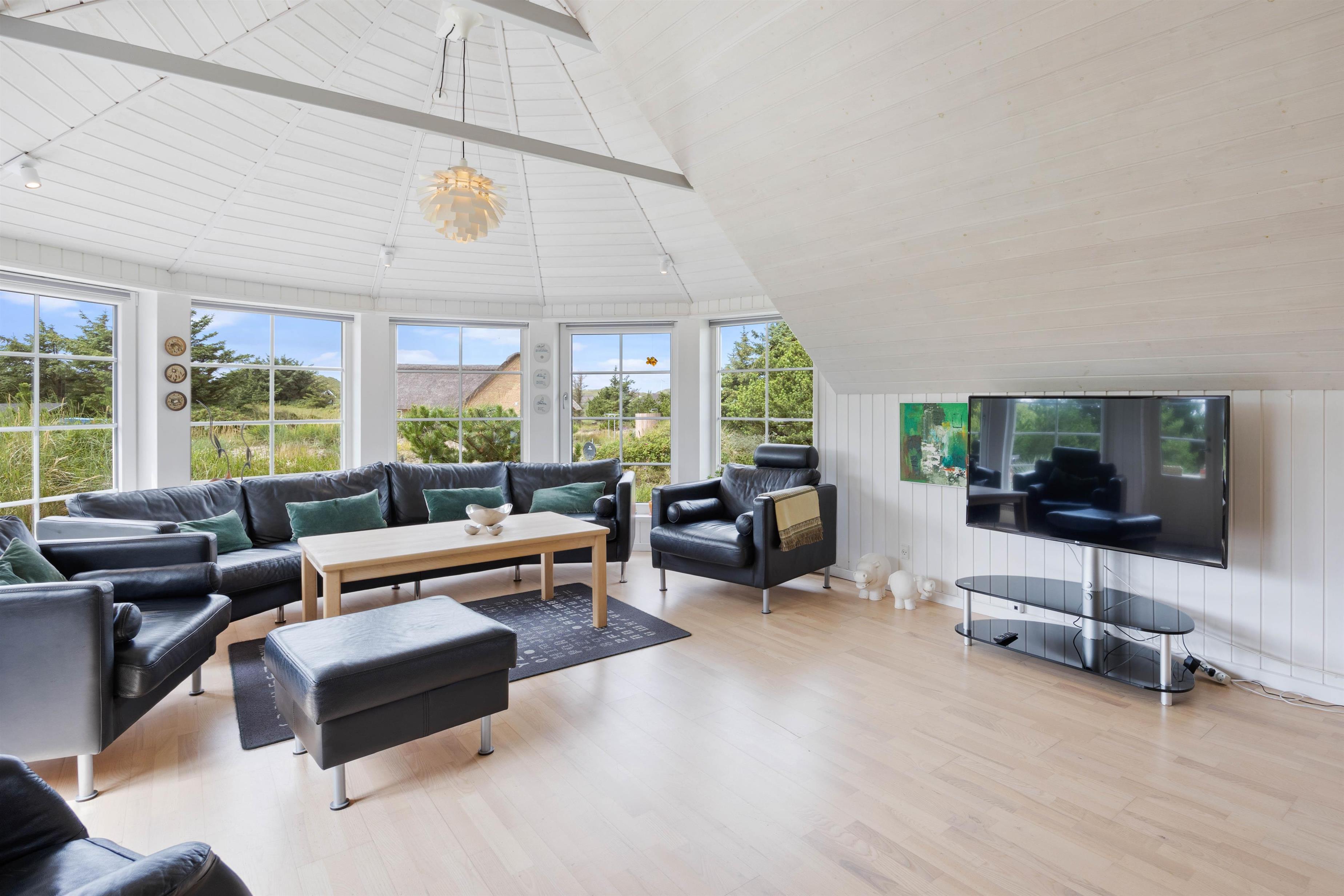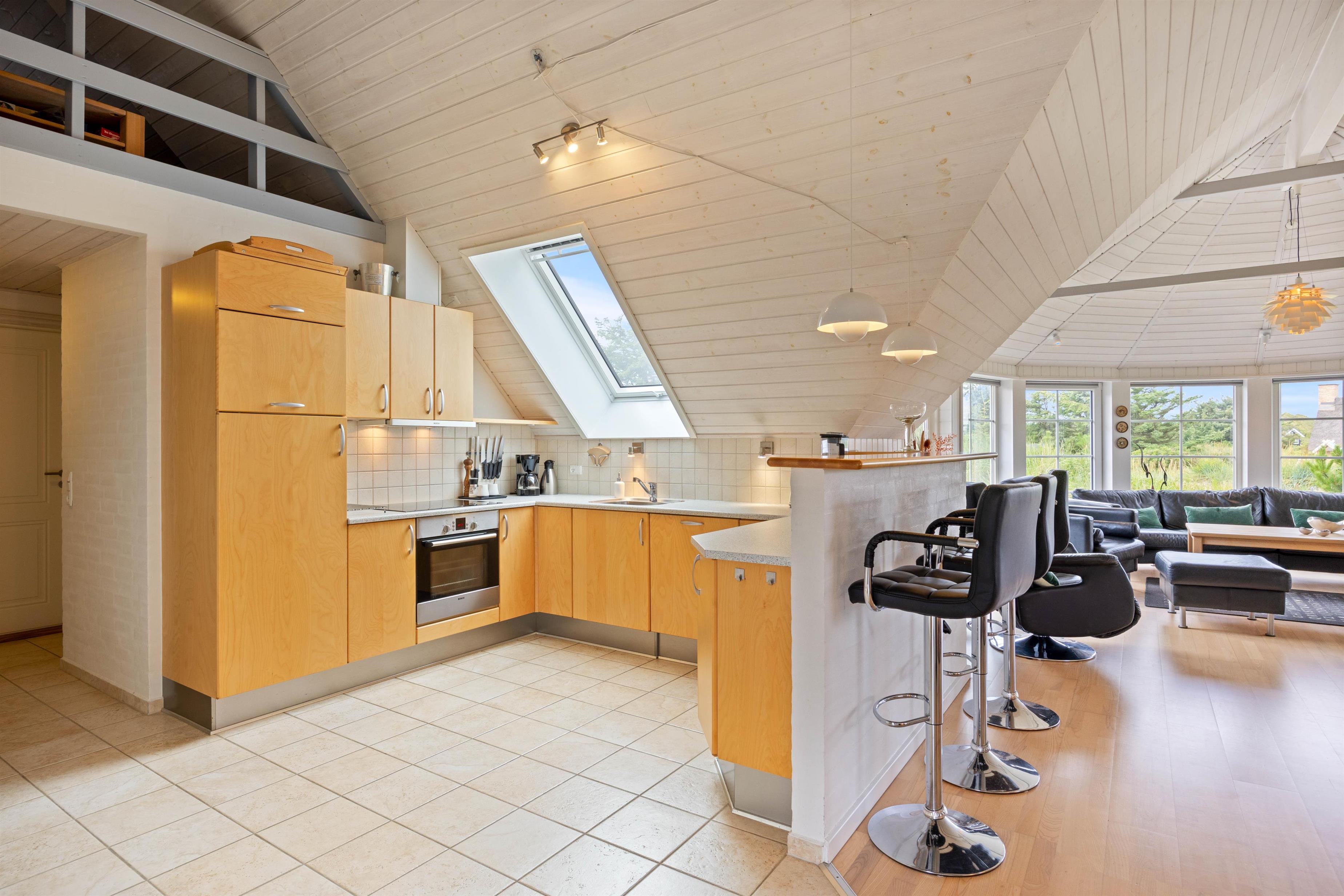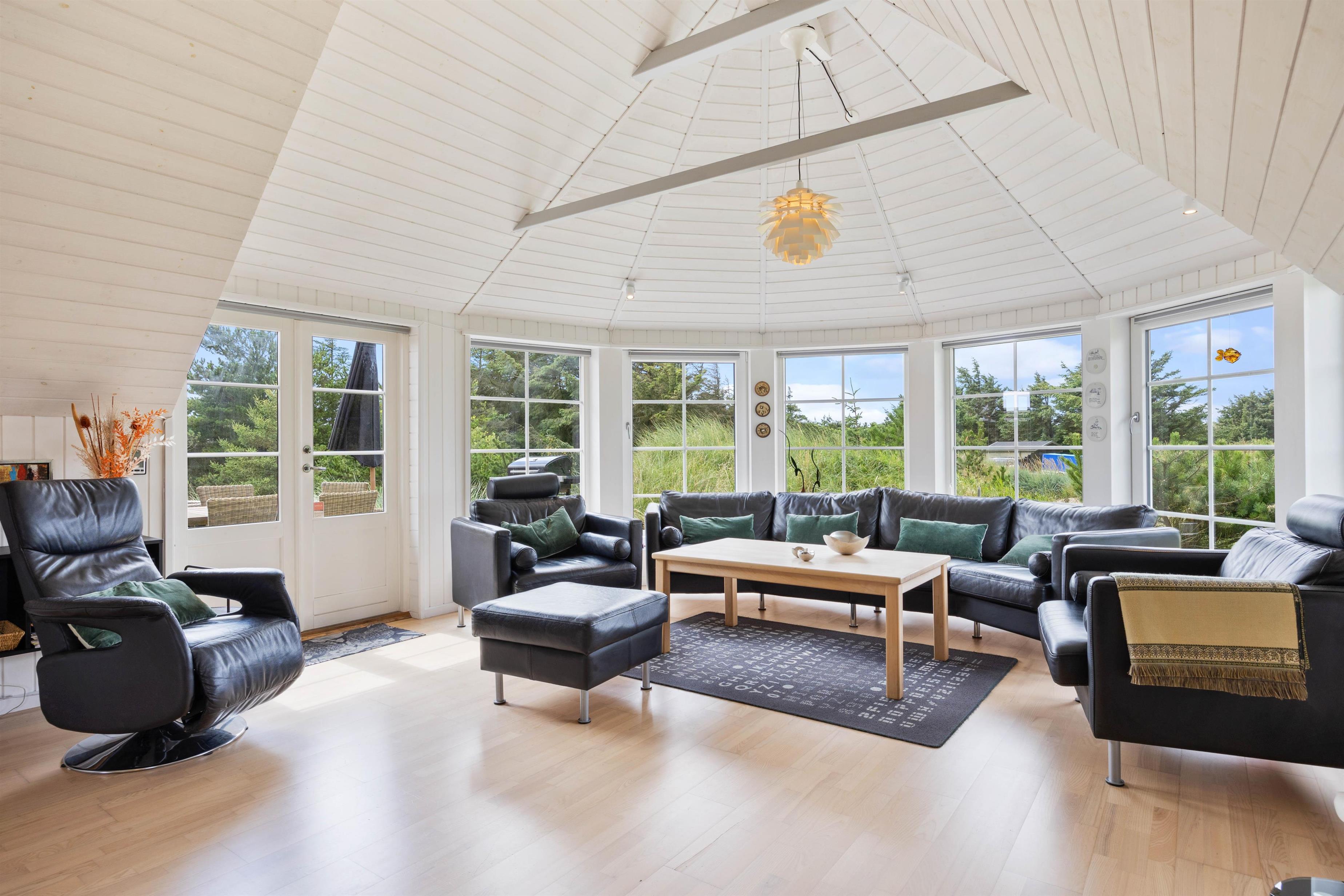 The well-equipped kitchen connects to the bright living area, forming the heart of the holiday home where the whole family can gather. The light interior design and high ceilings make the house feel even more spacious and brighter. You'll quickly feel at home here, and the large windows allow you to stay connected with nature even while relaxing on the sofa.