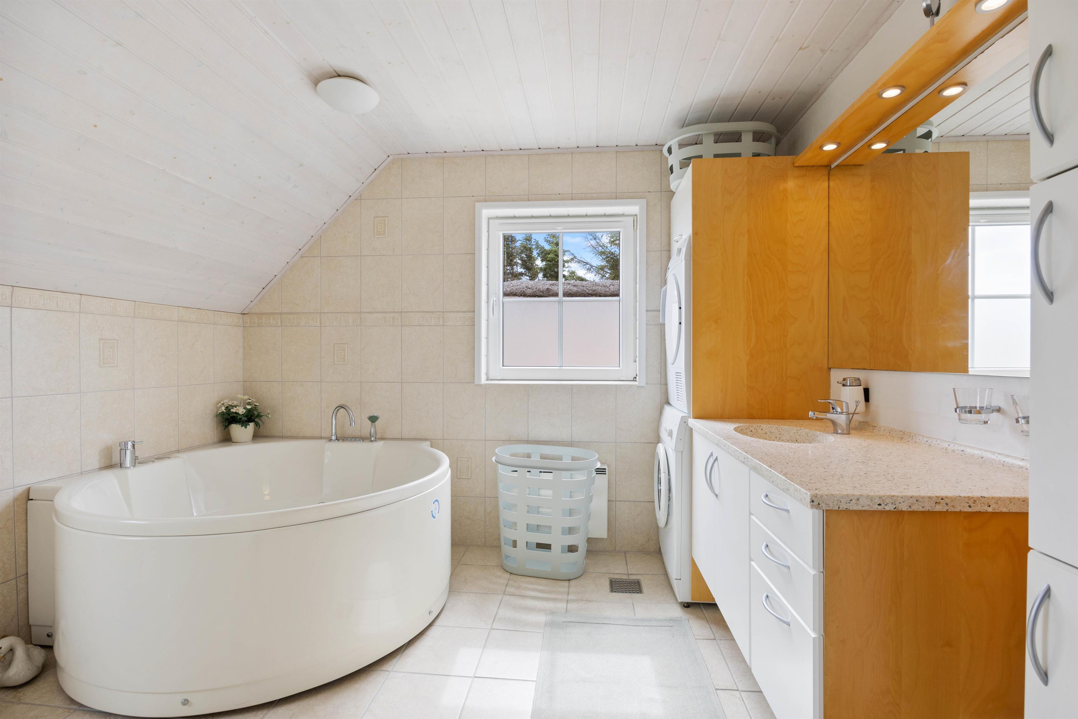 Three bedrooms, each with a double bed, provide comfortable sleeping arrangements. Two bathrooms with underfloor heating ensure a relaxing start to your day. One bathroom features a whirlpool where you can warm up your muscles after a long beach walk in the fresh North Sea air. A washing machine and tumble dryer help you pack lighter for your stay.