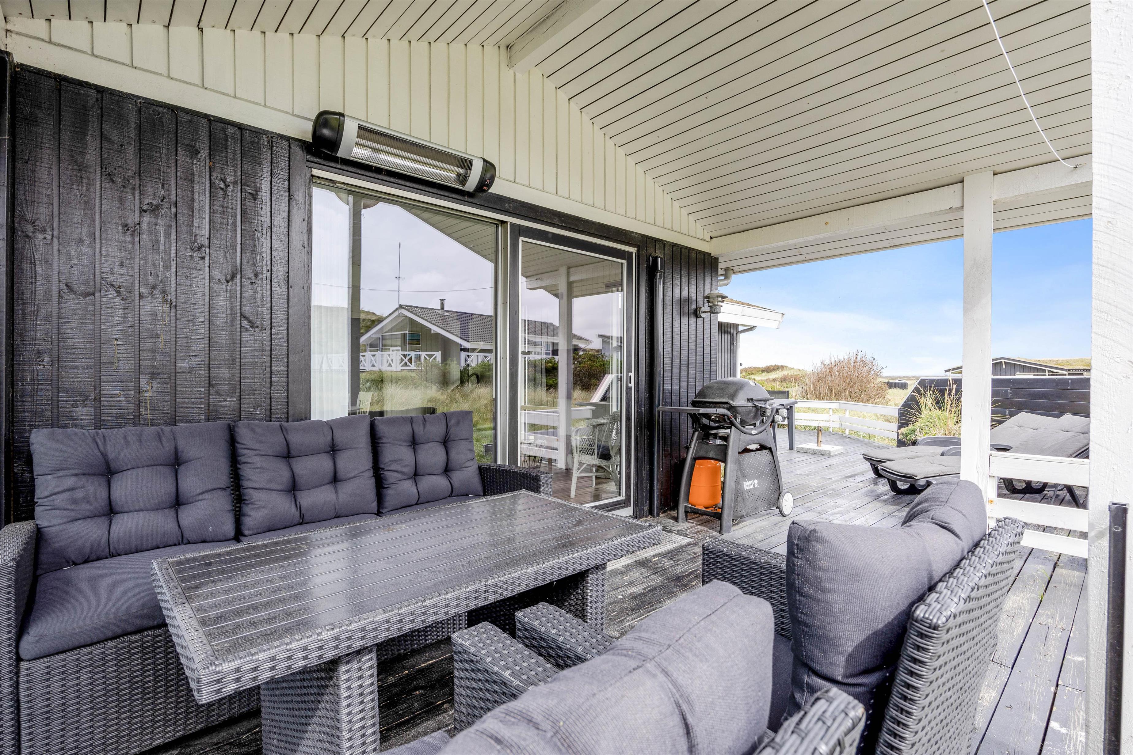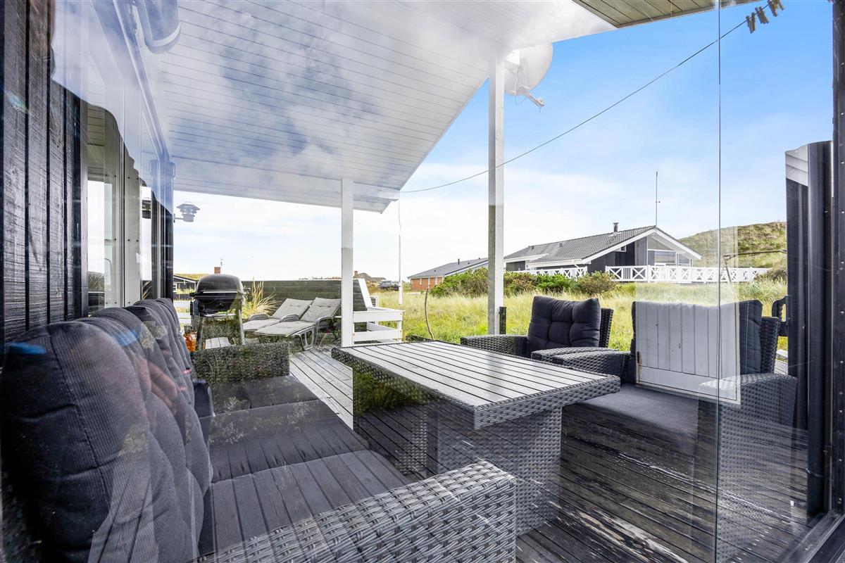 The holiday home features wonderful terraces that wrap around the house to the south, east and west. The terraces are partially enclosed and sheltered, with the south-facing section partially covered. The grounds also include a shed that provides additional wind protection.
