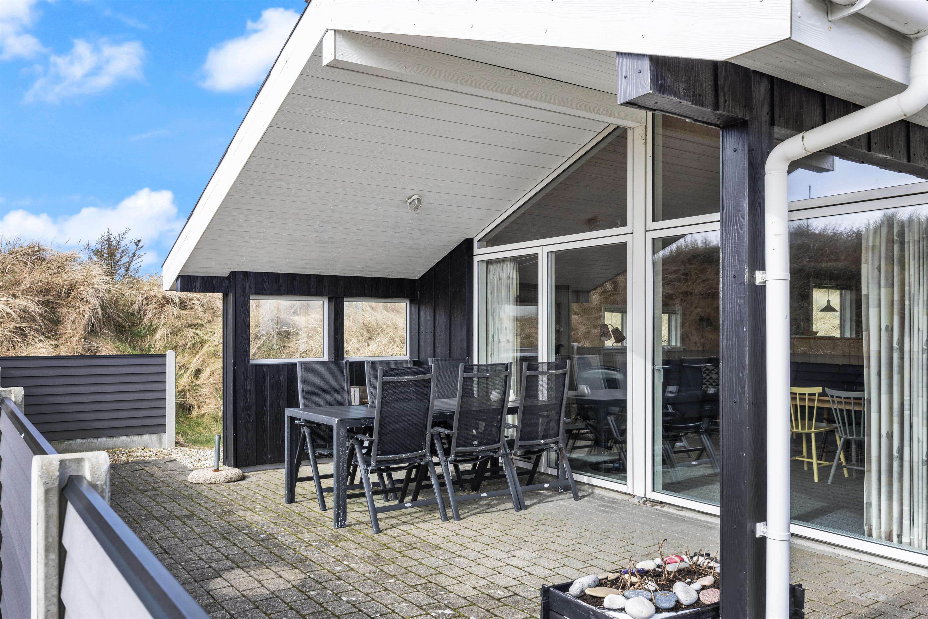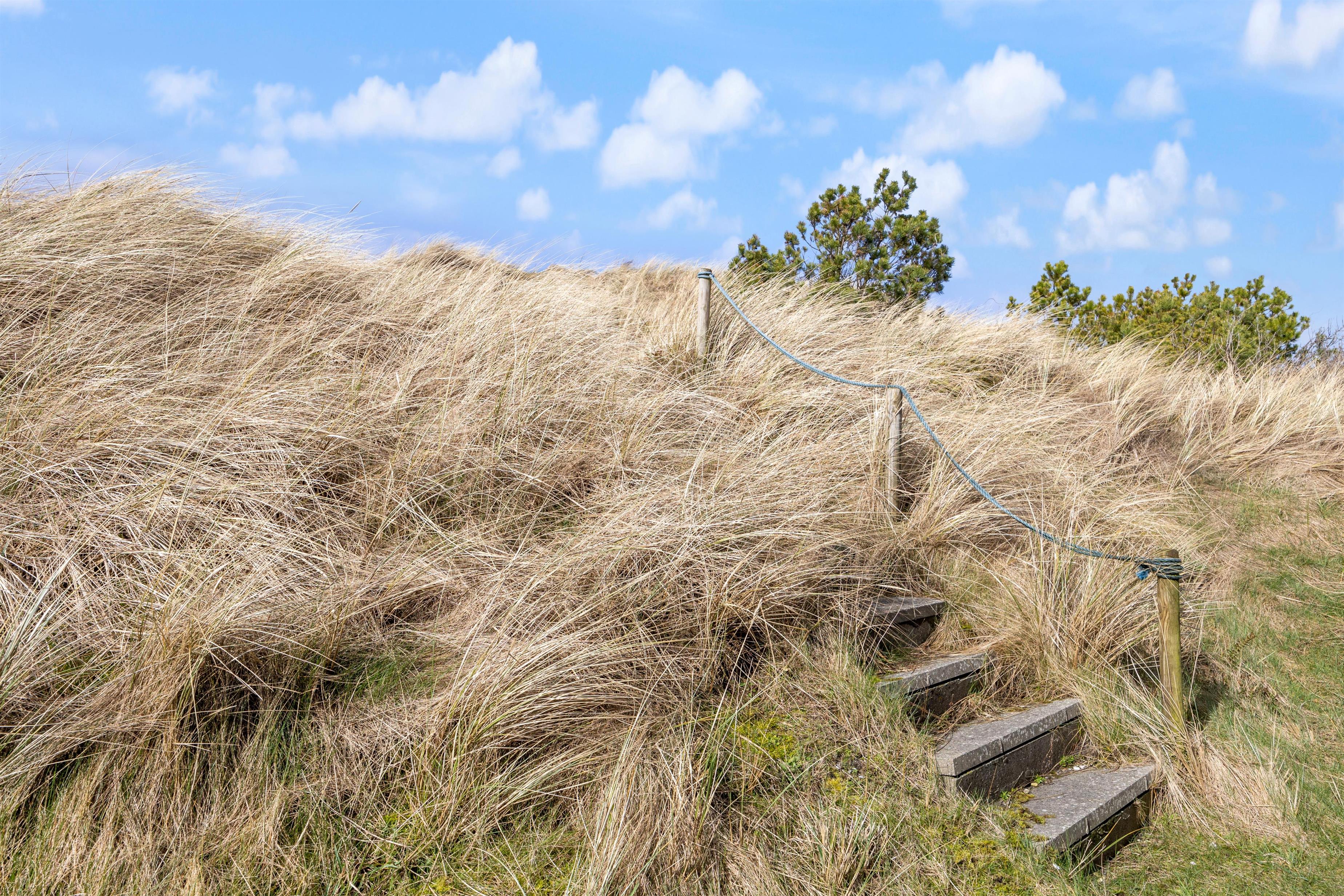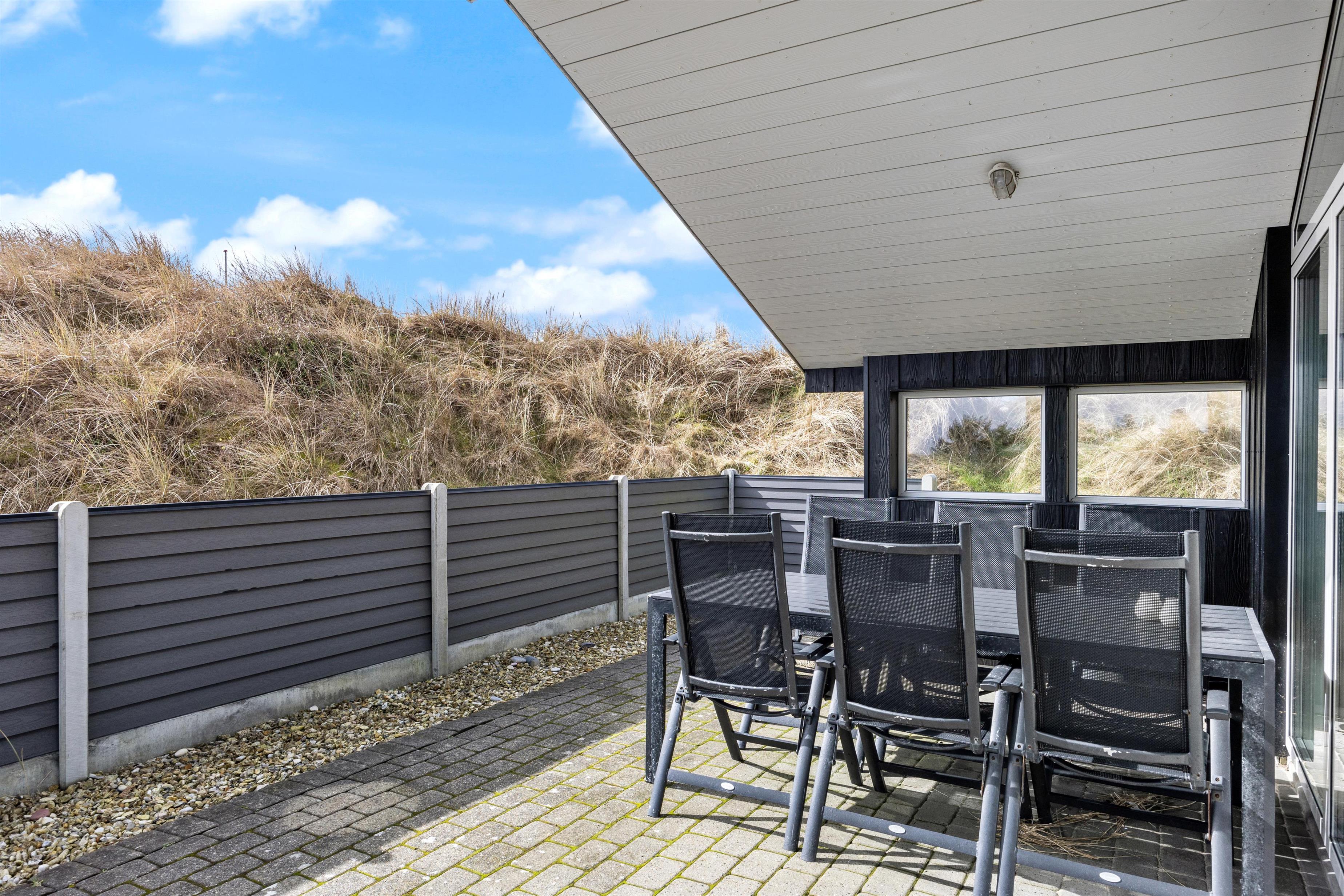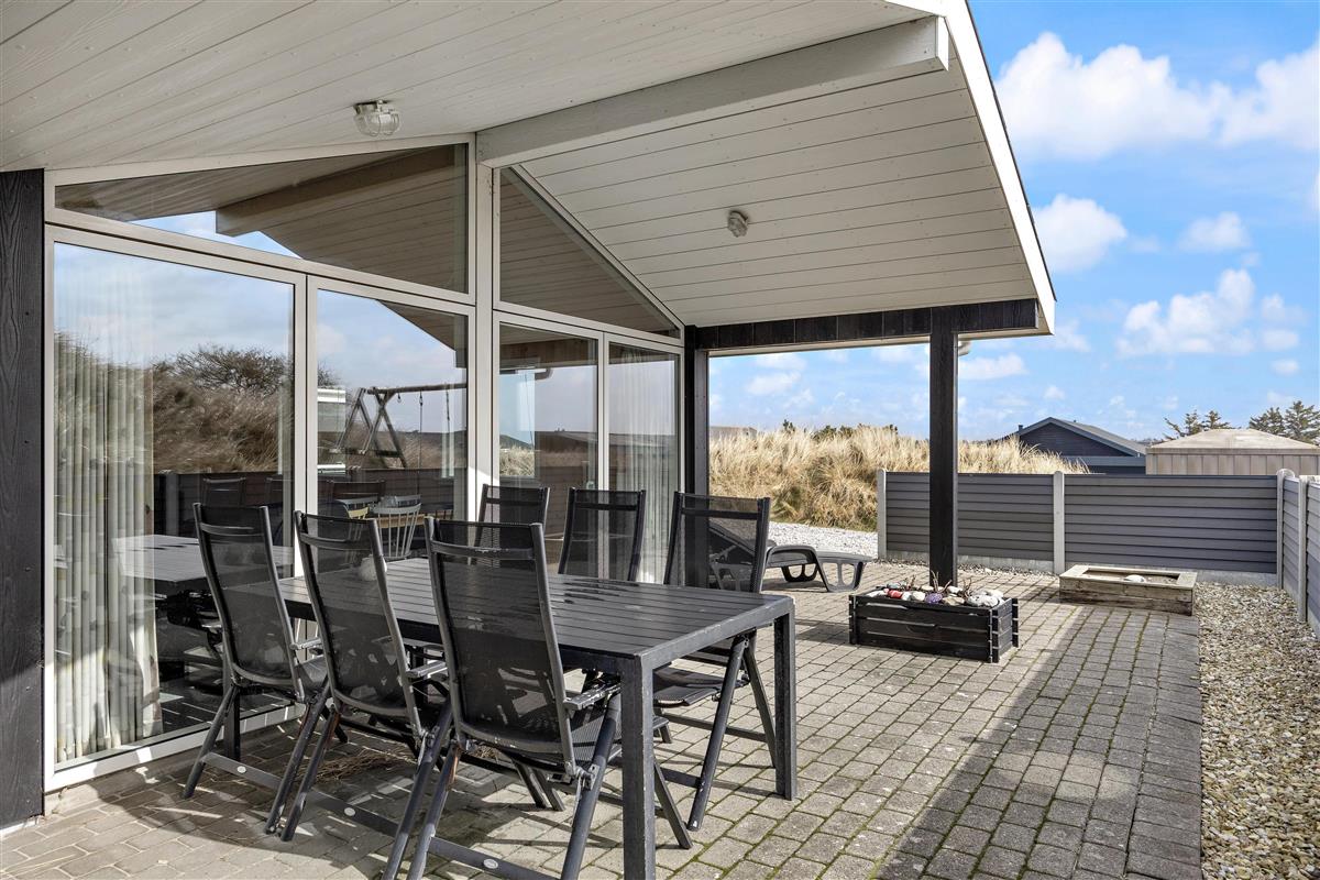 Das Ferienhaus steht auf einem Naturgrundstück inmitten der schönen Dünenlandschaft von Dänemarks Westküste. Hier könnt ihr am Morgen den ersten Kaffee beim Sonnenaufgang genießen und entspannen. Es stehen euch Gartenmöbel zur Verfügung, auf denen ihr es euch bequem machen könnt. Am Abend, wenn eure Köstlichkeiten auf dem Grill brutzeln, lehnt euch zurück und lauscht dem Meeresrauschen. Sollte das Wetter einmal umschlagen ist das kein Problem, da ein Teil der Terrasse überdacht ist. Seitlich vom Ferienhaus führt eine kleine Treppe auf die Düne, wo ihr einen schönen Rundumblick habt.