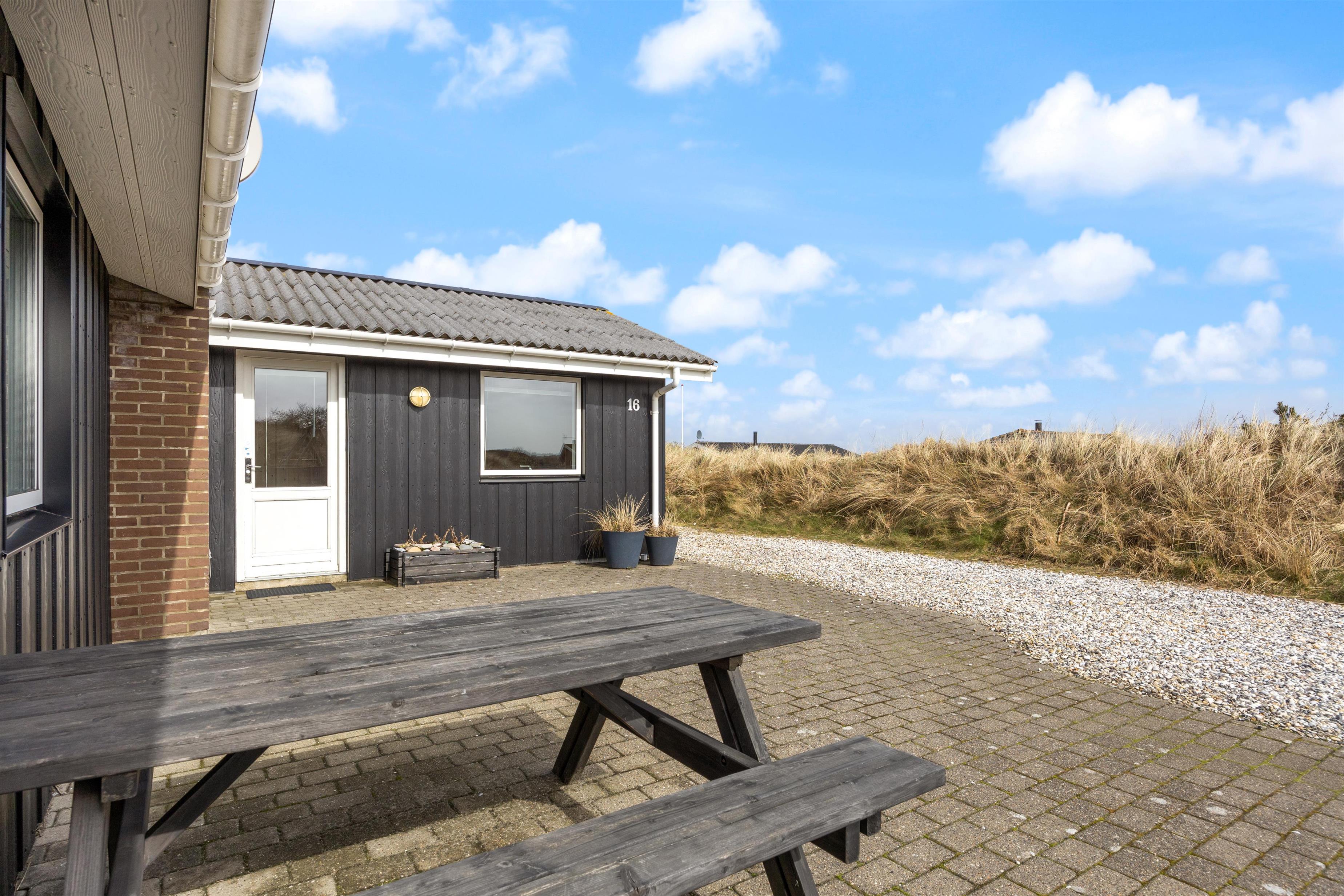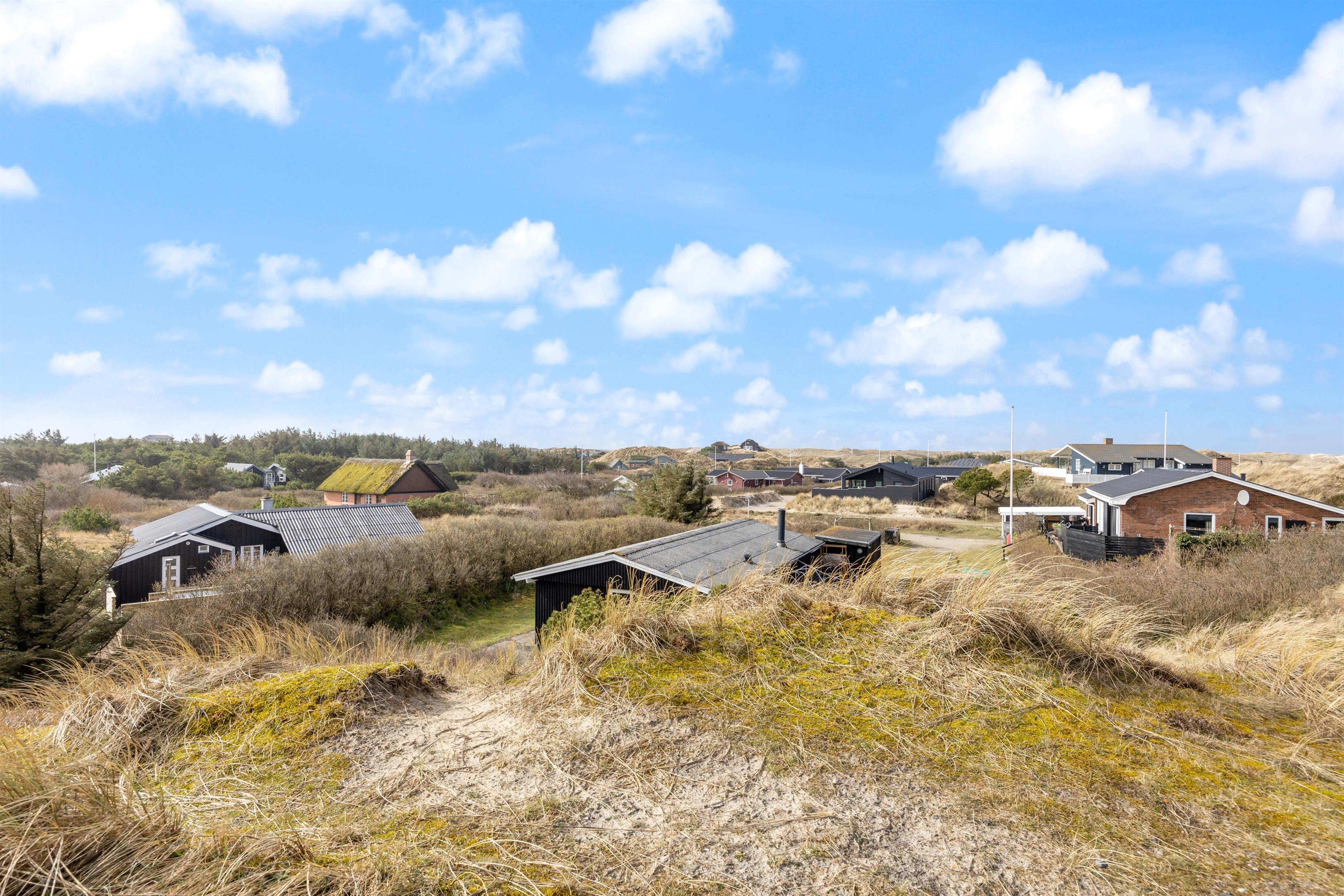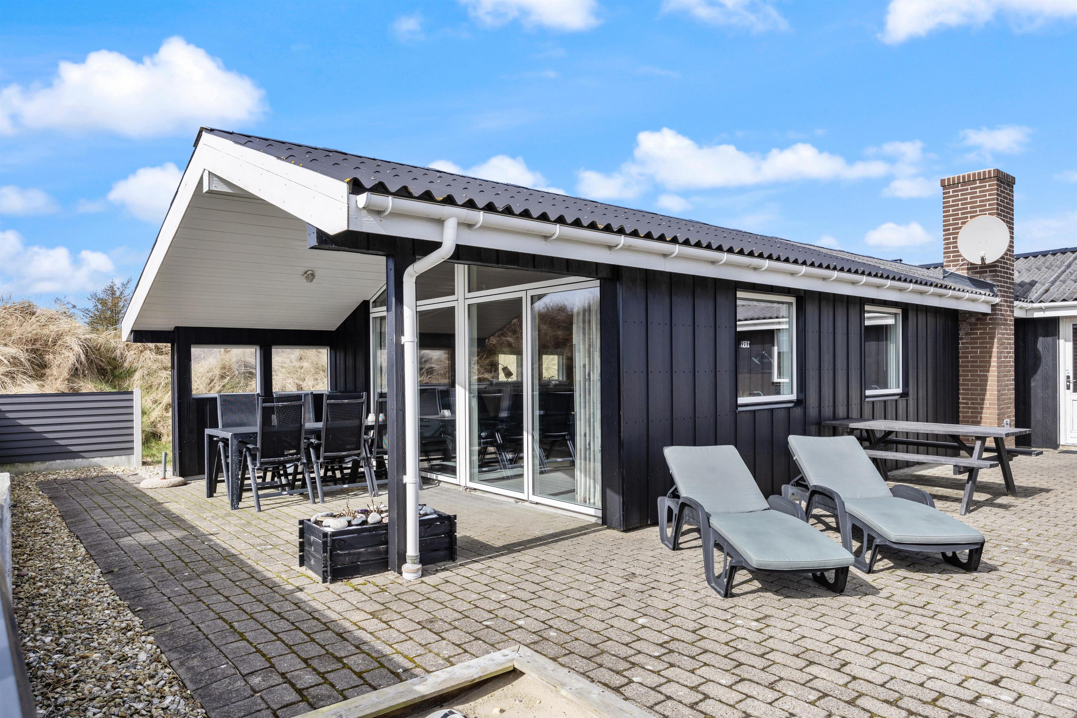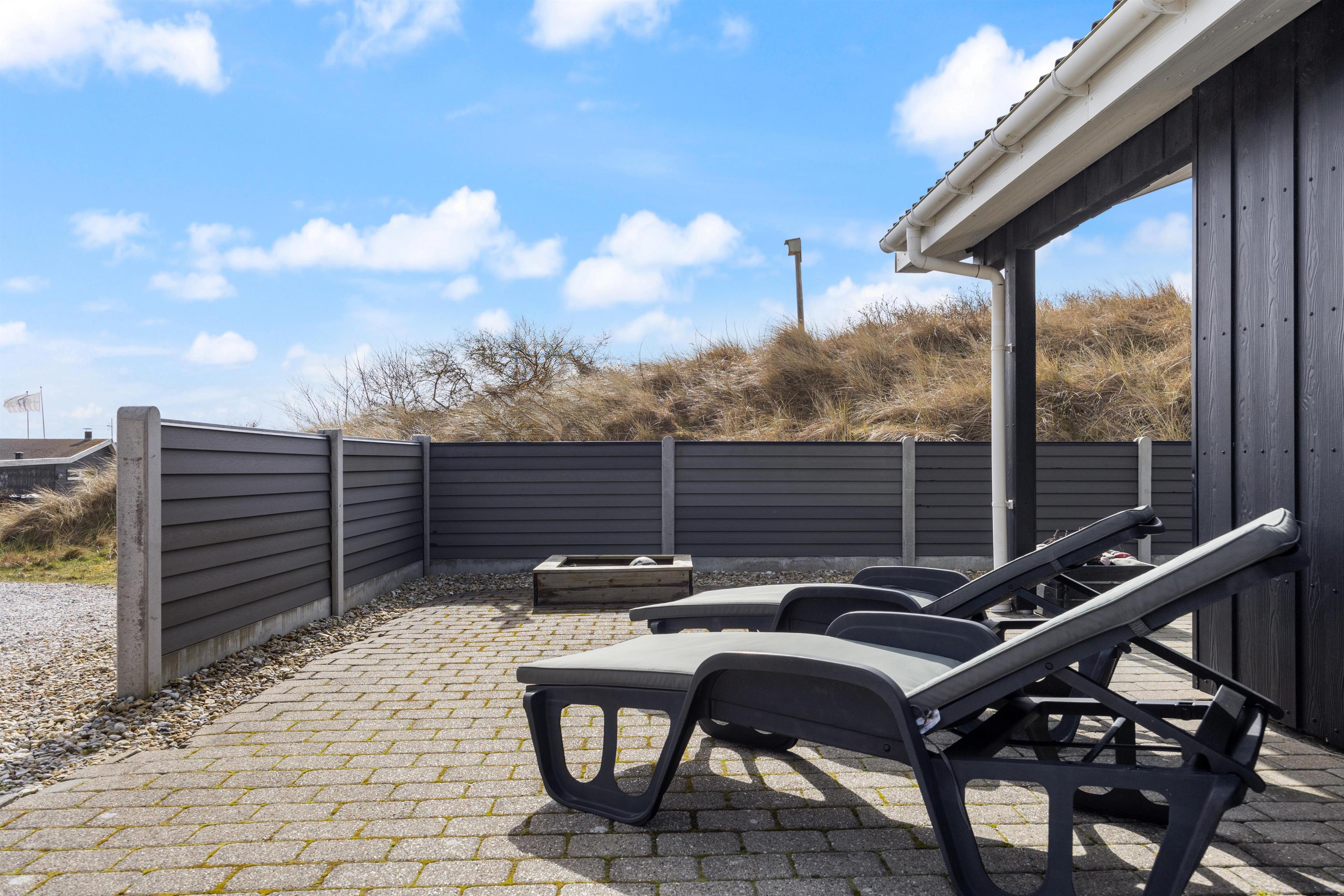 Das Ferienhaus steht auf einem Naturgrundstück inmitten der schönen Dünenlandschaft von Dänemarks Westküste. Hier könnt ihr am Morgen den ersten Kaffee beim Sonnenaufgang genießen und entspannen. Es stehen euch Gartenmöbel zur Verfügung, auf denen ihr es euch bequem machen könnt. Am Abend, wenn eure Köstlichkeiten auf dem Grill brutzeln, lehnt euch zurück und lauscht dem Meeresrauschen. Sollte das Wetter einmal umschlagen ist das kein Problem, da ein Teil der Terrasse überdacht ist. Seitlich vom Ferienhaus führt eine kleine Treppe auf die Düne, wo ihr einen schönen Rundumblick habt.