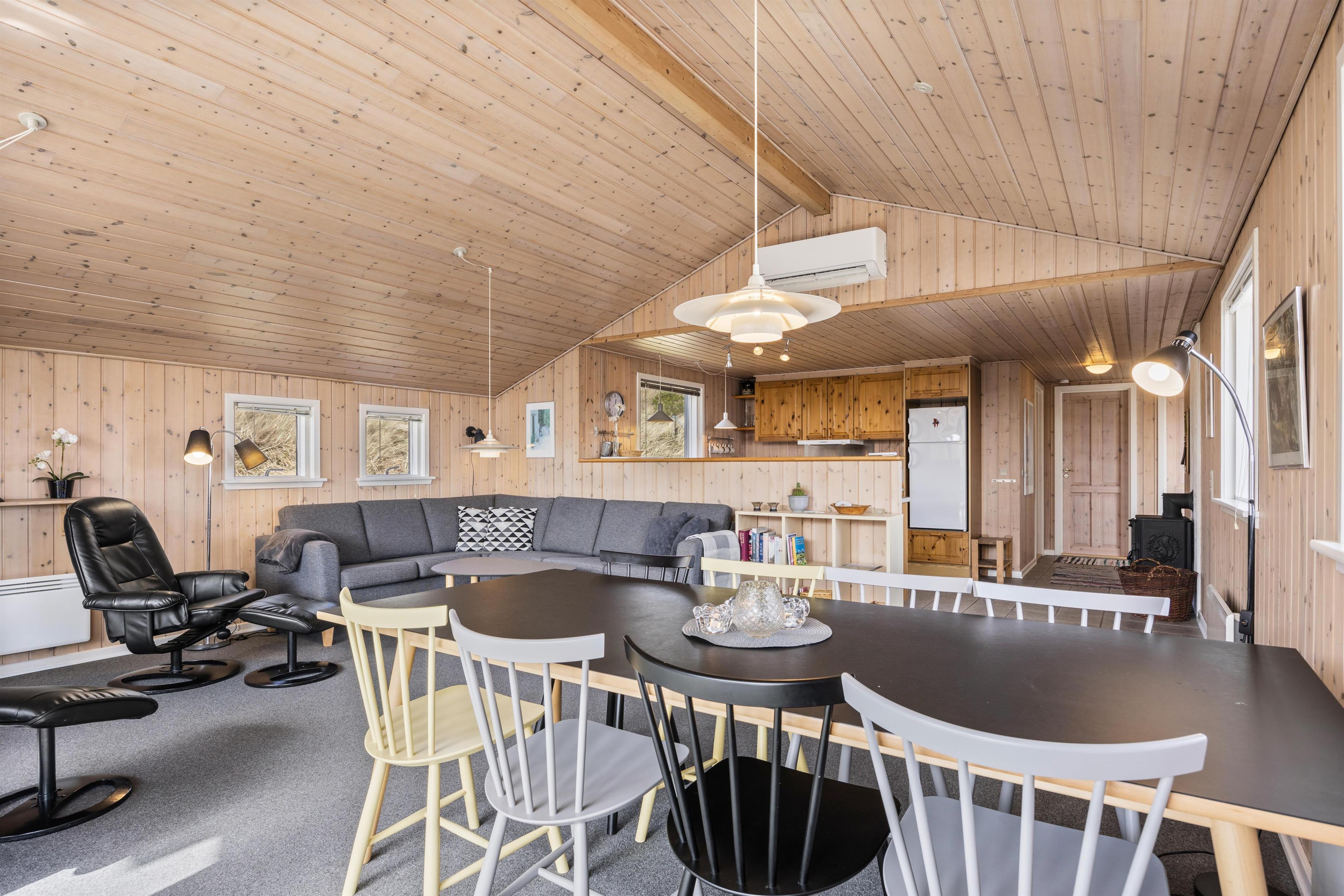 Das Ferienhaus hat 98 m² und empfängt euch mit einem offenen Wohn/ Essbereich. Die holzvertäfelten Wände strahlen Gemütlichkeit aus, was an kühleren Tagen durch den Holzofen noch verstärkt wird. Hier könnt ihr mit bis zu 6 Personen viel Zeit miteinander verbringen, egal ob ihr gemeinsam kocht oder am Esstisch den neuen Pokerchampion kürt. Die Spülmaschine erledigt den Abwasch und ihr habt mehr Zeit für die wichtigen Dinge des Urlaubs. Eine energiesparende Luft-zu-Luft Wärmepumpe schont nicht nur euren Geldbeutel, sondern sorgt für eine angenehme Wärme im Wohnbereich.