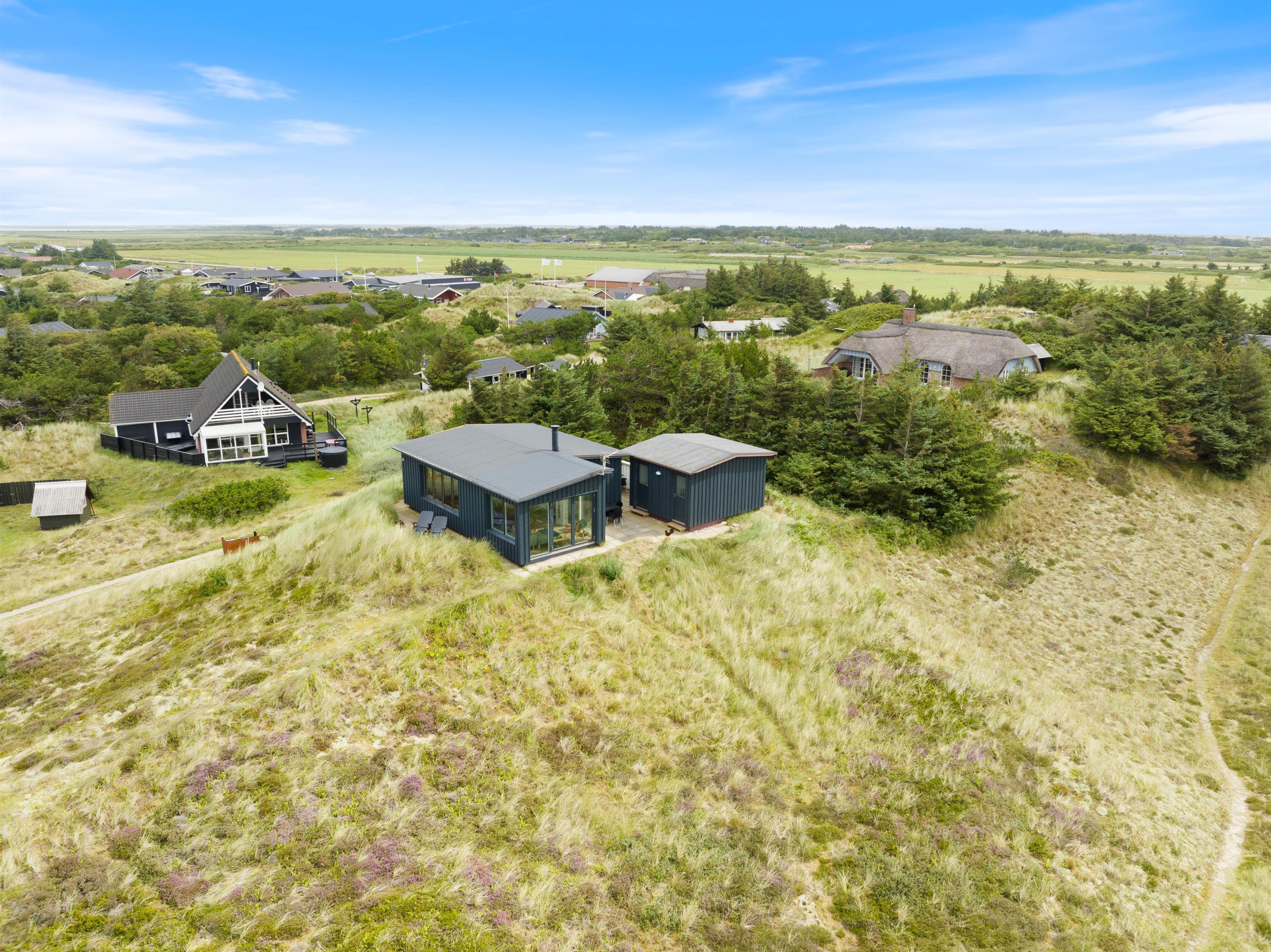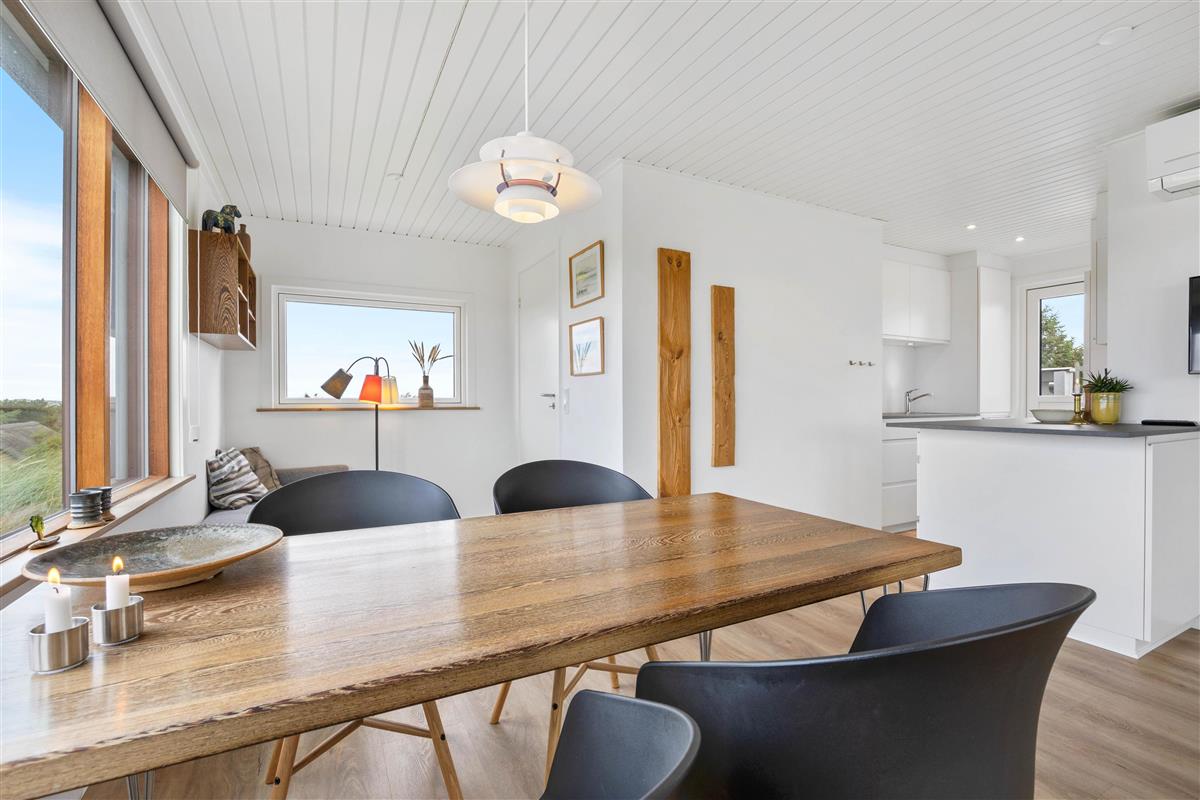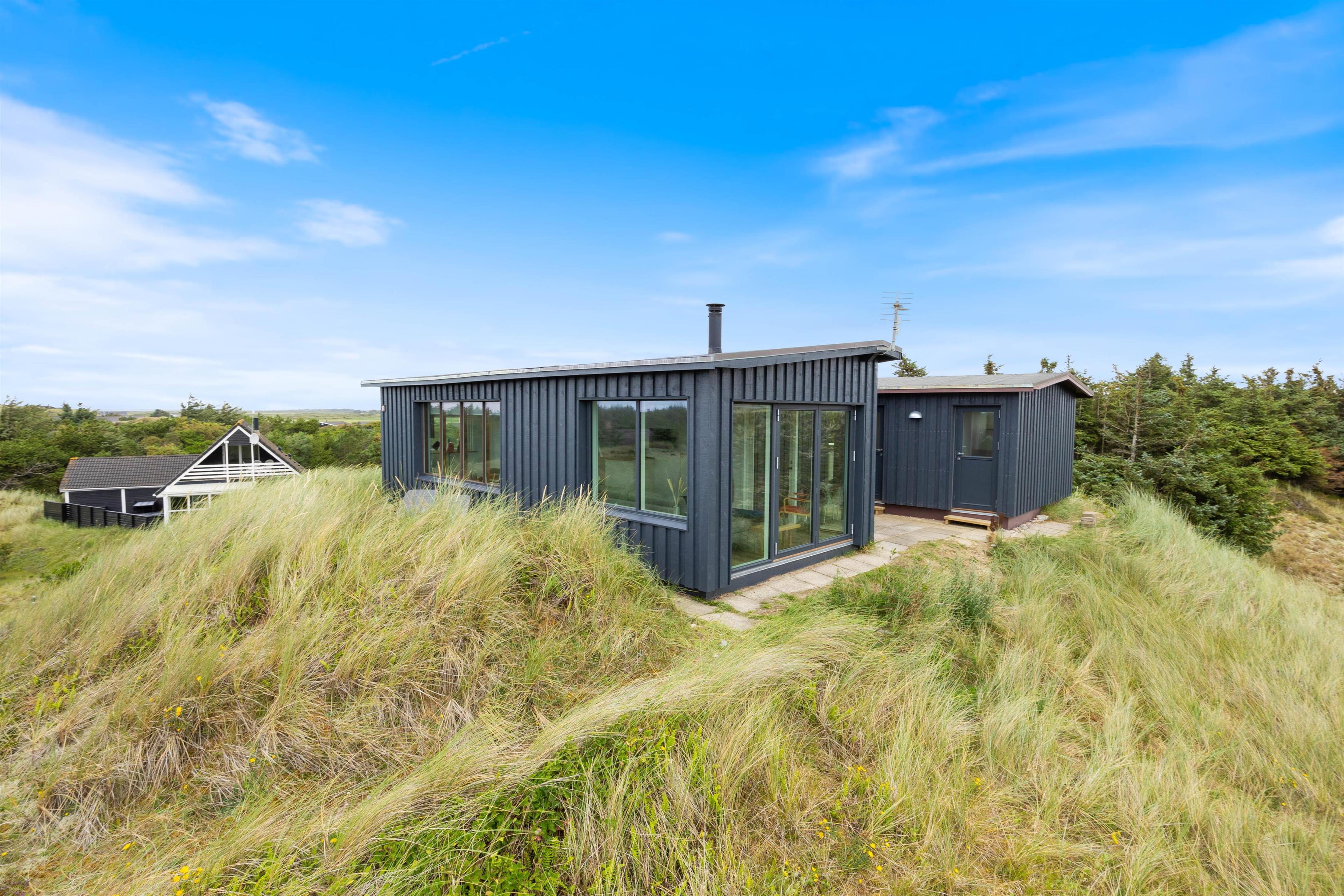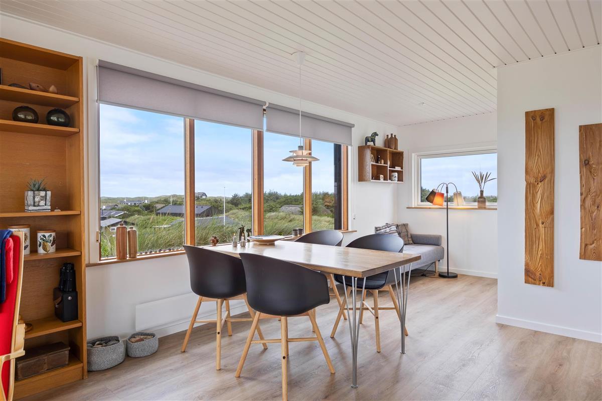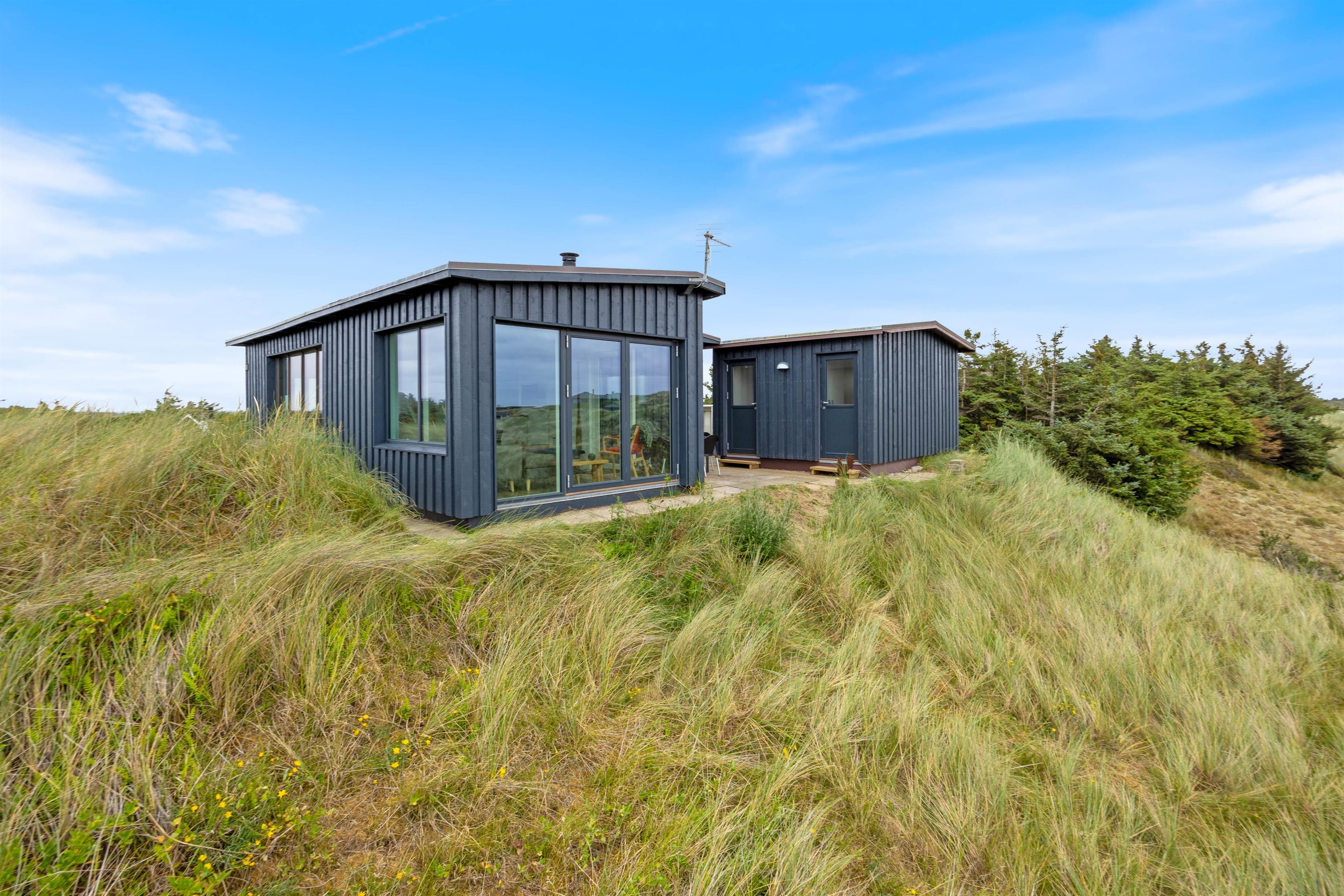 This holiday home welcomes you in the heart of the Houvig dunes. Floor-to-ceiling windows create a bright, welcoming atmosphere, making the 48-square-metre living space feel generous and offering an open, friendly living concept. The large windows provide impressive views over Houvig's beautiful landscape. Thanks to the open-plan design, you can remain part of family life while cooking, and meal preparation becomes a pleasure in the well-equipped kitchen. Enjoy your culinary creations at the comfortable dining table before settling down with a glass of wine by the cosy wood-burning stove.