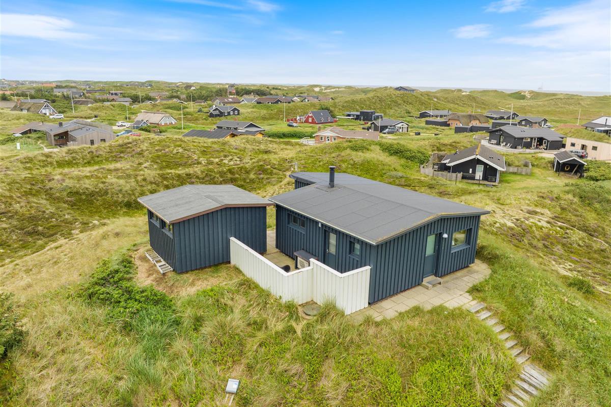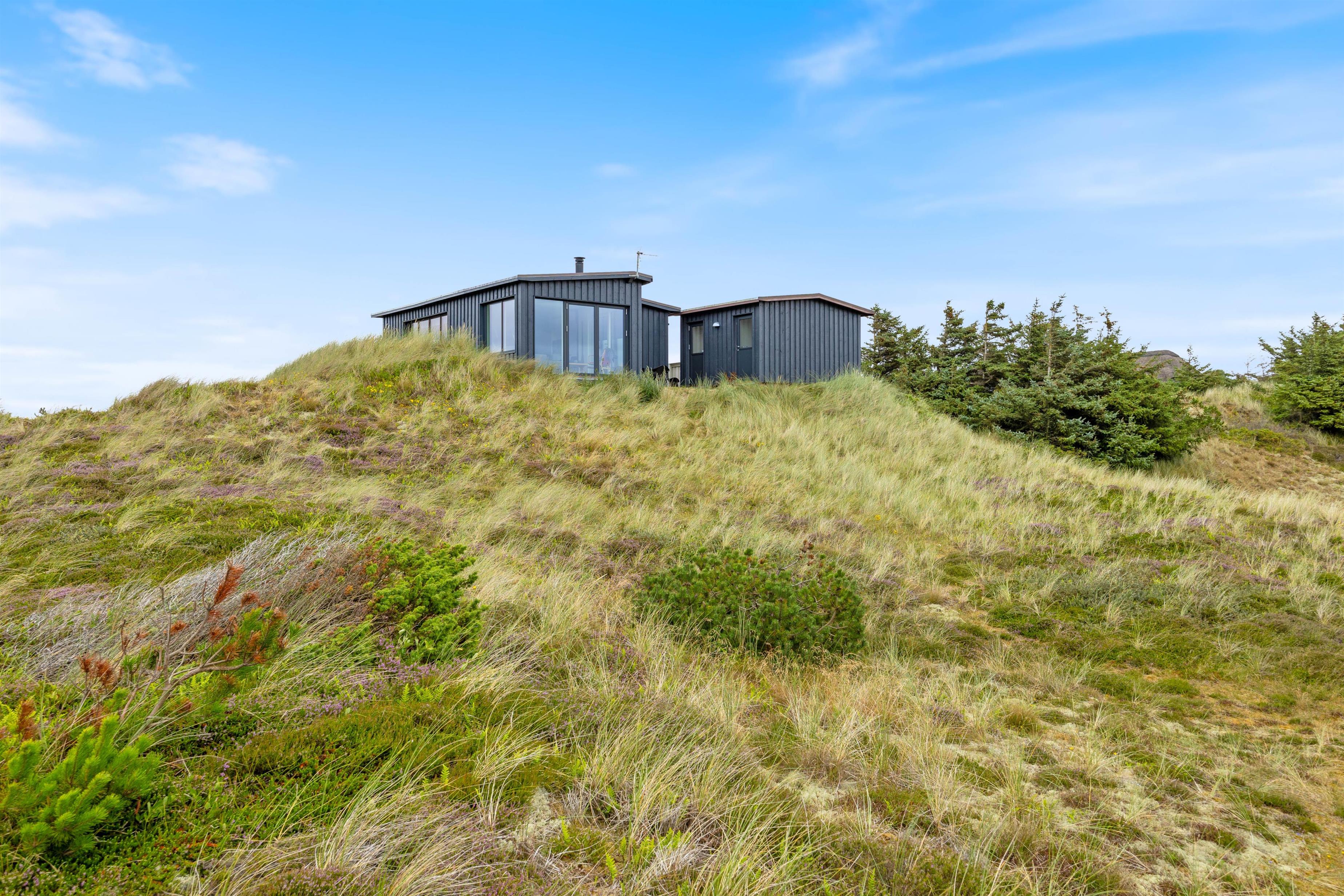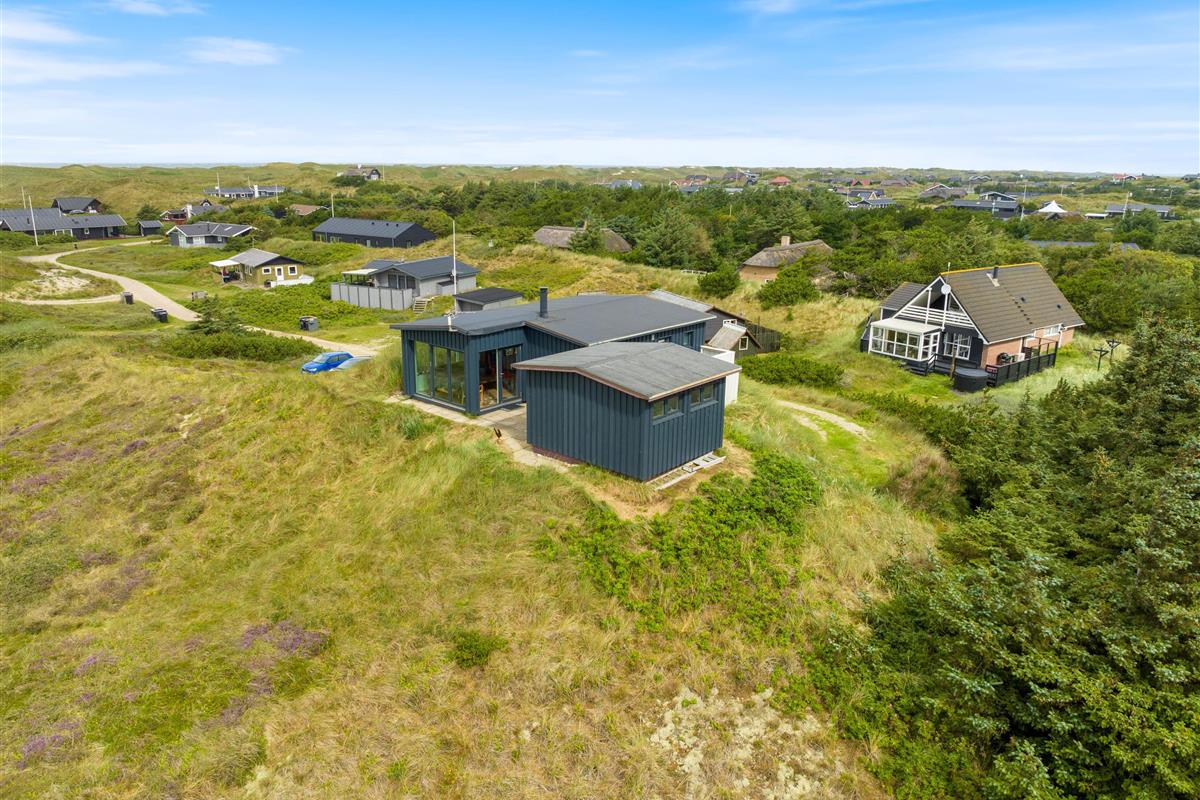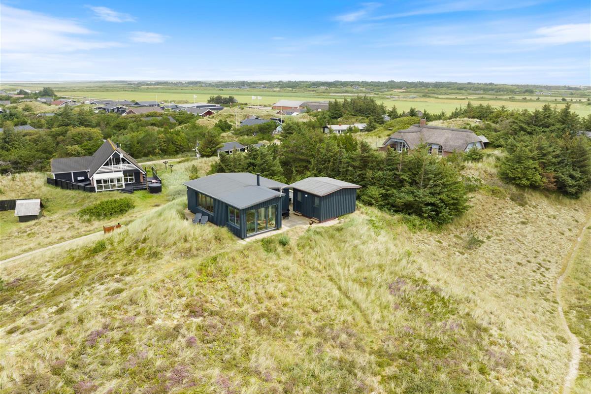 This holiday home welcomes you in the heart of the Houvig dunes. Floor-to-ceiling windows create a bright, welcoming atmosphere, making the 48-square-metre living space feel generous and offering an open, friendly living concept. The large windows provide impressive views over Houvig's beautiful landscape. Thanks to the open-plan design, you can remain part of family life while cooking, and meal preparation becomes a pleasure in the well-equipped kitchen. Enjoy your culinary creations at the comfortable dining table before settling down with a glass of wine by the cosy wood-burning stove.