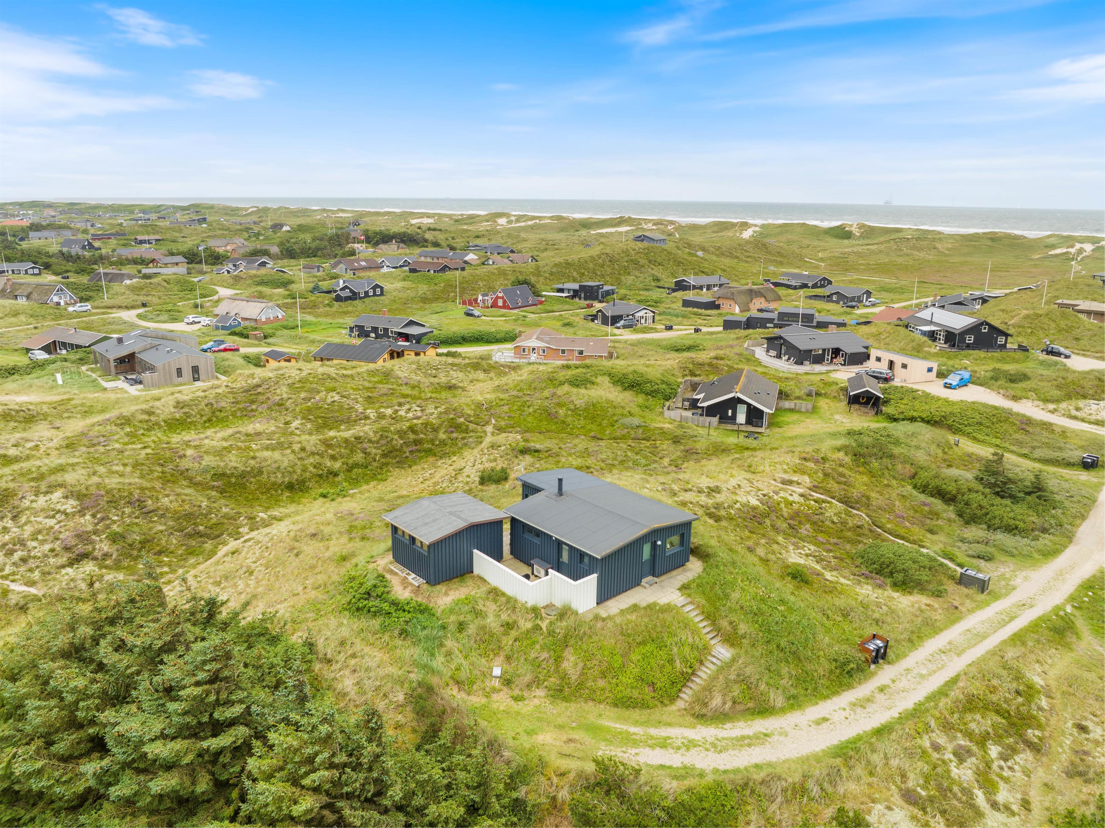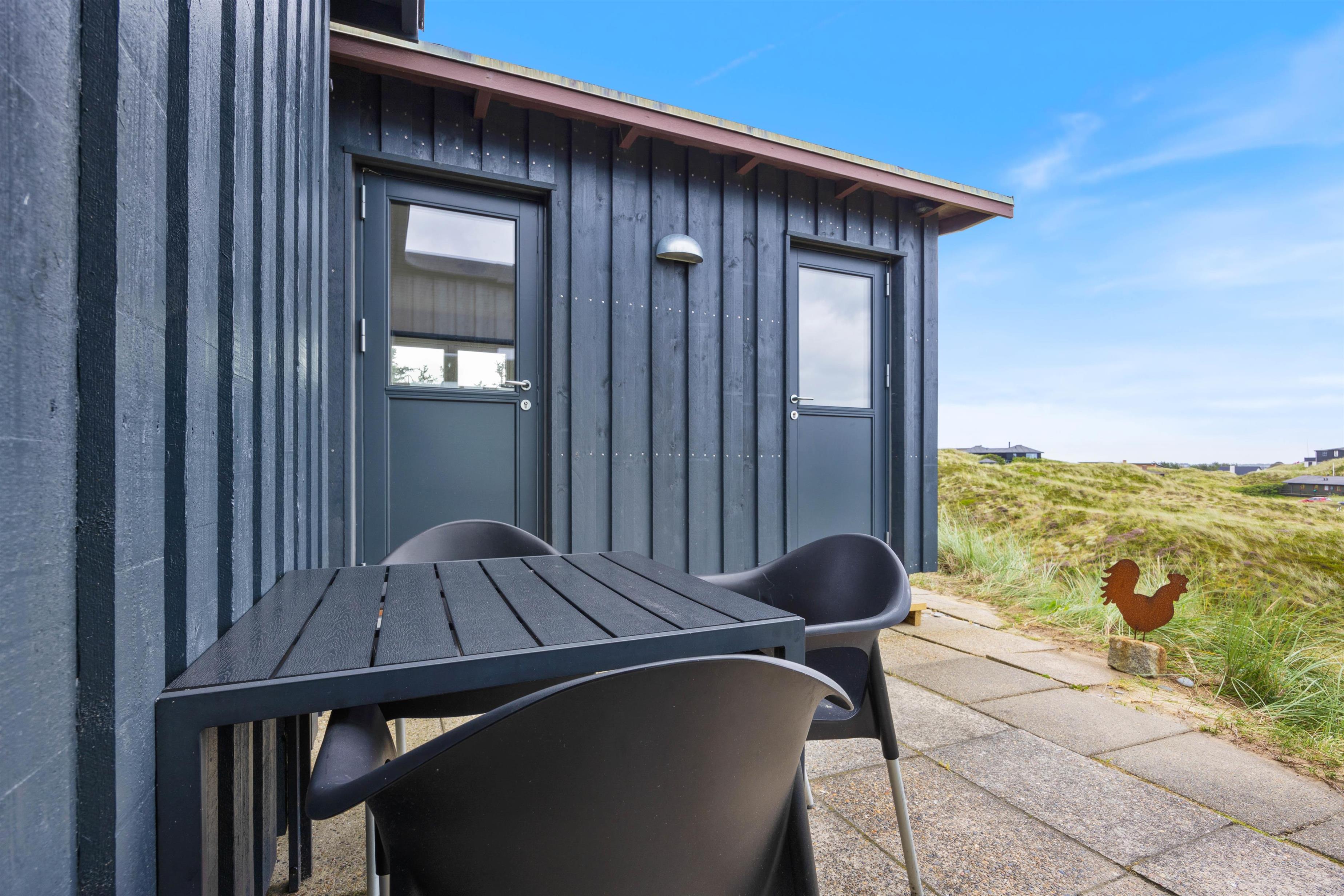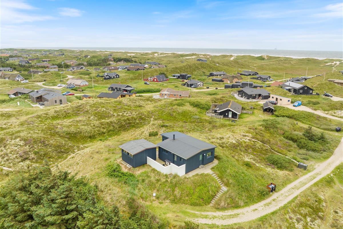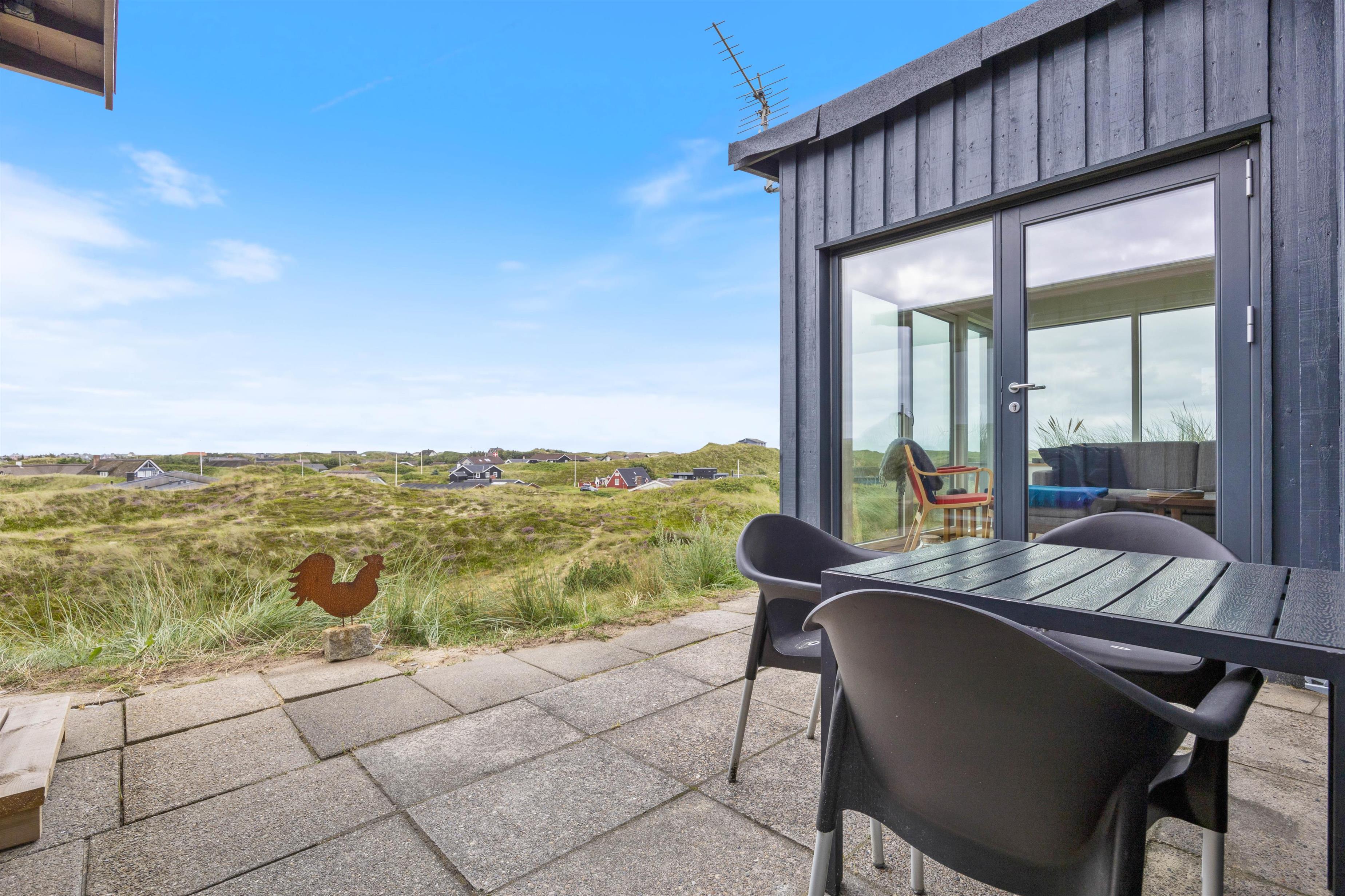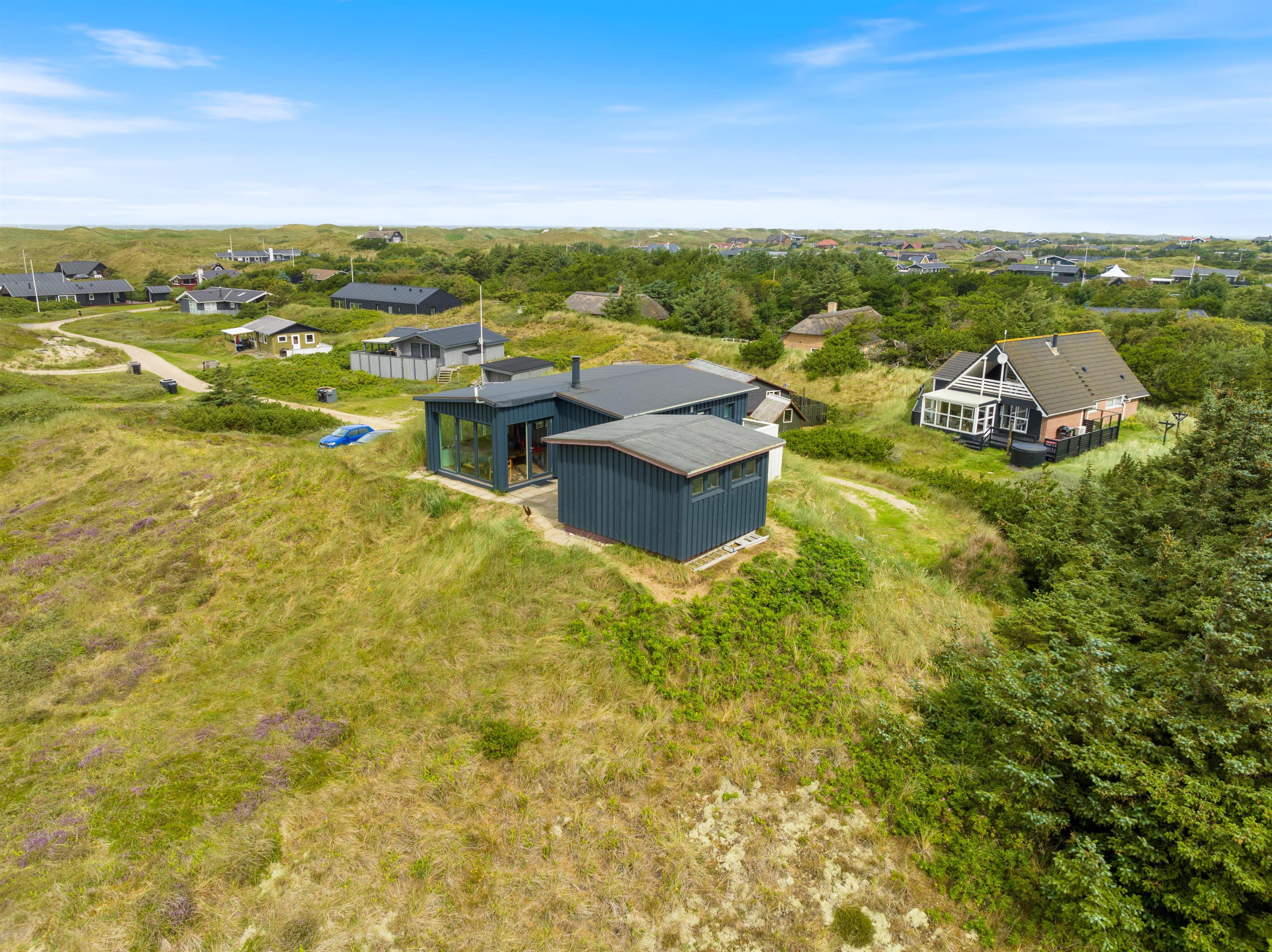 This holiday home welcomes you in the heart of the Houvig dunes. Floor-to-ceiling windows create a bright, welcoming atmosphere, making the 48-square-metre living space feel generous and offering an open, friendly living concept. The large windows provide impressive views over Houvig's beautiful landscape. Thanks to the open-plan design, you can remain part of family life while cooking, and meal preparation becomes a pleasure in the well-equipped kitchen. Enjoy your culinary creations at the comfortable dining table before settling down with a glass of wine by the cosy wood-burning stove.
